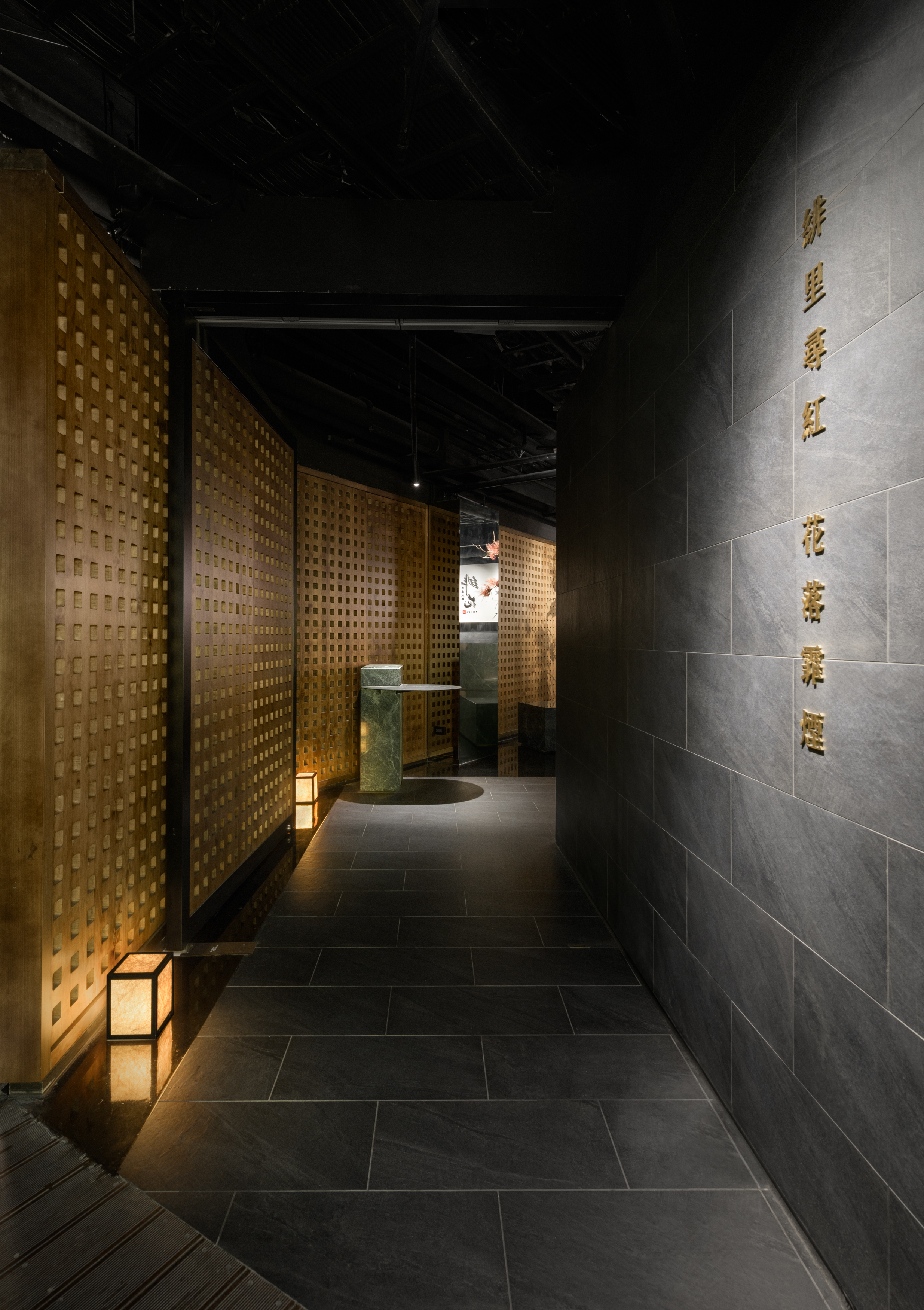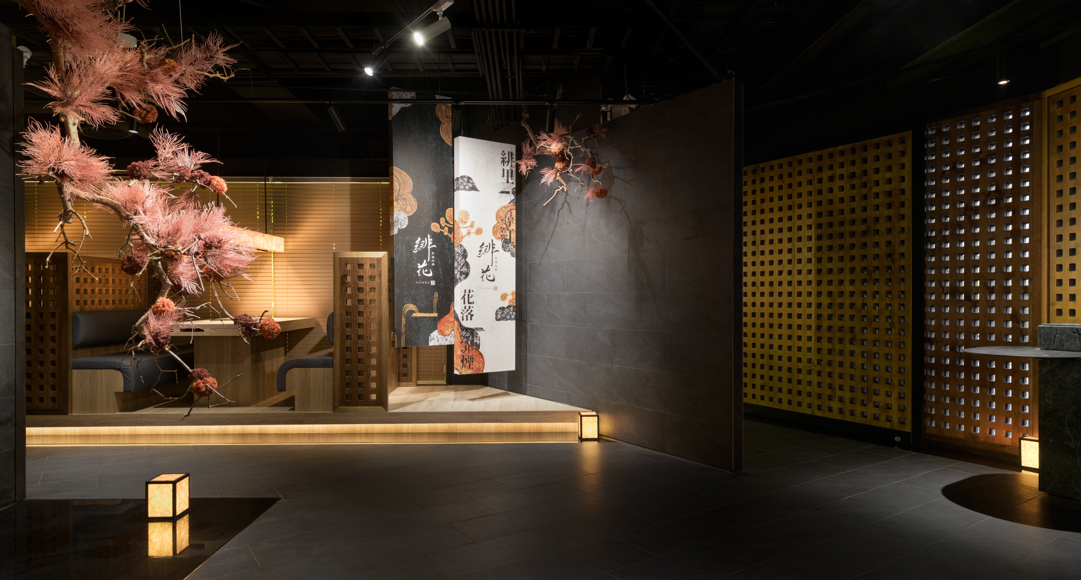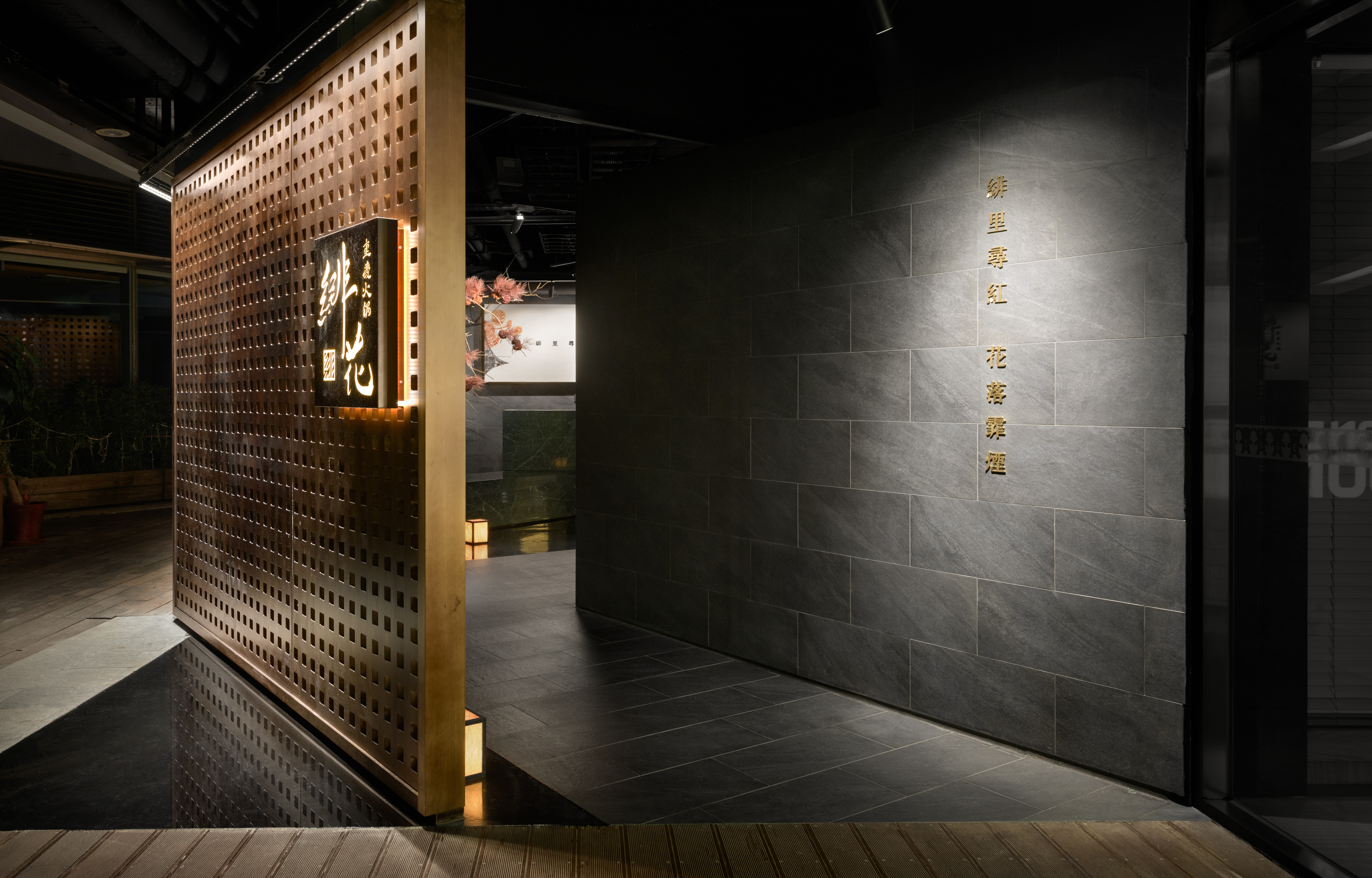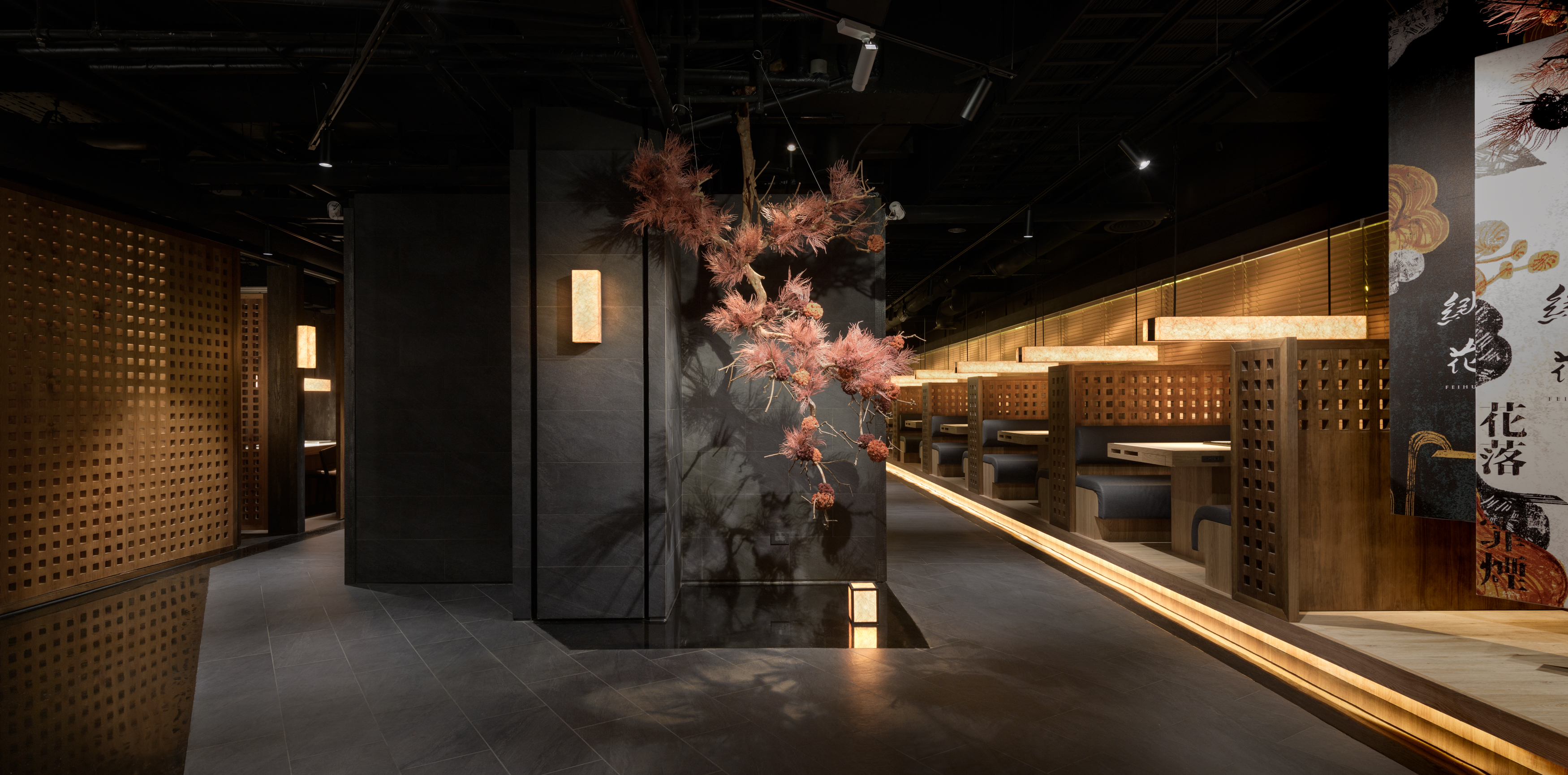 This project revolves around the meticulous planning of a dining space that highlights the authentic experience of Chongqing hot pot. The design concept draws inspiration from the storied ancient city of Chongqing, seamlessly merging traditional aesthetics with a contemporary Chinese flair to craft an enchanting atmosphere reminiscent of a historic capital. The spatial arrangement and landscaping are thoughtfully influenced by the evocative imagery of "Entering the mountain city, traversing the city bridges, meandering through vibrant streets, and gazing upon the ethereal beauty of the fog-laden city illuminated by the warm glow of countless homes." The aim is to create an immersive ambiance that not only transports visitors to the heart of ancient Chongqing but also enhances their culinary journey, allowing them to fully savor the rich flavors and cultural heritage embedded in each dish. As one stands outside the store, the entrance corridor unfolds like a bridge that connects to the vibrant city beyond, inviting patrons to step inside. The black, glossy epoxy floor adjacent to the corridor captures and reflects light, mirroring the glimmering surface of a river and setting a serene, elegant tone. As visitors traverse the L-shaped path, the soft, dim lighting envelops them, creating a tranquil ambiance that evokes the rich historical essence of the ancient city of Chongqing. Upon entering the reception area, guests will notice a thoughtfully designed traffic flow diversion system. Striking red flower branches, reminiscent of hibiscus blossoms, elegantly outline the boundaries between the private rooms and semi-open seating areas, gracefully dividing the space into distinct left and right zones. This design not only streamlines navigation for customers but also ensures a sense of privacy.