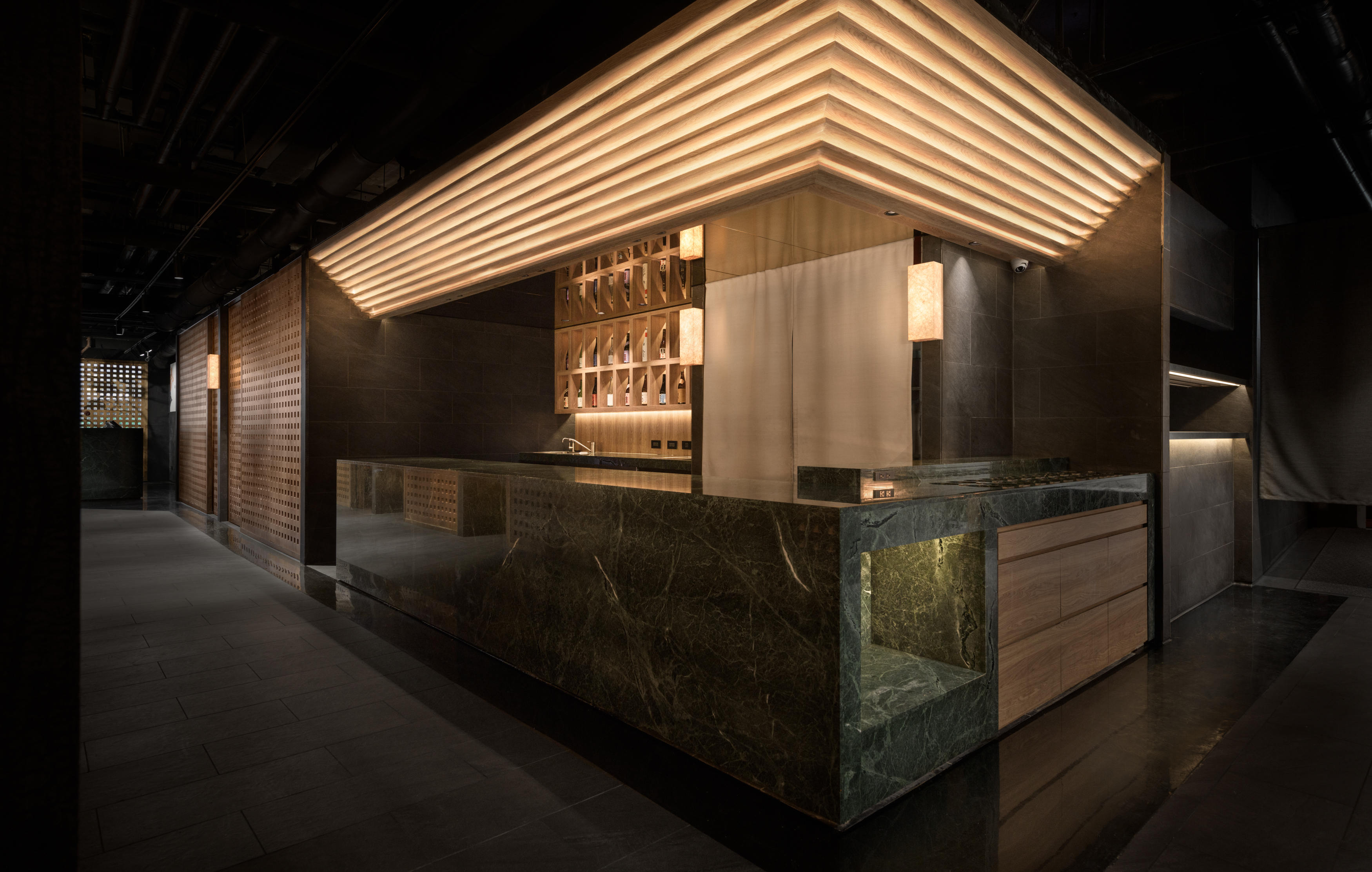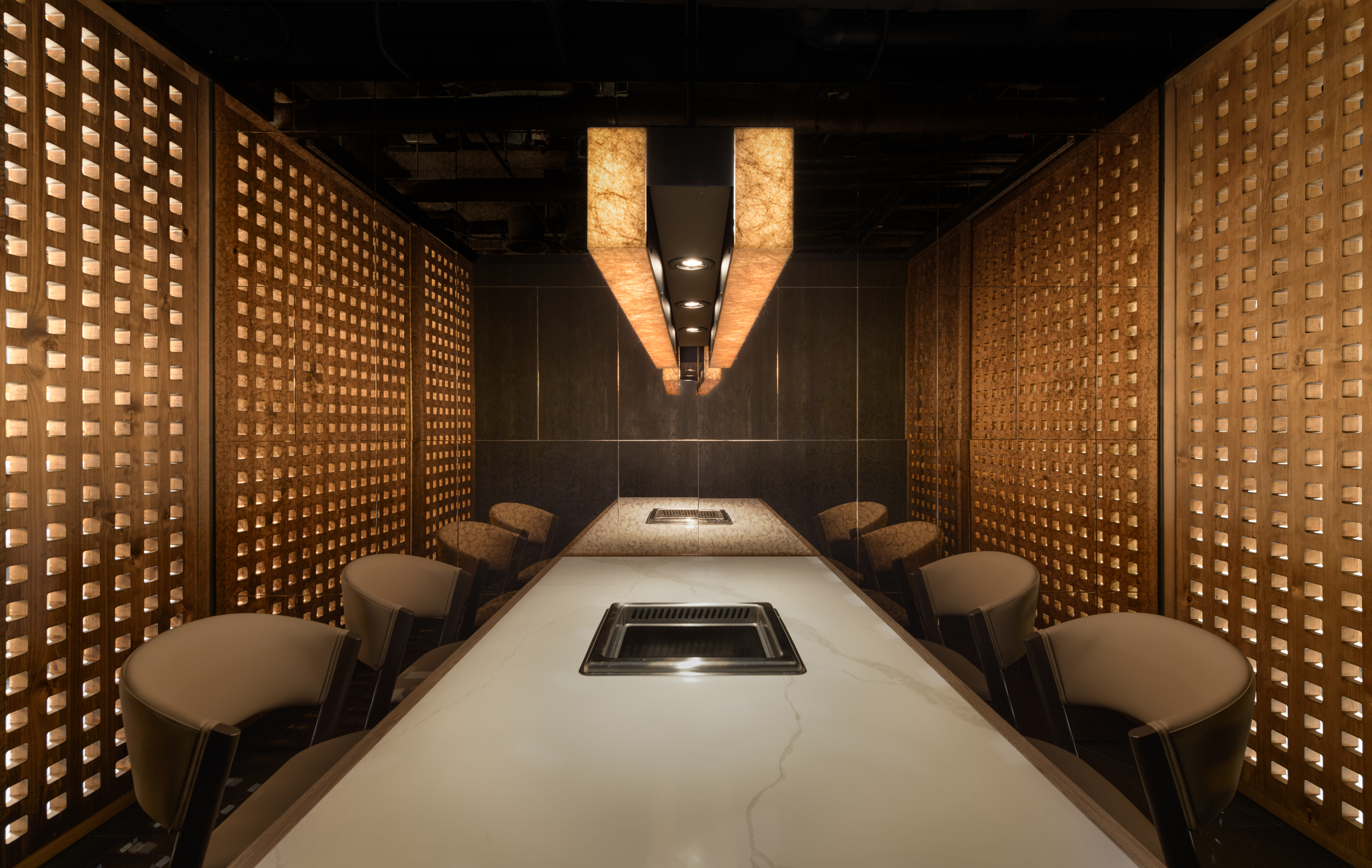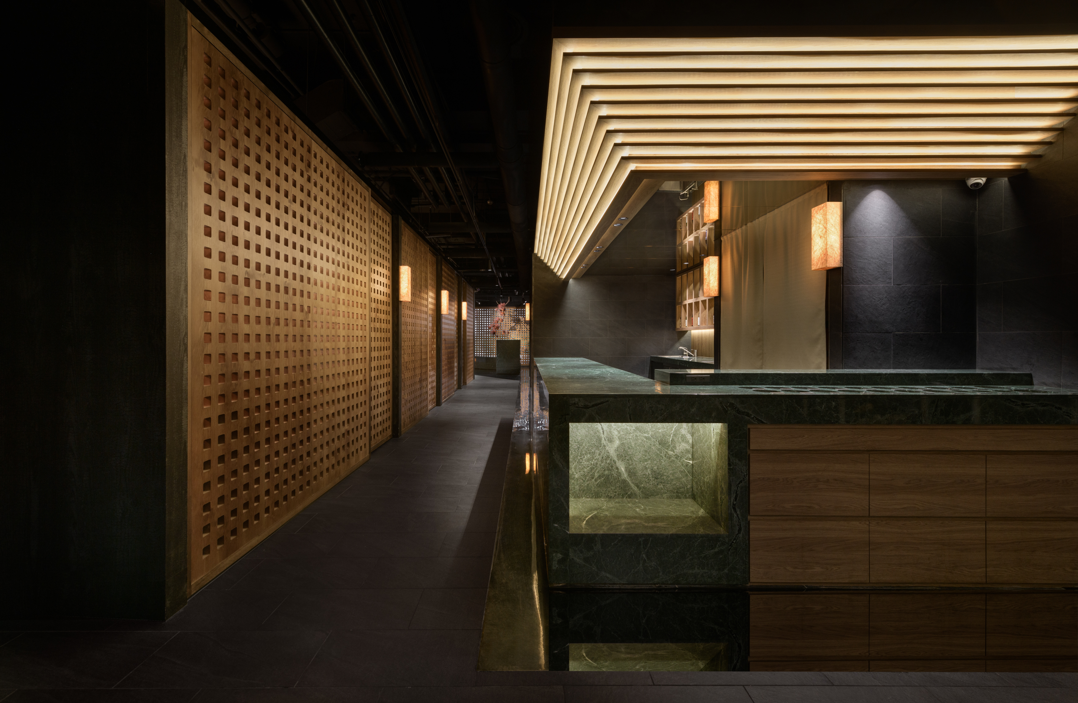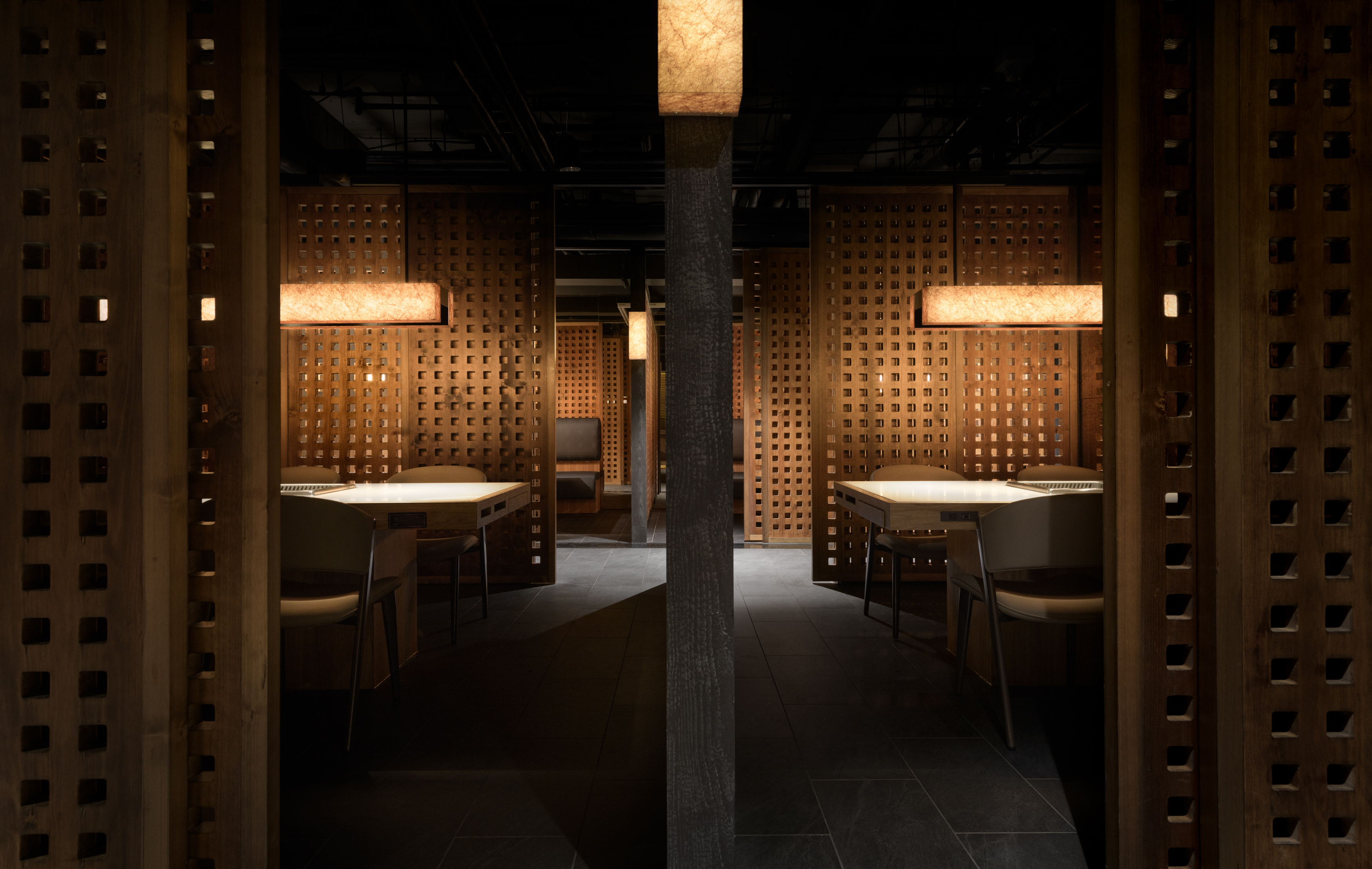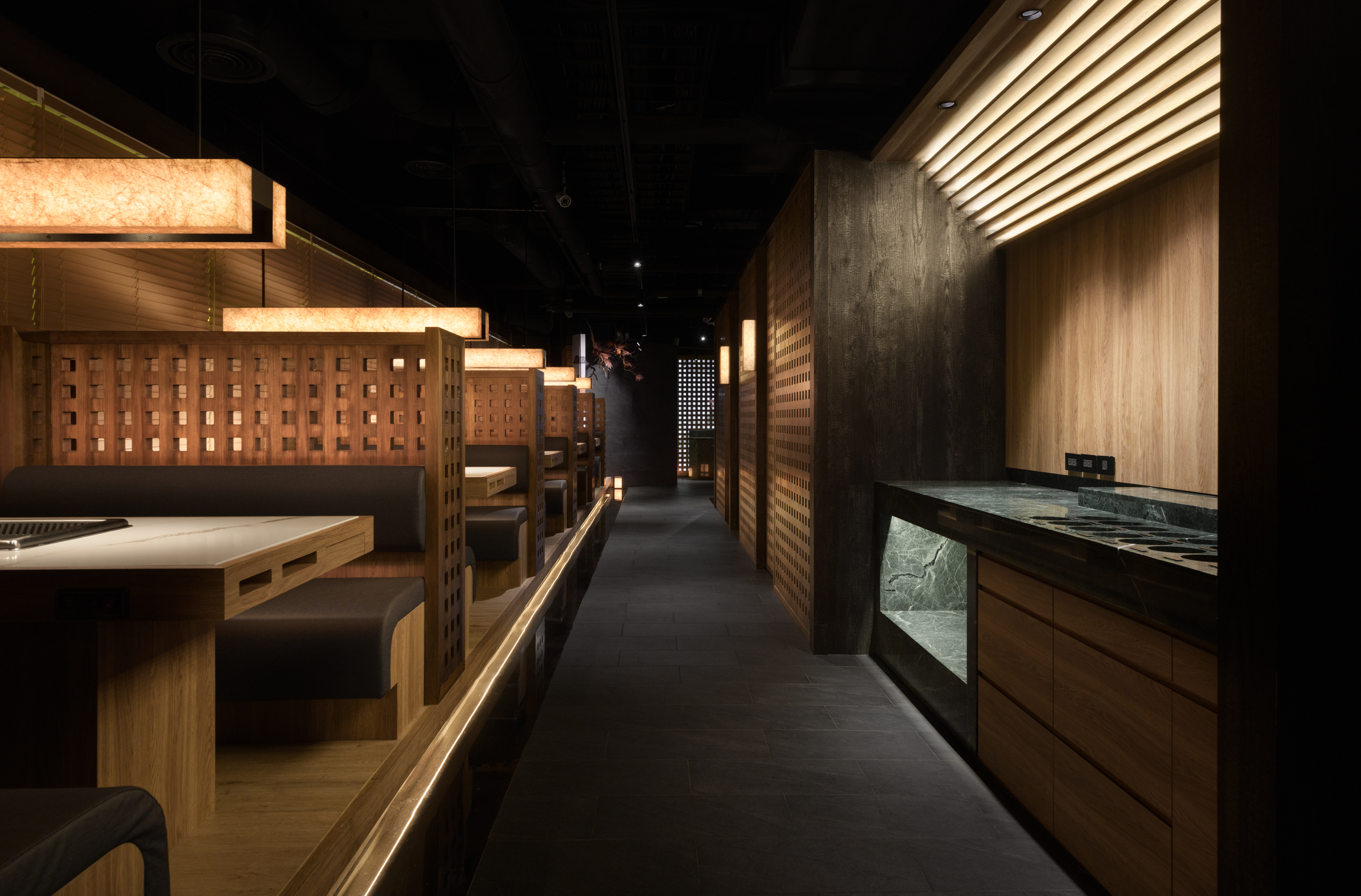 This project revolves around the meticulous planning of a dining space that highlights the authentic experience of Chongqing hot pot. The design concept draws inspiration from the storied ancient city of Chongqing, seamlessly merging traditional aesthetics with a contemporary Chinese flair to craft an enchanting atmosphere reminiscent of a historic capital. The spatial arrangement and landscaping are thoughtfully influenced by the evocative imagery of "Entering the mountain city, traversing the city bridges, meandering through vibrant streets, and gazing upon the ethereal beauty of the fog-laden city illuminated by the warm glow of countless homes." The aim is to create an immersive ambiance that not only transports visitors to the heart of ancient Chongqing but also enhances their culinary journey, allowing them to fully savor the rich flavors and cultural heritage embedded in each dish. As one stands outside the store, the entrance corridor unfolds like a bridge that connects to the vibrant city beyond, inviting patrons to step inside. The black, glossy epoxy floor adjacent to the corridor captures and reflects light, mirroring the glimmering surface of a river and setting a serene, elegant tone. As visitors traverse the L-shaped path, the soft, dim lighting envelops them, creating a tranquil ambiance that evokes the rich historical essence of the ancient city of Chongqing. Upon entering the reception area, guests will notice a thoughtfully designed traffic flow diversion system. Striking red flower branches, reminiscent of hibiscus blossoms, elegantly outline the boundaries between the private rooms and semi-open seating areas, gracefully dividing the space into distinct left and right zones. This design not only streamlines navigation for customers but also ensures a sense of privacy.