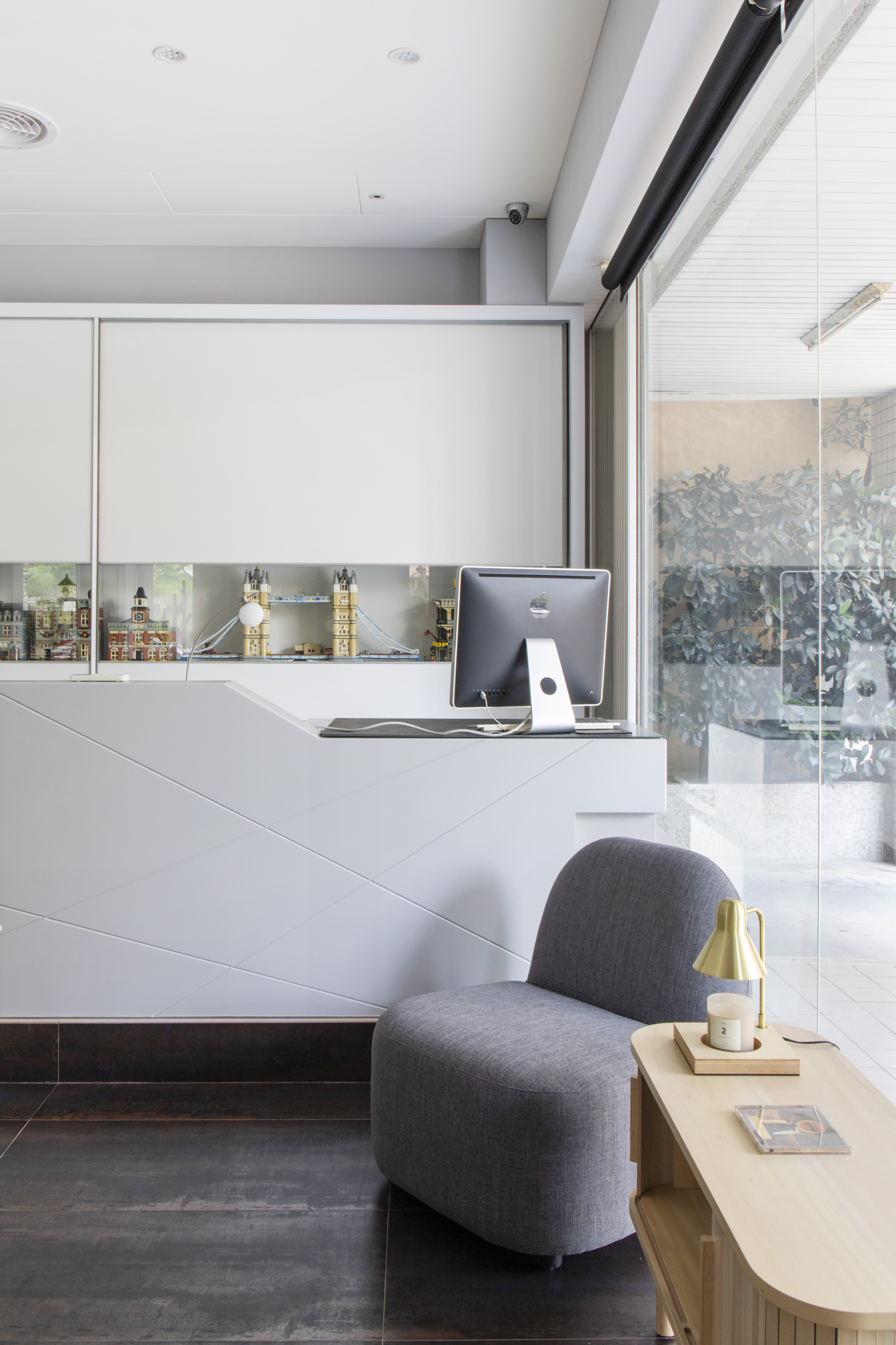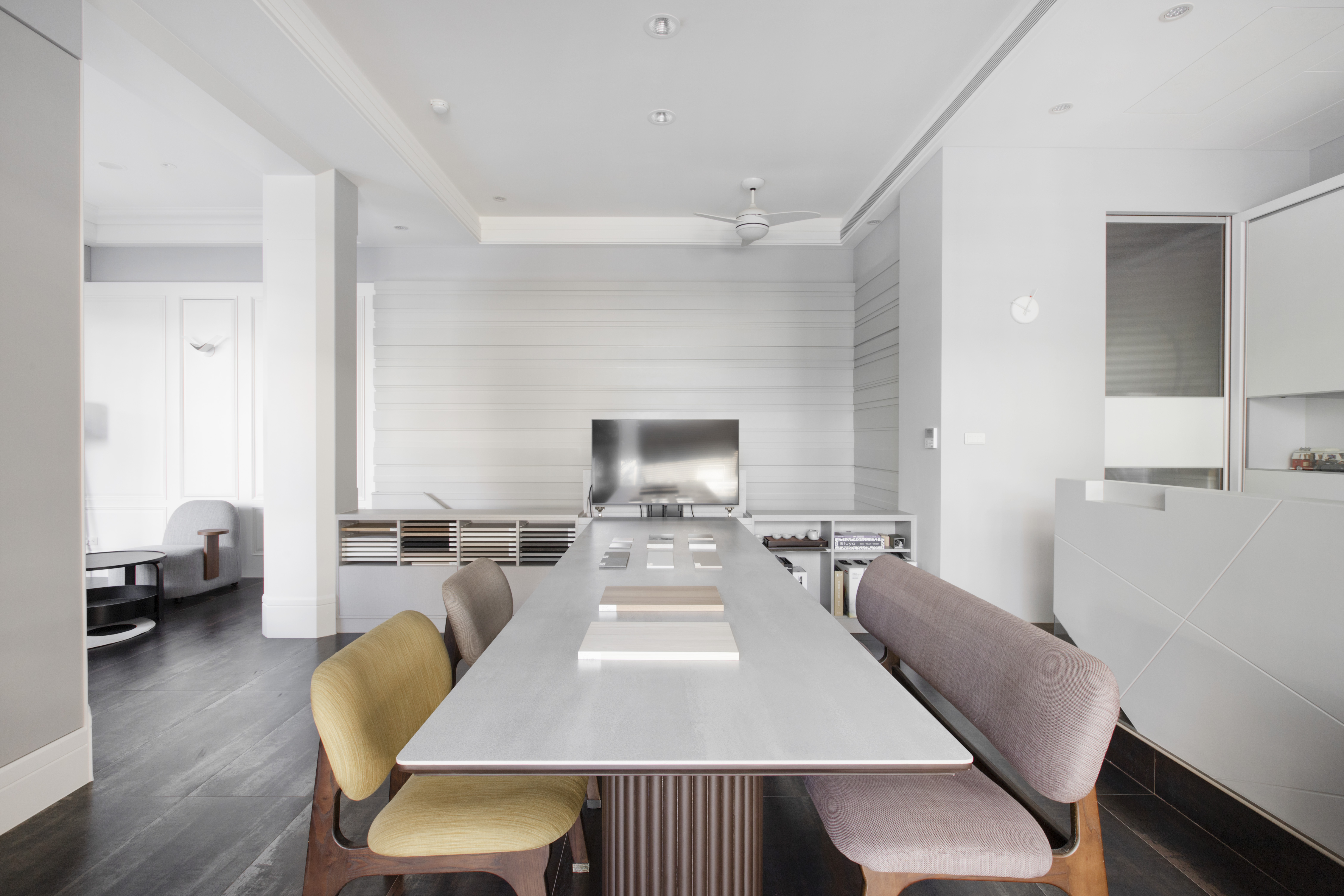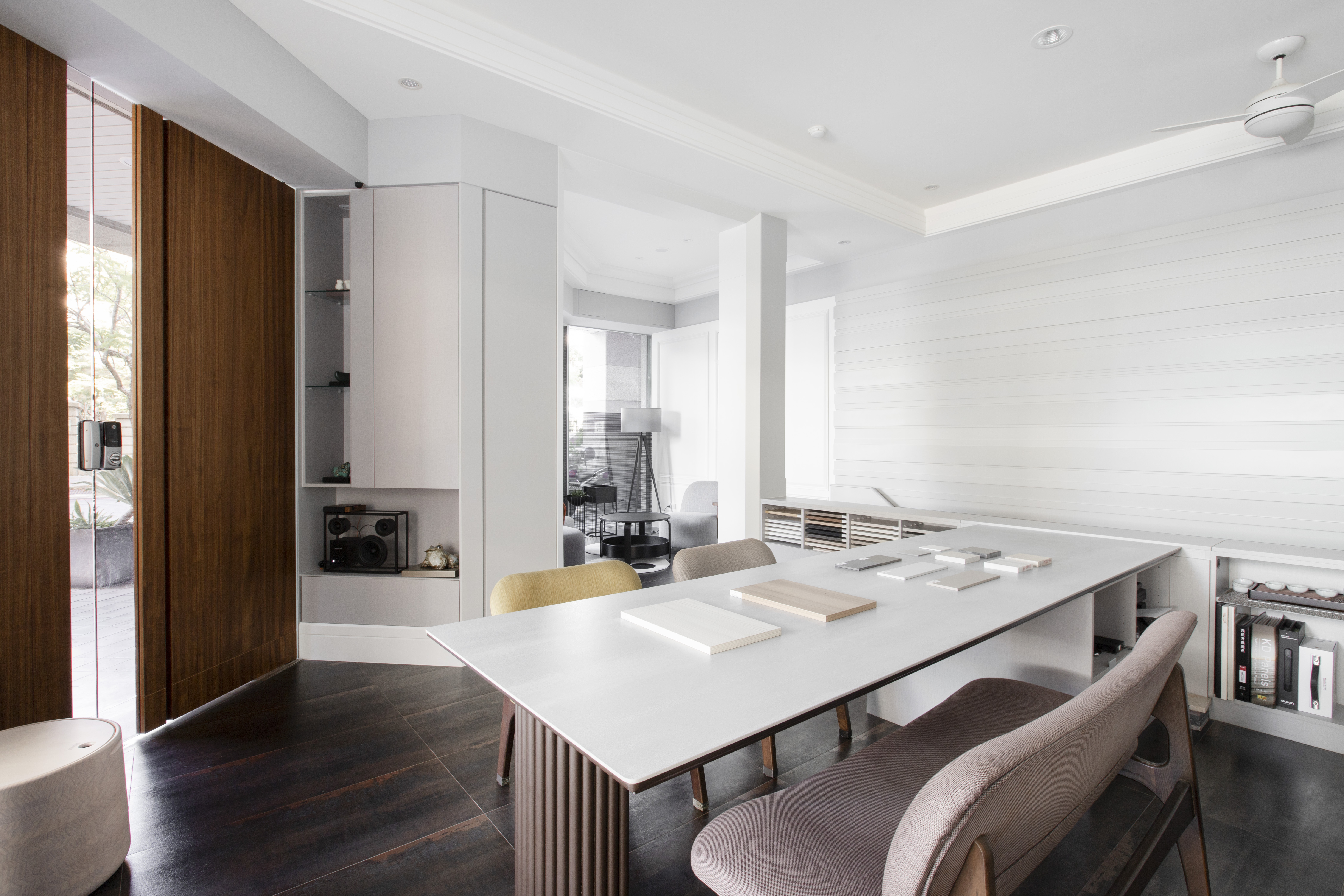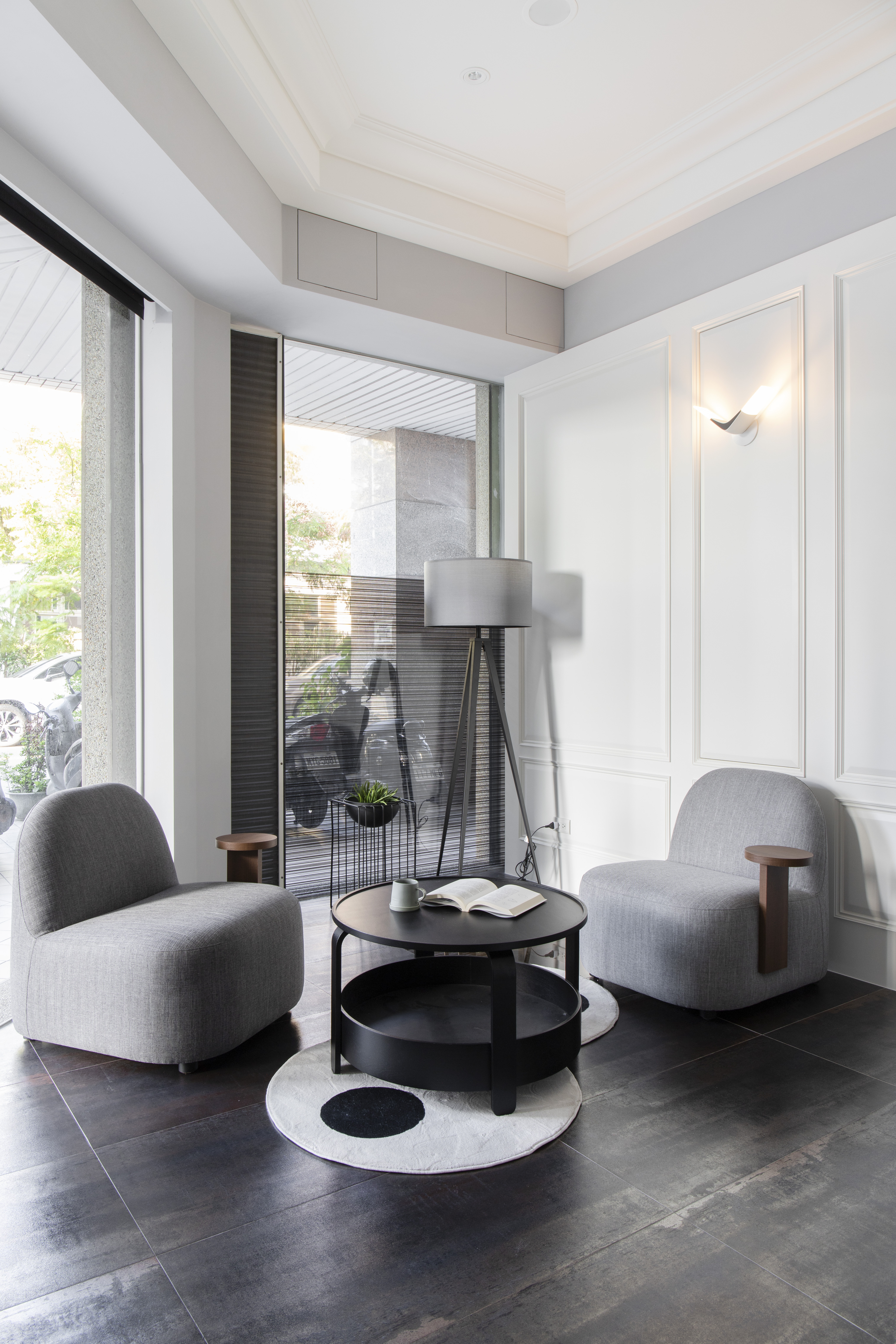 This project centers around an innovative design team tasked with planning their own office space. As an interior design company, they recognize that their workspace must diverge significantly from the typical layout of a commercial store. With this in mind, the team meticulously conceptualized a bright and inviting atmosphere that beautifully showcases their professional identity. To achieve this vision, they selected a color palette that embodies simplicity and brightness, reflecting an organized and polished corporate image. Furthermore, the incorporation of custom-made material storage cabinets, a liftable TV, and a thoughtfully designed semi-low wall helps to effectively reduce visual clutter, creating a more streamlined environment. In addition to these elements, the team embraced the warmth of wooden accents throughout the space, which adds a touch of natural beauty. They also envisioned a dedicated lounge area, which serves as a necessary counterbalance to the often cold and sterile feel of traditional commercial settings. This carefully curated design not only provides clients with a welcoming and comfortable experience, akin to a home away from home, but also fosters a healthy and sustainable work environment for colleagues. By bridging aesthetics with functionality, the team has created a space that truly reflects their values and vision. Given the strategic location of the base at a corner, the design team thoughtfully oriented the entrance at an angle, thereby facilitating a wider and smoother flow for entry. As visitors step into the room, they are greeted by an engaging end wall composed of multiple wooden boards that are meticulously stacked and arranged, then elegantly painted in pristine white. This aesthetic choice not only establishes a cohesive overall color scheme but also introduces visual depth, making the space feel both open and bright.