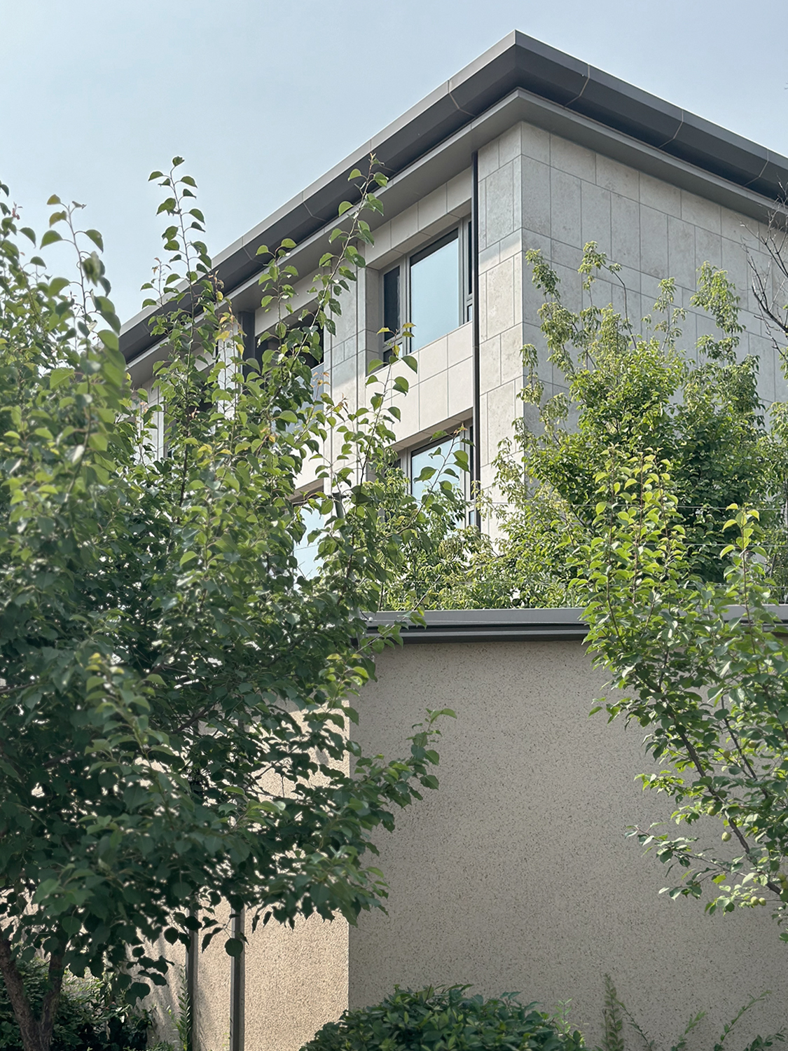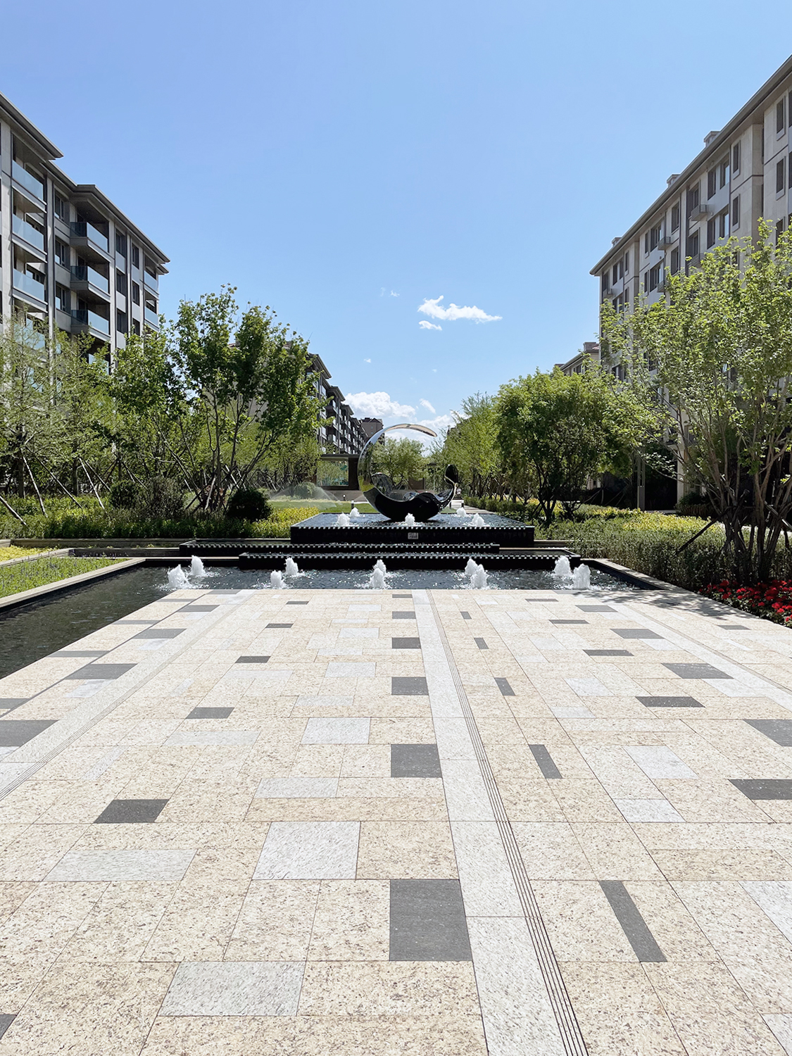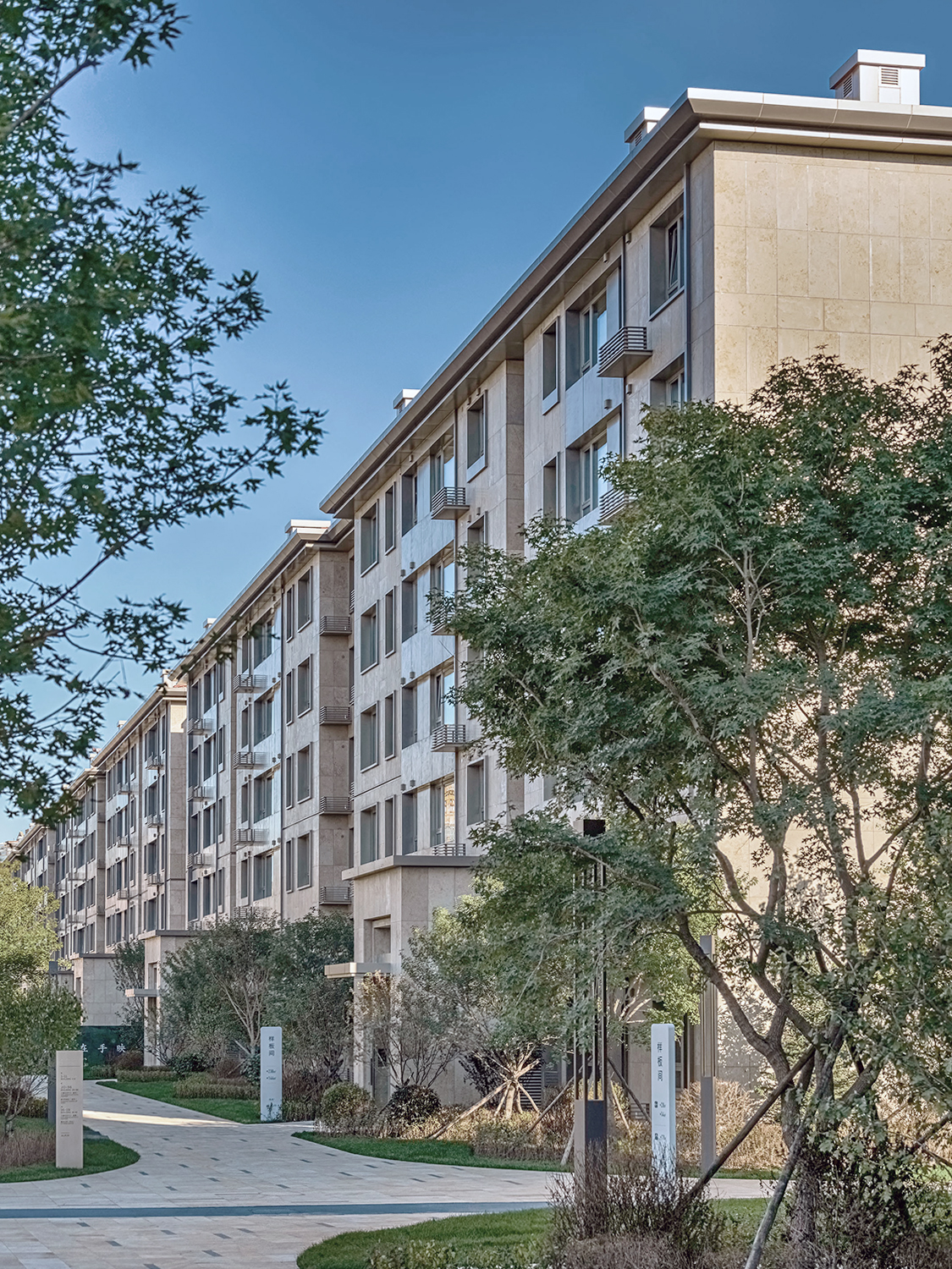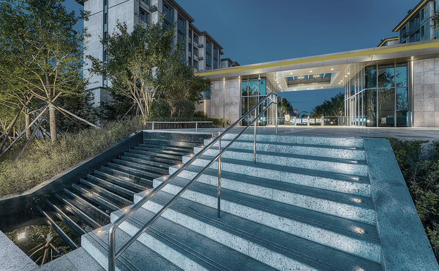 Nestled in the lush greenery of Jingyue District in the city's southeast, this community is set amid rolling hills, with Juyue Commercial Street to the south providing a buffer between the community and main roads. From the Sakura East Street green belt, a pathway extends northward to a plaza, passing through a three-story canopy accompanied by the soothing sound of cascading water, leading to the southern entrance and connecting the landscaped greenways' main north-south axis. On the west, a grand staircase flanked by flowing water ascends the slope, while a zigzagging ramp gently bridges terrain differences, offering sweeping community views. The tranquil, garden-like setting features several dozen low-density buildings, four to eight stories high, blending seamlessly into the green surroundings. Warm limestone clads the exterior walls, enhanced by refined metal accents that evoke an intimate, livable space. Glass railings create flush balconies that merge with the indoors, forming intermediate living spaces designed to blend with nature and serve as a repository for family memories.