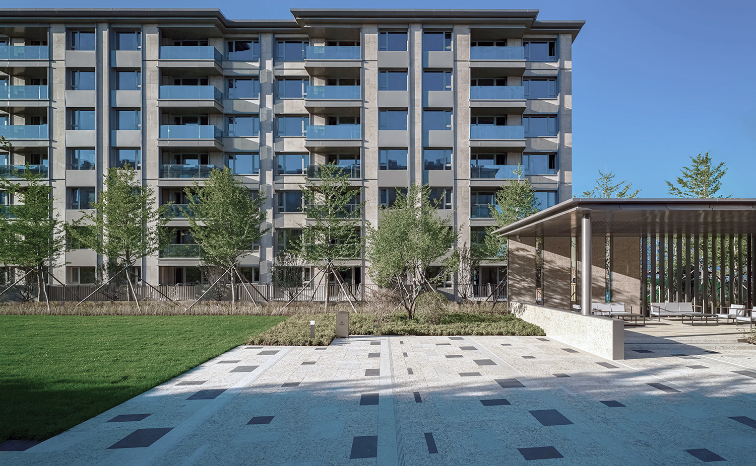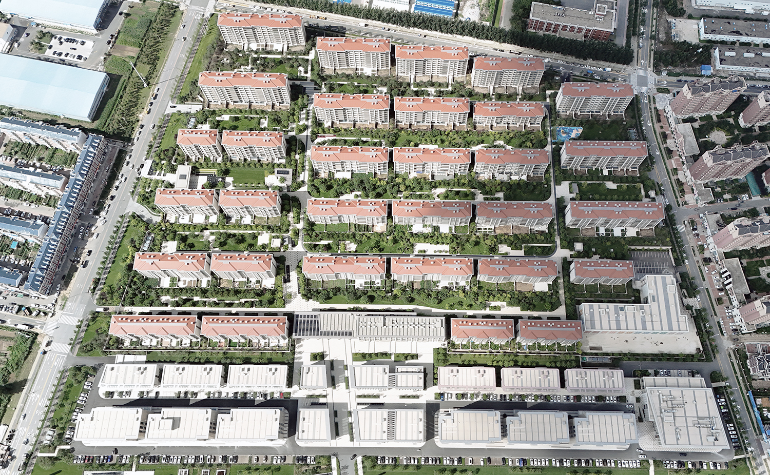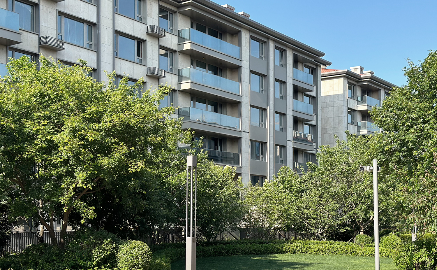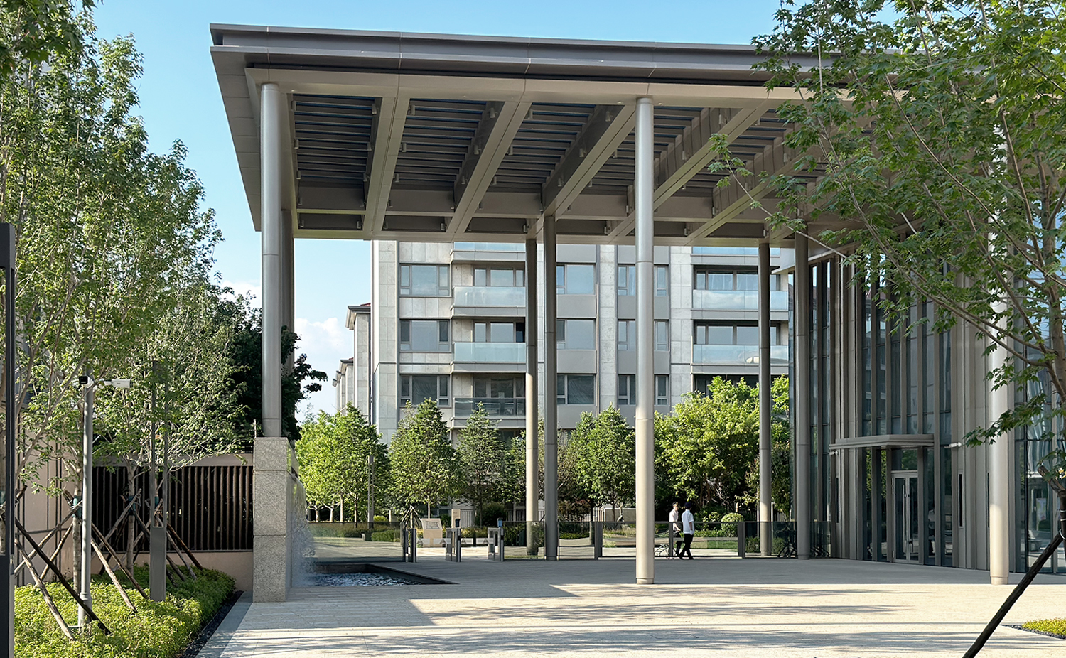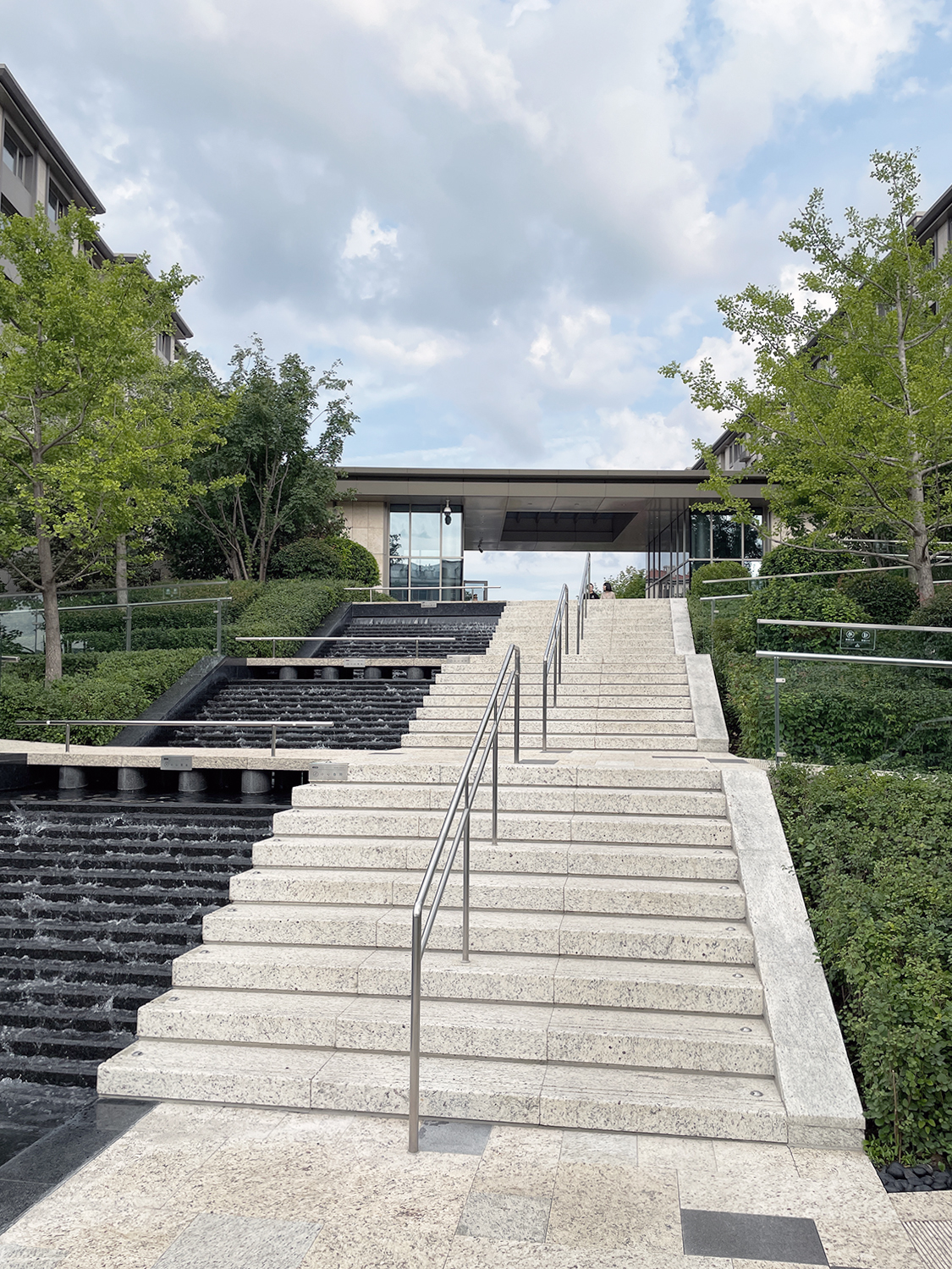 Nestled in the lush greenery of Jingyue District in the city's southeast, this community is set amid rolling hills, with Juyue Commercial Street to the south providing a buffer between the community and main roads. From the Sakura East Street green belt, a pathway extends northward to a plaza, passing through a three-story canopy accompanied by the soothing sound of cascading water, leading to the southern entrance and connecting the landscaped greenways' main north-south axis. On the west, a grand staircase flanked by flowing water ascends the slope, while a zigzagging ramp gently bridges terrain differences, offering sweeping community views. The tranquil, garden-like setting features several dozen low-density buildings, four to eight stories high, blending seamlessly into the green surroundings. Warm limestone clads the exterior walls, enhanced by refined metal accents that evoke an intimate, livable space. Glass railings create flush balconies that merge with the indoors, forming intermediate living spaces designed to blend with nature and serve as a repository for family memories.