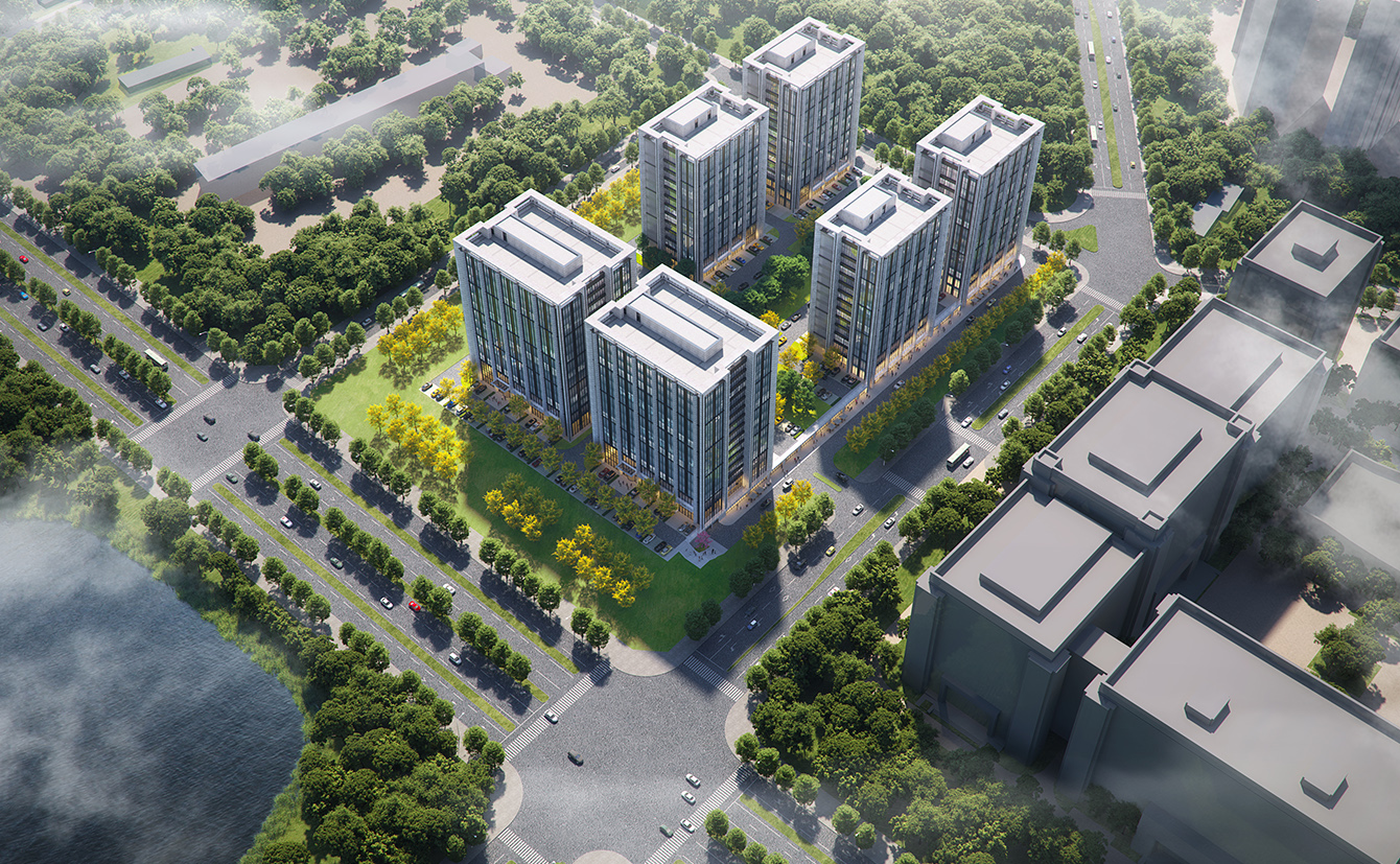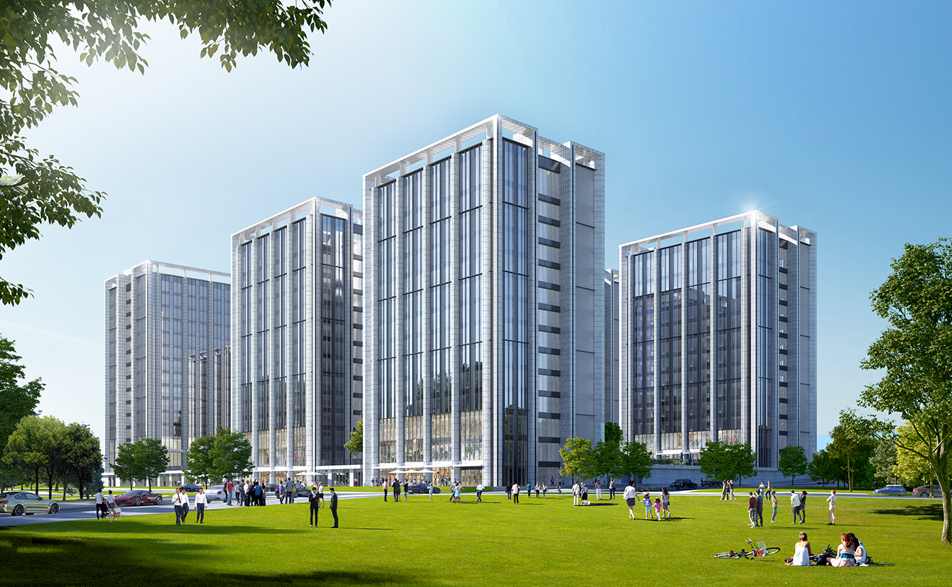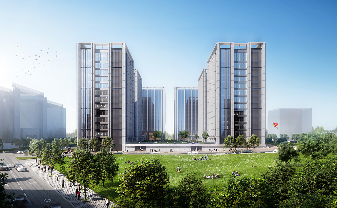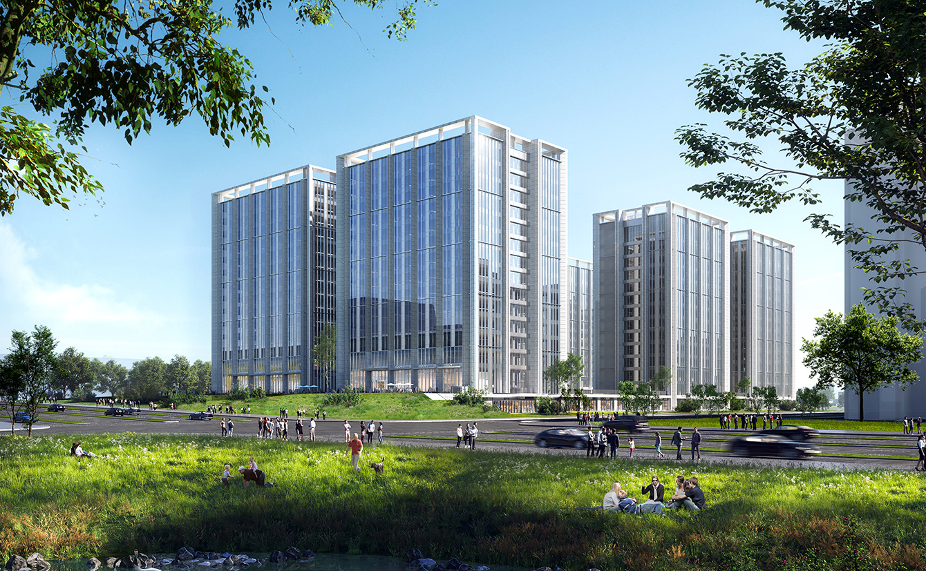 The base is located on the east side of Renmin Street, the central north-south axis of Changchun City, with the 30.85-hectare Youyi Park to the west. The architectural complex consists of six independent office buildings, each 13 to 14 stories high, positioned atop a shared underground level (B1F). On the west side, adjacent to the main street, Buildings 1 and 2 rise to 14 stories, while on the east side, four office buildings enclose a green courtyard that opens toward the east. This landscaped space provides a comfortable environment for office occupants to relax and connect with nature. Due to the surrounding site's natural topography, which slopes from north to south, the southern edge of the base naturally forms a street-facing commercial frontage at ground level. Additionally, three vehicular access points are strategically positioned within the exposed sections of the base, allowing direct entry into the underground parking area. The building façade is characterized by a minimalist vertical stone wall framework, complemented by refined metal accents and glass curtain wall volumes. This combination creates a modern garden office environment designed to meet both present and future physical and mental well-being needs.