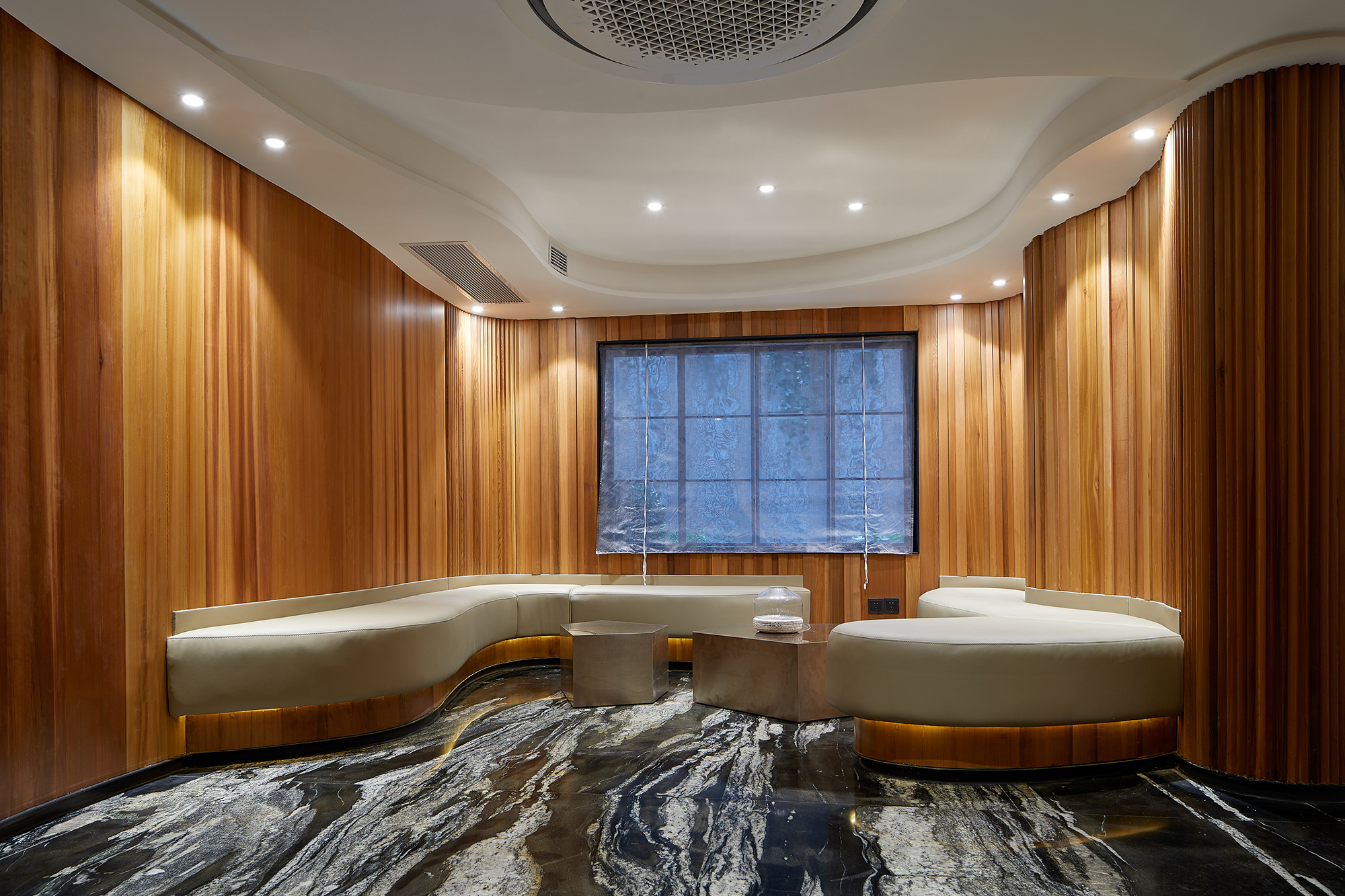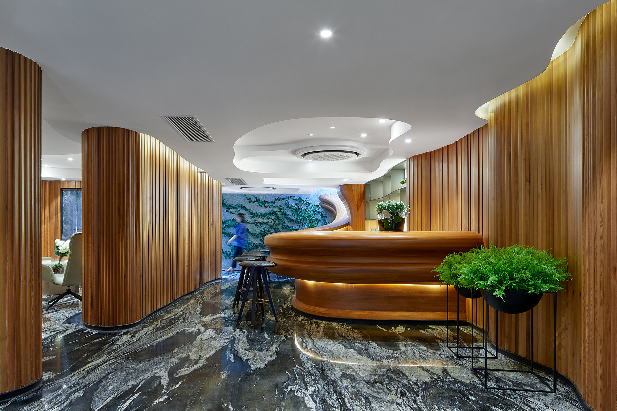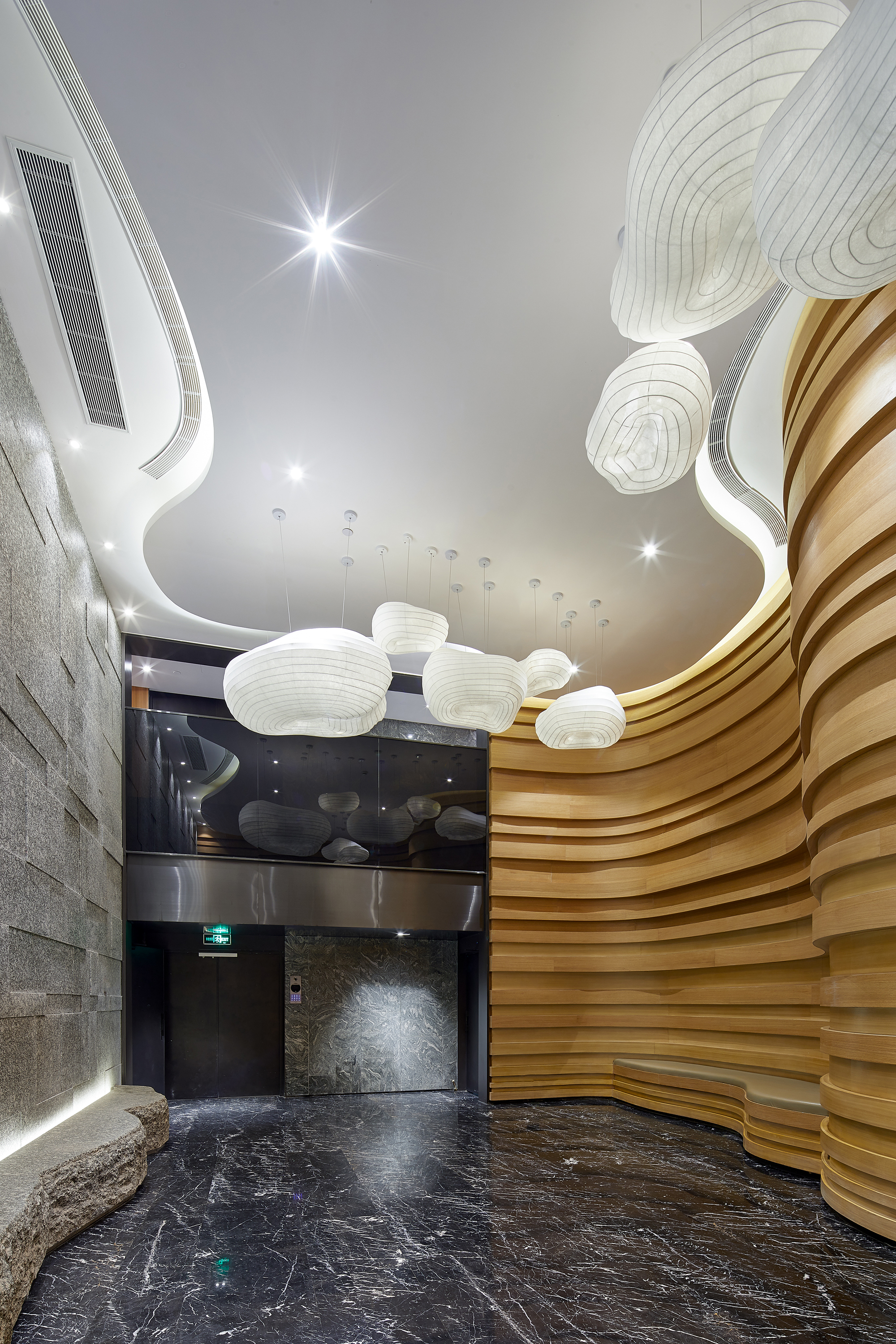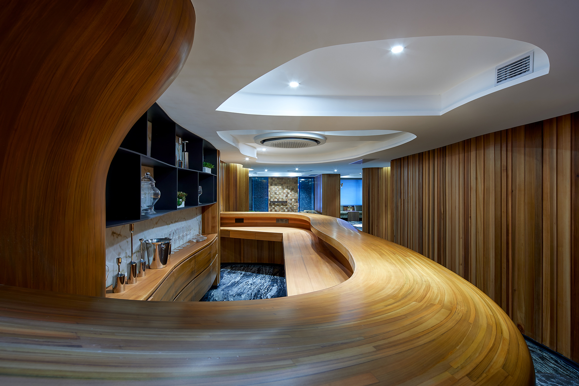 This project focuses on the planning and development of public facilities within a property in the bustling city of Shanghai. Initially designed as a residential unit, the space underwent a transformative decision after thoughtful discussions among the owners, who collectively agreed to repurpose it as a vibrant public area for community engagement and use. Embracing certain structural constraints, such as the existing wall panel design and the maximum allowable building height, the project reflects a creative reinterpretation of the space. The design team drew deep inspiration from the picturesque Suzhou River, allowing its fluid contours and natural elegance to guide their vision. The team employed gentle, winding curves that soften the rigidity of straight lines, creating a harmonious flow throughout the area. By extending the walls, the designers crafted a sense of movement and rhythm that evokes the river's essence, seamlessly merging the structural limitations with an open and inviting ambiance. This innovative approach not only mitigated the architectural constraints but also enriched the overall experience of the community space, making it a lively focal point for residents and visitors alike. The lobby's design draws inspiration from the rich tapestry of the local natural environment, creating an inviting and harmonious space. Adorned with warm wood tones and elegant stone floors, the area is illuminated by cloud-shaped lighting that casts a soft, ambient glow. This arrangement cultivates a calming and earthy atmosphere, perfect for rejuvenating weary bodies and minds. Departing from conventional square layouts, this project embraces fluidity with its extensive use of rounded shapes and graceful curves. Occupants are gently enveloped in a setting reminiscent of a winding tree hollow, evoking a profound sense of tranquility and connection to nature. The bar area, masterfully crafted from natural wood with organic lines, serves as a serene oasis amidst the urban hustle.
