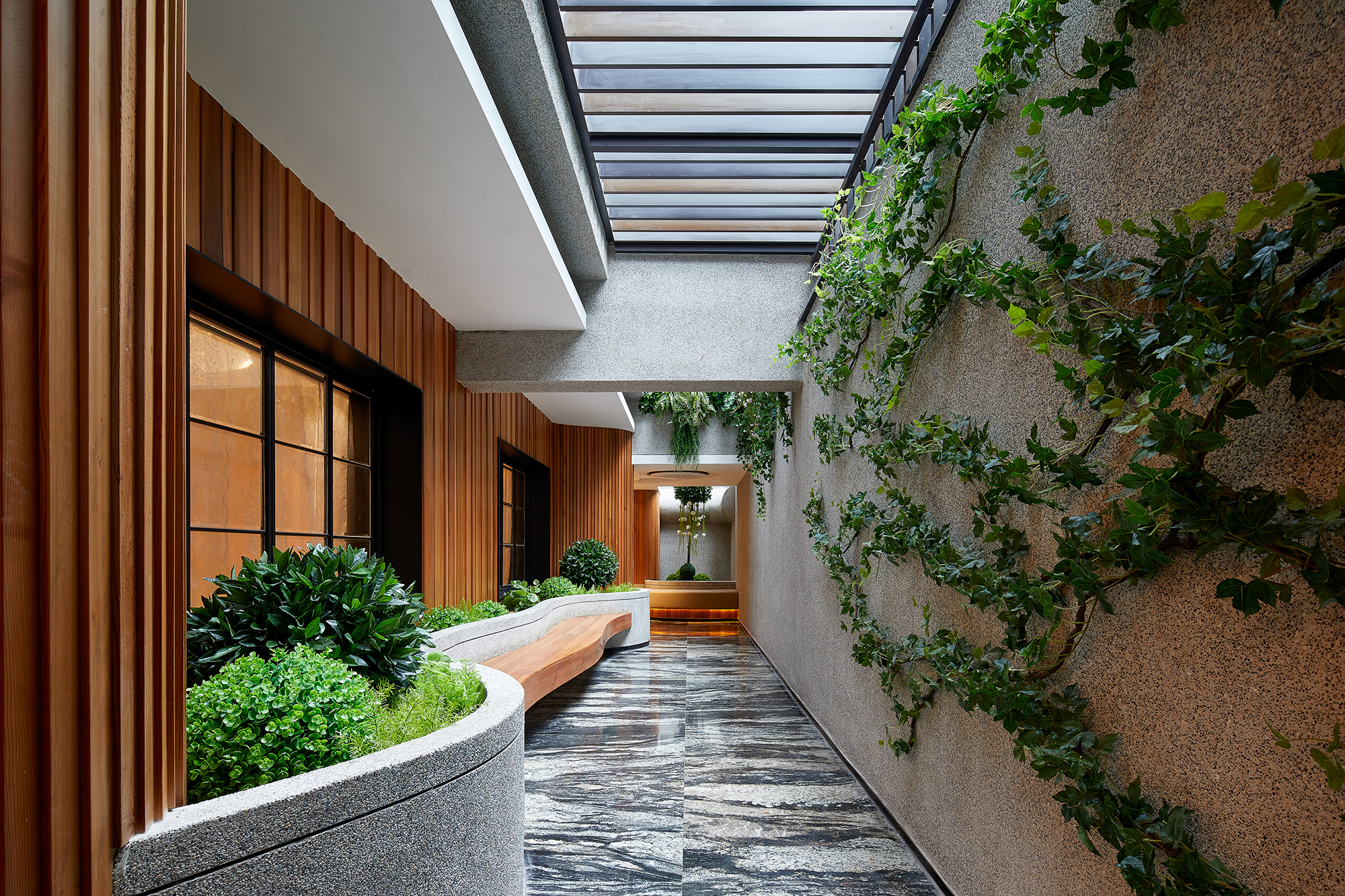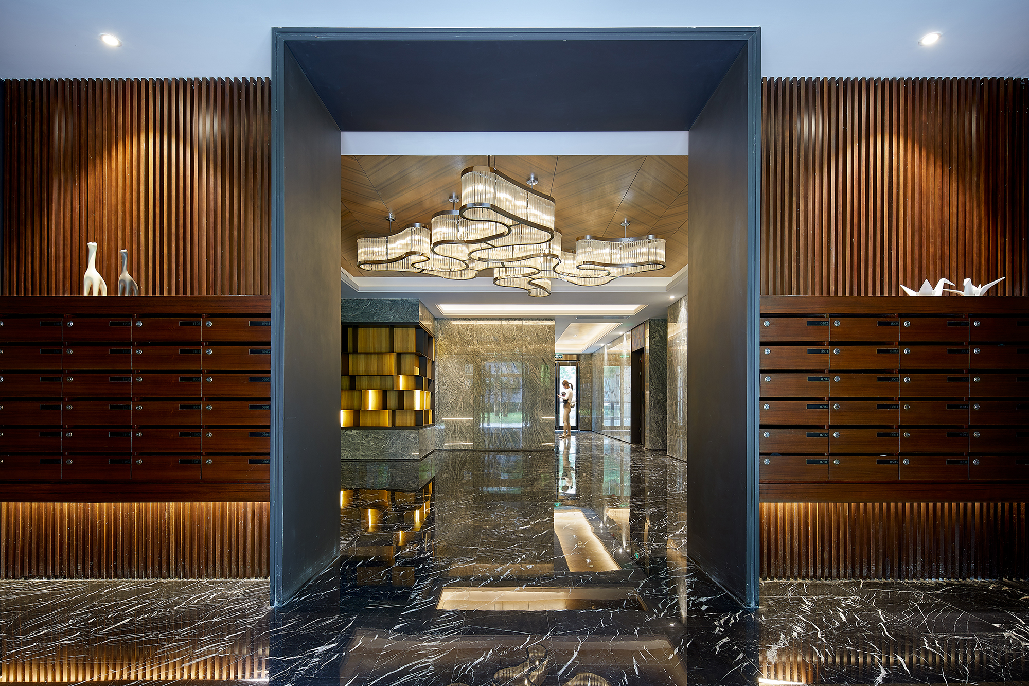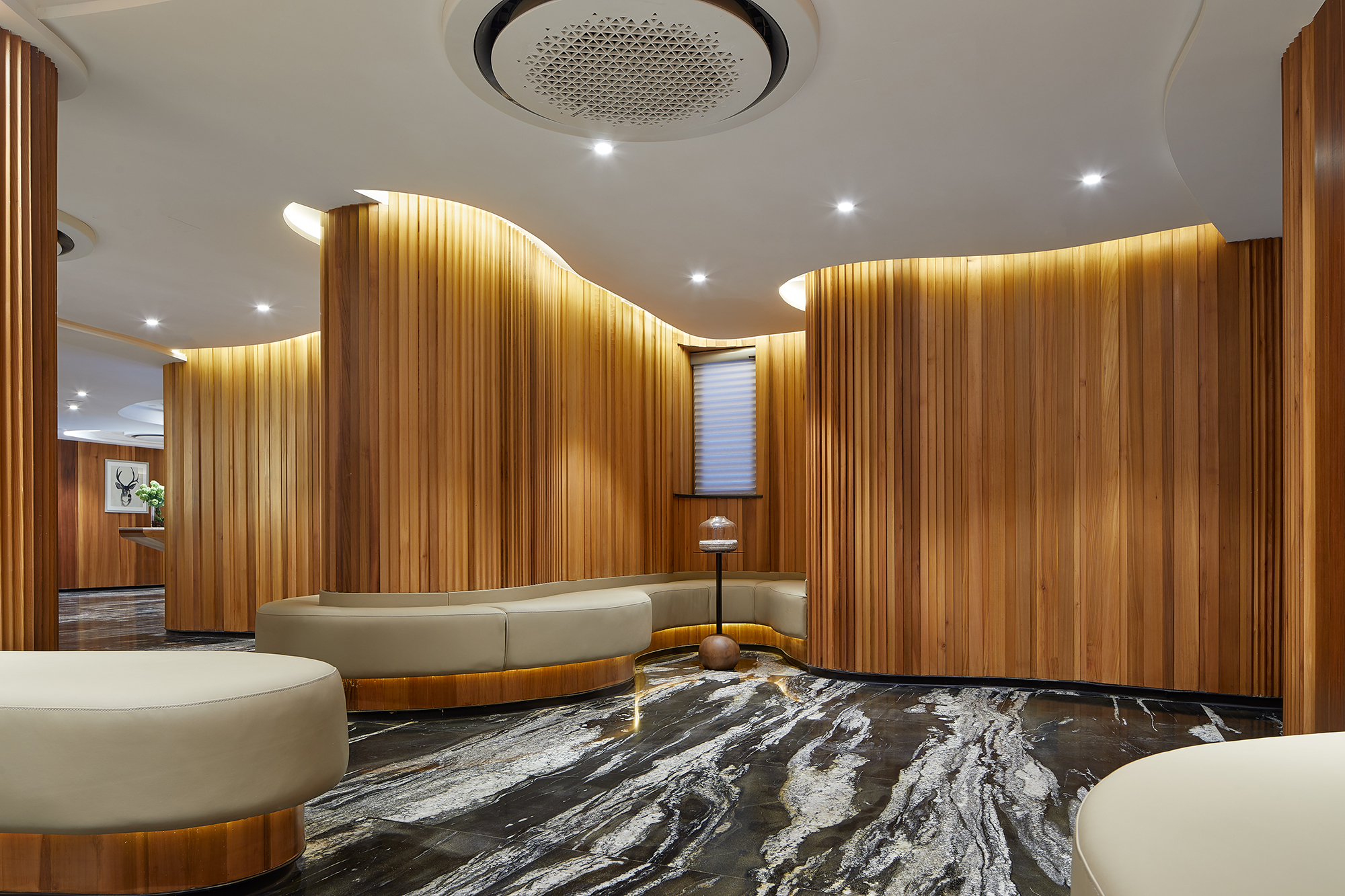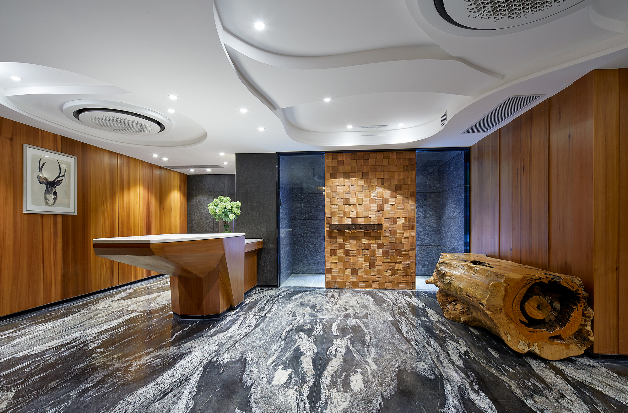 This project focuses on the planning and development of public facilities within a property in the bustling city of Shanghai. Initially designed as a residential unit, the space underwent a transformative decision after thoughtful discussions among the owners, who collectively agreed to repurpose it as a vibrant public area for community engagement and use. Embracing certain structural constraints, such as the existing wall panel design and the maximum allowable building height, the project reflects a creative reinterpretation of the space. The design team drew deep inspiration from the picturesque Suzhou River, allowing its fluid contours and natural elegance to guide their vision. The team employed gentle, winding curves that soften the rigidity of straight lines, creating a harmonious flow throughout the area. By extending the walls, the designers crafted a sense of movement and rhythm that evokes the river's essence, seamlessly merging the structural limitations with an open and inviting ambiance. This innovative approach not only mitigated the architectural constraints but also enriched the overall experience of the community space, making it a lively focal point for residents and visitors alike. The lobby's design draws inspiration from the rich tapestry of the local natural environment, creating an inviting and harmonious space. Adorned with warm wood tones and elegant stone floors, the area is illuminated by cloud-shaped lighting that casts a soft, ambient glow. This arrangement cultivates a calming and earthy atmosphere, perfect for rejuvenating weary bodies and minds. Departing from conventional square layouts, this project embraces fluidity with its extensive use of rounded shapes and graceful curves. Occupants are gently enveloped in a setting reminiscent of a winding tree hollow, evoking a profound sense of tranquility and connection to nature. The bar area, masterfully crafted from natural wood with organic lines, serves as a serene oasis amidst the urban hustle.