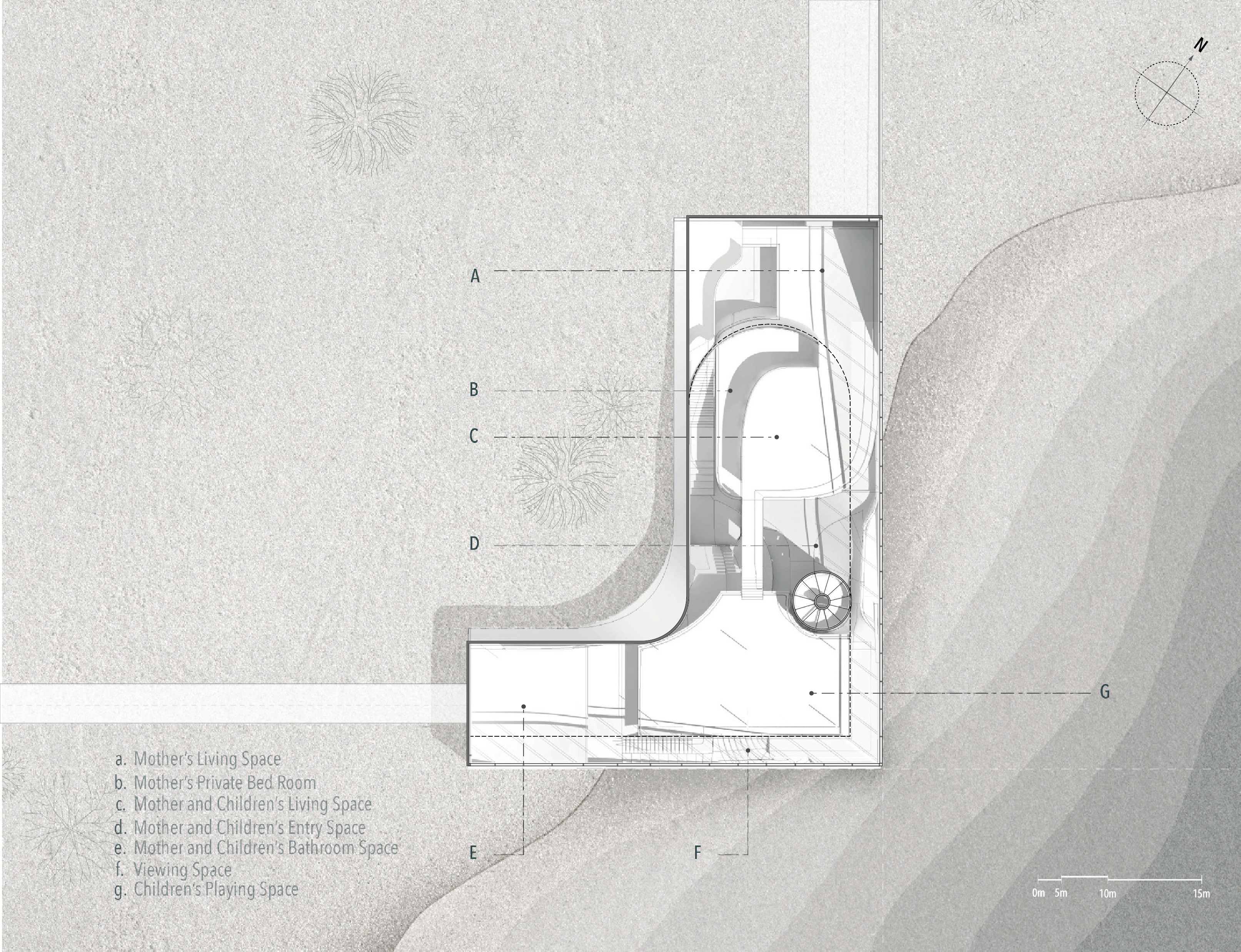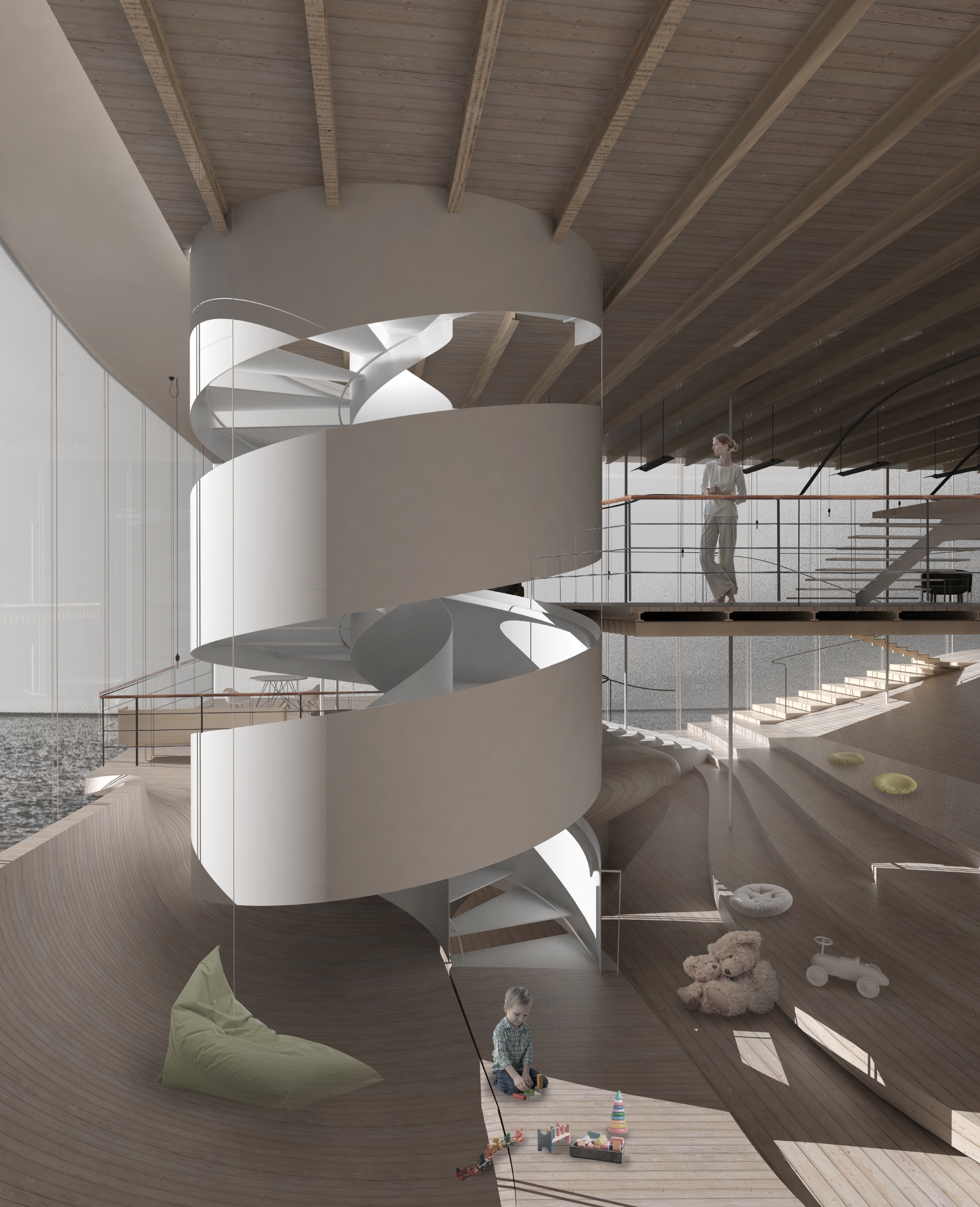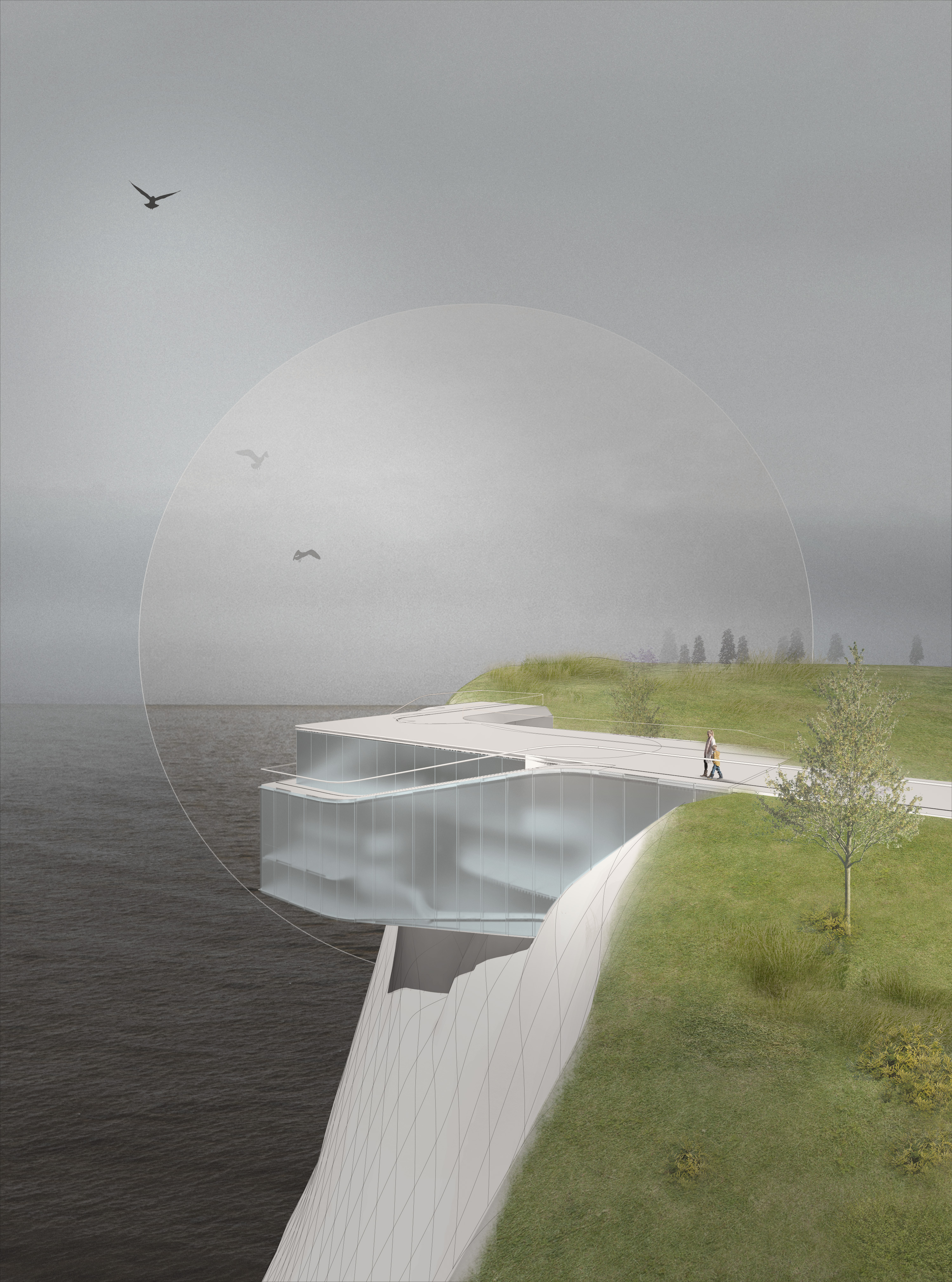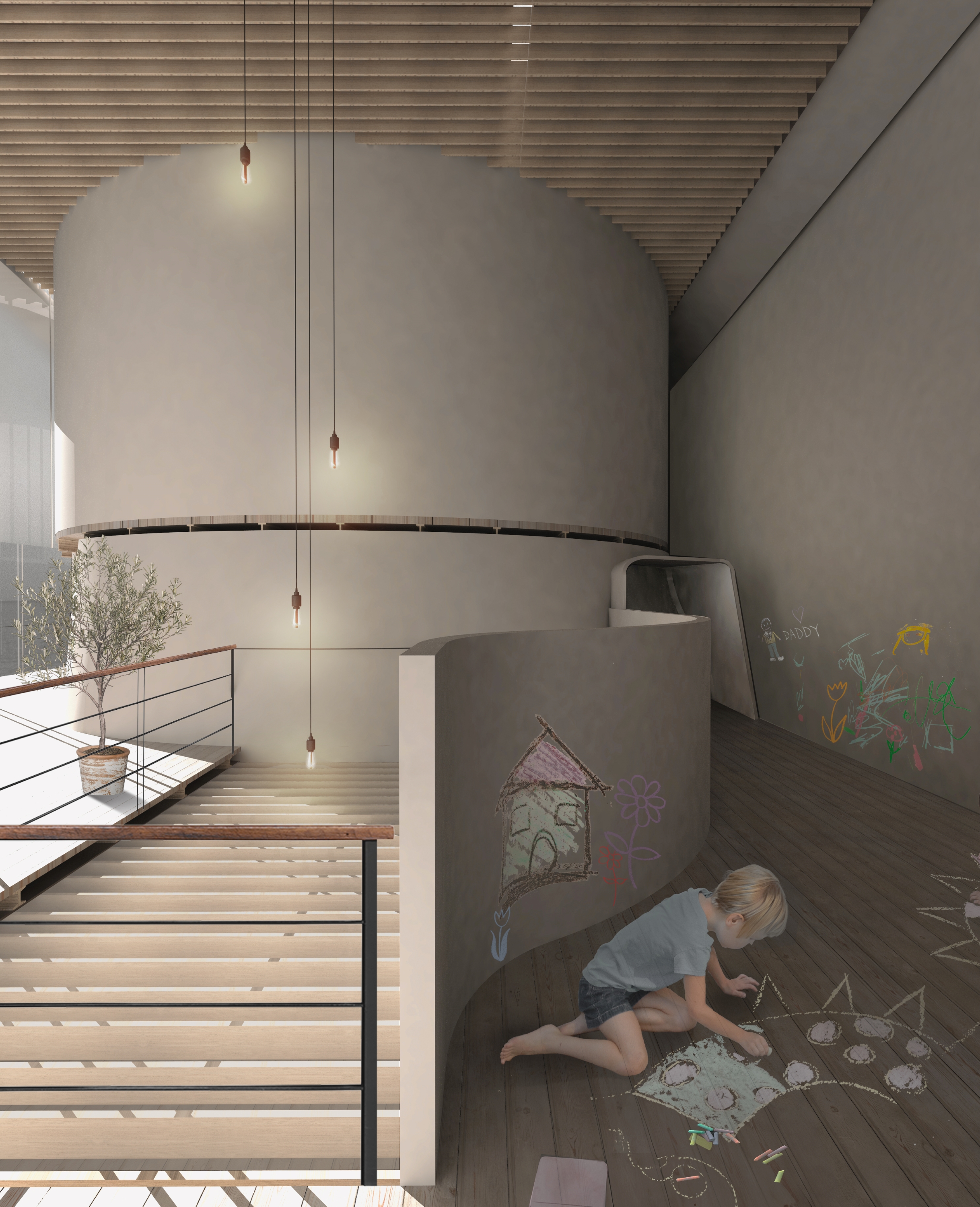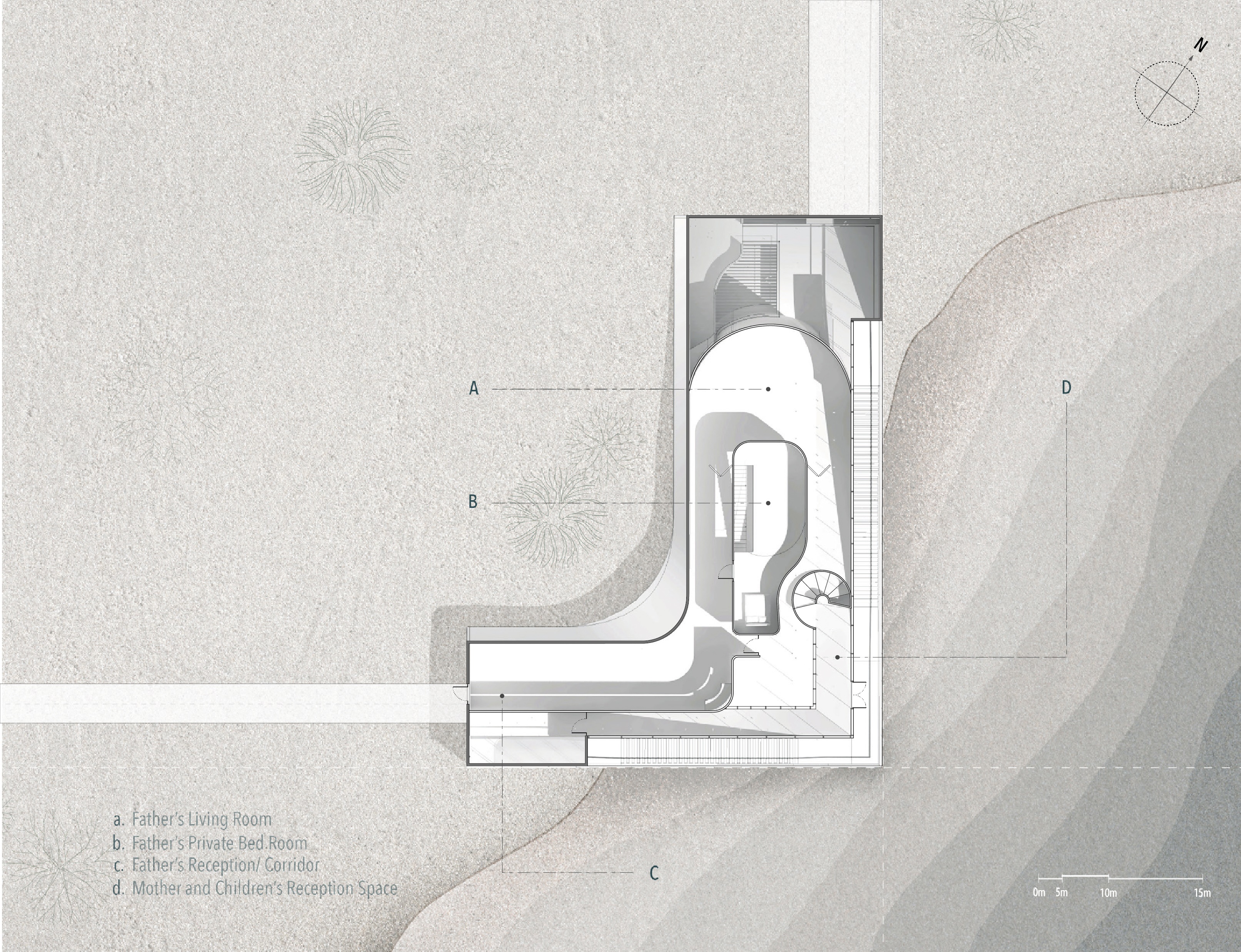 In the fall of 2014, the UnHouse project was conceived as an exploration of cohabitation possibilities for separated parents raising their children together. It challenges the conventional notion of a family home, proposing a new spatial model that allows divorced parents to maintain independent lives while providing their children with a stable environment where they can continue to foster strong connections with both parents. The house is divided into two independent zones, one for each parent. While these spaces remain physically separate, they converge in a shared area designed for the children—a place that serves as both a functional and emotional core. The separation is not just architectural but psychological, shaping the way family members interact. Each parent’s living space consists of both social areas open to the outside world and private retreats, reflecting the complexities of post-separation life. The boundaries within the house are not rigid partitions but fluid thresholds, striking a delicate balance between independence and connection. This design aims to create a secure and nurturing environment where children can naturally interact with both parents despite the shifts in family dynamics. The Un-House is not a space of division but a model for co-parenting, ensuring that while parents may live apart, their shared responsibility and presence in their child’s life remain intact. It enables children to move freely between both worlds, experiencing love and companionship from both parents without feeling torn between them. Perched on the edge of White Cliff, the house mirrors the complexity of family relationships. The winding path leading to the home symbolizes the child’s journey through these changes, navigating between two homes that remain connected through care and commitment.