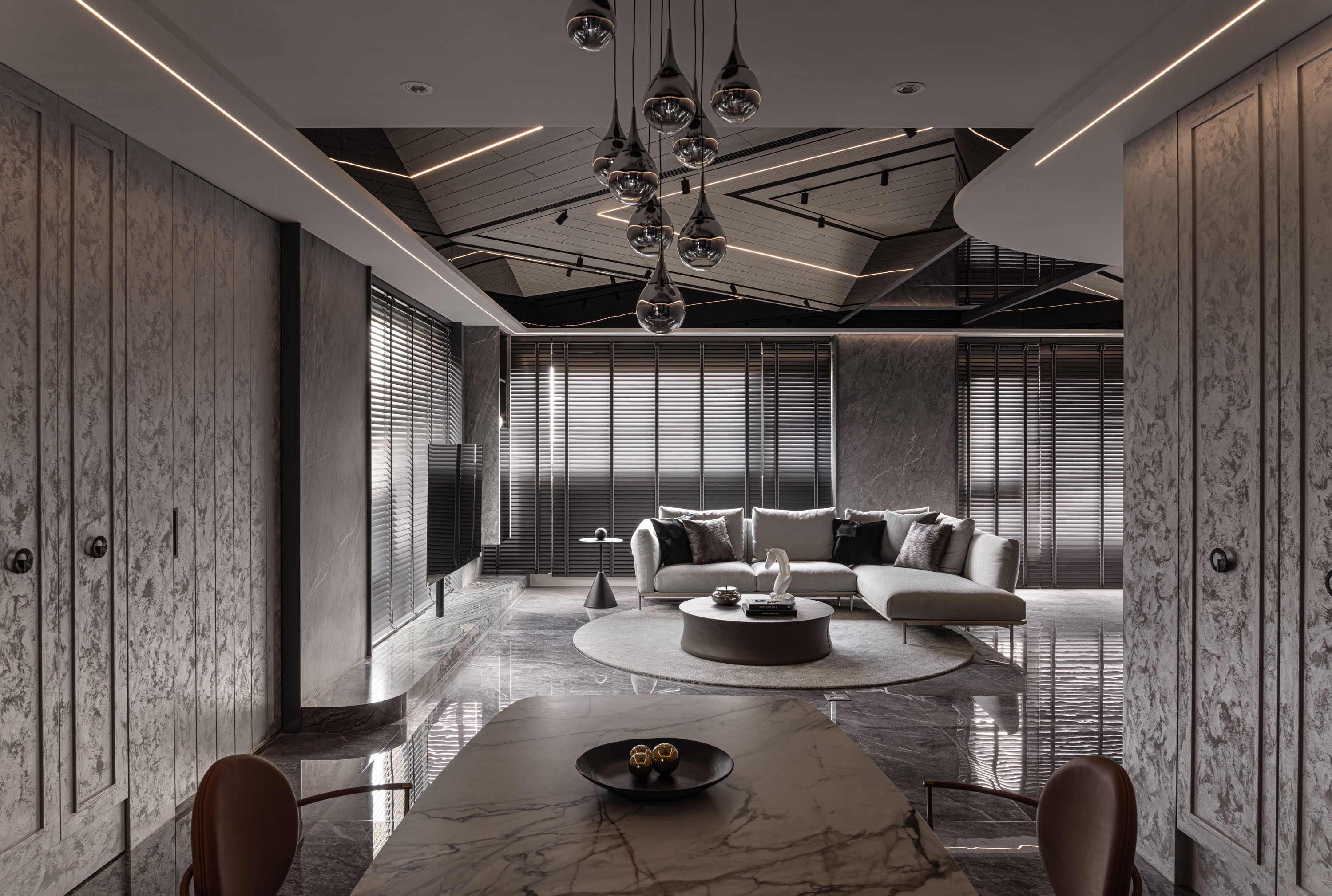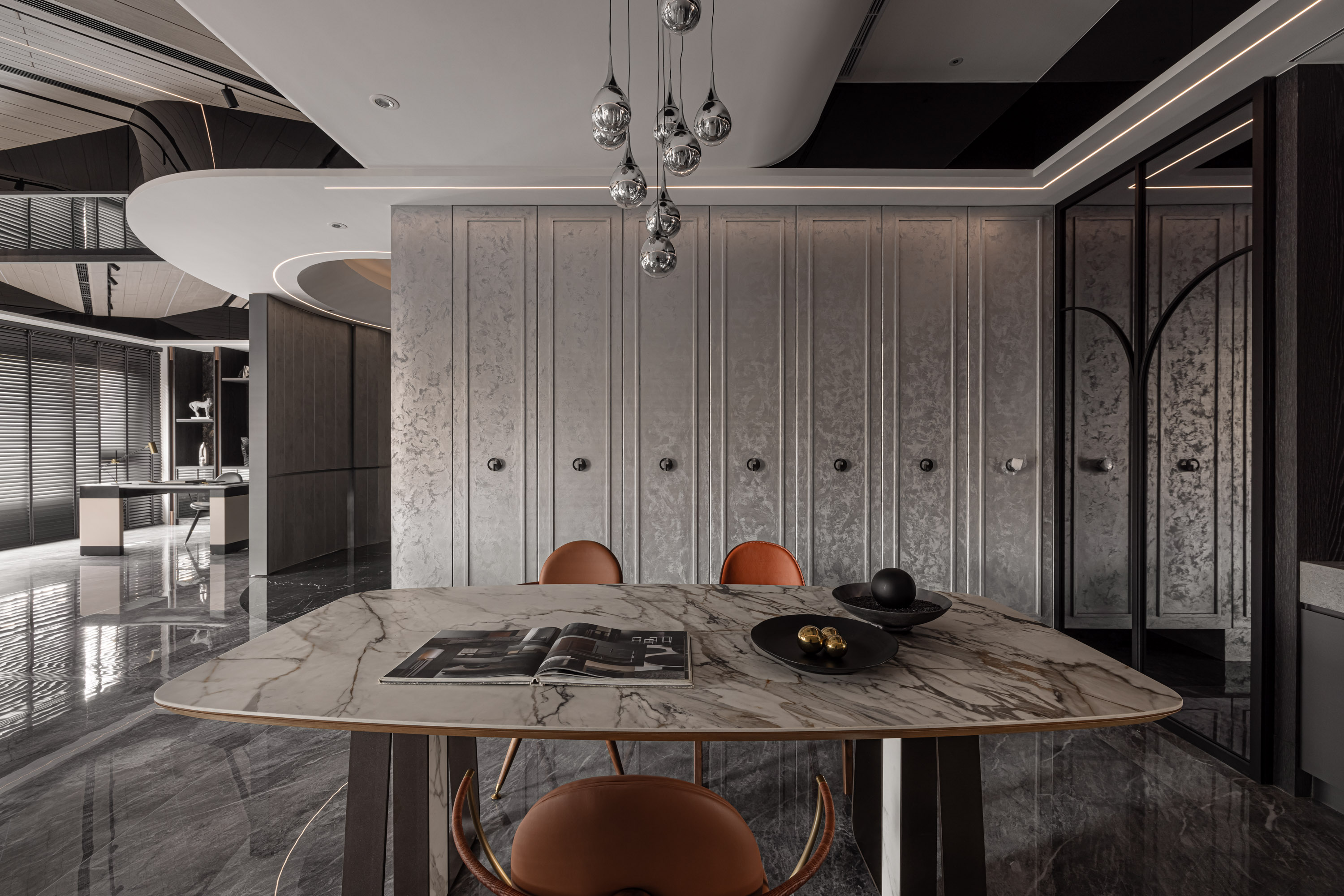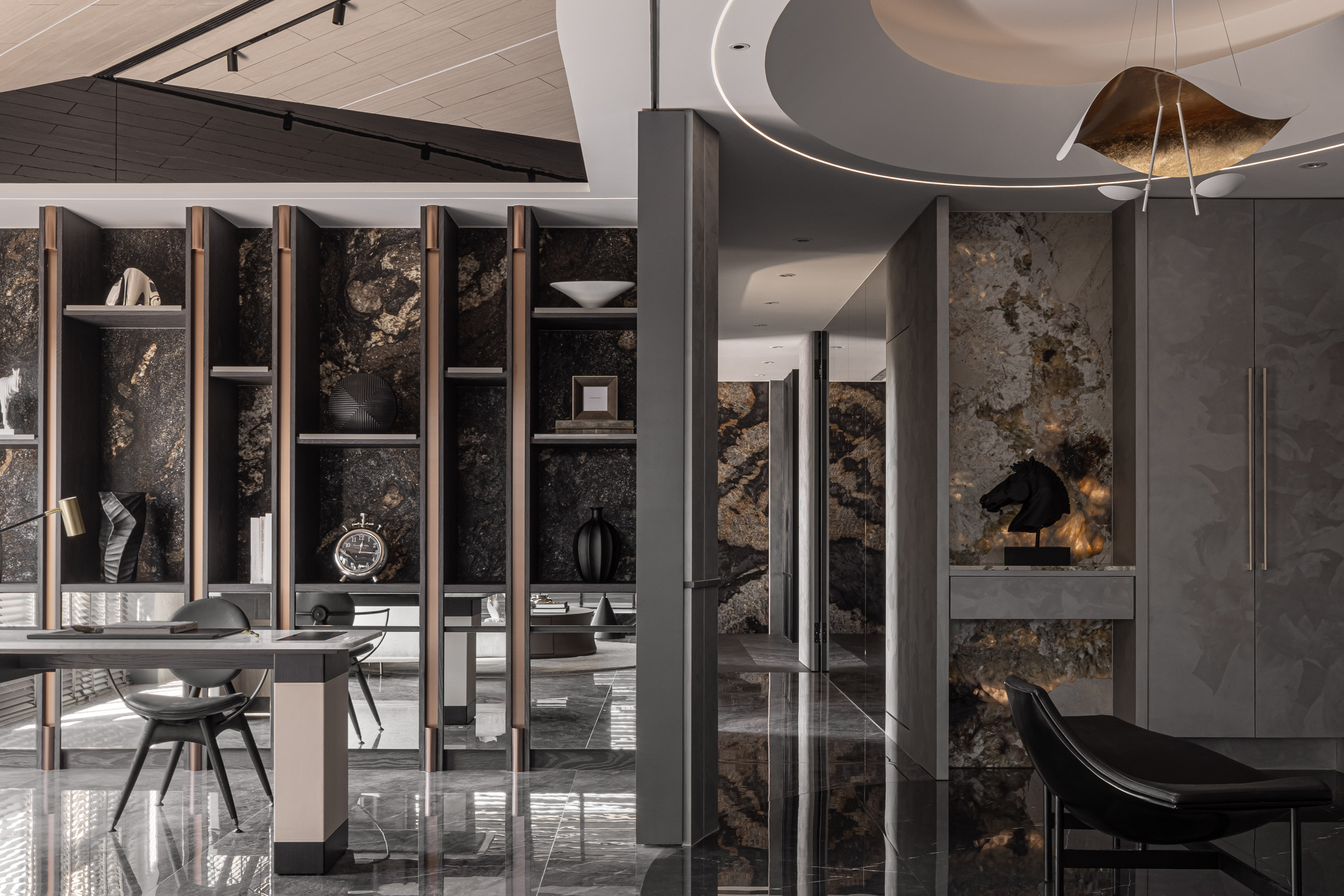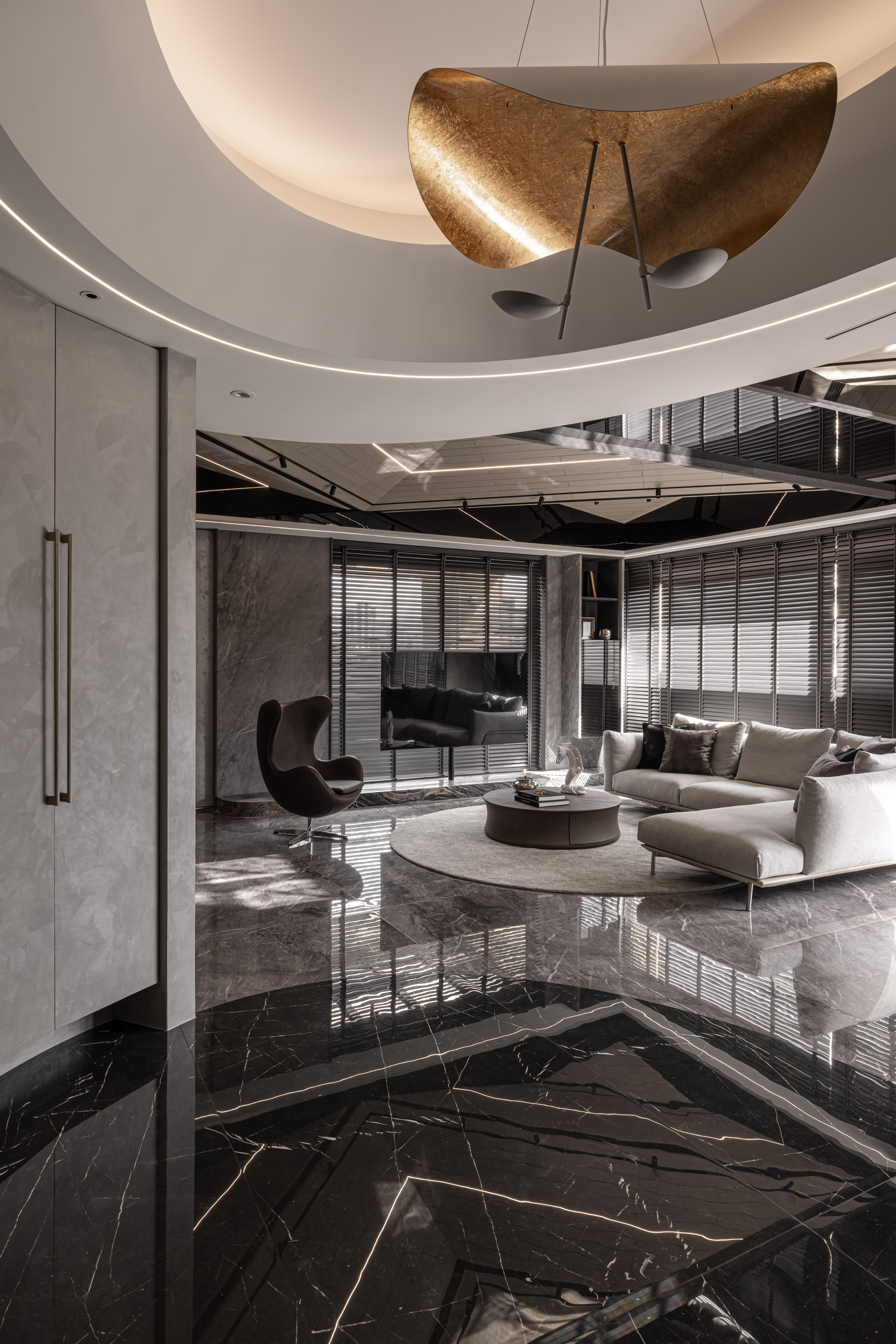 The enjoyment of life often begins after a long day of work, especially as night descends. In this quiet time, when the hustle and bustle of daily routines fade away, “home” emerges as a personal sanctuary—a city uniquely belonging to oneself. This project embodies the theme “City Among Stars,” which serves as a canvas for balancing tranquility and luxury. Through the deliberate use of deep, dark primary colors, paired with the exquisite texture of natural stone and the artistry of lacquered finishes, the design creates an atmosphere that captures the essence of modern luxury. Furthermore, this design not only exudes elegance but also emphasizes restraint, showcasing the splendor and privacy that contemporary life can offer. Ultimately, it invites one to experience a harmonious blend of artistry and comfort, transforming the ordinary into the extraordinary. As one steps into the semi-open entrance hall, the graceful curves of the cabinet compartment effortlessly draw the eye toward the corner living room. The seamless transitions in level not only soften the visual impact of the entrance hall but also invite a sense of fluidity throughout the space. Meanwhile, the oval layout beautifully complements the exquisite gold filigree lighting that adorns the ceiling, creating an atmosphere of sophistication. Moreover, the striking black translucent marble flooring adds a layer of depth and elegance. When light gracefully filters through the stone's natural texture, it sparkles brilliantly, reminiscent of a galaxy twinkling in the night sky. This enchanting illumination serves as a captivating focal point, enhancing the overall aesthetic and infusing each step taken inside with a sense of ceremony and grandeur.