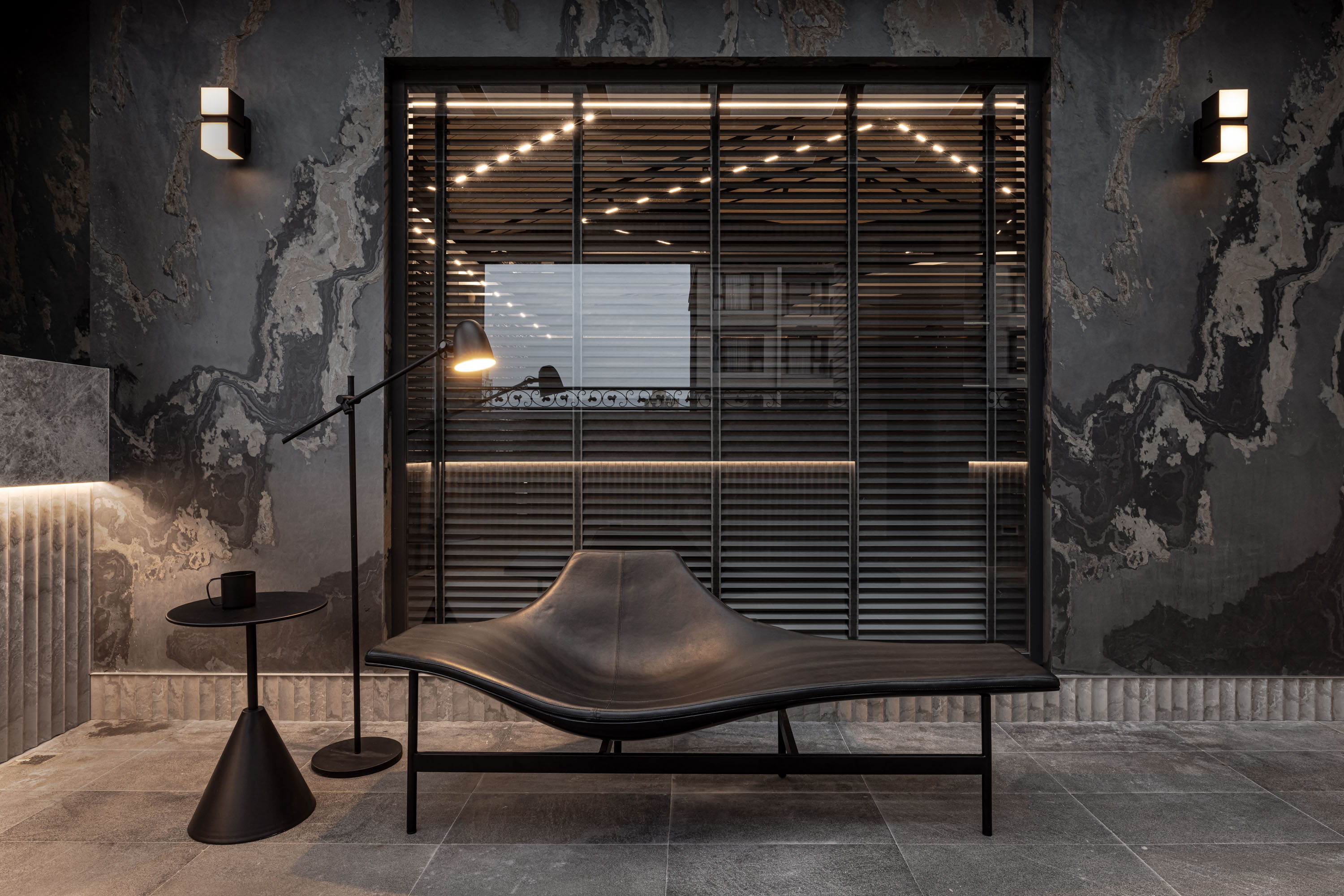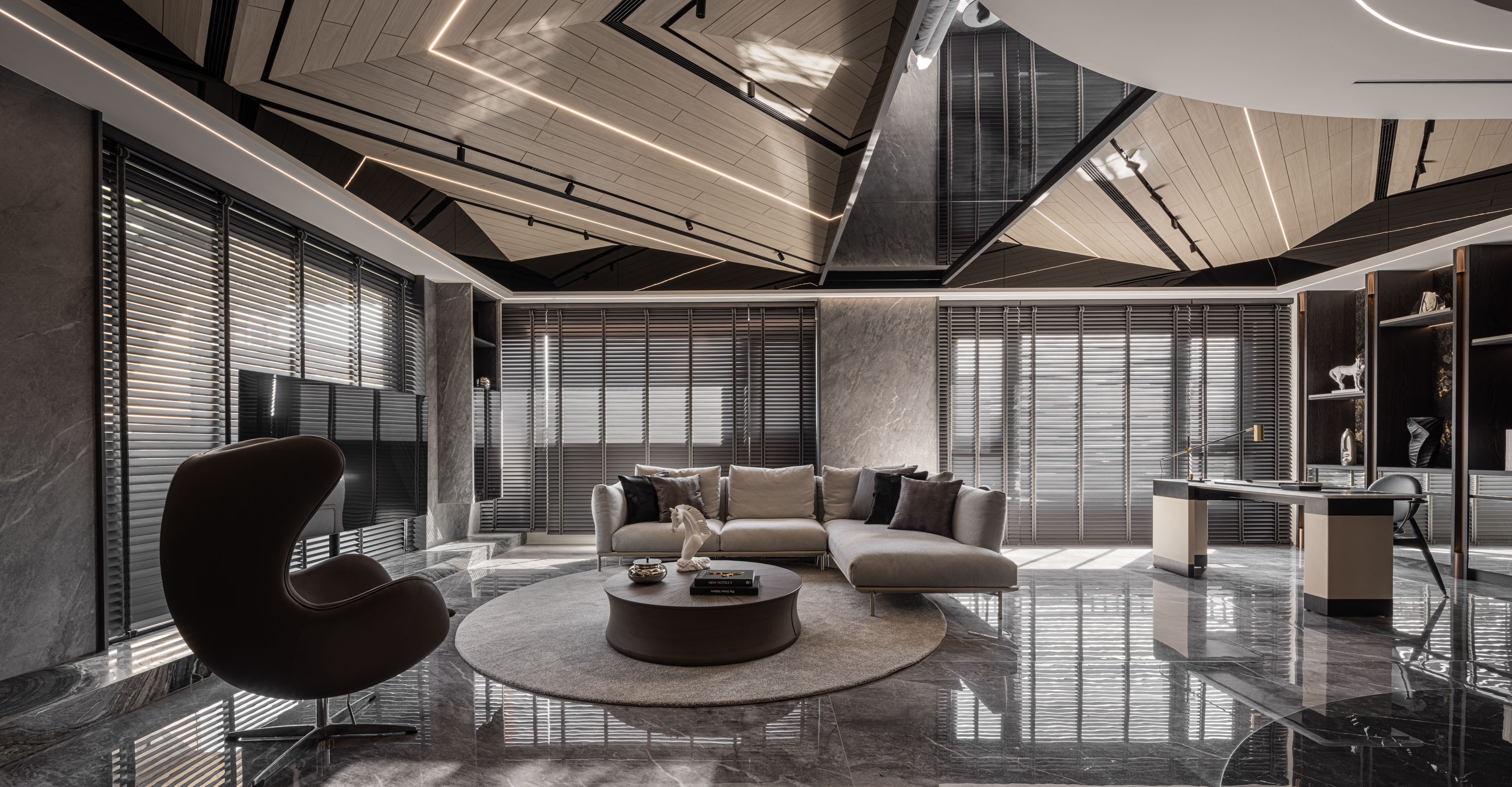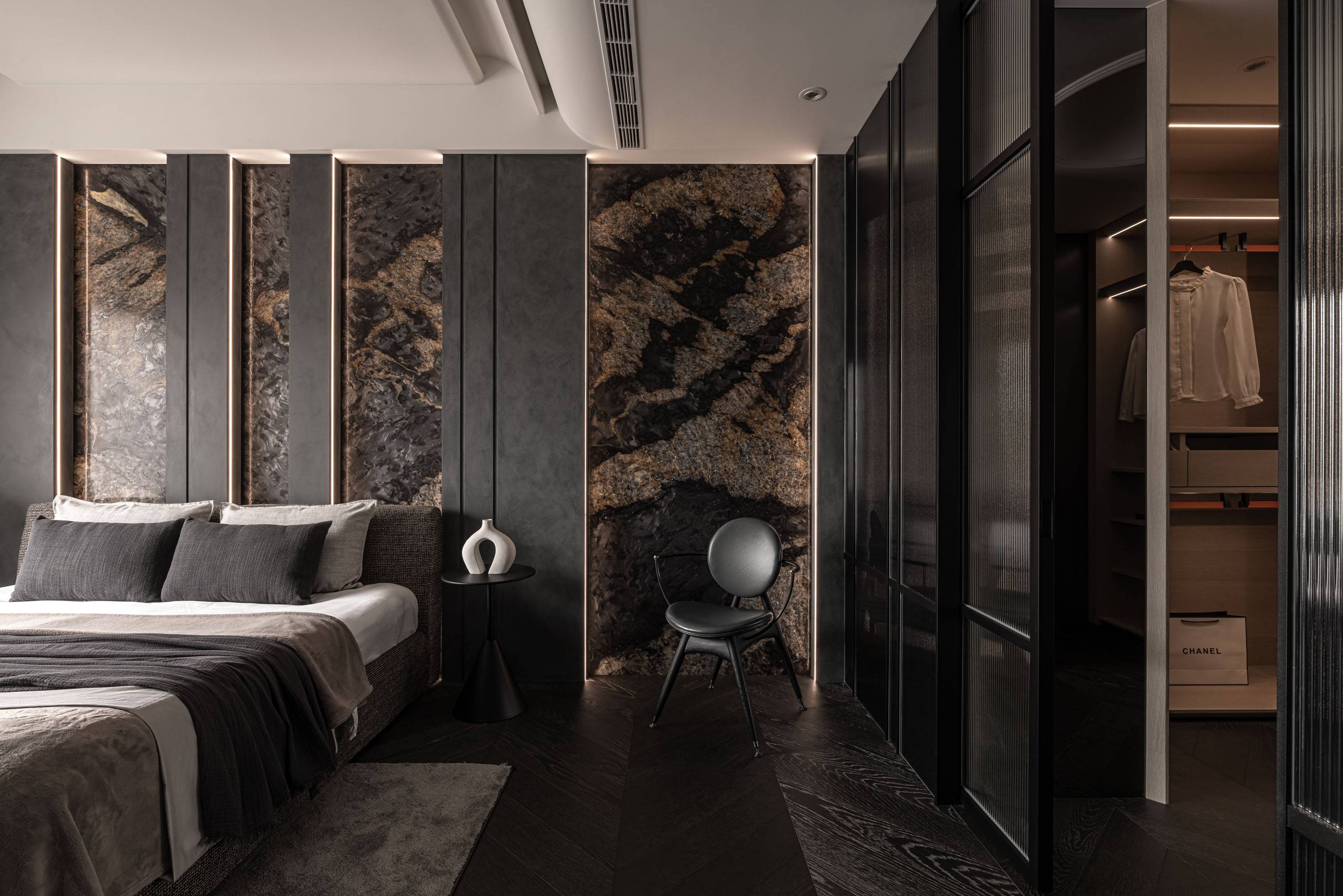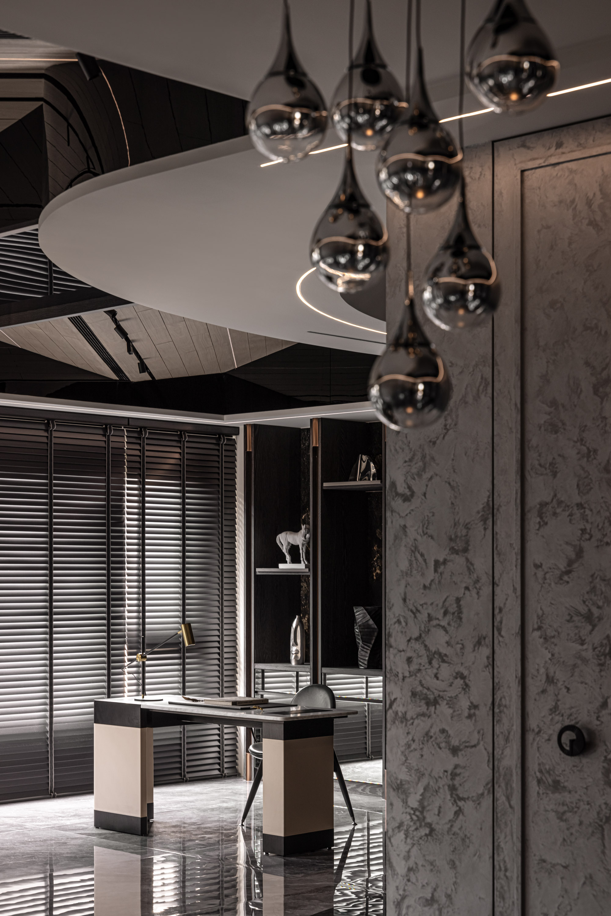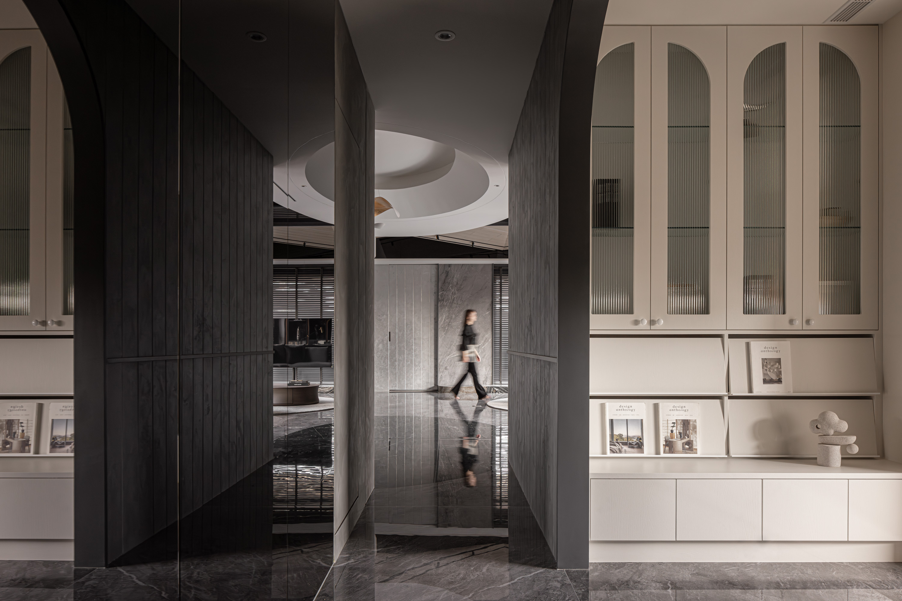 The enjoyment of life often begins after a long day of work, especially as night descends. In this quiet time, when the hustle and bustle of daily routines fade away, “home” emerges as a personal sanctuary—a city uniquely belonging to oneself. This project embodies the theme “City Among Stars,” which serves as a canvas for balancing tranquility and luxury. Through the deliberate use of deep, dark primary colors, paired with the exquisite texture of natural stone and the artistry of lacquered finishes, the design creates an atmosphere that captures the essence of modern luxury. Furthermore, this design not only exudes elegance but also emphasizes restraint, showcasing the splendor and privacy that contemporary life can offer. Ultimately, it invites one to experience a harmonious blend of artistry and comfort, transforming the ordinary into the extraordinary. As one steps into the semi-open entrance hall, the graceful curves of the cabinet compartment effortlessly draw the eye toward the corner living room. The seamless transitions in level not only soften the visual impact of the entrance hall but also invite a sense of fluidity throughout the space. Meanwhile, the oval layout beautifully complements the exquisite gold filigree lighting that adorns the ceiling, creating an atmosphere of sophistication. Moreover, the striking black translucent marble flooring adds a layer of depth and elegance. When light gracefully filters through the stone's natural texture, it sparkles brilliantly, reminiscent of a galaxy twinkling in the night sky. This enchanting illumination serves as a captivating focal point, enhancing the overall aesthetic and infusing each step taken inside with a sense of ceremony and grandeur.