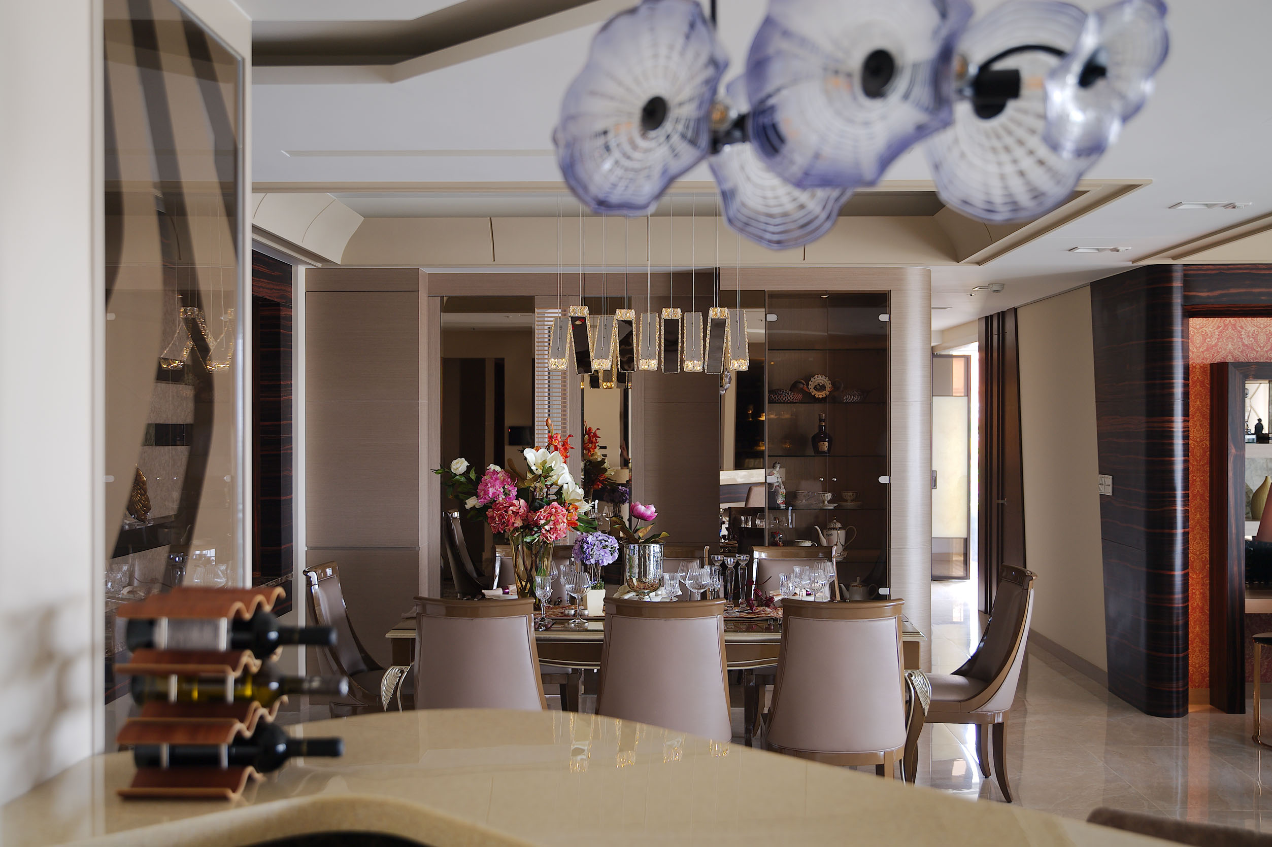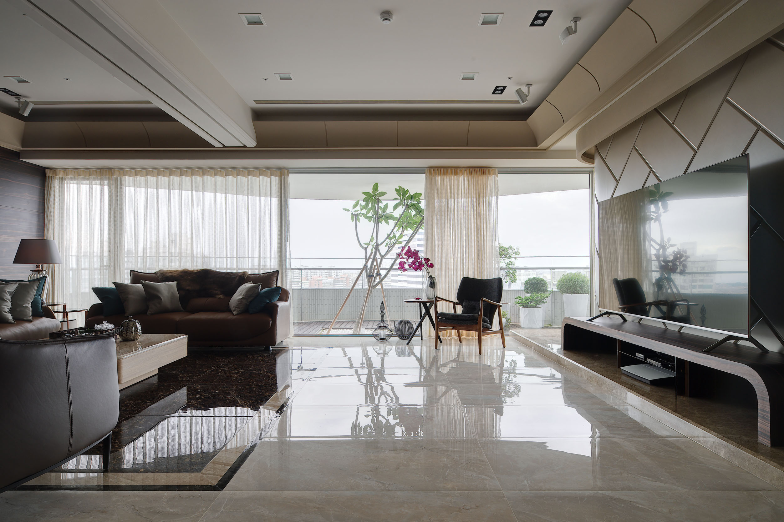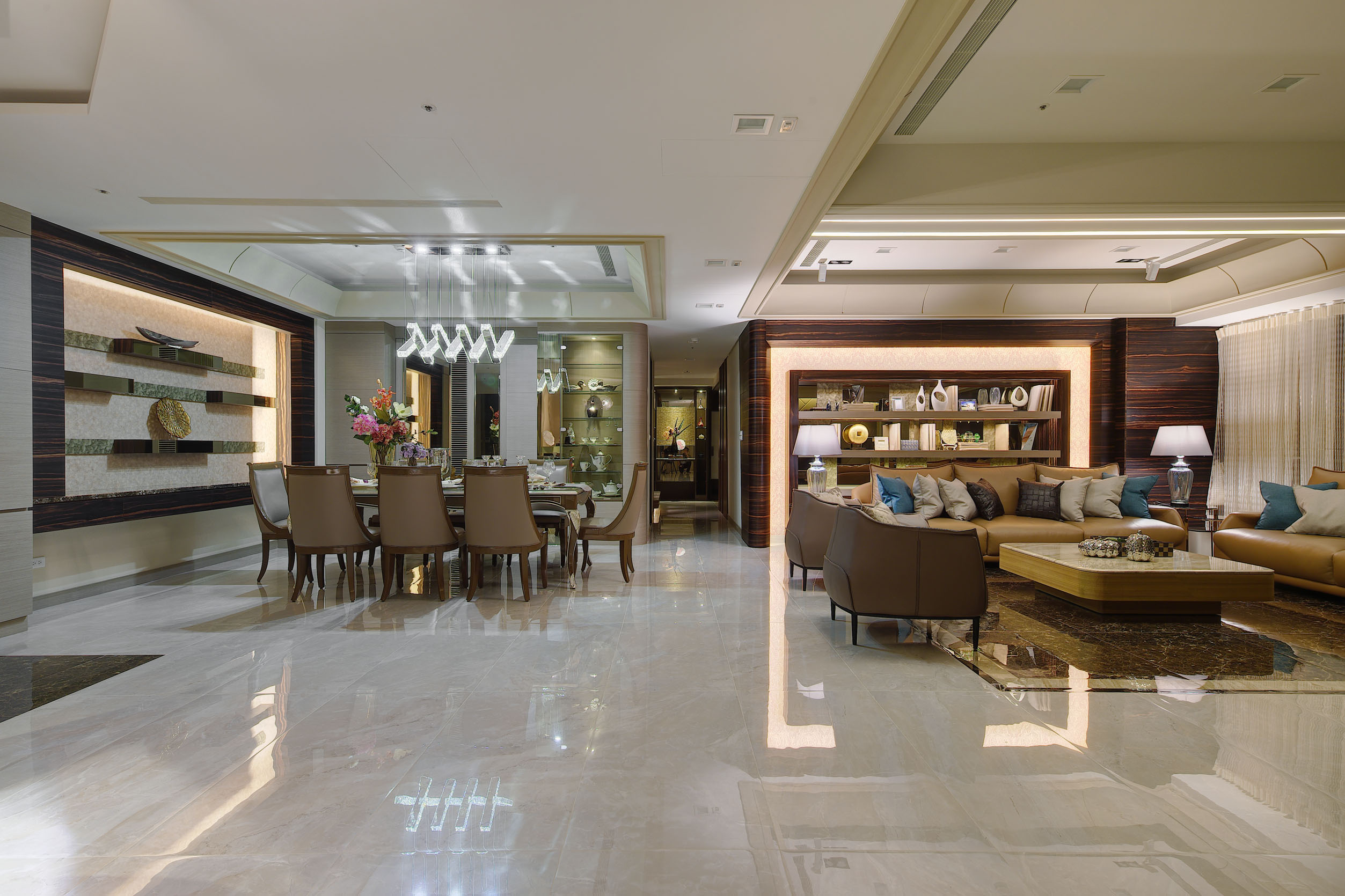 This project presents an exciting opportunity for a residential design situated on a high floor, encompassing an expansive area of 423 square meters. Initially a bare shell without any partitions, the challenge lay in thoughtfully planning the layout to define distinct functional areas while maximizing the potential of the space. Fundamentally, the vision for this residence is to harmoniously blend modern aesthetics with elements of heritage significance. As the owner looks to pass this cherished home down to the next generation, the design thoughtfully incorporates aspects of traditional stability alongside contemporary flair. Furthermore, it emphasizes the flexibility of the living space, ensuring that it can adapt to the evolving needs of each family member over time. In essence, this design not only creates an inviting and stylish environment but also honors the rich legacy that the family wishes to preserve. This careful consideration of both the present and the future ultimately makes this residence a unique and meaningful home. Upon entering the living area, one will be greeted by a thoughtfully designed hollow screen that serves to elegantly separate the space while addressing feng shui concerns related to a potential “thoroughfare.” This deliberate choice leads seamlessly into the integrated living and dining areas, which, along with the expansive balcony, together create an inviting atmosphere filled with natural light and a sense of openness. To counteract the potential emptiness often associated with large spaces, the design team has masterfully employed stone-patterned floor tiles that vary in texture and color. This strategic choice not only adds visual interest but also contributes to a cohesive design narrative. Furthermore, the inclusion of a striking book wall and a carefully placed light strip fosters a harmonious and stable visual image, enhancing the overall aesthetic.