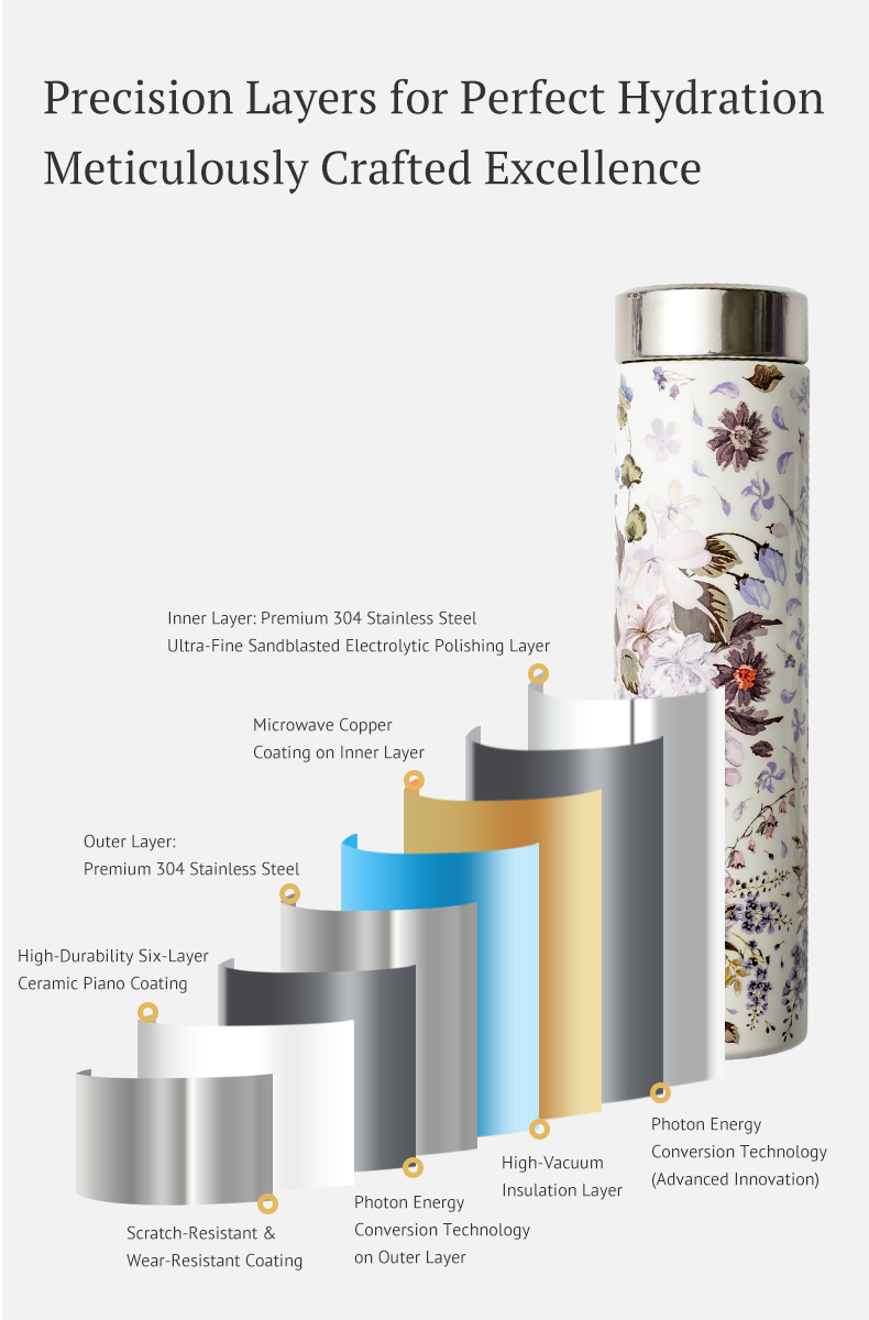 Introducing the Morgan Positive Energy Infrared Vacuum Bottle, a remarkable fusion of health, environmental stewardship, fashion, and safety. Crafted from high-quality, environmentally friendly, non-toxic food-grade 304 stainless steel, this bottle is designed to meet the demands of modern lifestyles while prioritizing wellness and sustainability. Moreover, its exterior features an ultra-high-hardness painted ceramic piano lacquer that not only enhances its aesthetic appeal but also ensures a durable finish. The thoughtfully designed heat-resistant spout and anti-scratch surface further contribute to its practicality and longevity. What truly sets this insulated water bottle apart, however, is the innovative incorporation of far-infrared energy technology. This advanced feature breaks down large molecular clusters in the water into smaller, more manageable ones. Consequently, it results in water that tastes softer and sweeter, making hydration more enjoyable. As the body absorbs this revitalized water more efficiently, its benefits extend to promoting metabolism and overall health. In summary, the Morgan Positive Energy Infrared Vacuum Bottle is not just a stylish accessory; it is a commitment to a healthier, more sustainable lifestyle. Its combination of durability, functionality, and aesthetic appeal makes it an essential choice for those who prioritize both personal health and environmental responsibility. This innovative bottle showcases an advanced processing method, skillfully combining both inner and outer layers made from high-quality materials. The inner layer features a meticulously sandblasted and electrolytically polished 304 stainless steel, enhanced with cutting-edge light wave energy conversion technology. Beneath this, there is a copper-plated microwavable layer, complemented by a high-vacuum insulation layer that ensures optimal temperature retention. As far as the outer layer is concerned, it too is crafted from durable 304 stainless steel and employs light wave energy conversion technology.