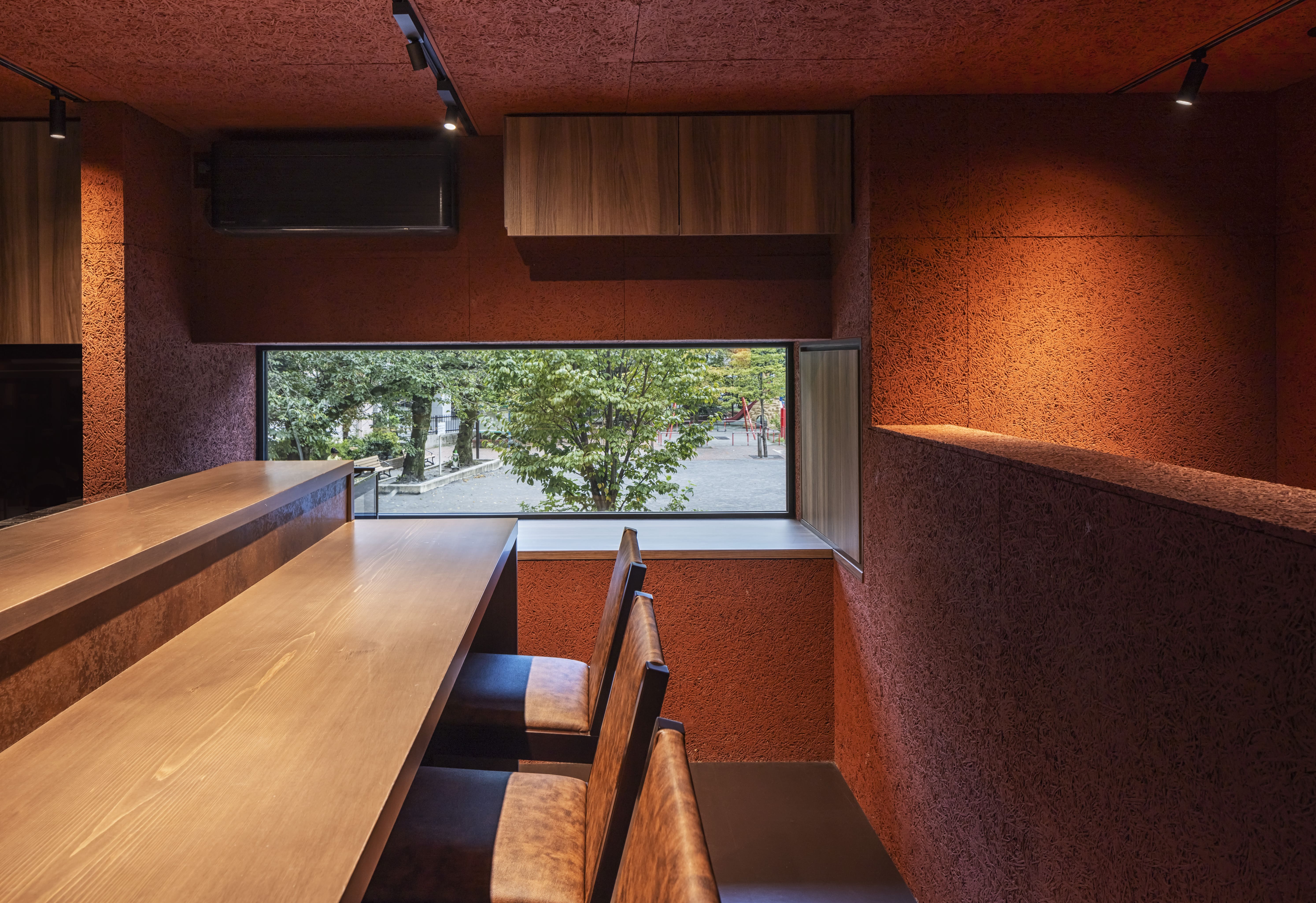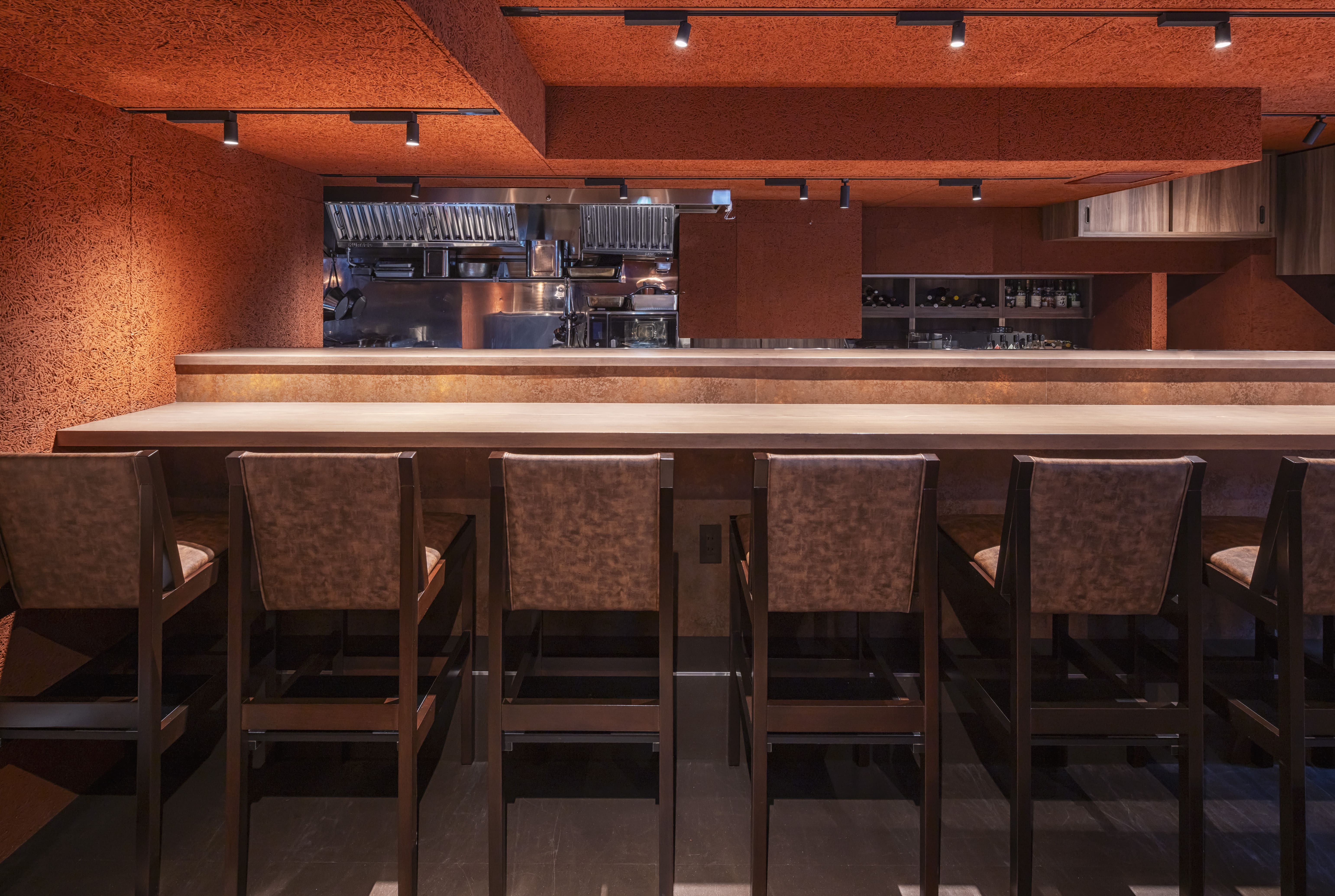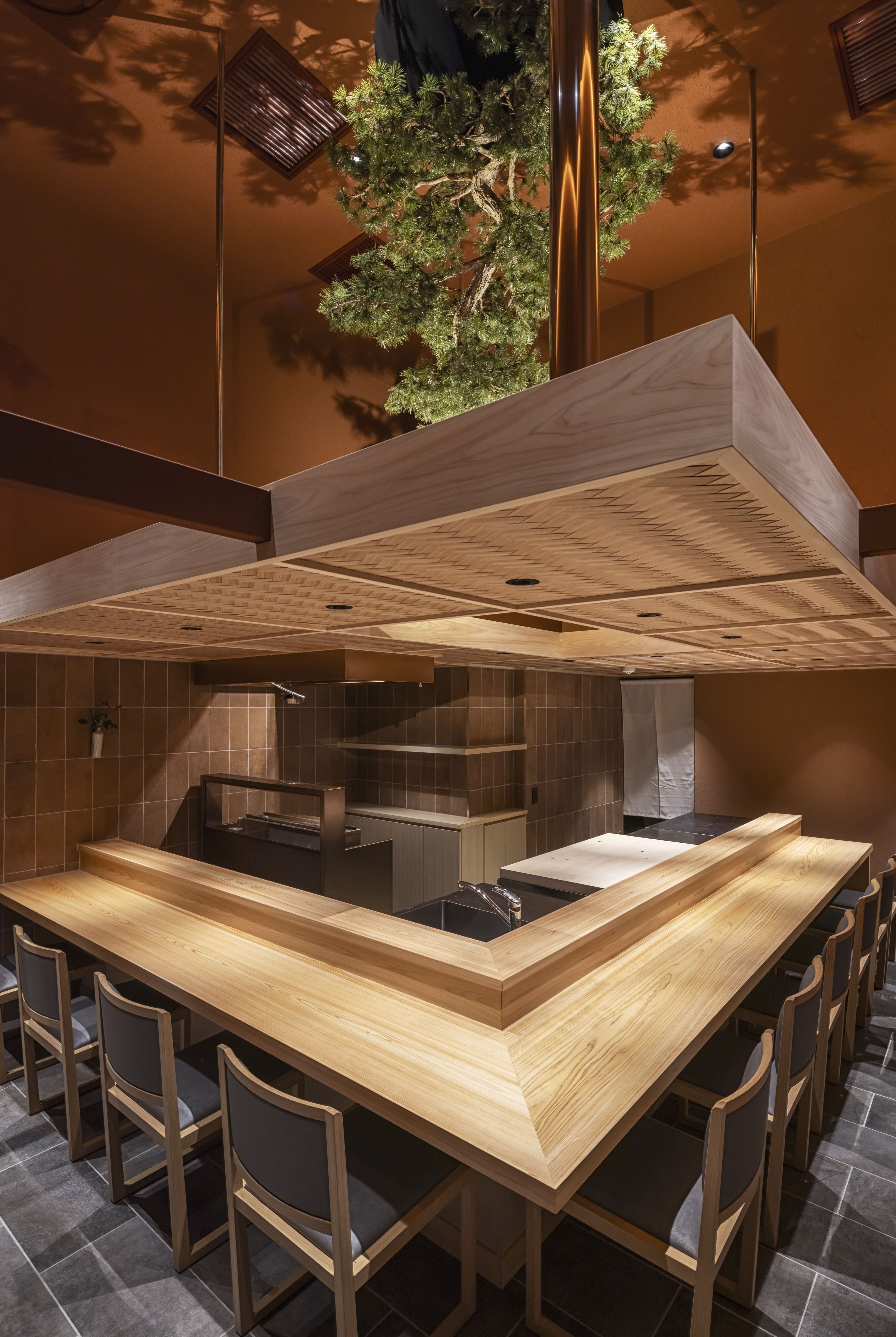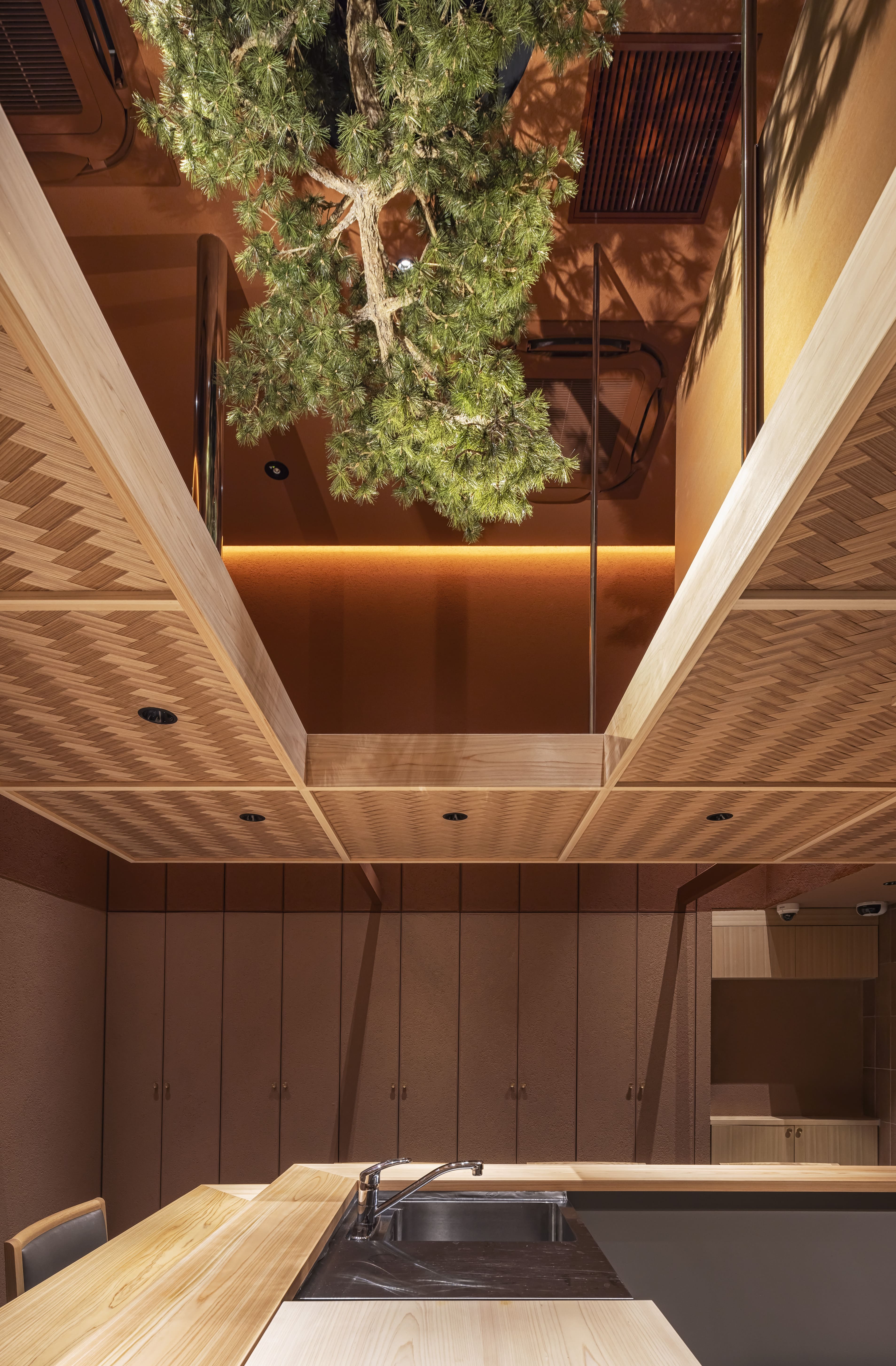 “Tree Age“ Trees grow, and so do people. This project is designed with counter seating only on both the first and second floors. The defining feature of a counter is that customers and chefs sit across from each other with ingredients between them, allowing for casual conversation. However, in most parts of the world, it is not common for chefs and customers to interact on equal terms. While bars exist where people drink together, the style of dining at a counter is unique to Japan. Behind the counter, chefs—known as itamae—prepare dishes. This space is reserved for highly trained professionals who have undergone years of rigorous training in areas such as dishwashing, plating, grilling, cutting, and simmering. The reason this tradition has flourished in Japan is that society has long held deep respect for these dedicated chefs and their craft. As designers, we began to wonder: Could standing behind the counter symbolize both years of training and the depth of human experience, much like the growth of a tree? With this in mind, we designed the ceiling above the counter area to feature cascading pine trees. The walls and ceiling are painted in an earthy red tone, creating a color scheme that evokes the blessings of the earth throughout the space. Through this setting, we hope people can experience the beautiful relationship between food and people.