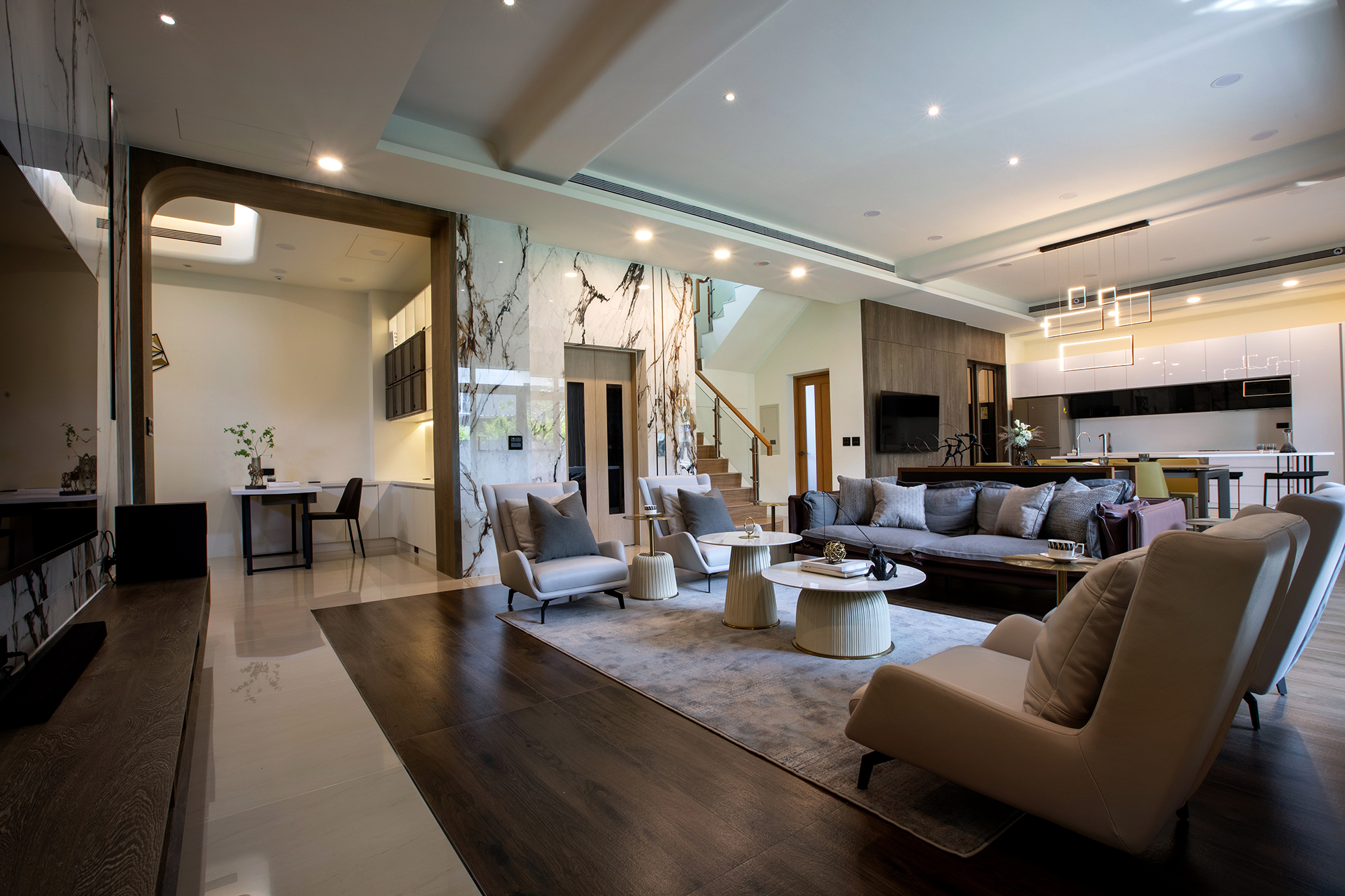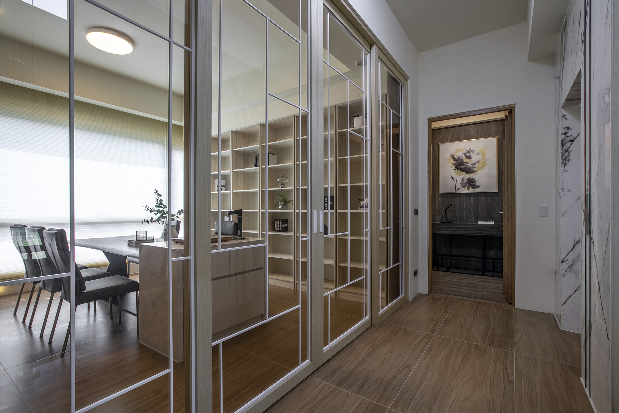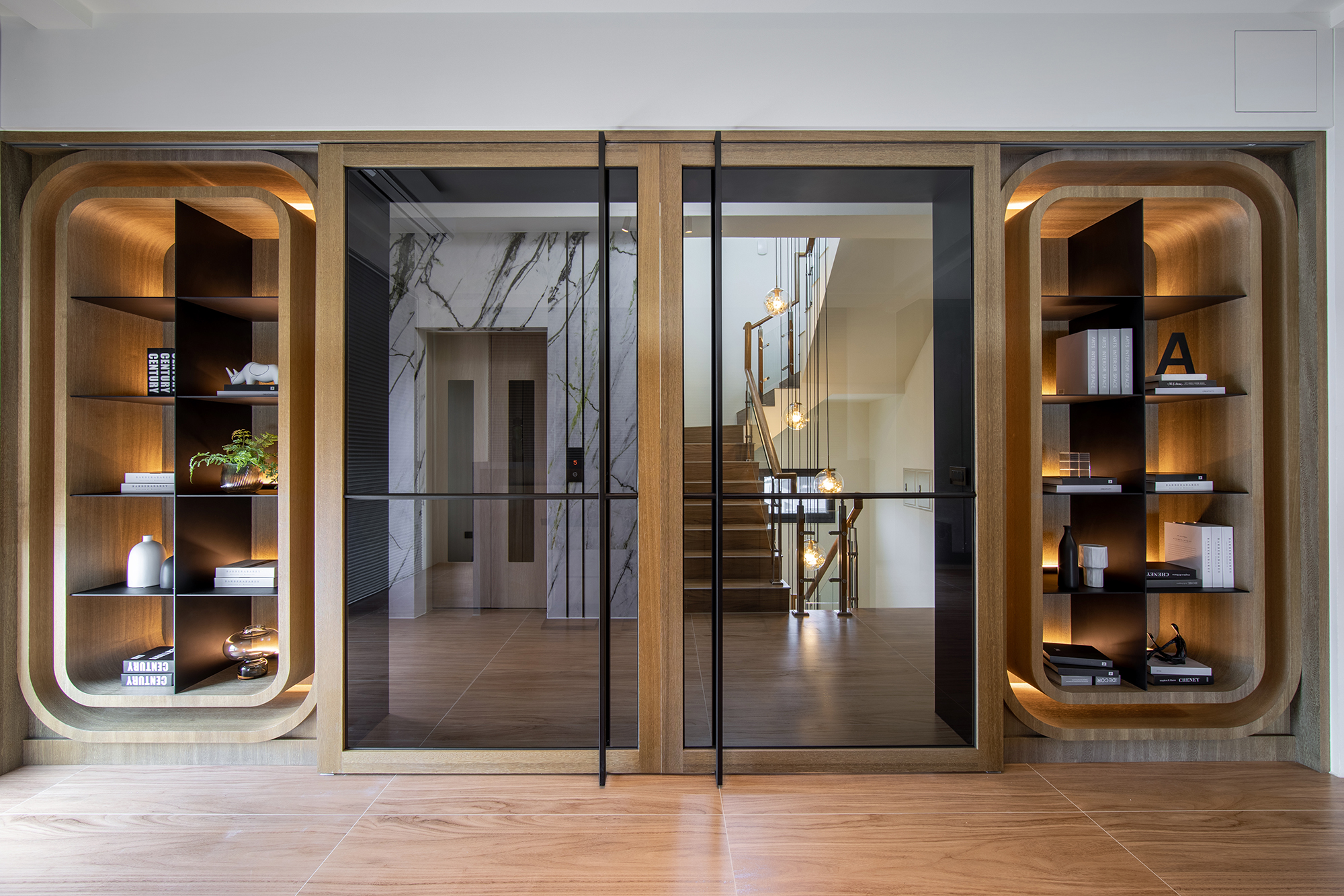 This residential house planning project is designed to create a harmonious and inviting living space tailored to the unique preferences and lifestyles of each family member. The team meticulously arranged the layout to optimize functionality while ensuring a seamless flow throughout the home. To enhance the overall aesthetic and comfort, carefully selected furniture was incorporated, fostering an environment that promotes relaxation and practicality. Notably, the inclusion of stylish storage and display cabinets not only maximizes organization but also contributes to the home's aesthetic appeal by maintaining a clean and tidy atmosphere. Furthermore, the strategic installation of elevators on every floor signifies a commitment to accessibility and convenience, providing homeowners with an exceptional barrier-free living experience. Ultimately, this project transforms the house into a comfortable sanctuary, balancing form and function while elevating the everyday lives of its residents. Upon entering the inviting public area on the first floor, one is immediately struck by the harmonious integration of the living room and dining room, which are expertly designed in an open floor plan. This thoughtfully executed layout not only bathes the space in natural light, but it also facilitates smoother circulation throughout the area. Moreover, it reinforces the connection between different functional zones, thereby fostering increased interaction and deeper emotional bonds among family members. The living room, distinguished by its elegant wooden flooring, effectively delineates the area while simultaneously alleviating safety concerns associated with height variations in the flooring design. Furthermore, the kitchen is cleverly enclosed by sleek glass sliding doors, serving to isolate cooking fumes and maintain a fresh ambiance within the home.