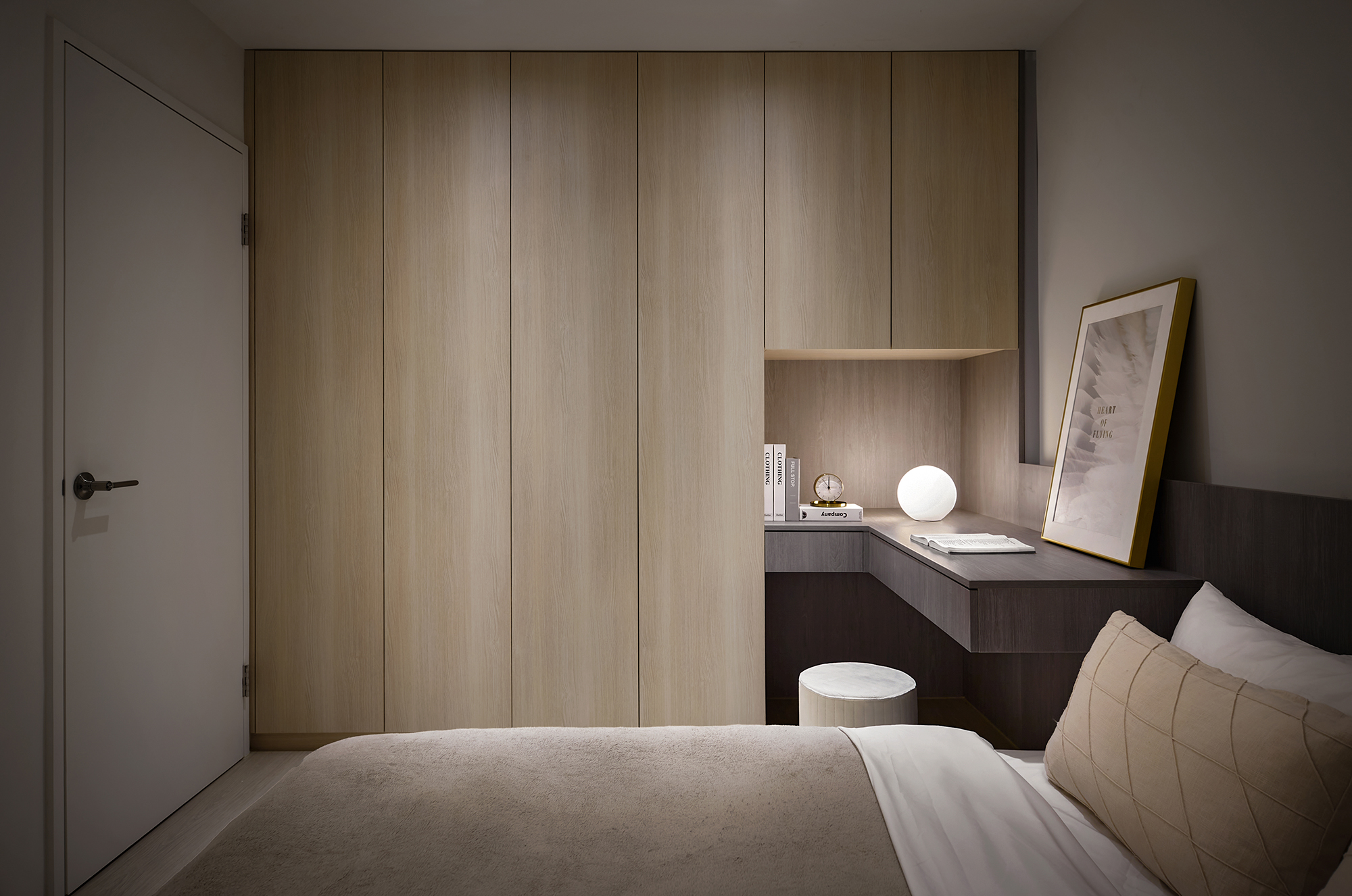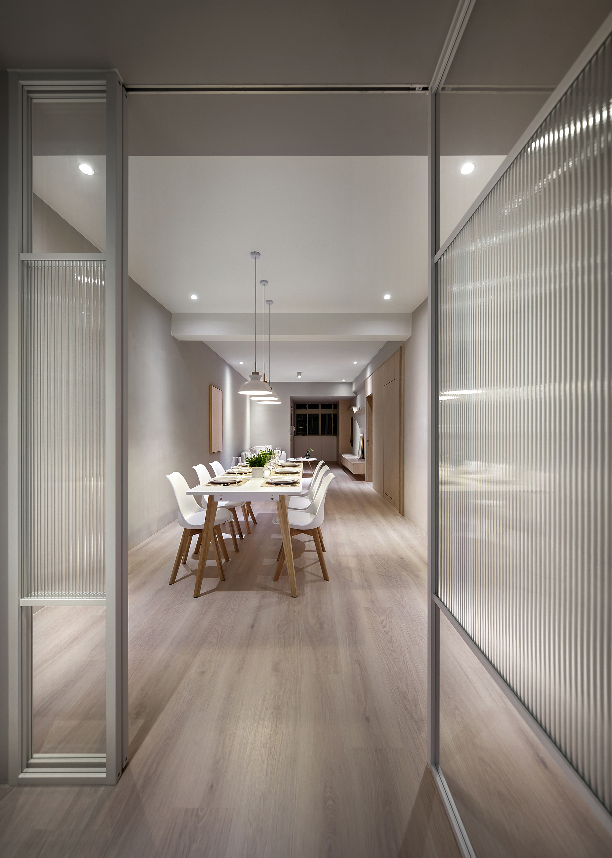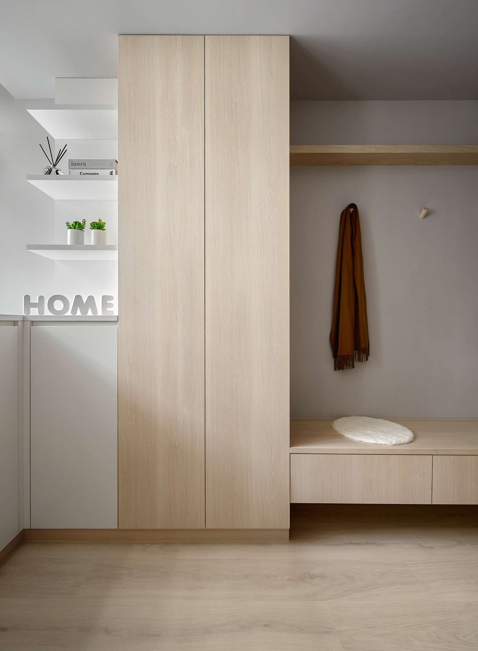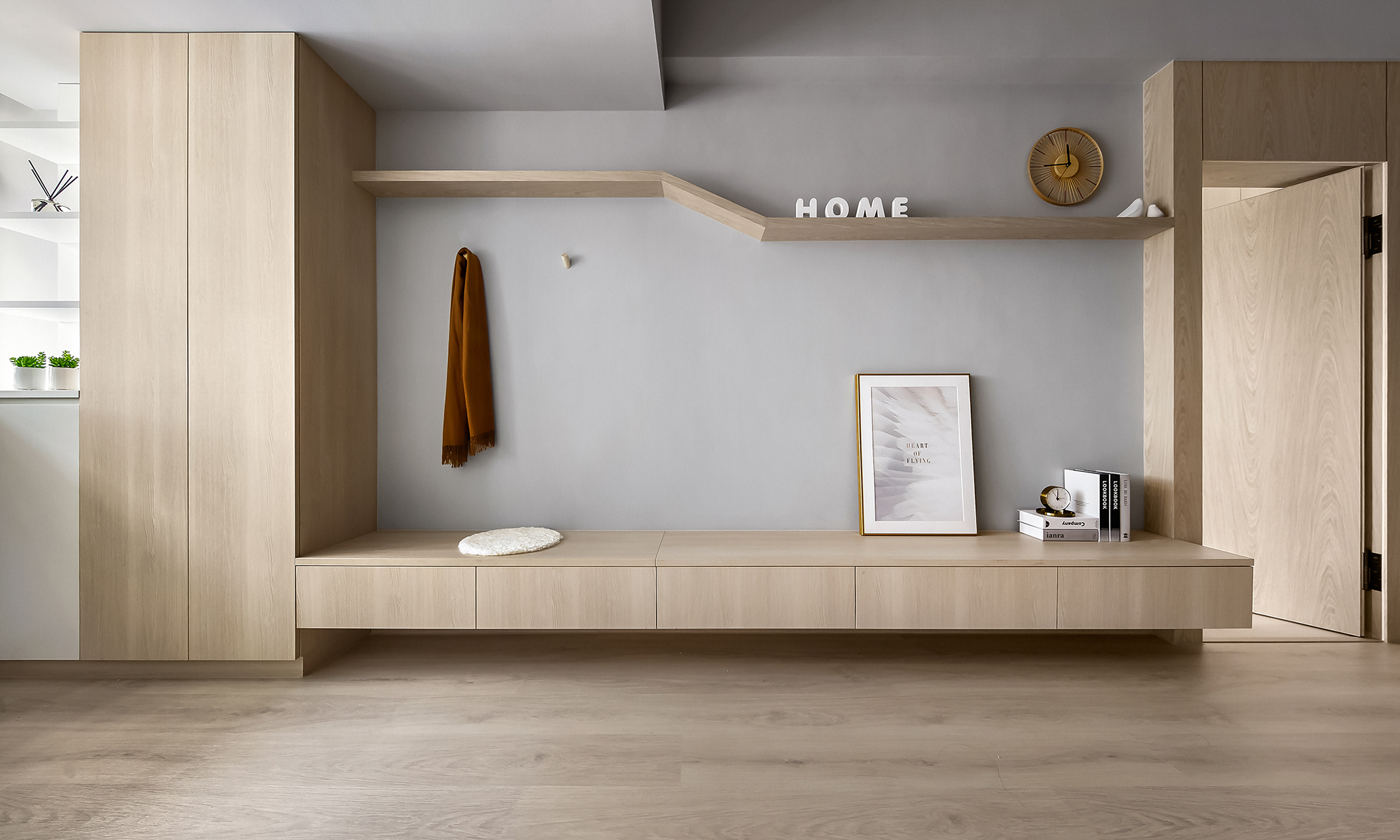 This design project centers around creating an inviting and functional living space for a family of three, comprising a couple and their young son. To begin with, the design is thoughtfully crafted with the family's unique preferences in mind. The color palette primarily features a warm log tone, which the mother adores, while skillfully incorporating a sophisticated gray shade that appeals to the father. Complementing these elements, we have chosen elegant beige furniture, which seamlessly balances the overall aesthetic of the space. Furthermore, the design emphasizes the importance of open areas, recognizing the children’s need for room to play and explore. By strategically integrating blank spaces, we not only provide a safe environment for their activities but also ensure there is ample opportunity for future furniture additions. This intentional flexibility enhances the overall functionality of the space. In conclusion, through this carefully curated design, the homeowners are poised to enjoy a living experience that is not only comfortable and relaxing but also exudes a high-quality, modern charm. Upon stepping into the room, one will be immediately captivated by how cleverly the team has utilized the uniquely shaped space, transforming it into a well-thought-out drop zone. This creative solution allows for a smooth transition into the home, giving individuals a welcoming buffer area. In the public area, the team has embraced an inviting open design, seamlessly merging the living room and dining room to create a sense of spaciousness and brightness. Notably, they have taken advantage of the generous ceiling height and the striking exposed beams to artfully delineate these interconnected spaces.