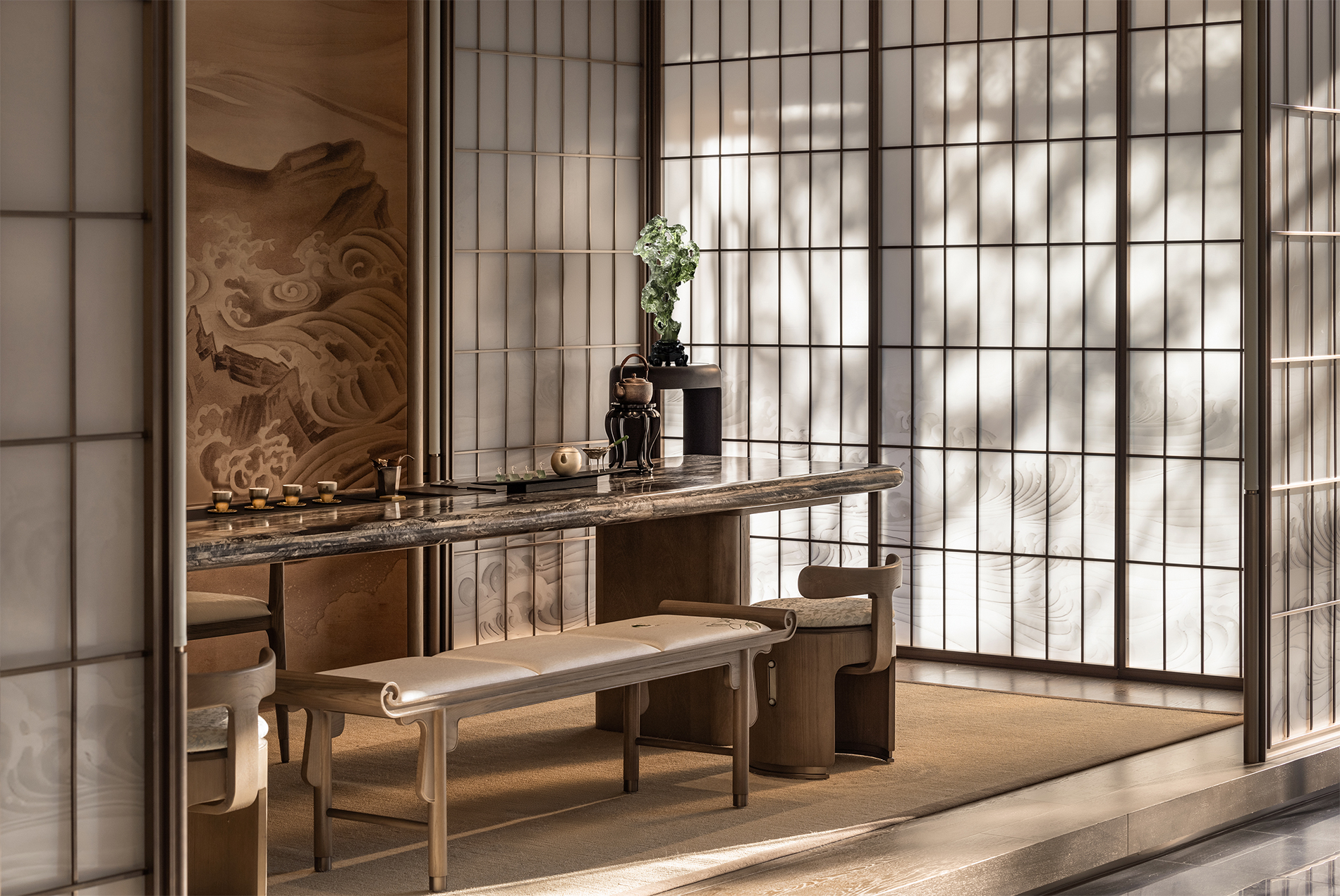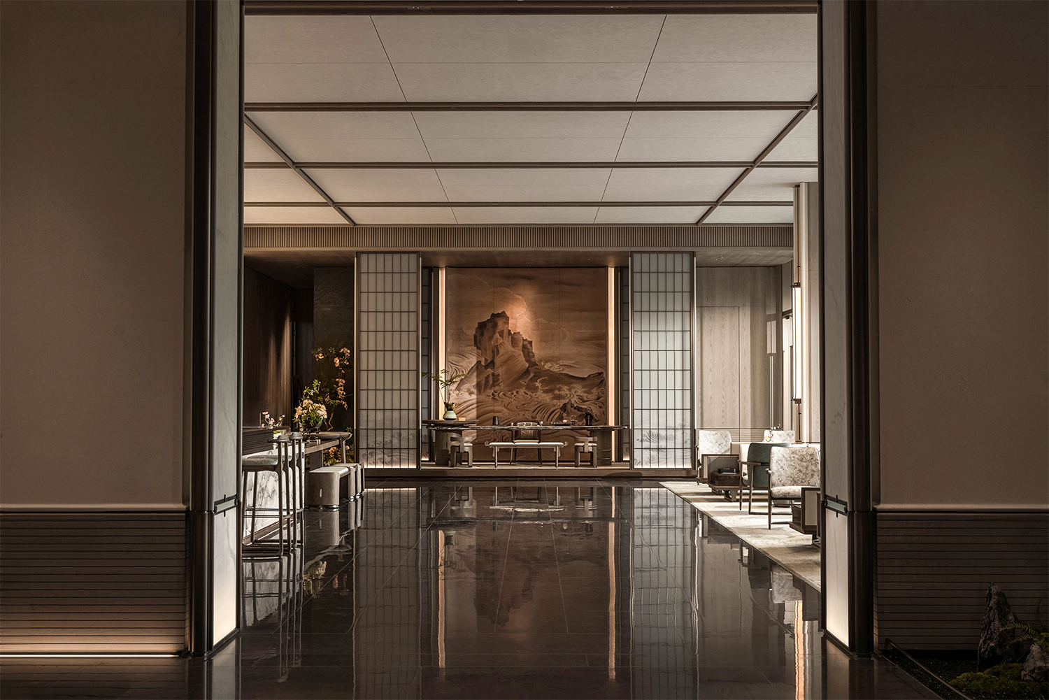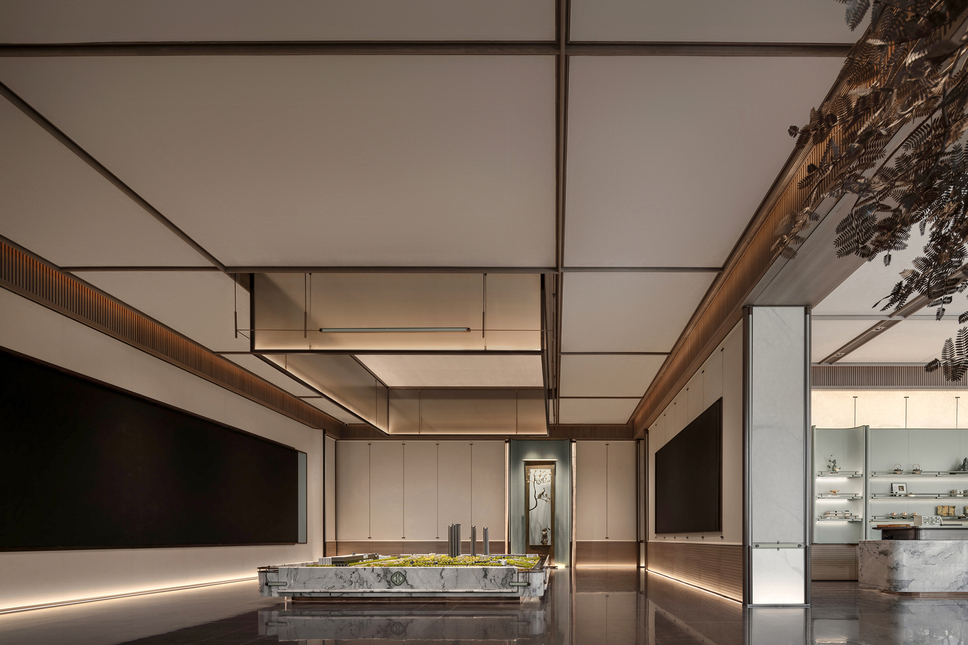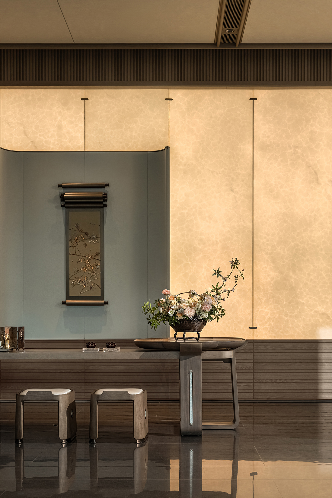 The project employs the Chinese garden design philosophy of "a scene with every step" to craft an immersive homecoming experience. From welcoming spaces and viewing areas to social zones and leisure quarters, each meticulously designed space coalesces to create an elegant and harmonious living environment. Inspired by the renowned Song Dynasty painting The Panorama of Rivers and Mountains, the lobby's backdrop utilizes enamel-painted glass craftsmanship to reinterpret the artwork's majestic landscapes. As natural light filters through the glass, shifting shadows trace mountain silhouettes like brushstrokes on parchment, imbuing the space with dynamic artistic vitality. Reimagining the ancient Chinese "dragon-scale binding" bookbinding technique, the ceiling transforms this heritage motif into three-dimensional decor. The undulating metallic panels retain classical elegance while introducing an ethereal, dreamlike quality through layered refraction effects. Drawing from the literati tradition of tea gatherings around stove-heated kettles, the bar's feature wall adopts a soft celadon hue. Textured ceramic tiles emulate weathered scholar's rocks, evoking a serene ambiance reminiscent of dawn's first light—an urban oasis harmonizing cultural refinement with tranquil modernity.