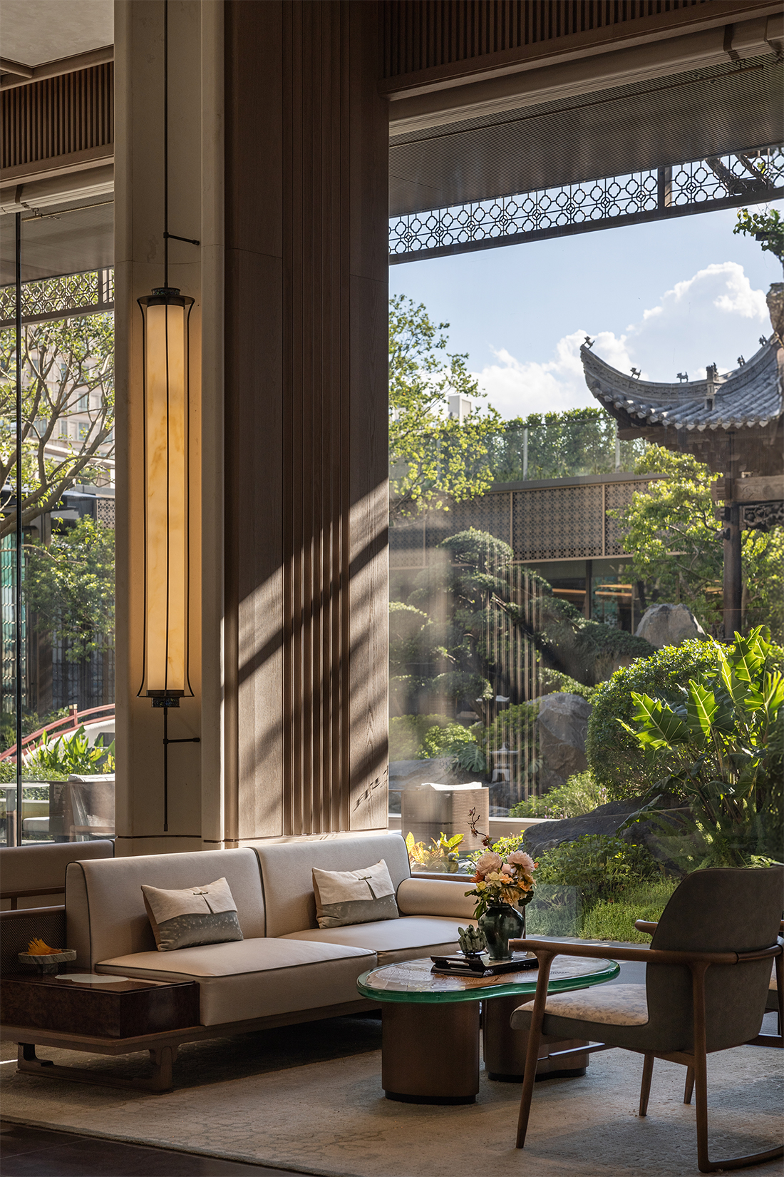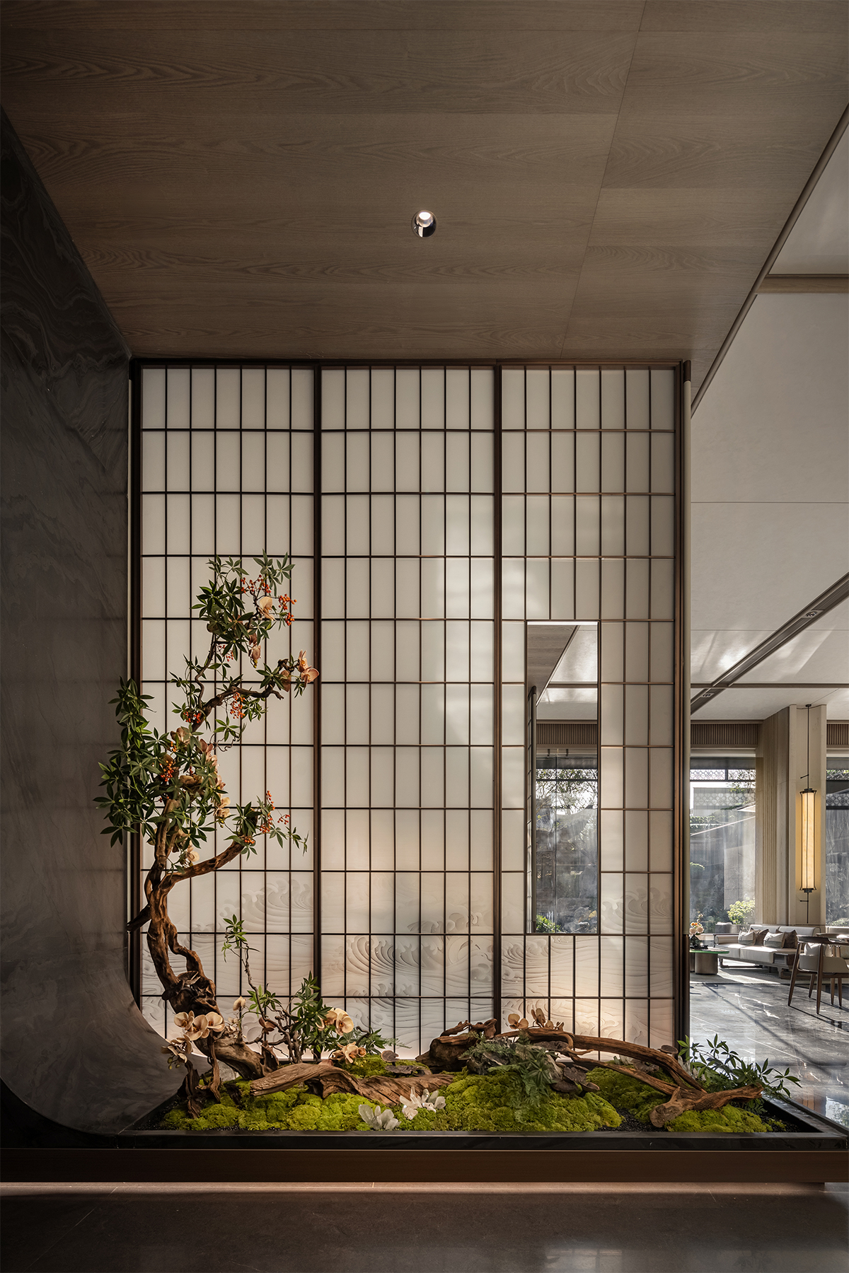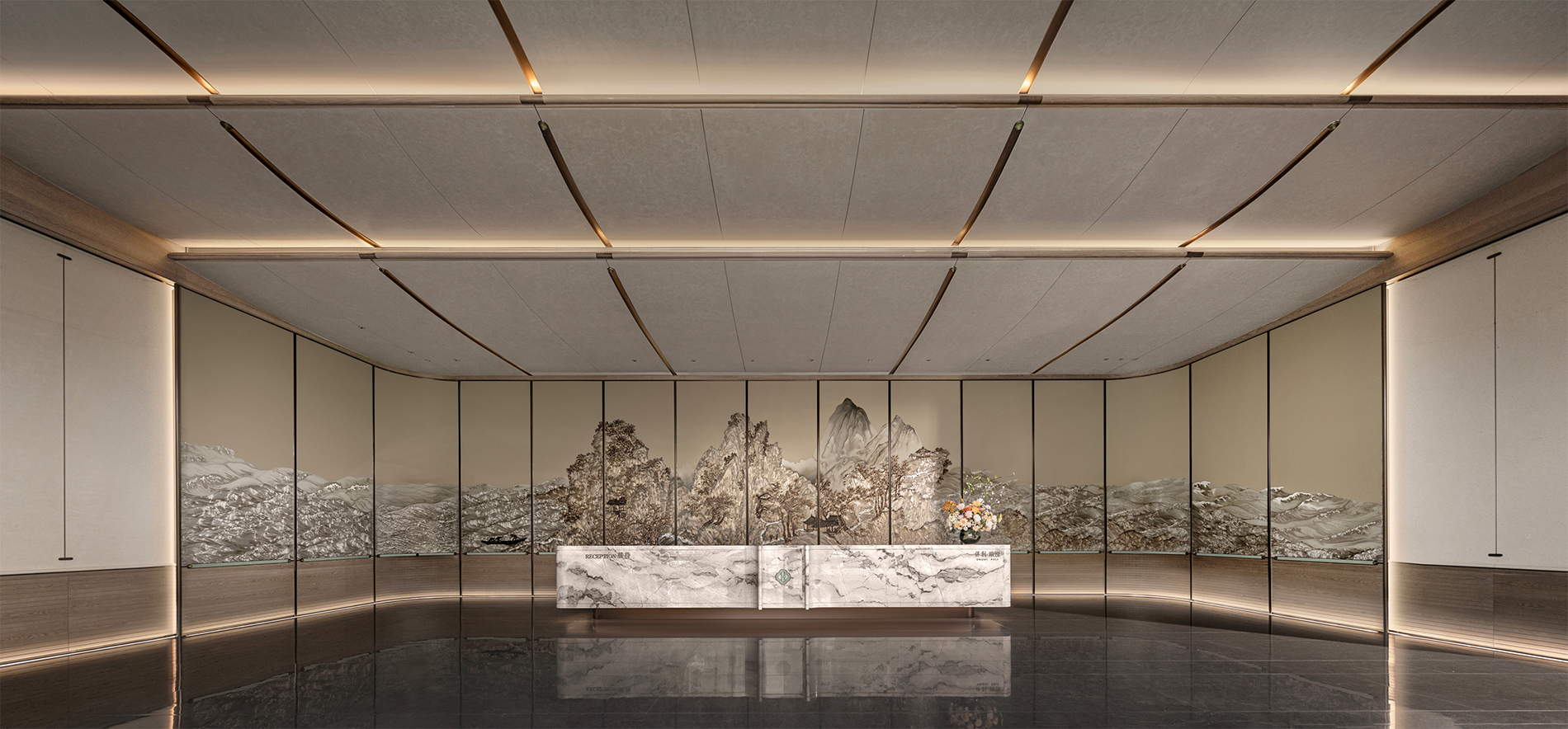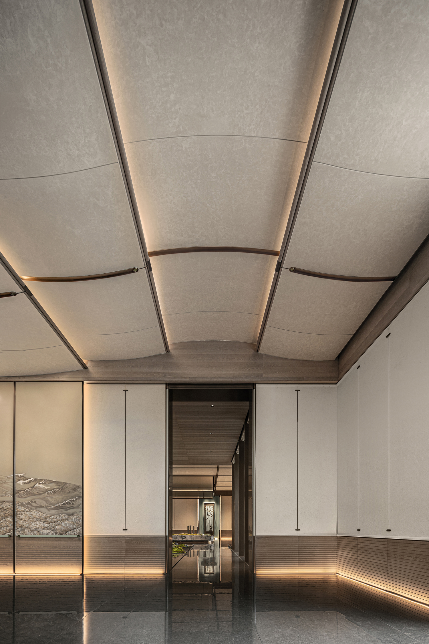 The project employs the Chinese garden design philosophy of "a scene with every step" to craft an immersive homecoming experience. From welcoming spaces and viewing areas to social zones and leisure quarters, each meticulously designed space coalesces to create an elegant and harmonious living environment. Inspired by the renowned Song Dynasty painting The Panorama of Rivers and Mountains, the lobby's backdrop utilizes enamel-painted glass craftsmanship to reinterpret the artwork's majestic landscapes. As natural light filters through the glass, shifting shadows trace mountain silhouettes like brushstrokes on parchment, imbuing the space with dynamic artistic vitality. Reimagining the ancient Chinese "dragon-scale binding" bookbinding technique, the ceiling transforms this heritage motif into three-dimensional decor. The undulating metallic panels retain classical elegance while introducing an ethereal, dreamlike quality through layered refraction effects. Drawing from the literati tradition of tea gatherings around stove-heated kettles, the bar's feature wall adopts a soft celadon hue. Textured ceramic tiles emulate weathered scholar's rocks, evoking a serene ambiance reminiscent of dawn's first light—an urban oasis harmonizing cultural refinement with tranquil modernity.