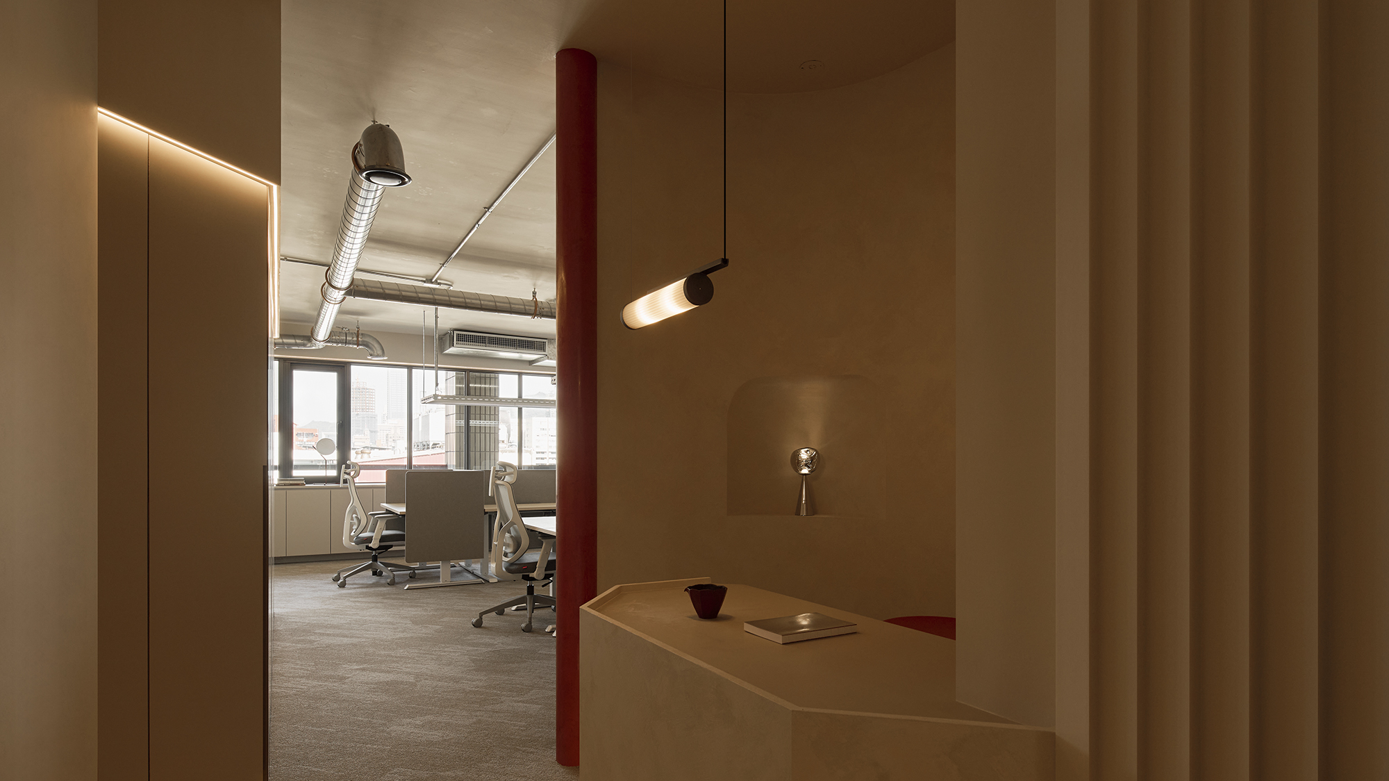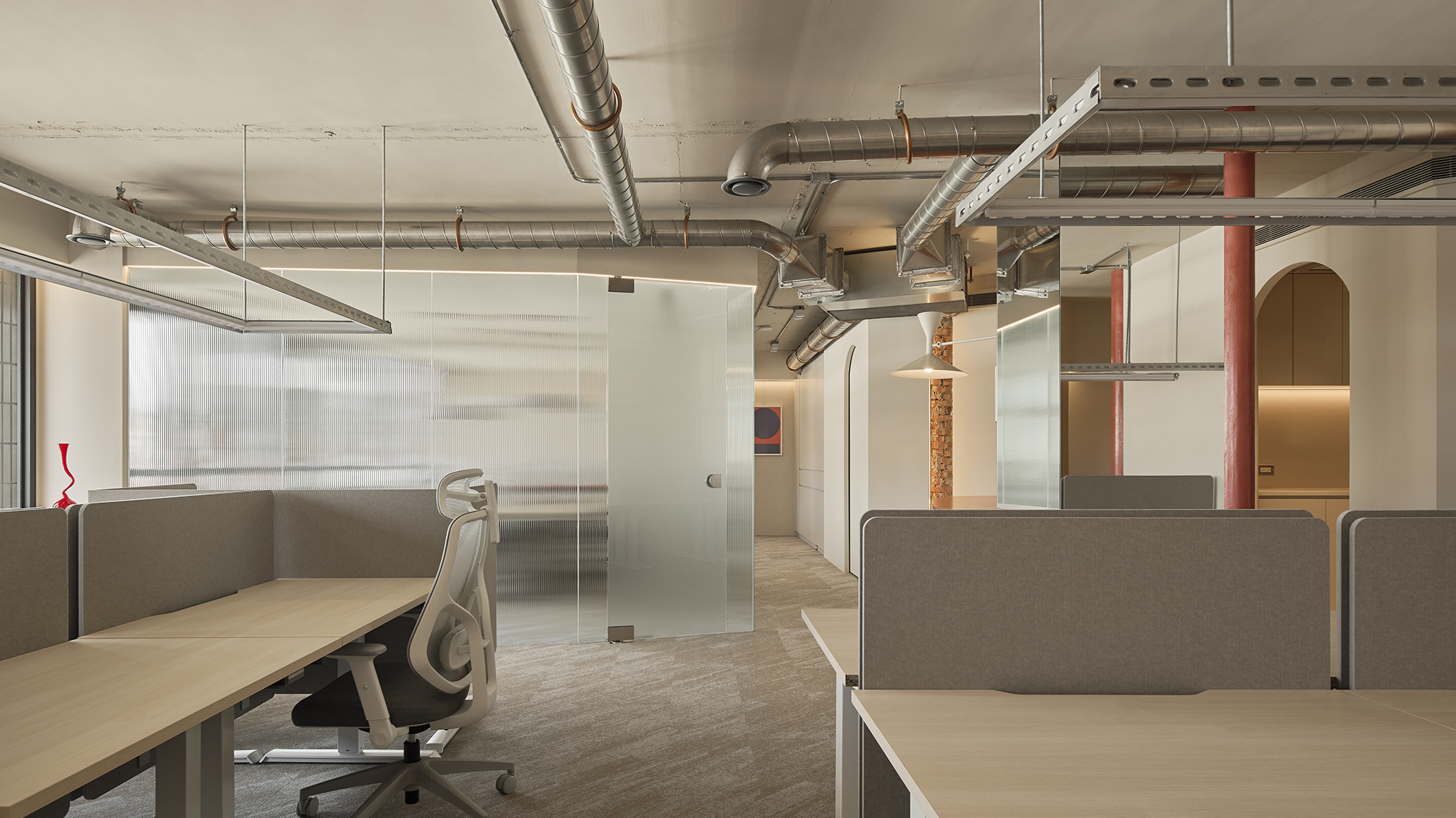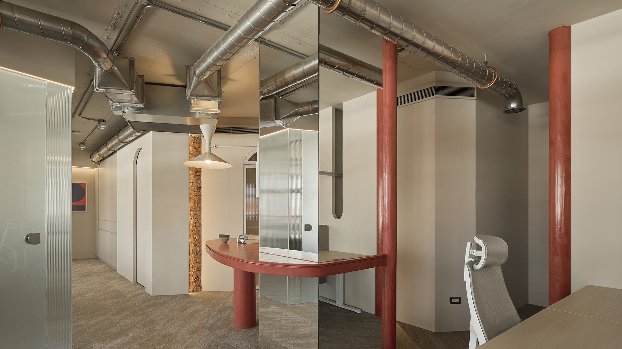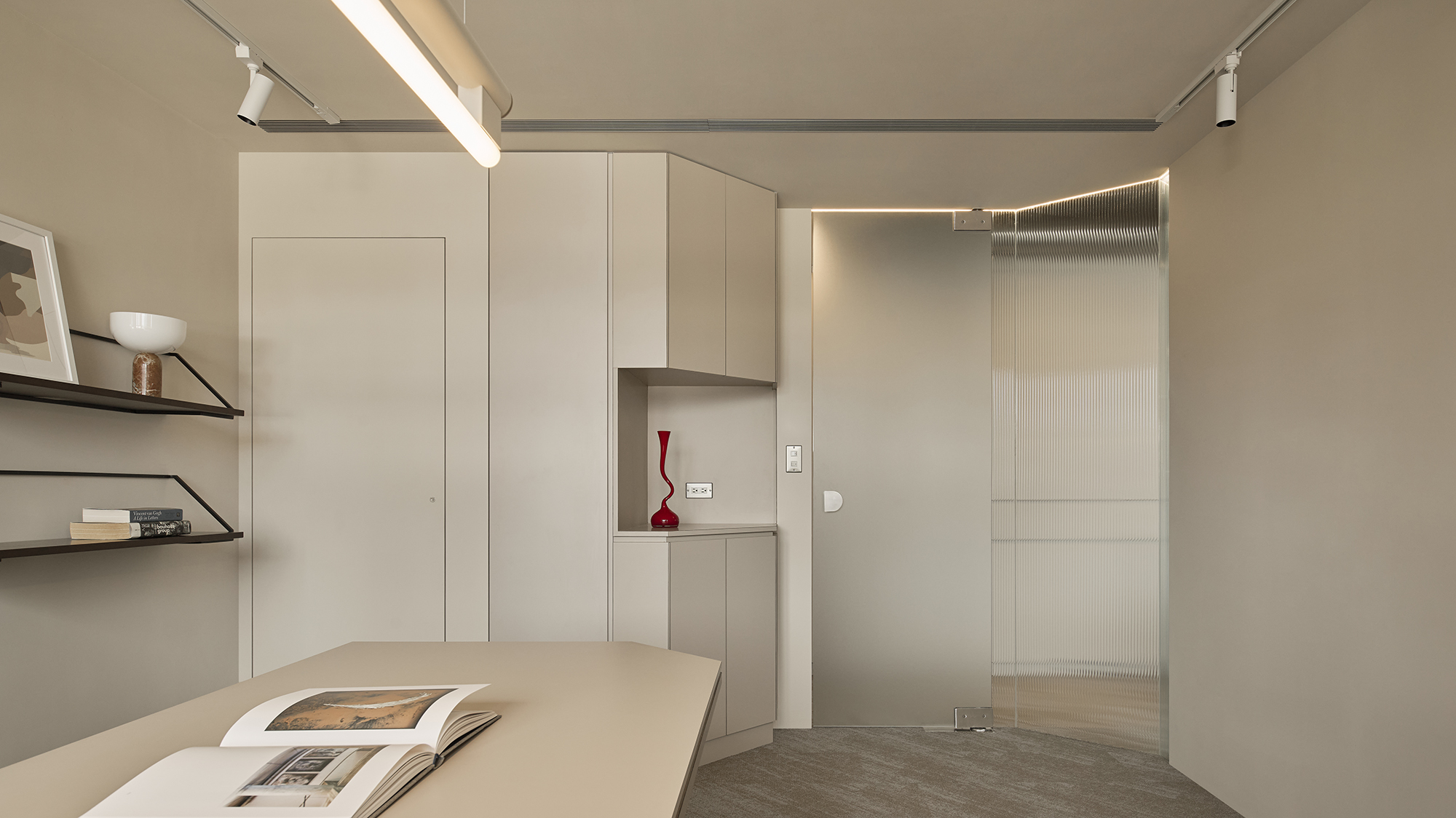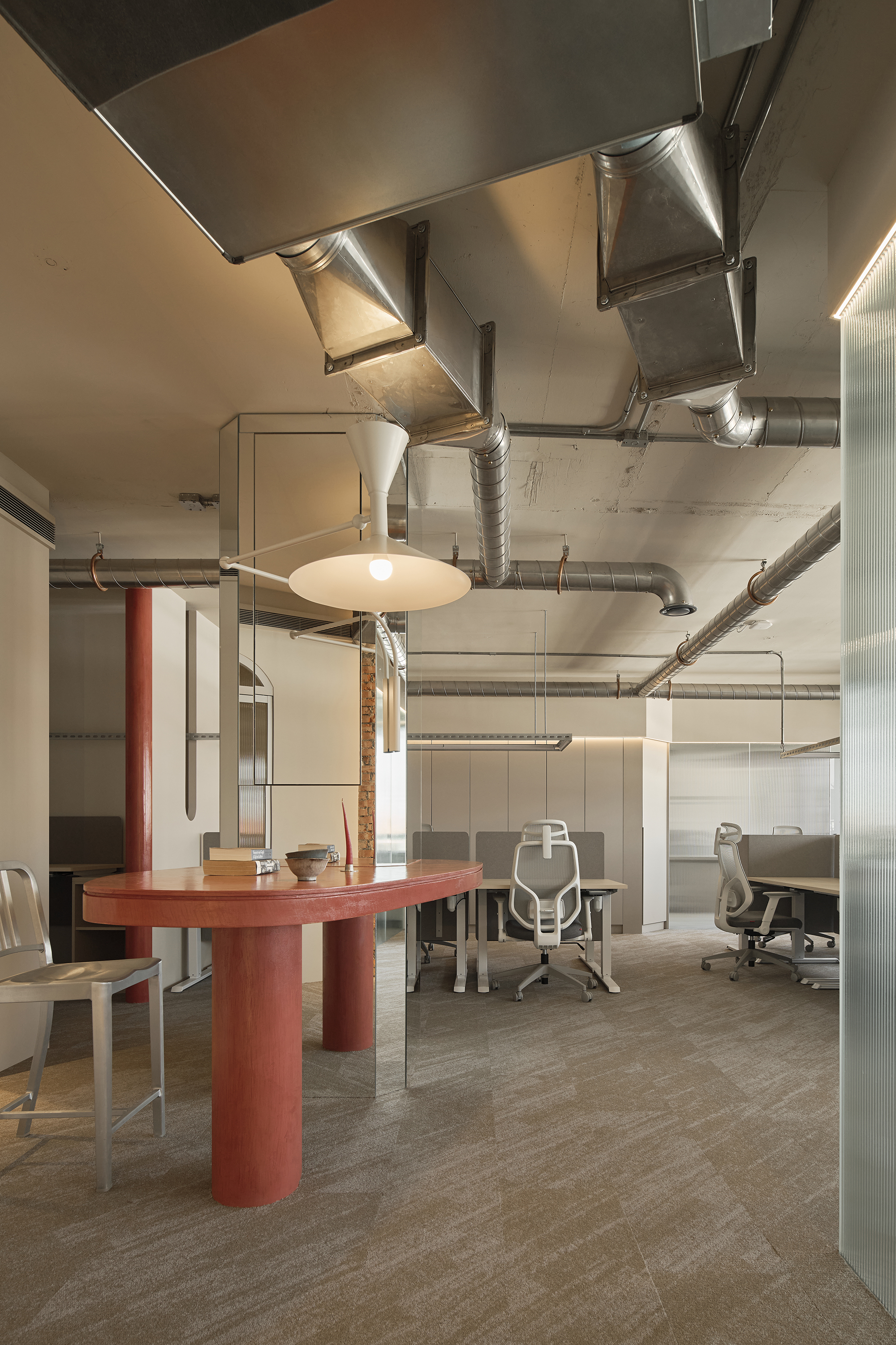 This project focuses on transforming an enchanting old house, over 40 years in age, into a modern office space that beautifully blends functionality and aesthetics. Through meticulous renovation and innovative layout design, we have crafted an inviting and luminous environment that not only meets the diverse needs of the owner but also inspires productivity and collaboration. The thoughtfully designed space encompasses a warm reception area, 13 well-appointed staff workstations, and 2 independent office rooms that promote focus and privacy. A public discussion area encourages open communication, while a designated business machine workspace enhances efficiency. Employees will appreciate the convenience of a pantry and 2 restrooms, all complemented by a spacious conference room that comfortably accommodates up to 20 individuals, ideal for meetings and brainstorming sessions. In pursuit of an airy, open atmosphere that simultaneously maintains individual privacy, the designer has artfully incorporated translucent materials throughout the space. The use of straight lines and matte glass allows natural light to permeate each area while subtly shielding sightlines, achieving an exquisite balance between openness and seclusion. This office not only reflects the owner's vision but also sets a new standard for modern workplace design. Upon entering the room, visitors are immediately captivated by a striking square structural column, measuring 65 cm on each side, positioned at its center. Surrounding this architectural feature, the designer has thoughtfully crafted an irregularly shaped island table that serves multiple purposes. This versatile table provides a dynamic space for staff to engage in communication and collaborative discussions, while also elegantly transforming into a dining area adjacent to the kitchen pantry. In addition, it seamlessly extends the office work area, accommodating a diverse range of needs with both flexibility and style.