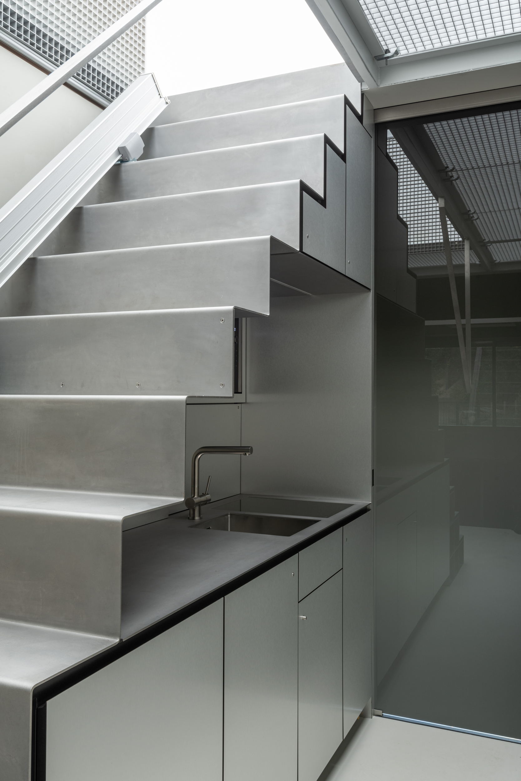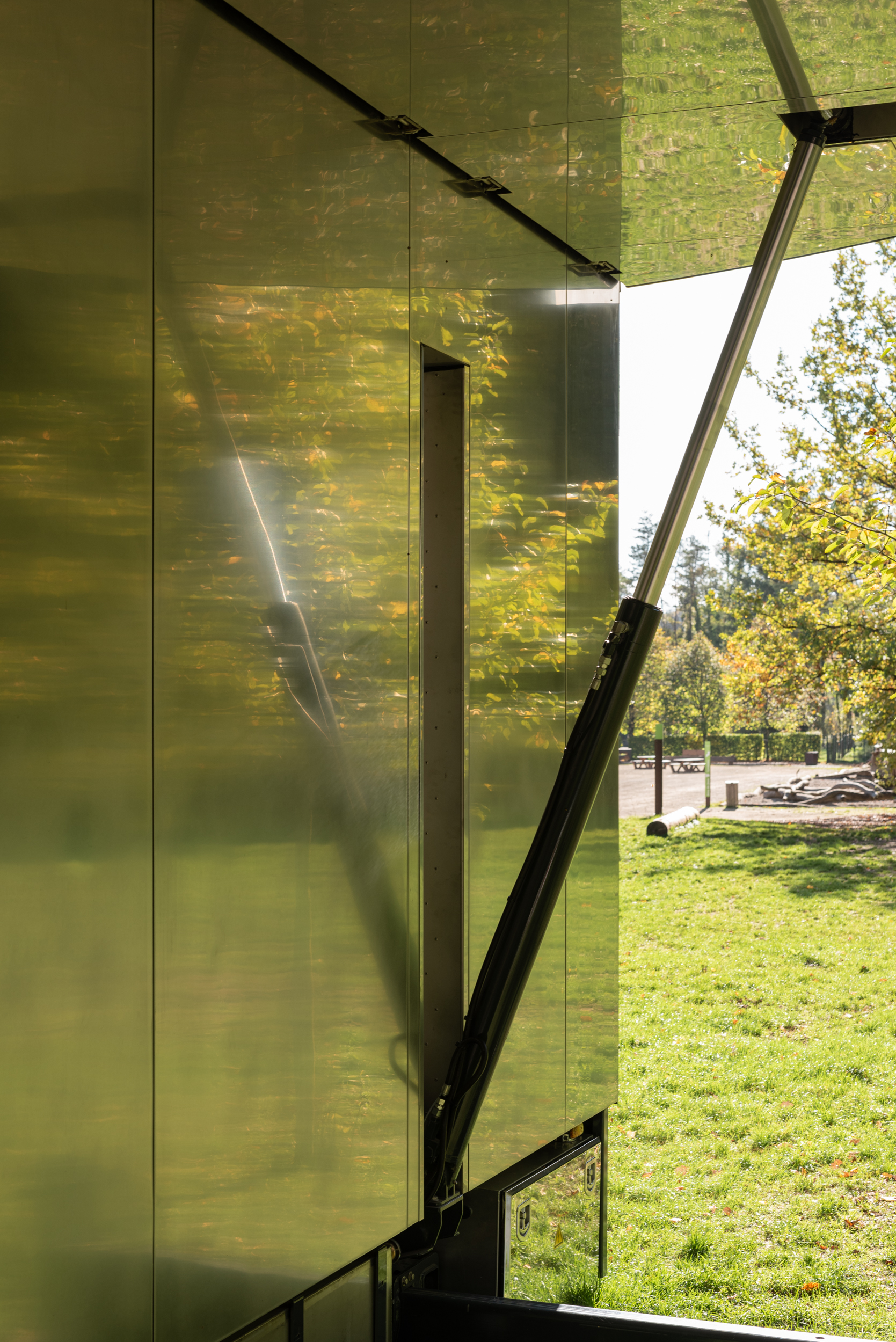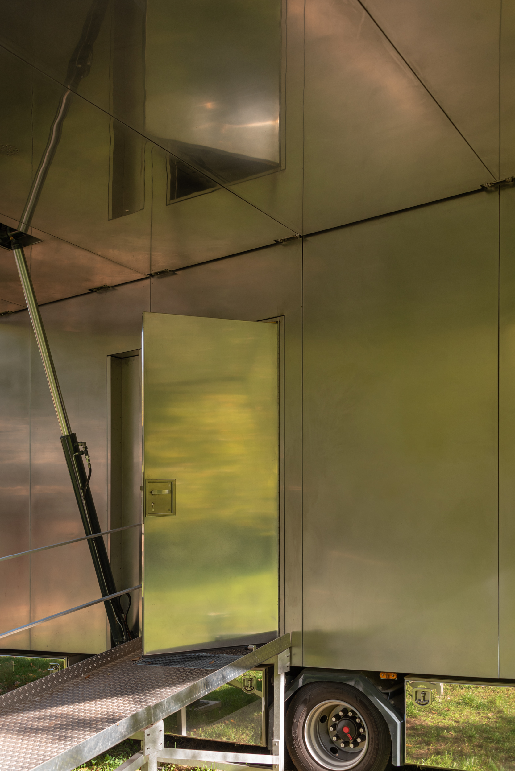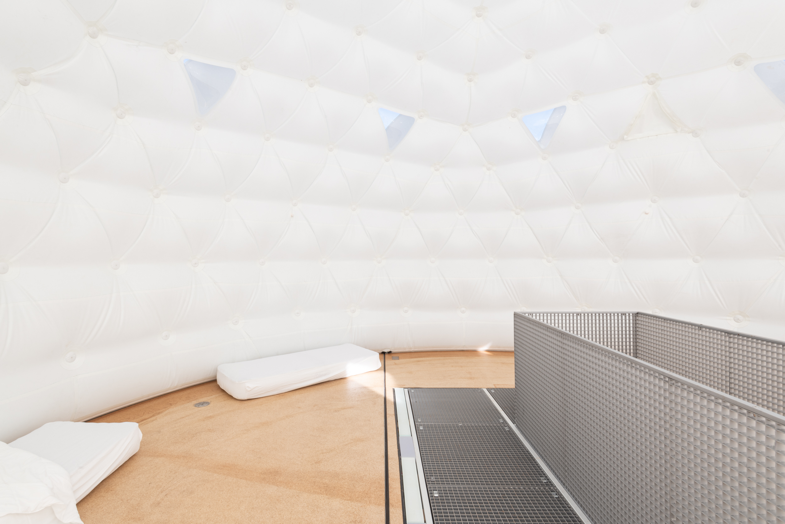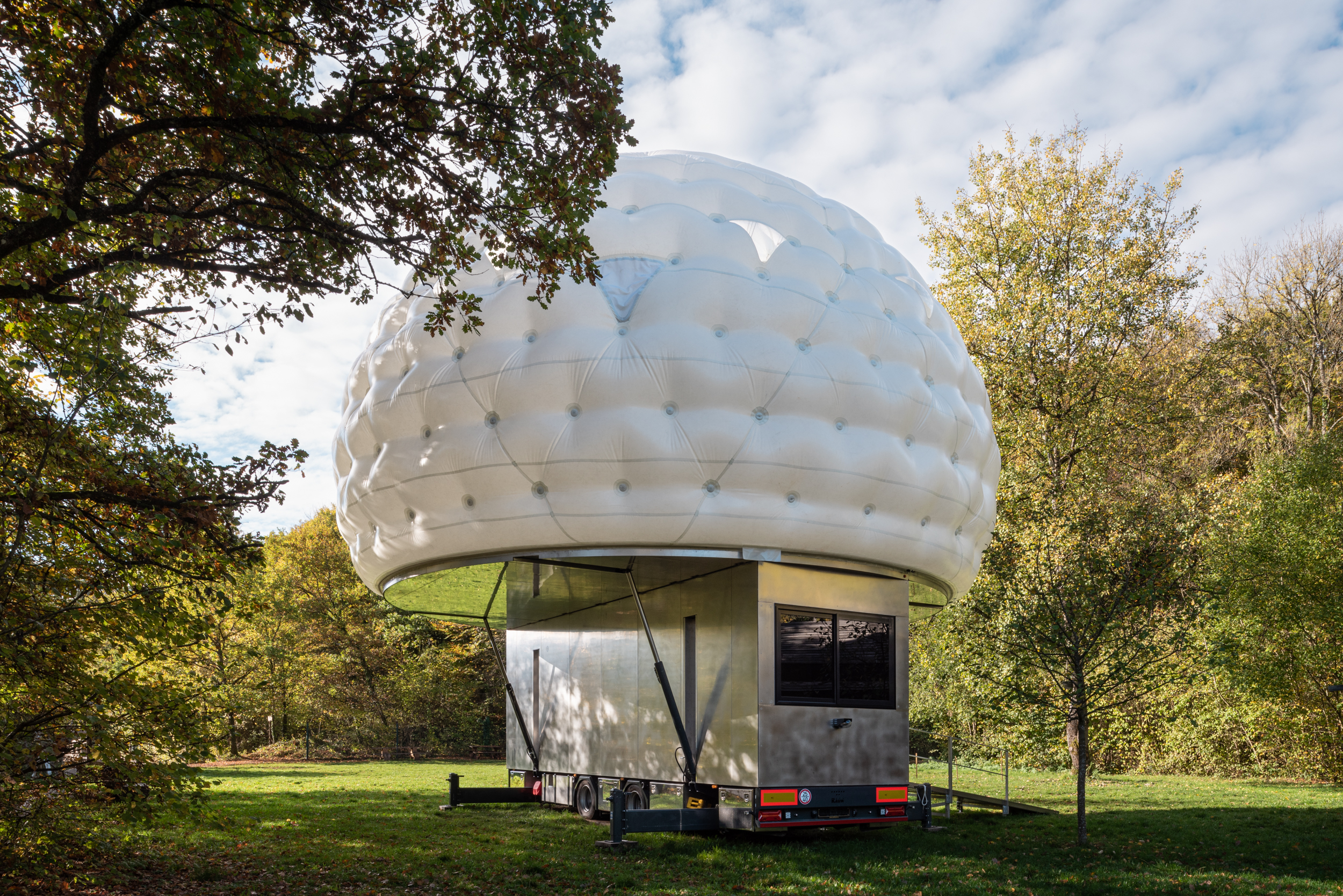 Esch 22 Space Station is a 6-people mobile sleeping hut, designed for experiencing the various contexts and environments of the city of Esch during the Capital of Culture 2022. In mobile setting, the space station is reduced to a stainless steel trailer, containing bath, kitchen and dining space. Once arrived on a destination, 2 wings unfold to form a ø9 meter circular platform with cork cover on top of the trailer. On this platform, a double-shell pneumatic dome is inflated to form the generous sleeping habitat. Moreover, E22SSPIU! problematizes, by its architectural and technical nature, our discipline’s and society’s relation to resources; soil, water and energy.