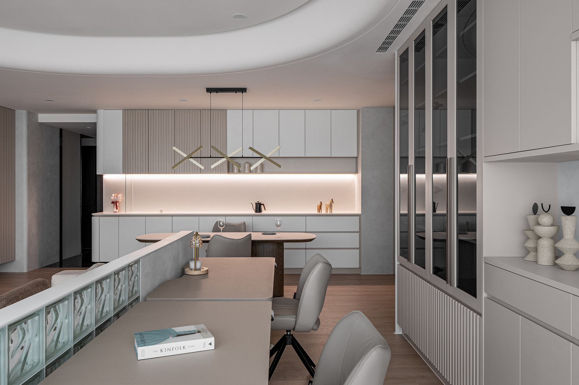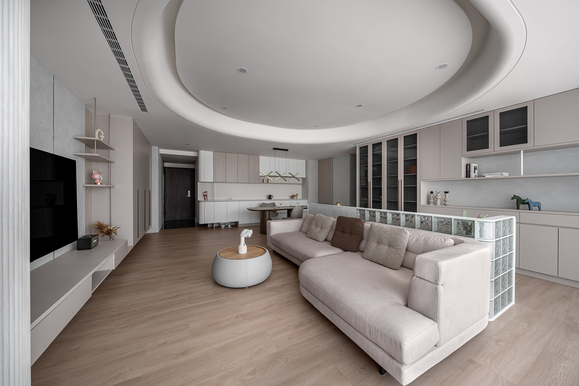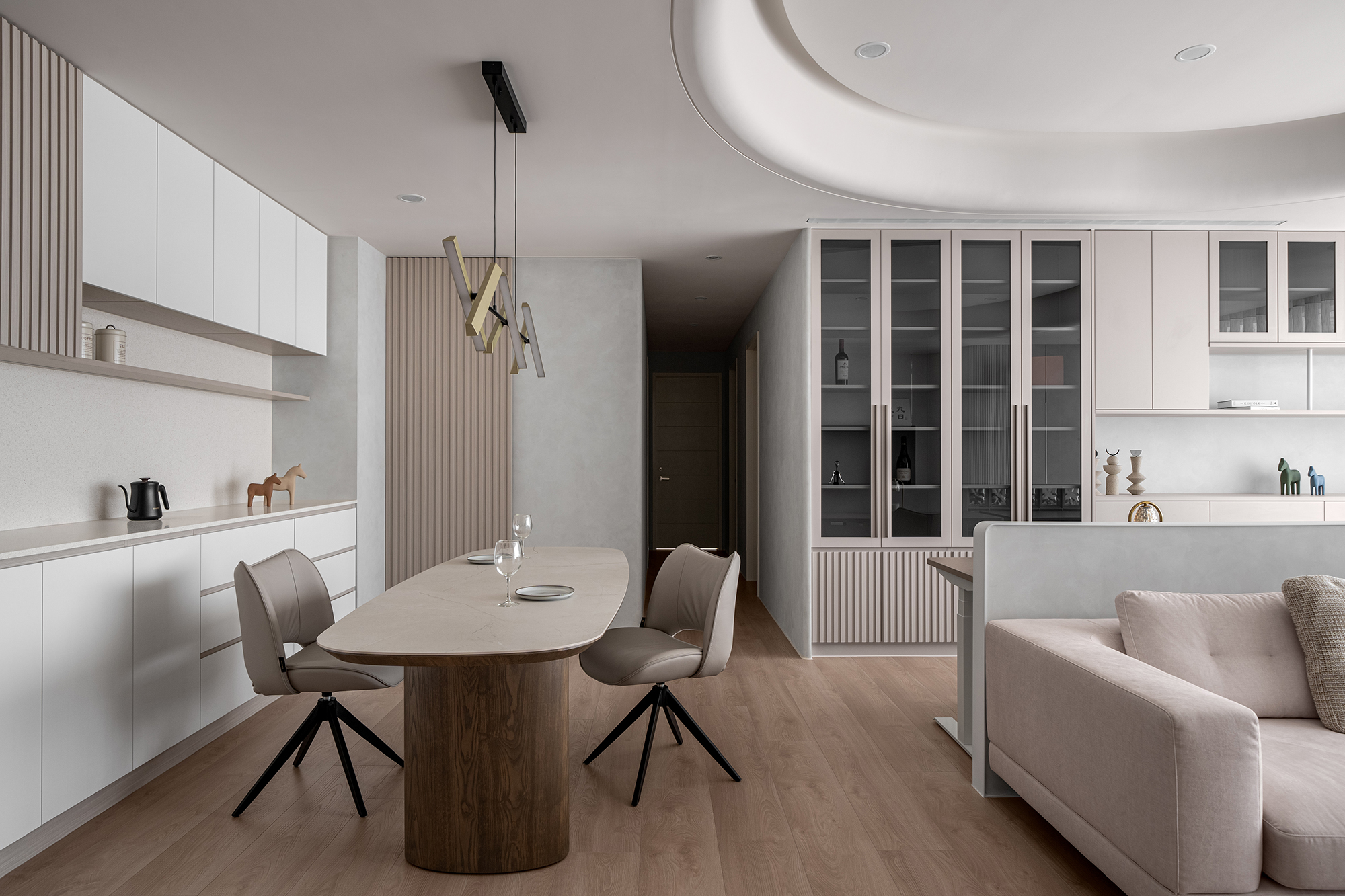 This residence is a tribute to the wabi-sabi aesthetic, embracing simplicity, imperfection, and the quiet beauty of natural materials. The design centers on textured plaster finishes and warm wooden elements, shaping a serene and organic living environment. Responding to the homeowner’s refined artistic sensibilities, the design introduces curved lines across ceilings and walls to soften spatial boundaries, ease visual tension, and minimize collision risk—creating a home that is both safe and rhythmically inviting. In the communal areas, a palette of crisp whites and warm wood tones weaves together a sense of calm and gentle domesticity. The sofa’s backdrop is defined by glass brick partitions, which softly delineate zones while inviting diffused natural light—adding both transparency and refined layering to the interior. Along the vertical surfaces, terrazzo finishes with their earthy textures and organic patterns evoke a grounded, tranquil spirit, enriching the minimalist aesthetic with quiet, tactile detail. The private areas are thoughtfully designed to maximize natural light through window-lined layouts and glass-front cabinetry, blending seamlessly with indirect lighting strips. This interplay of sunlight and ambient illumination enhances the home’s tranquil ambiance while expanding perceived spatial depth. A custom-designed music room—tailored to the homeowner, a professional musician—offers a dedicated space for performance and practice, harmonizing professional function with residential comfort. Moreover, the integration of generous storage cabinetry and refined louvered accents adds depth and visual rhythm, enabling form and function to coexist effortlessly in a thoughtfully composed environment. Guided by a commitment to sustainability, the design incorporates extensive use of glass to enhance natural lighting and spatial transparency, thereby reducing dependence on artificial illumination and supporting energy-saving, low-carbon principles. At the same time, natural wood was selected for its biodegradable and low-emission properties, reflecting the project’s environmentally conscious foundation.
