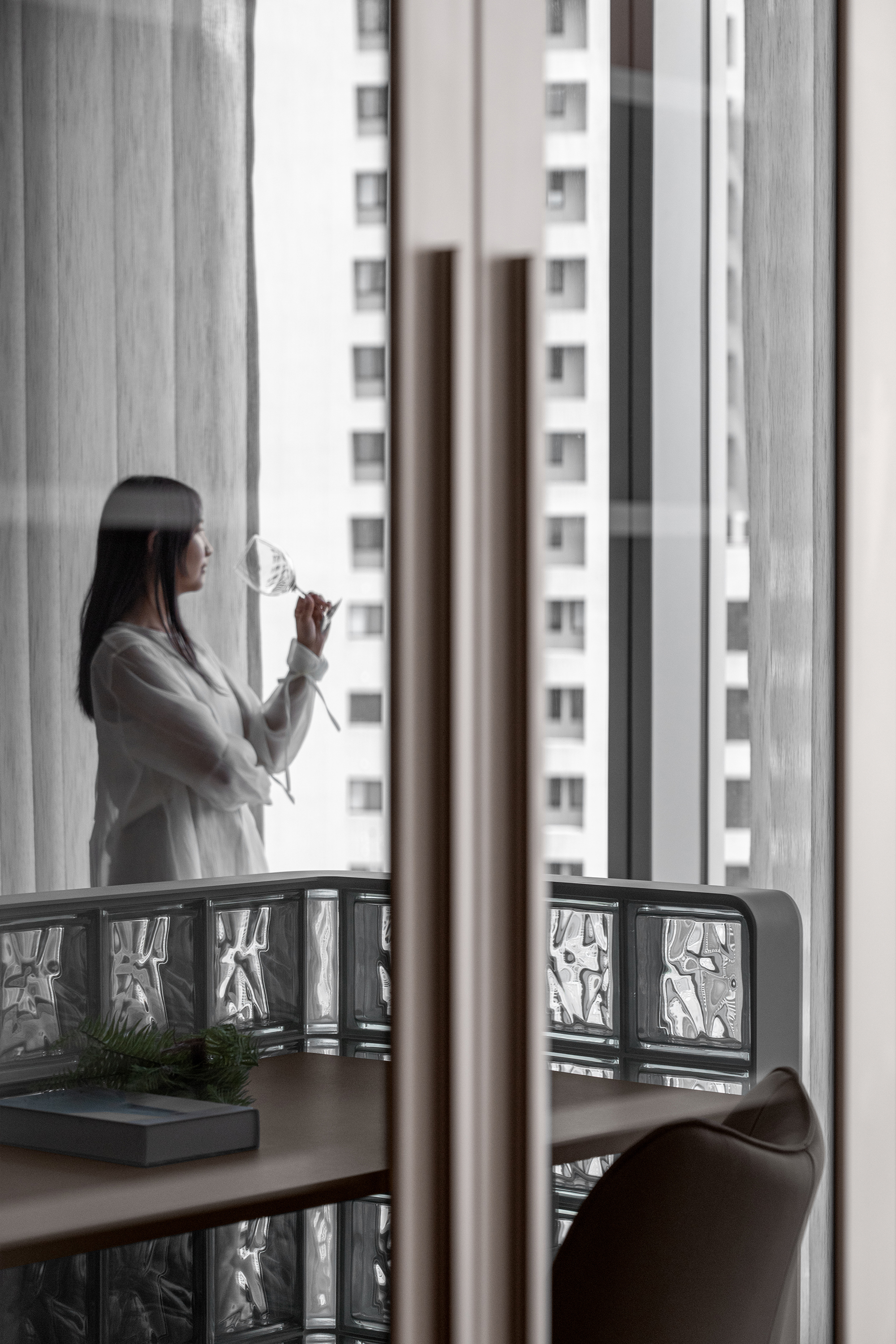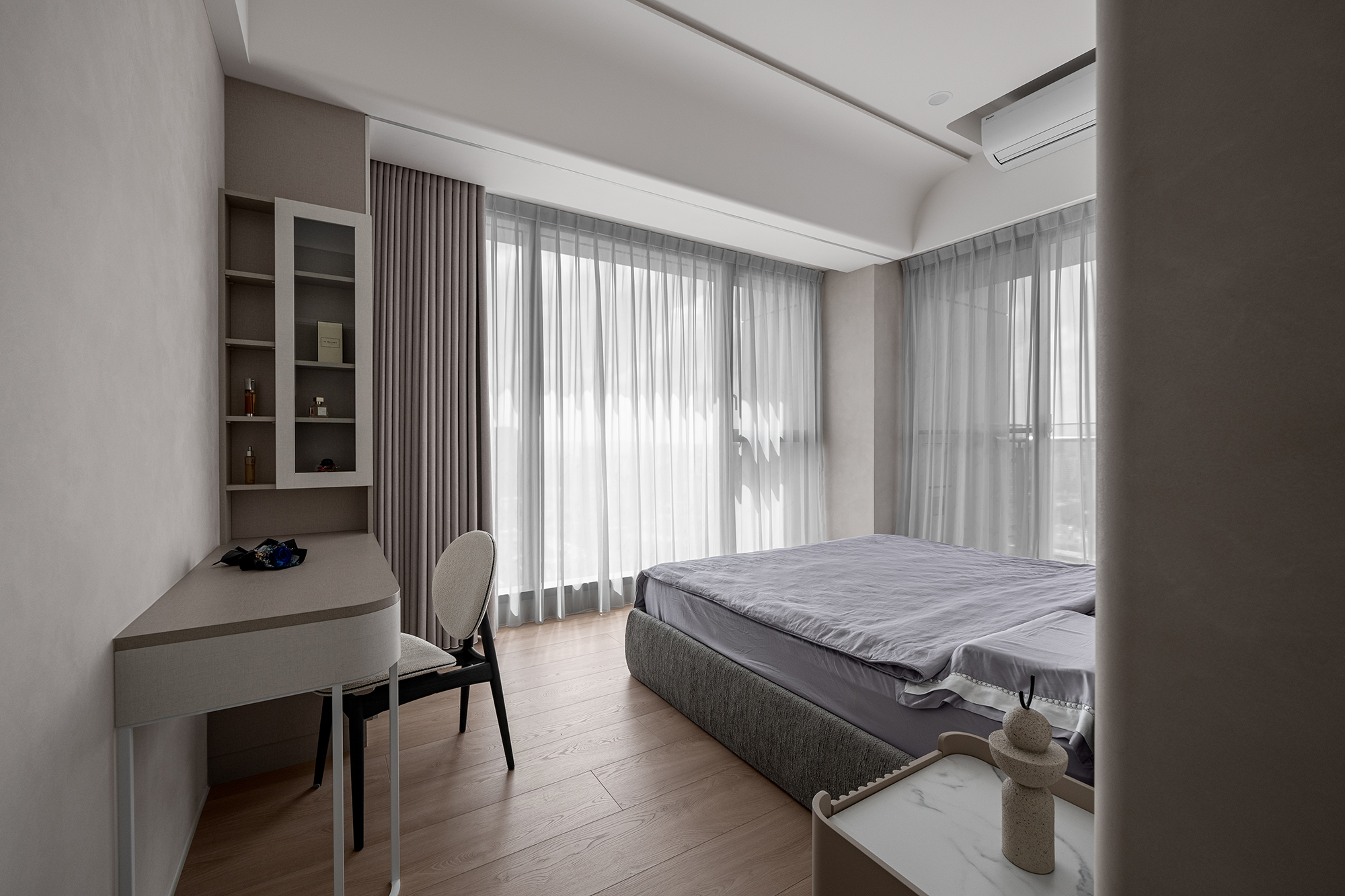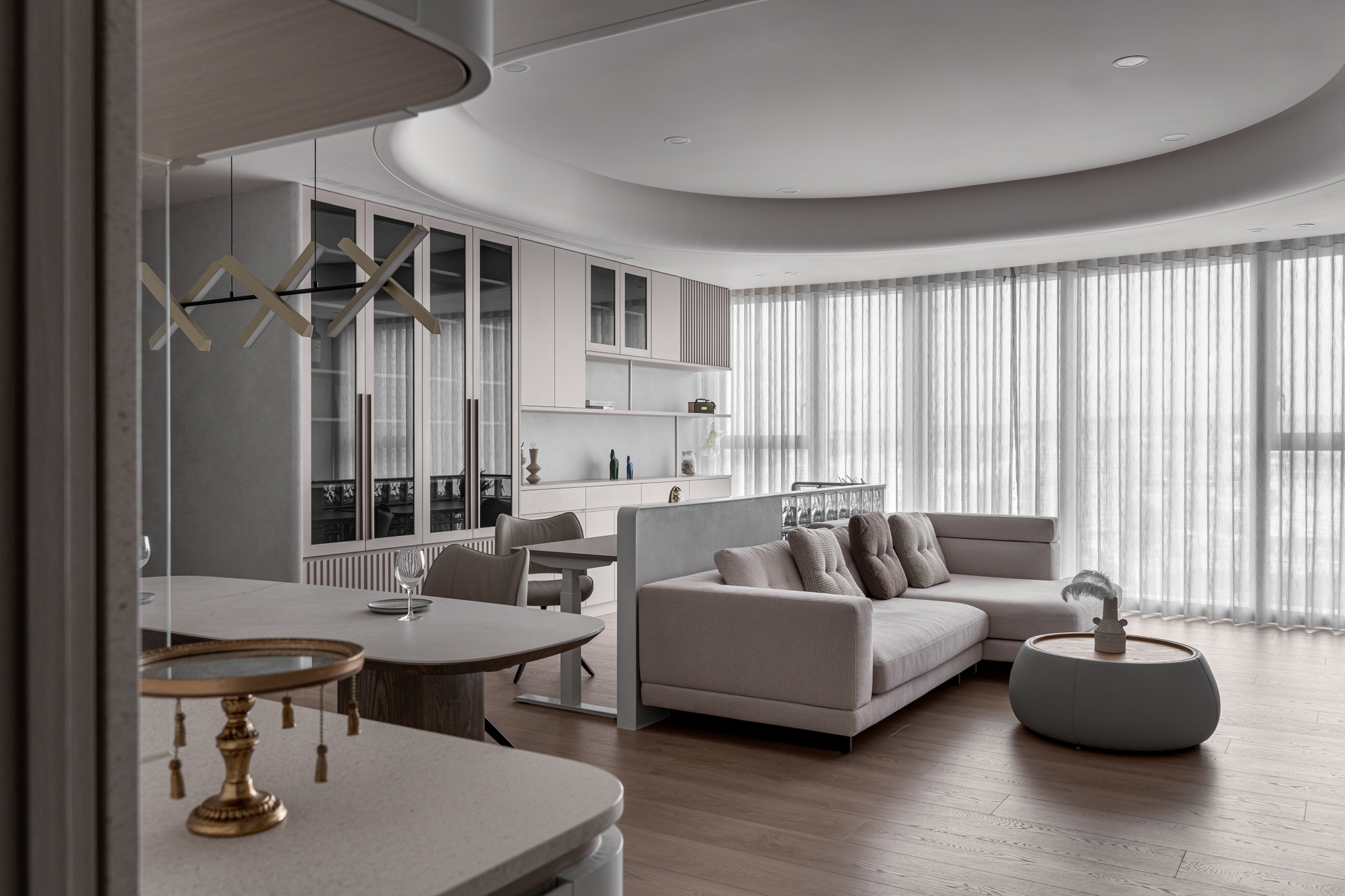 This residence is a tribute to the wabi-sabi aesthetic, embracing simplicity, imperfection, and the quiet beauty of natural materials. The design centers on textured plaster finishes and warm wooden elements, shaping a serene and organic living environment. Responding to the homeowner’s refined artistic sensibilities, the design introduces curved lines across ceilings and walls to soften spatial boundaries, ease visual tension, and minimize collision risk—creating a home that is both safe and rhythmically inviting. In the communal areas, a palette of crisp whites and warm wood tones weaves together a sense of calm and gentle domesticity. The sofa’s backdrop is defined by glass brick partitions, which softly delineate zones while inviting diffused natural light—adding both transparency and refined layering to the interior. Along the vertical surfaces, terrazzo finishes with their earthy textures and organic patterns evoke a grounded, tranquil spirit, enriching the minimalist aesthetic with quiet, tactile detail. The private areas are thoughtfully designed to maximize natural light through window-lined layouts and glass-front cabinetry, blending seamlessly with indirect lighting strips. This interplay of sunlight and ambient illumination enhances the home’s tranquil ambiance while expanding perceived spatial depth. A custom-designed music room—tailored to the homeowner, a professional musician—offers a dedicated space for performance and practice, harmonizing professional function with residential comfort. Moreover, the integration of generous storage cabinetry and refined louvered accents adds depth and visual rhythm, enabling form and function to coexist effortlessly in a thoughtfully composed environment. Guided by a commitment to sustainability, the design incorporates extensive use of glass to enhance natural lighting and spatial transparency, thereby reducing dependence on artificial illumination and supporting energy-saving, low-carbon principles. At the same time, natural wood was selected for its biodegradable and low-emission properties, reflecting the project’s environmentally conscious foundation.