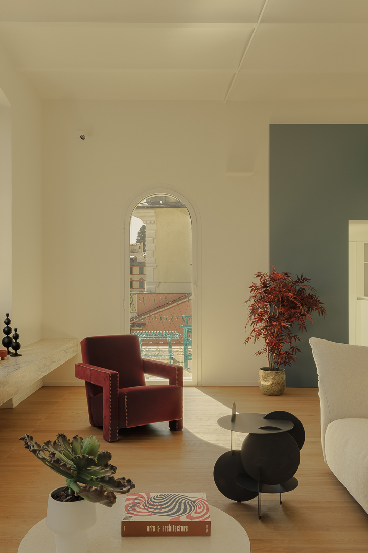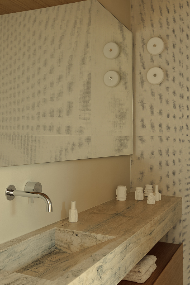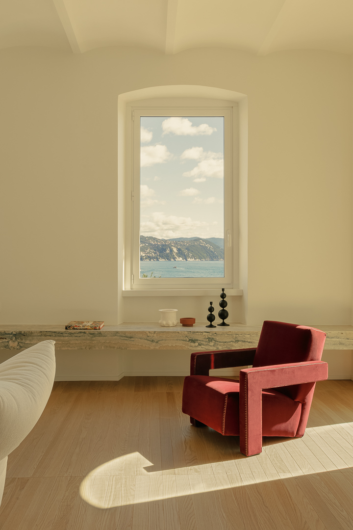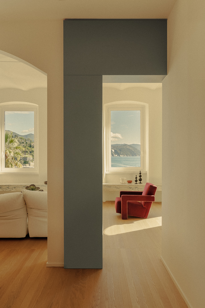 90-square-meter seafront apartment becomes the focal point of a project that celebrates the harmonious dialogue between interior and exterior. This connection is expressed through a series of elements that act as connectors, such as the suspended bench in Ocean Blue travertine in the living area and the master bathroom countertop, whose form and material evoke the outdoor environment, amplifying the sense of continuity with the surrounding landscape. The terrace flooring, which extends into the kitchen niche, also creates a fusion effect between the two spaces, generating a single fluid surface that emphasizes openness and connection with nature. The design highlights the essence of oak, both in the main flooring and in the slatted micro-architecture, conceived as a new volume with a dressing room function. In addition to inspirations drawn from the surrounding environment, the project also engages with the existing architecture through the inclusion of cerulean portals that create a harmonious dialogue, achieving a perfect balance between modernity and tradition.