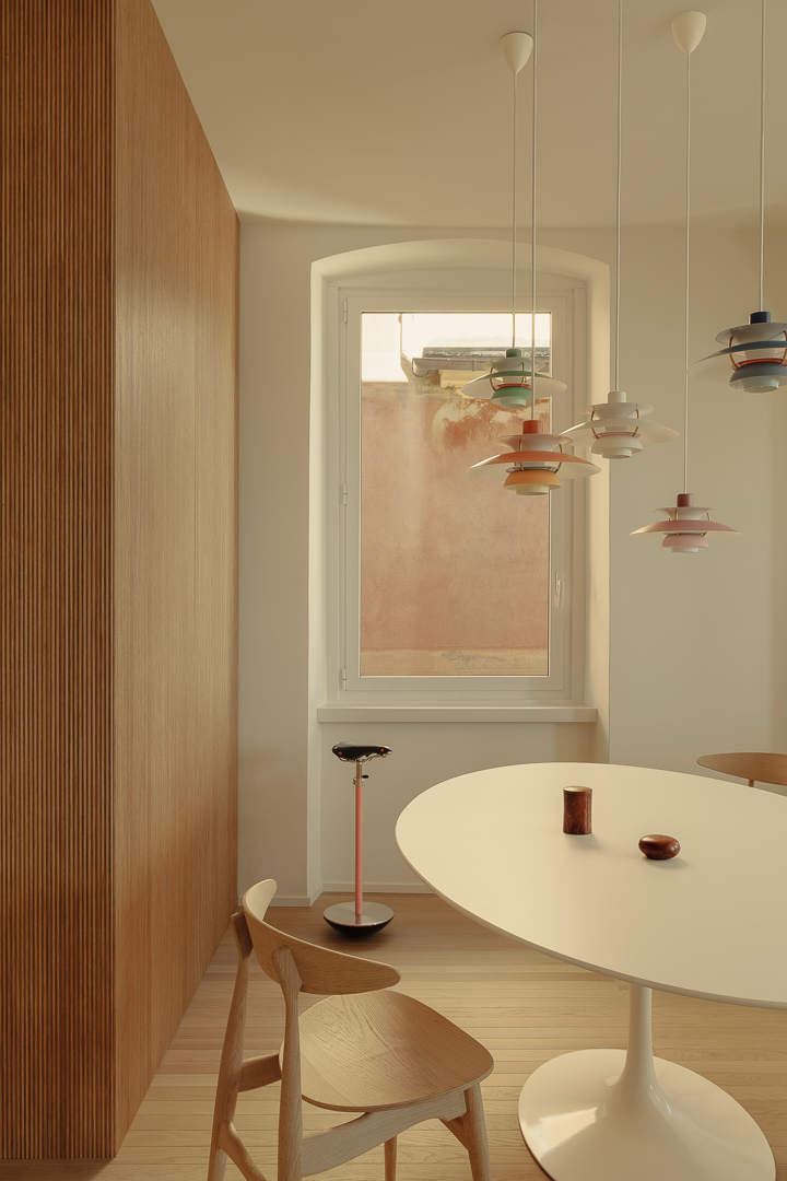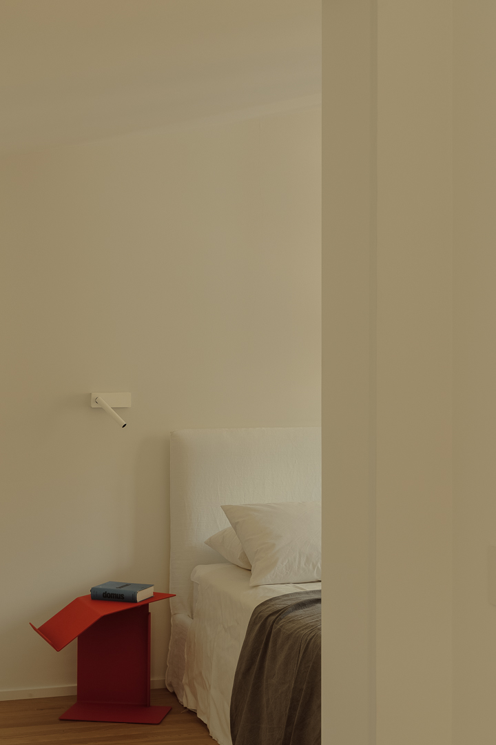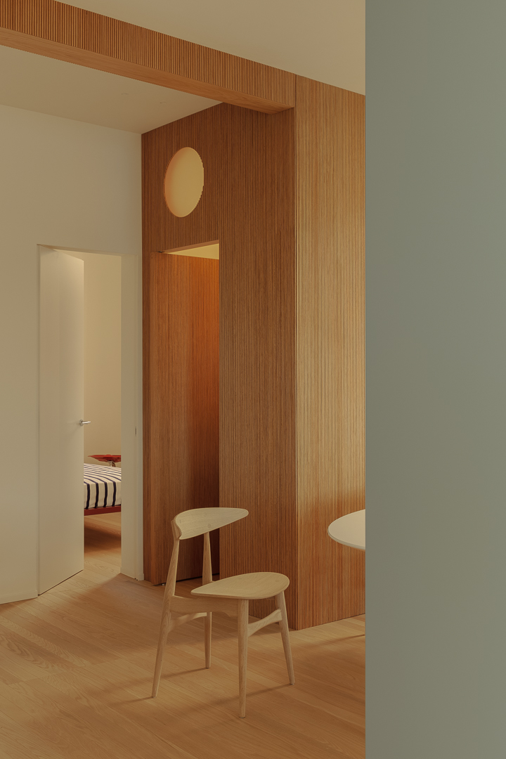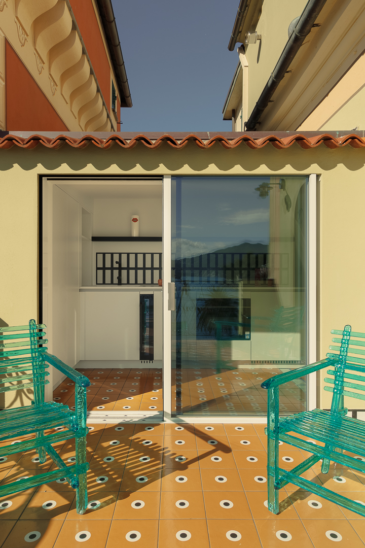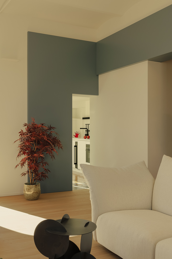 90-square-meter seafront apartment becomes the focal point of a project that celebrates the harmonious dialogue between interior and exterior. This connection is expressed through a series of elements that act as connectors, such as the suspended bench in Ocean Blue travertine in the living area and the master bathroom countertop, whose form and material evoke the outdoor environment, amplifying the sense of continuity with the surrounding landscape. The terrace flooring, which extends into the kitchen niche, also creates a fusion effect between the two spaces, generating a single fluid surface that emphasizes openness and connection with nature. The design highlights the essence of oak, both in the main flooring and in the slatted micro-architecture, conceived as a new volume with a dressing room function. In addition to inspirations drawn from the surrounding environment, the project also engages with the existing architecture through the inclusion of cerulean portals that create a harmonious dialogue, achieving a perfect balance between modernity and tradition.