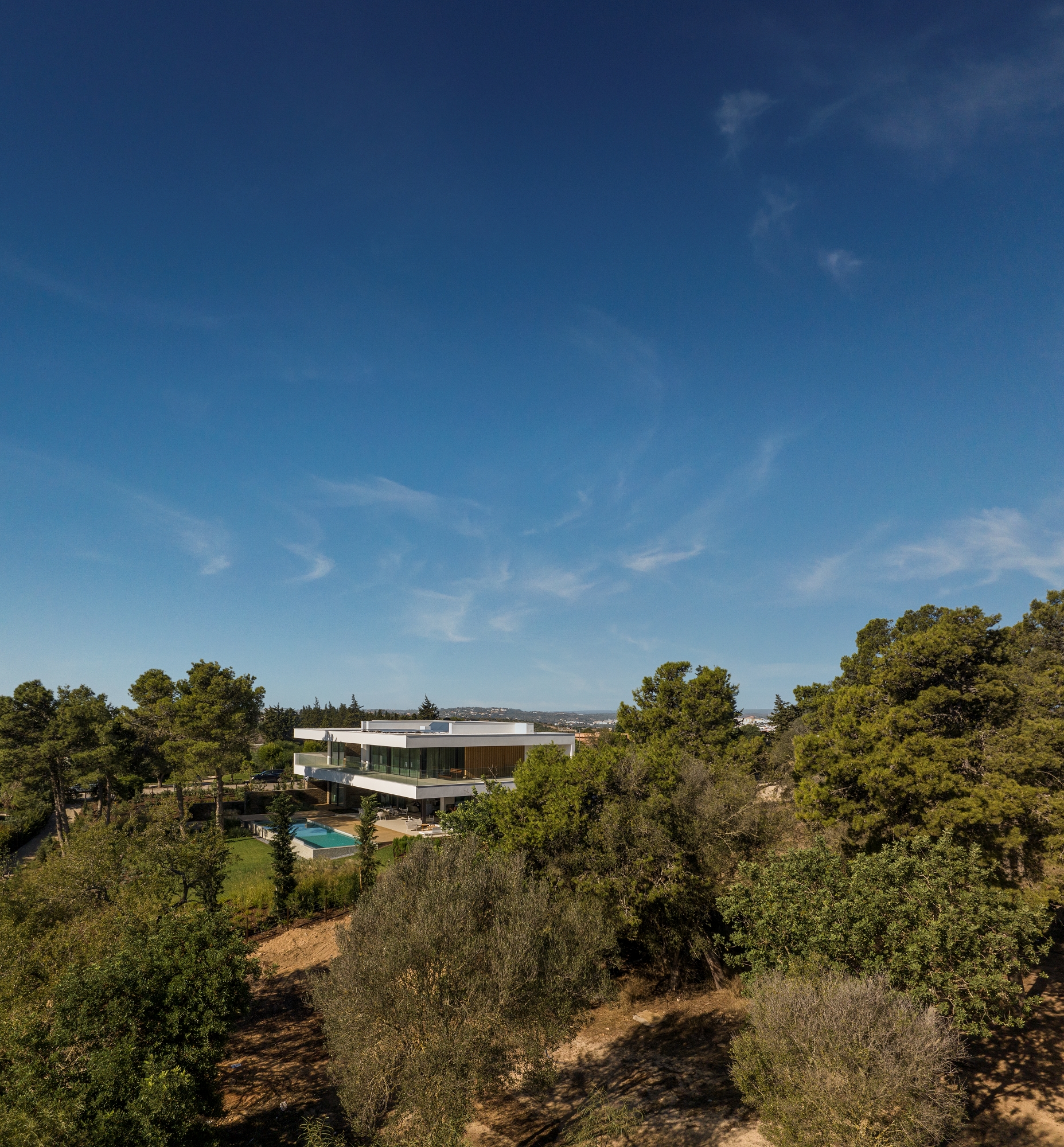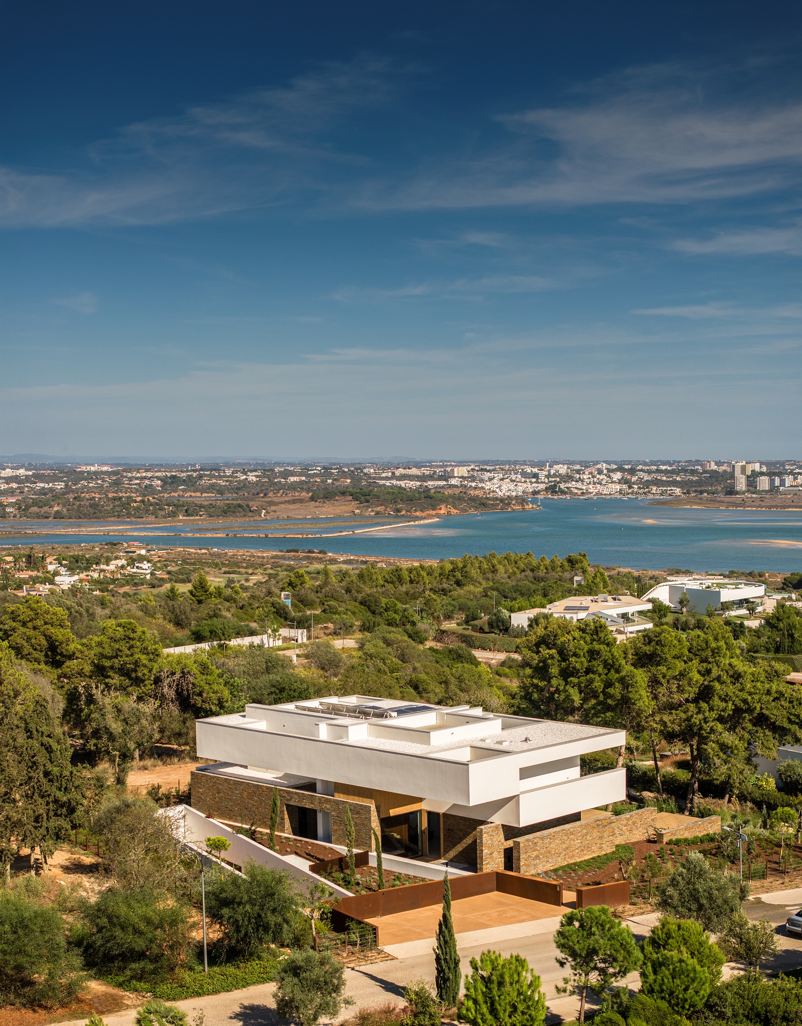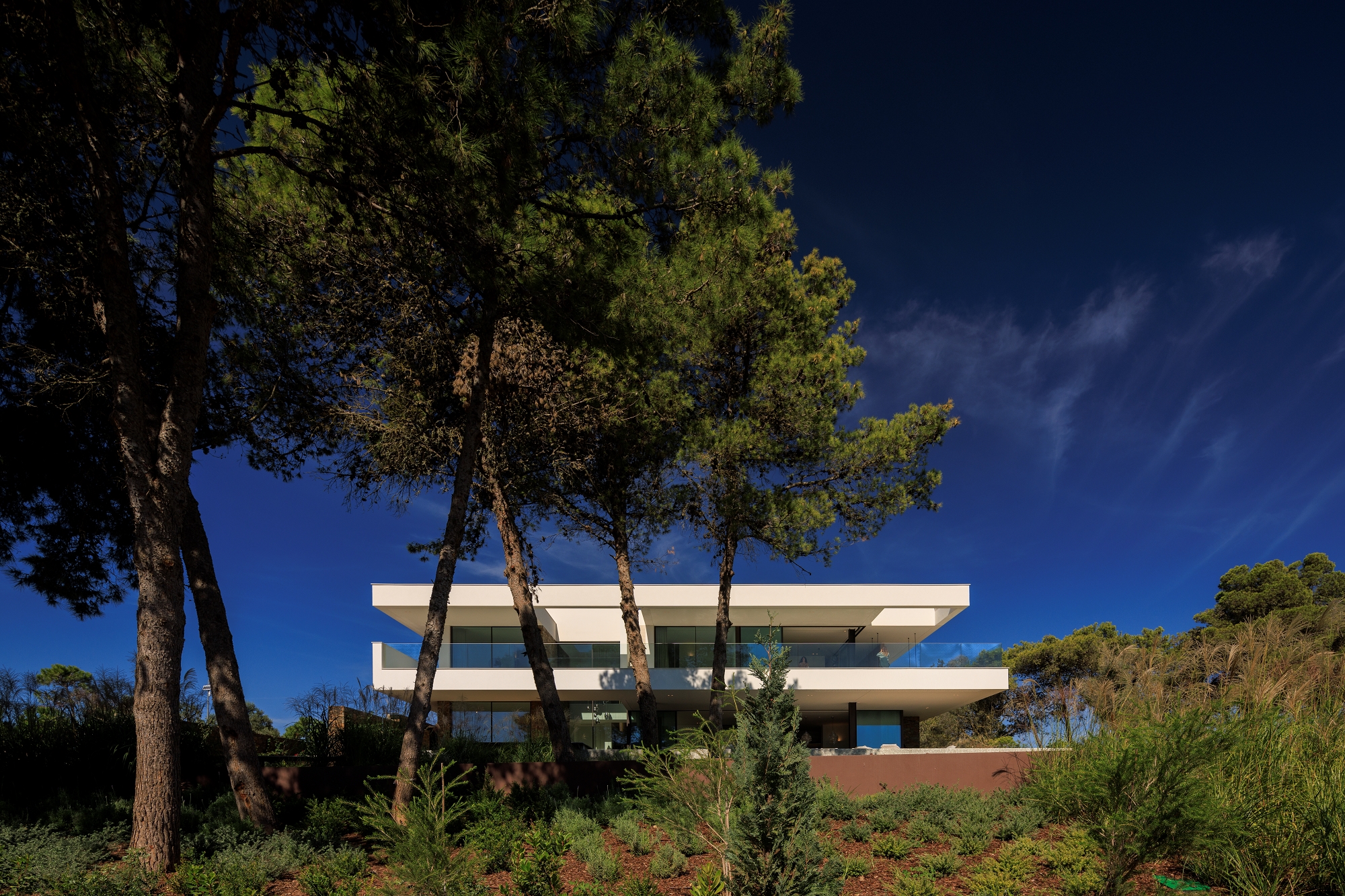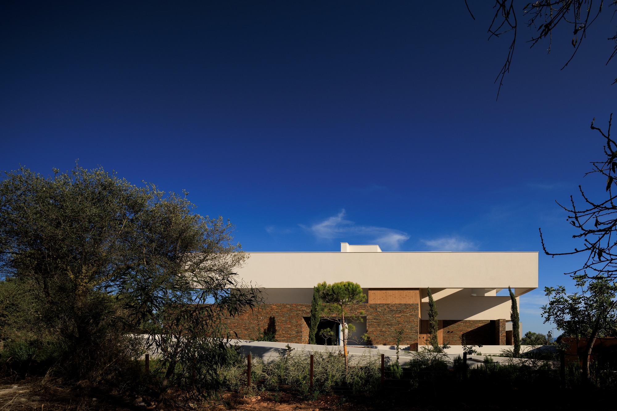Casa Morena is situated on a plot with verdant pine trees, a place where the view becomes lost in the green of the surrounding area and the immense blue of a bay. The pine trees mark the site and have influenced the planning and reticulated design of the house. Some of the schist, used to build the solid walls, was removed from the site. These walls mark the house’s foundation, which is deconstructed into walls that become lower and lower, becoming separate from the house and merging into the garden. A natural and neutral foundation, in its raw state, that rises from the ground in direct contrast to the clear lightness of the upper floor, white and smooth, composed of horizontal layers that appear to become loose and floating, seeking the shade of the canopy of pine trees. The house is complete, inside and out, with simple, clean, contemporary lines. It has a certain lightness and visual balance, letting itself be shaped by its surroundings, with which it is important to encourage respect and architectural identification. White, the predominant colour in the region, covers the exterior of the building. This whiteness reinforces the shadows, softening them and creating a chromatic interaction with the natural materials used; the wood and stone of the region that cover some of the surrounding walls. A simple house, one that wishes to be discreet and to be influenced by its location, to become a house that is pleasant with thoughtful landscaping.