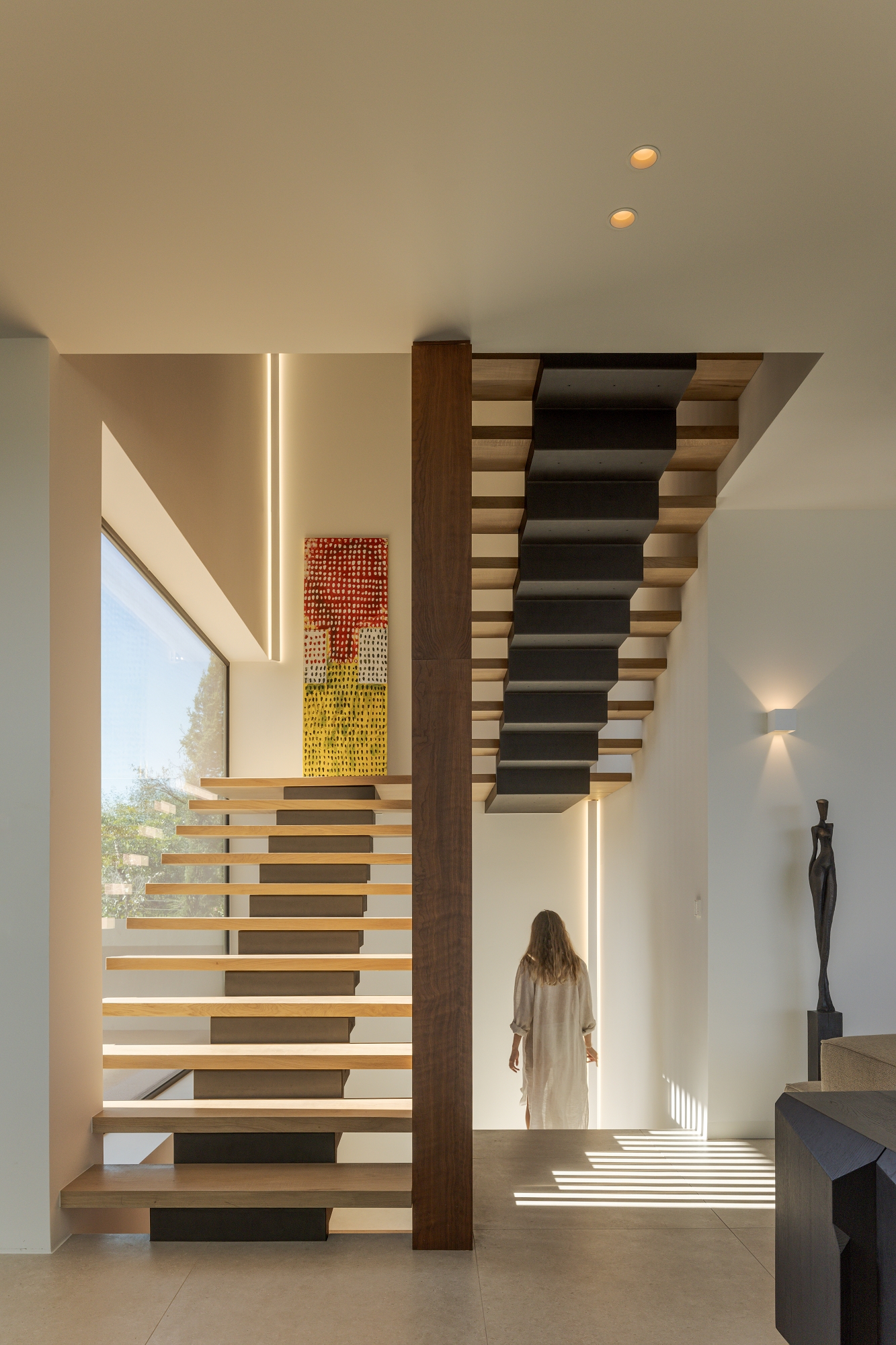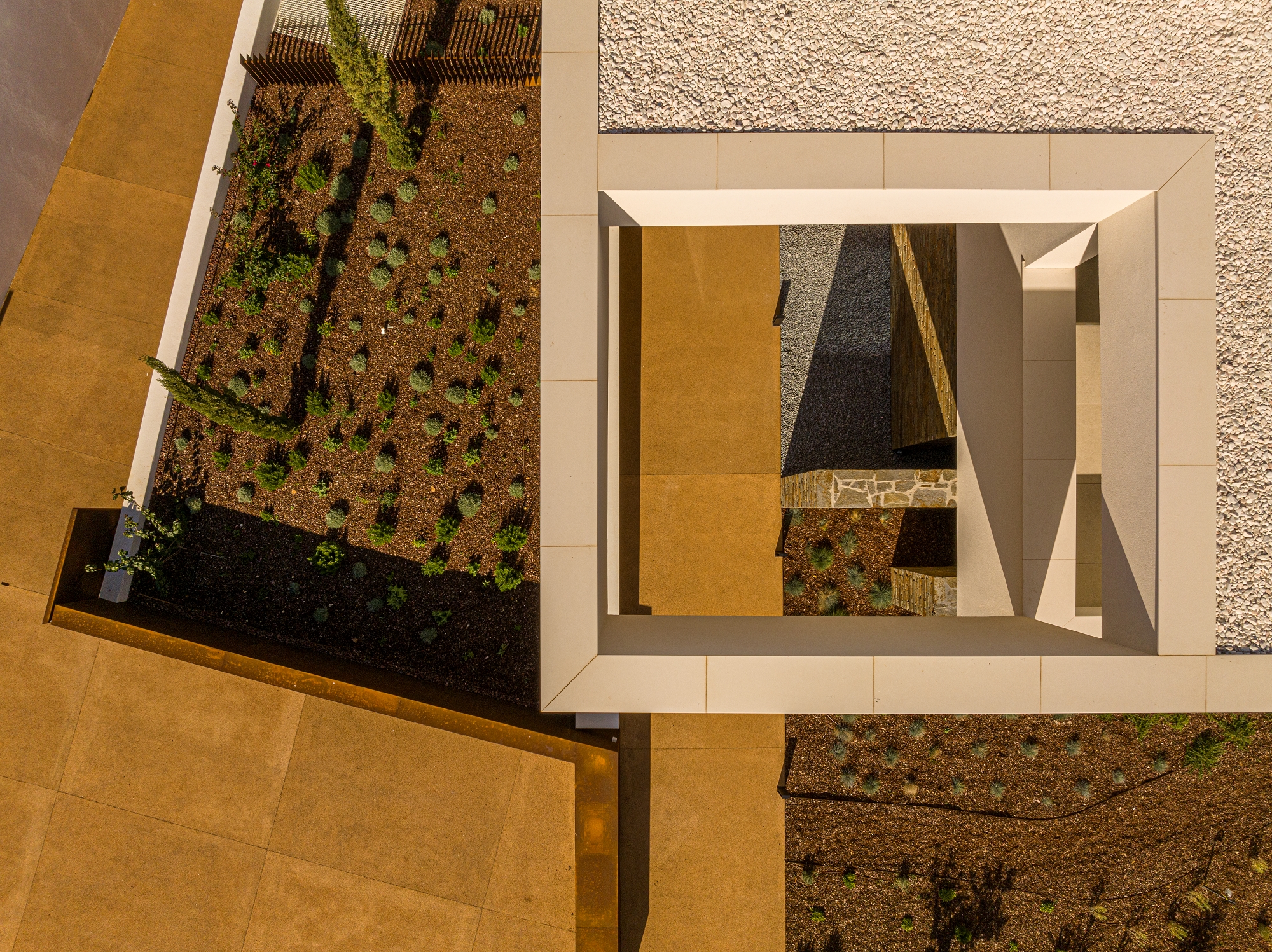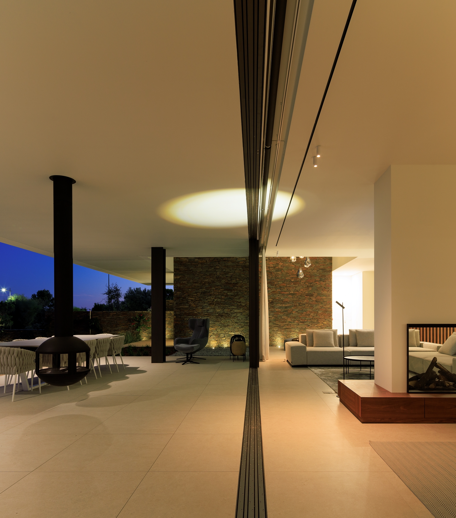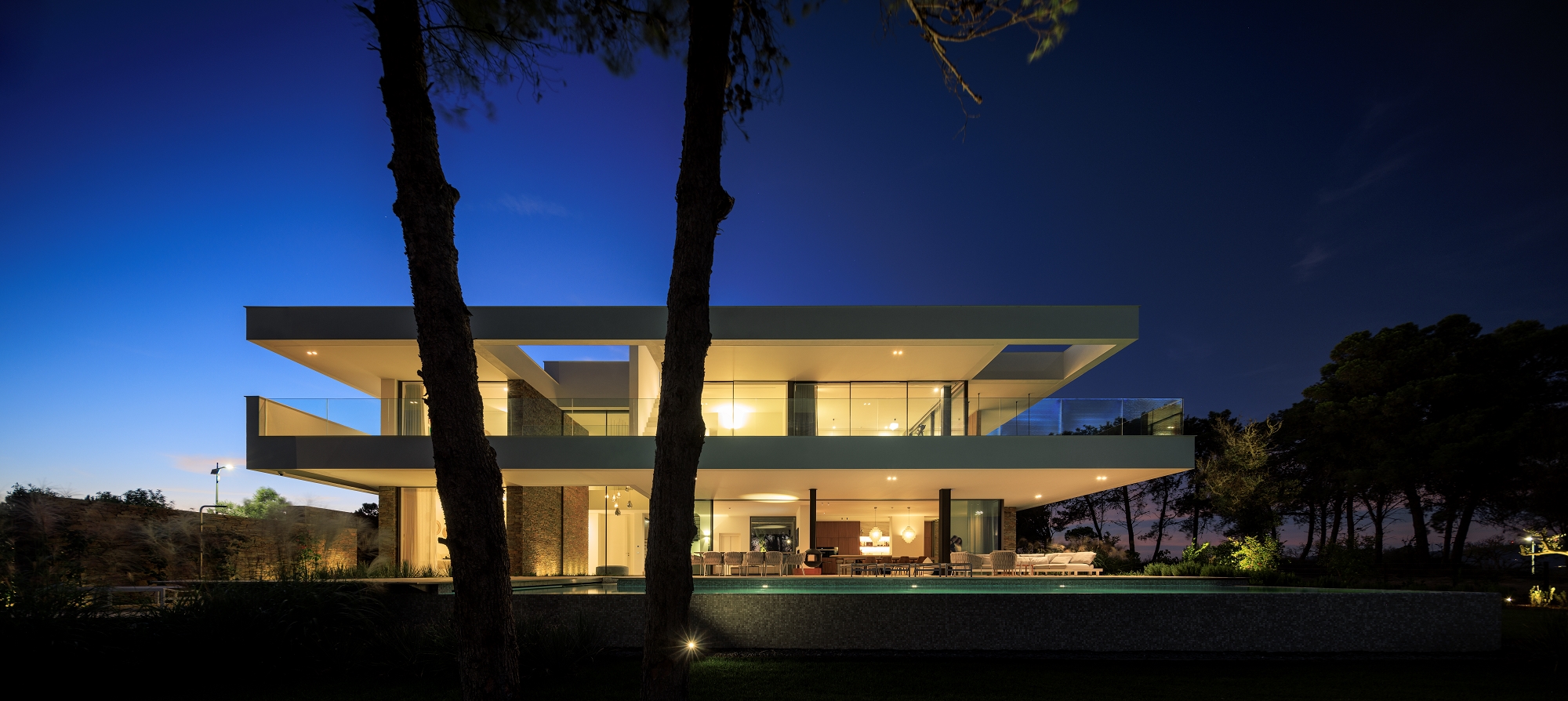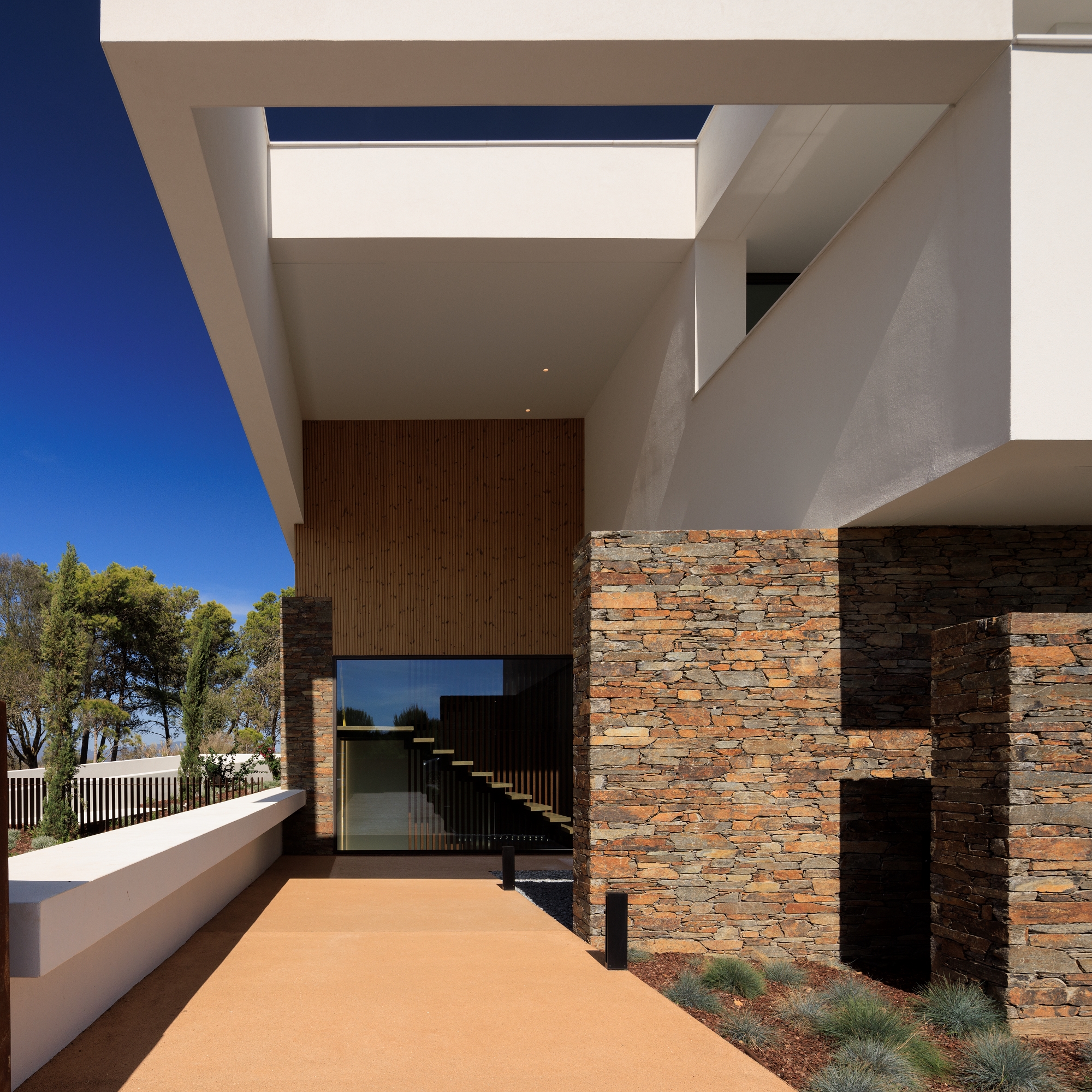 Casa Morena is situated on a plot with verdant pine trees, a place where the view becomes lost in the green of the surrounding area and the immense blue of a bay. The pine trees mark the site and have influenced the planning and reticulated design of the house. Some of the schist, used to build the solid walls, was removed from the site. These walls mark the house’s foundation, which is deconstructed into walls that become lower and lower, becoming separate from the house and merging into the garden. A natural and neutral foundation, in its raw state, that rises from the ground in direct contrast to the clear lightness of the upper floor, white and smooth, composed of horizontal layers that appear to become loose and floating, seeking the shade of the canopy of pine trees. The house is complete, inside and out, with simple, clean, contemporary lines. It has a certain lightness and visual balance, letting itself be shaped by its surroundings, with which it is important to encourage respect and architectural identification. White, the predominant colour in the region, covers the exterior of the building. This whiteness reinforces the shadows, softening them and creating a chromatic interaction with the natural materials used; the wood and stone of the region that cover some of the surrounding walls. A simple house, one that wishes to be discreet and to be influenced by its location, to become a house that is pleasant with thoughtful landscaping.