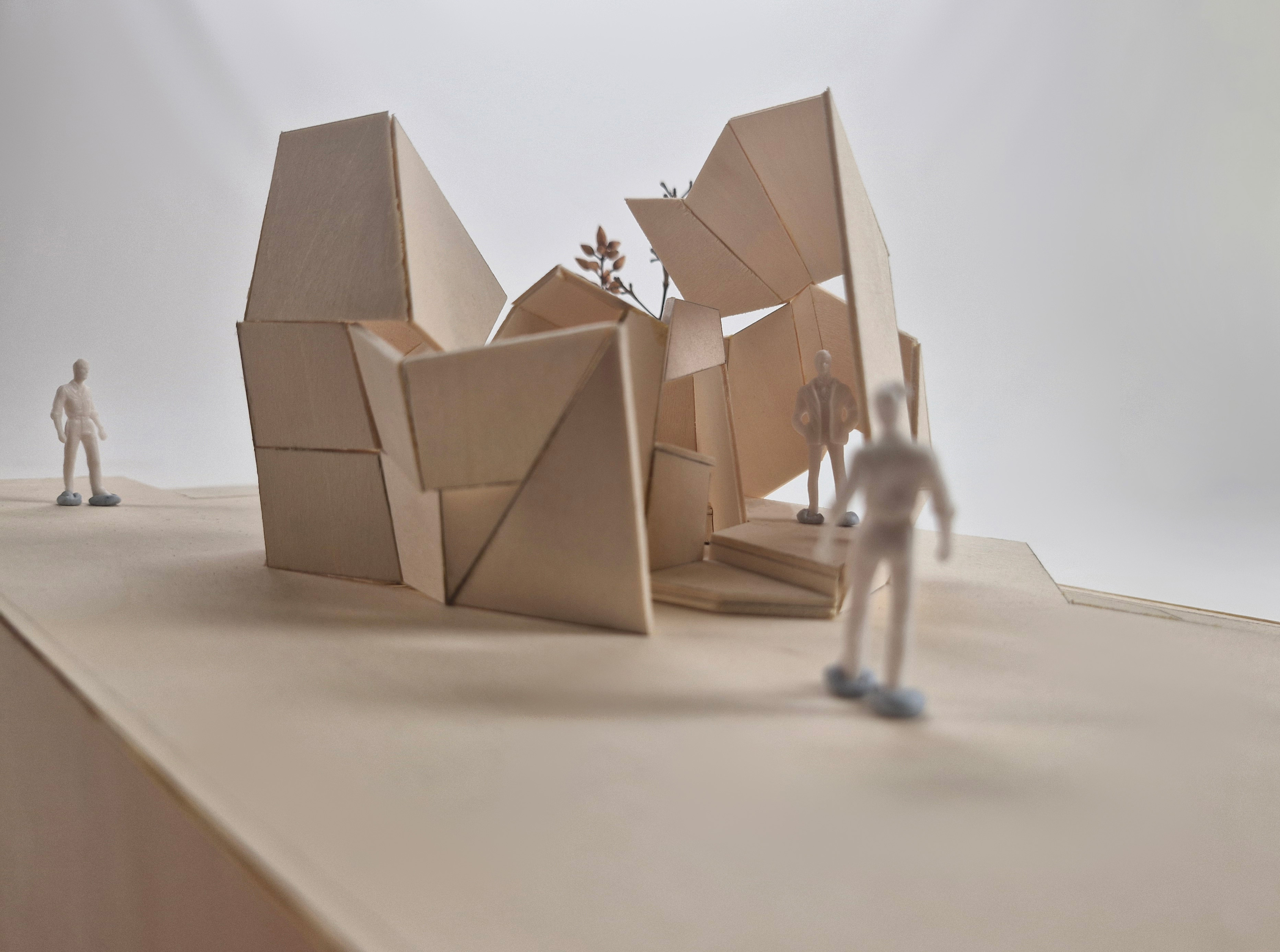 This model is my midterm assignment, themed around "park installations." In addition to focusing on the aesthetic appeal of installation art, I aimed to incorporate practical functionality into the project. As a result, I designed a pavilion as the central concept and included artistic elements to enhance its beauty. For this project, I was inspired by the world-known architect, Zaha Hadid's design concepts of dramatic light, space utilization, fluidity, dynamic spaces, and layering. This concept model features two spatial zones and a single circulation route. As a conceptual design, it is not tailored to any specific user group or intended function. Drawing inspiration from sunlight for this threshold study, I used a flashlight to simulate natural lighting effects on my model. The outcome revealed a fascinating interplay of light and shadow across the form. For this circulation precedent, I explored the idea of fluidity in my design, creating a dynamic connection between the two spaces. This approach draws inspiration from the folding and creasing circulation concept I developed in my previous model. In this threshold study, I began by experimenting with the concept of layering. The model’s walls reflect this idea through a visibly stratified structure. This process illustrates how I developed my design iteratively from the physical model in Assessment 2 to the final iteration. For example, the top view shows how the original two spaces were transformed into three, with additional circulation paths introduced. Furthermore, to make the design resemble a real pavilion, I explored how to add structural thickness to the model. This marks the final stage of my iterative design process. I intentionally set a design deadline to bring the process to a close, which helped me avoid overworking the concept. Stopping at this point also ensured I had sufficient time for fabrication and model-making.