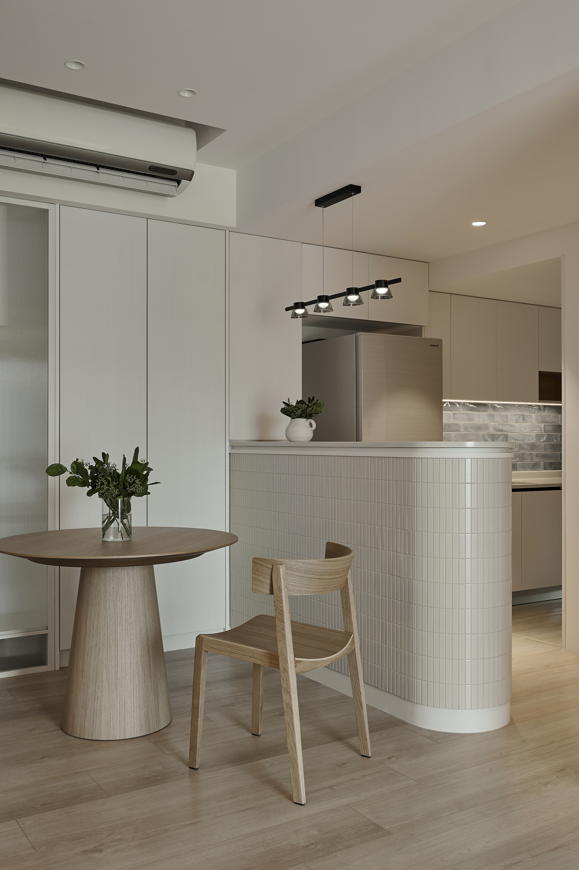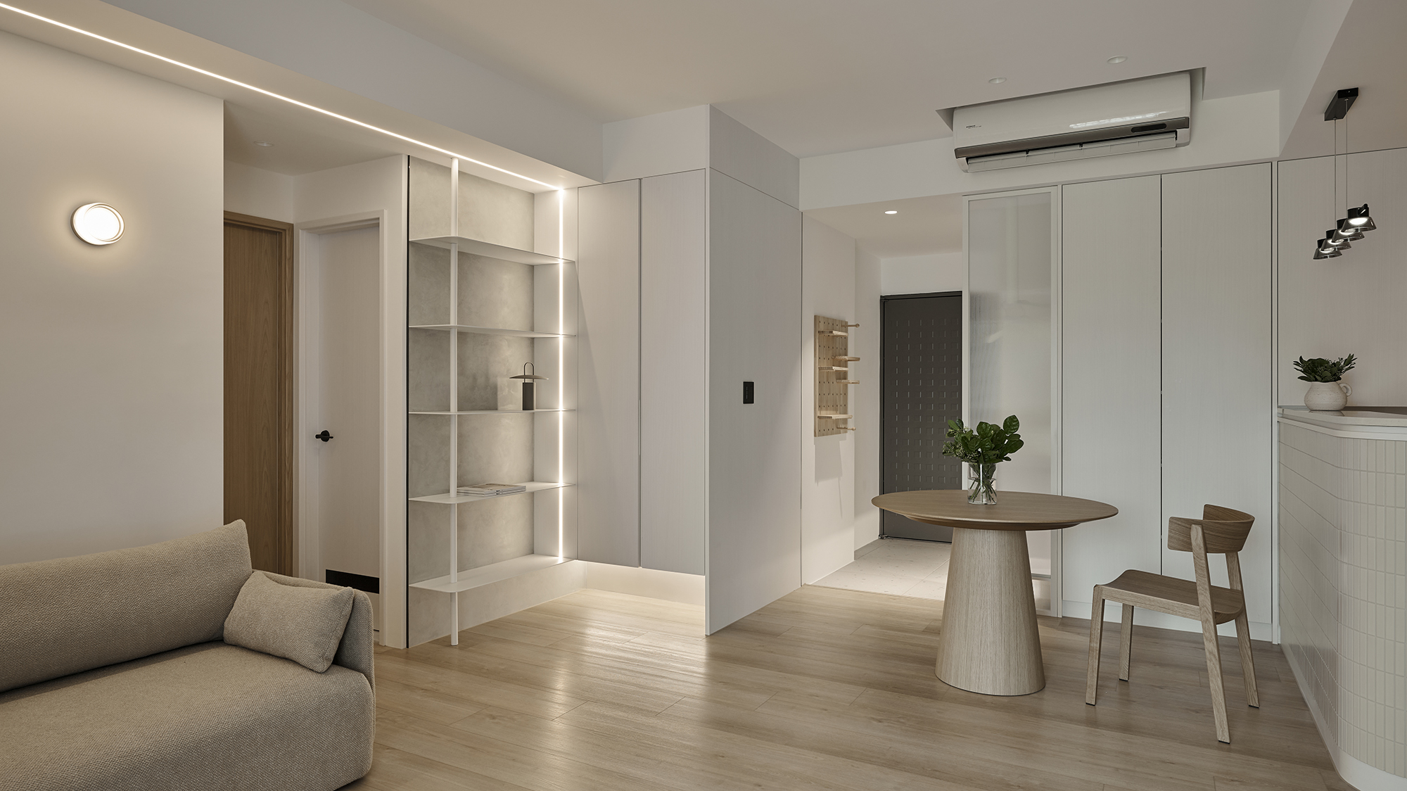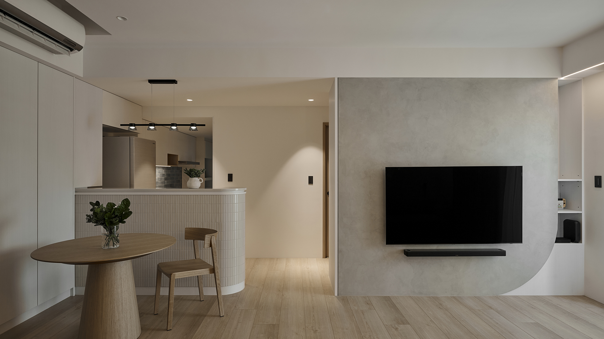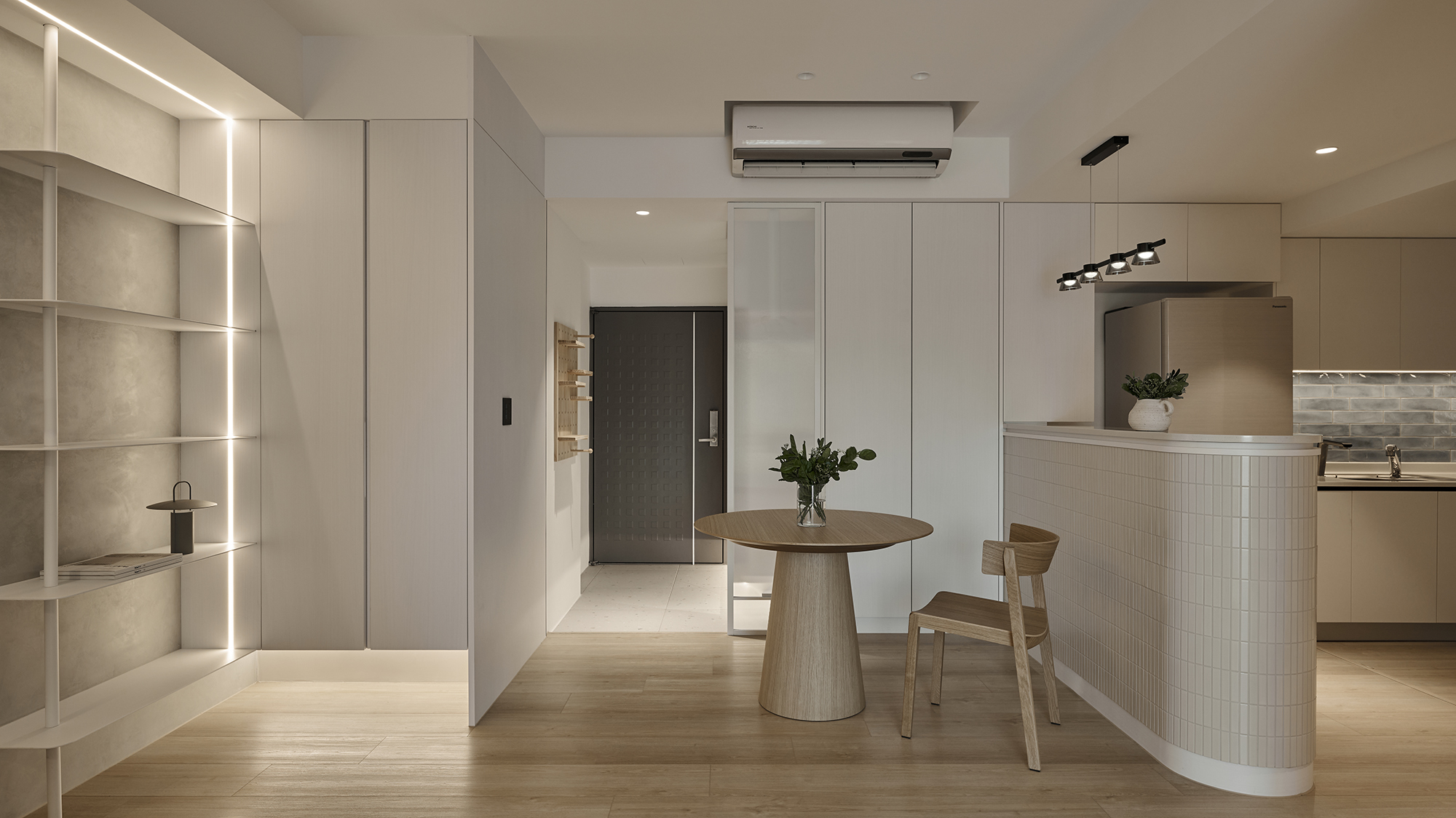 This project focuses on the design of a cozy residential space. By skillfully removing the existing partition walls, the formerly closed layout has been transformed into an open, the designer has created an inviting environment that enhances the flow between various living areas. As a result, natural light can cascade freely throughout the interior, creating a bright and airy atmosphere that promotes a sense of well-being. Furthermore, the design elegantly blends modern Japanese and Nordic aesthetics. This harmonious fusion not only showcases a lifestyle marked by simplicity and tranquility but also fosters the creation of a bright and serene ideal home. Overall, every element has been thoughtfully curated to ensure a seamless transition between spaces, enhancing both functionality and aesthetic appeal. The entryway presents a refreshing departure from traditional screen designs, instead showcasing the breathtaking sky view through expansive floor-to-ceiling windows. This choice invites an open and airy ambiance into the space. Stepping inside, one will notice that a large mirror and a suspended shoe cabinet greet you, while thoughtfully integrated motion-sensing lighting and a stylish coat rack enhance both convenience and a sense of ceremony upon arrival. In the common area, the living room, dining room, and kitchen converge in a harmonious design. A raised bar counter serves as an elegant divider, clearly defining the functional zones while providing a stylish focal point. This bar area is illuminated by beautiful pendant lights that cast a soft, subdued glow, further extending the visual openness and inviting relaxation. Moreover, the living room boasts a sophisticated TV wall featuring a double-sided cabinet design. While the front maintains a sleek and uncluttered aesthetic, the back cleverly incorporates ample storage, marrying form and function with grace.