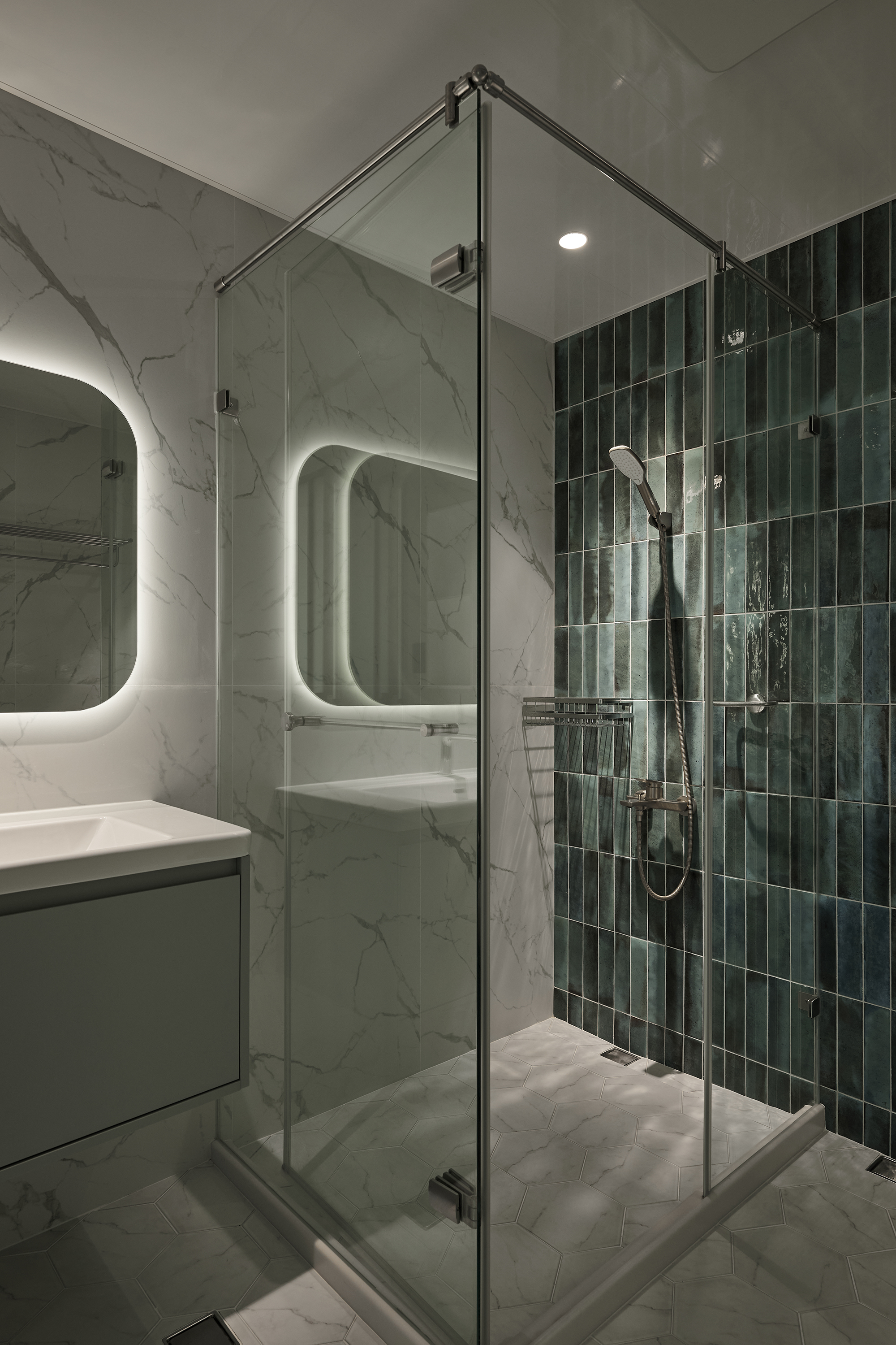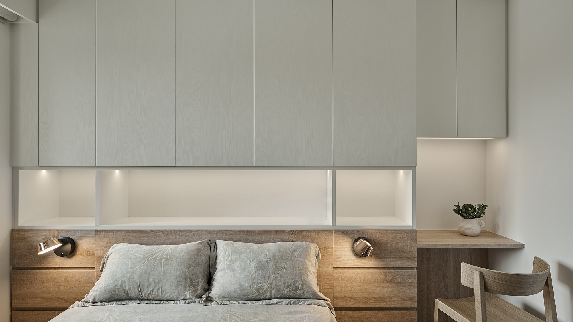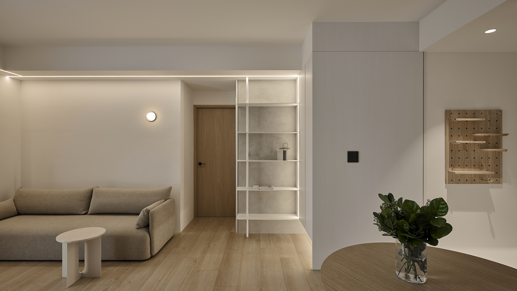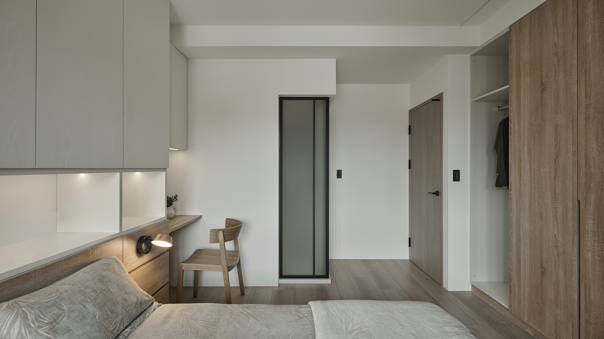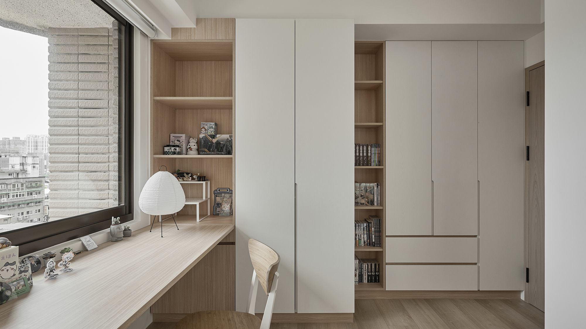 This project focuses on the design of a cozy residential space. By skillfully removing the existing partition walls, the formerly closed layout has been transformed into an open, the designer has created an inviting environment that enhances the flow between various living areas. As a result, natural light can cascade freely throughout the interior, creating a bright and airy atmosphere that promotes a sense of well-being. Furthermore, the design elegantly blends modern Japanese and Nordic aesthetics. This harmonious fusion not only showcases a lifestyle marked by simplicity and tranquility but also fosters the creation of a bright and serene ideal home. Overall, every element has been thoughtfully curated to ensure a seamless transition between spaces, enhancing both functionality and aesthetic appeal. The entryway presents a refreshing departure from traditional screen designs, instead showcasing the breathtaking sky view through expansive floor-to-ceiling windows. This choice invites an open and airy ambiance into the space. Stepping inside, one will notice that a large mirror and a suspended shoe cabinet greet you, while thoughtfully integrated motion-sensing lighting and a stylish coat rack enhance both convenience and a sense of ceremony upon arrival. In the common area, the living room, dining room, and kitchen converge in a harmonious design. A raised bar counter serves as an elegant divider, clearly defining the functional zones while providing a stylish focal point. This bar area is illuminated by beautiful pendant lights that cast a soft, subdued glow, further extending the visual openness and inviting relaxation. Moreover, the living room boasts a sophisticated TV wall featuring a double-sided cabinet design. While the front maintains a sleek and uncluttered aesthetic, the back cleverly incorporates ample storage, marrying form and function with grace.