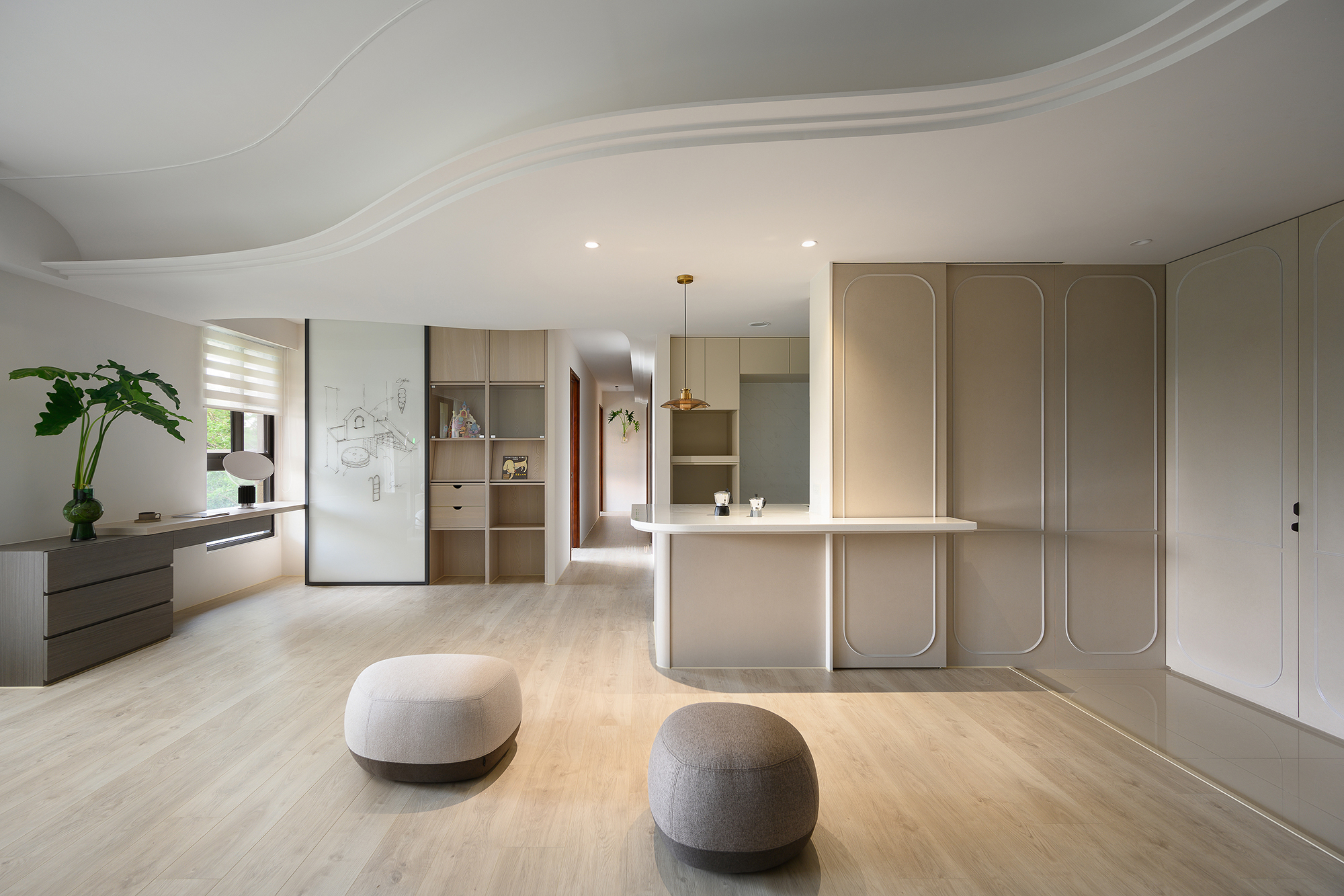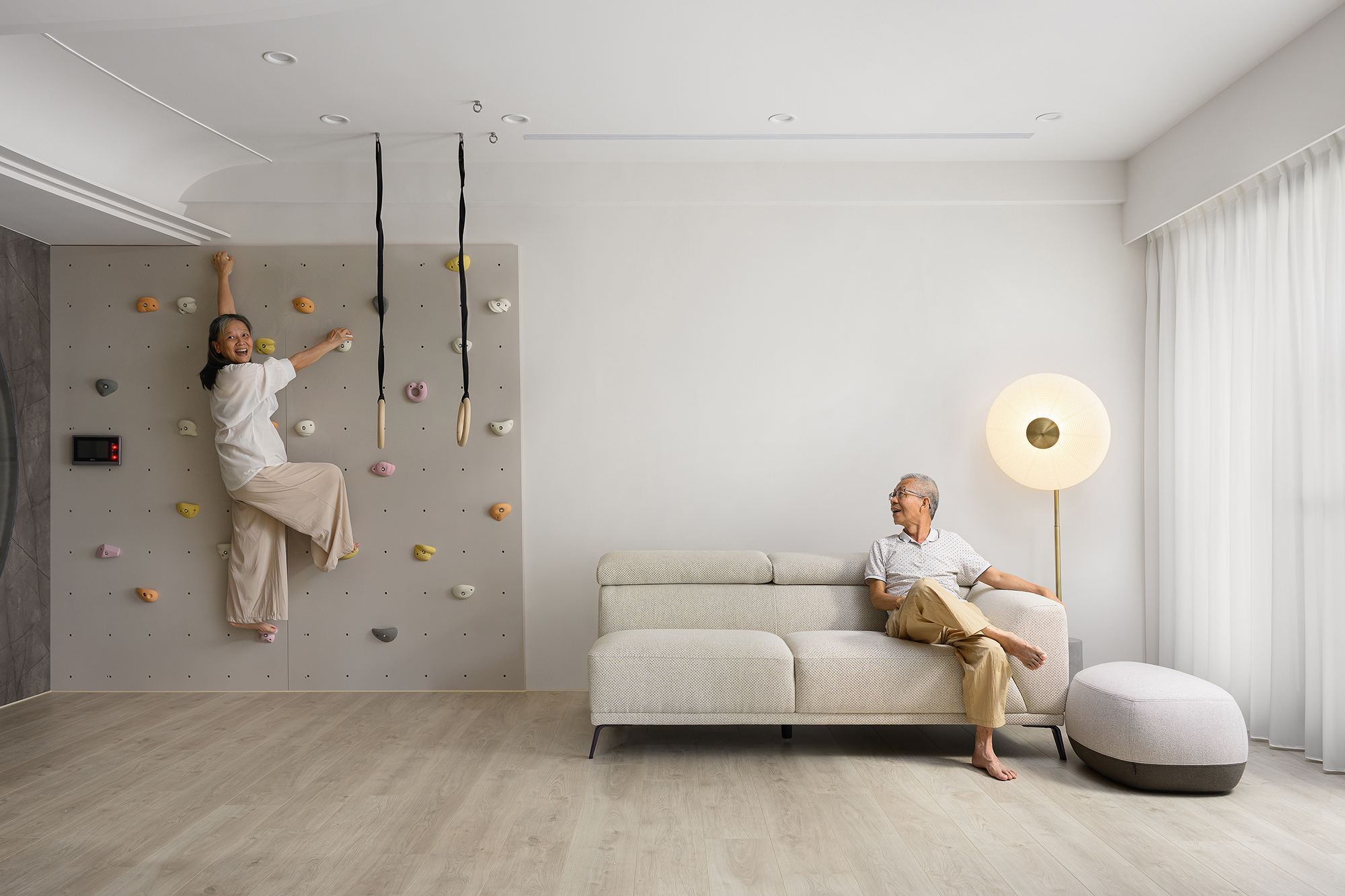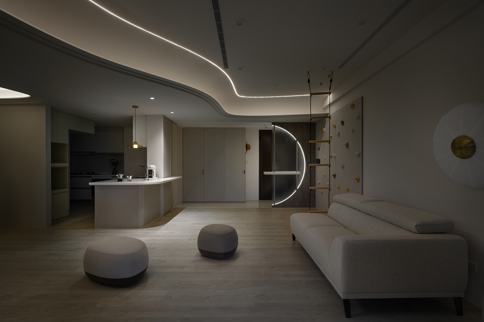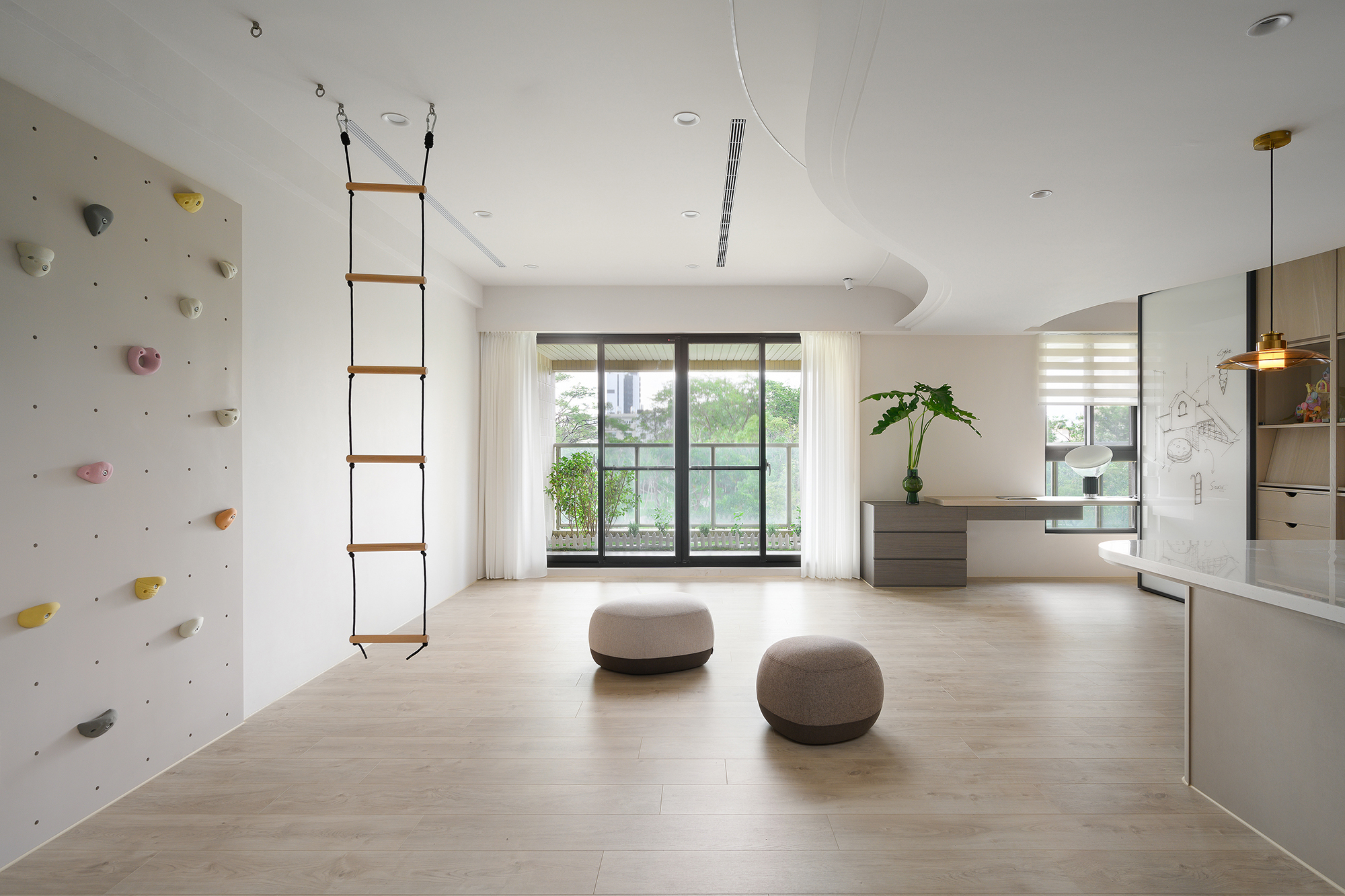 This thoughtfully designed interior project showcases a harmonious layout featuring three bedrooms and two inviting living rooms, expertly crafted to accommodate the vibrant daily lives of three generations living together under one roof. At the heart of this design are soft, misty sand tones, beautifully complemented by crisp white and light gray hues. This palette not only creates a warm and inviting atmosphere but also reflects the intimate and cozy lifestyle cherished by the family. Furthermore, the design team has skillfully incorporated strategically placed window arrangements, which serve to enhance natural light and promote a refreshing flow of air throughout the space. As a result, each room is infused with a lively and invigorating ambiance that uplifts the spirit. Moreover, clean lines and gracefully curved elements are seamlessly interwoven into the design, establishing a minimalist yet warmly inviting living environment. This thoughtful approach allows the residents to fully appreciate the beauty and comfort of shared living, fostering cherished moments and lasting connections every day. The public area has been thoughtfully designed to accommodate a wide range of lifestyle needs, boasting a vibrant rock-climbing wall, an adventurous climbing ladder, and playful monkey bars that collectively create a delightful playground paradise for children. Furthermore, a dedicated white wall fosters creativity, allowing residents to effortlessly transform the space into a movie-watching or relaxation area, depending on their desires. This adaptability not only enhances the functionality of the space but also enriches precious family bonding moments. In addition to these features, the design team has skillfully integrated cabinet doors adorned with whiteboard surfaces, providing children with an interactive canvas to express their creativity. This feature adds an engaging element of fun while also serving practical purposes.