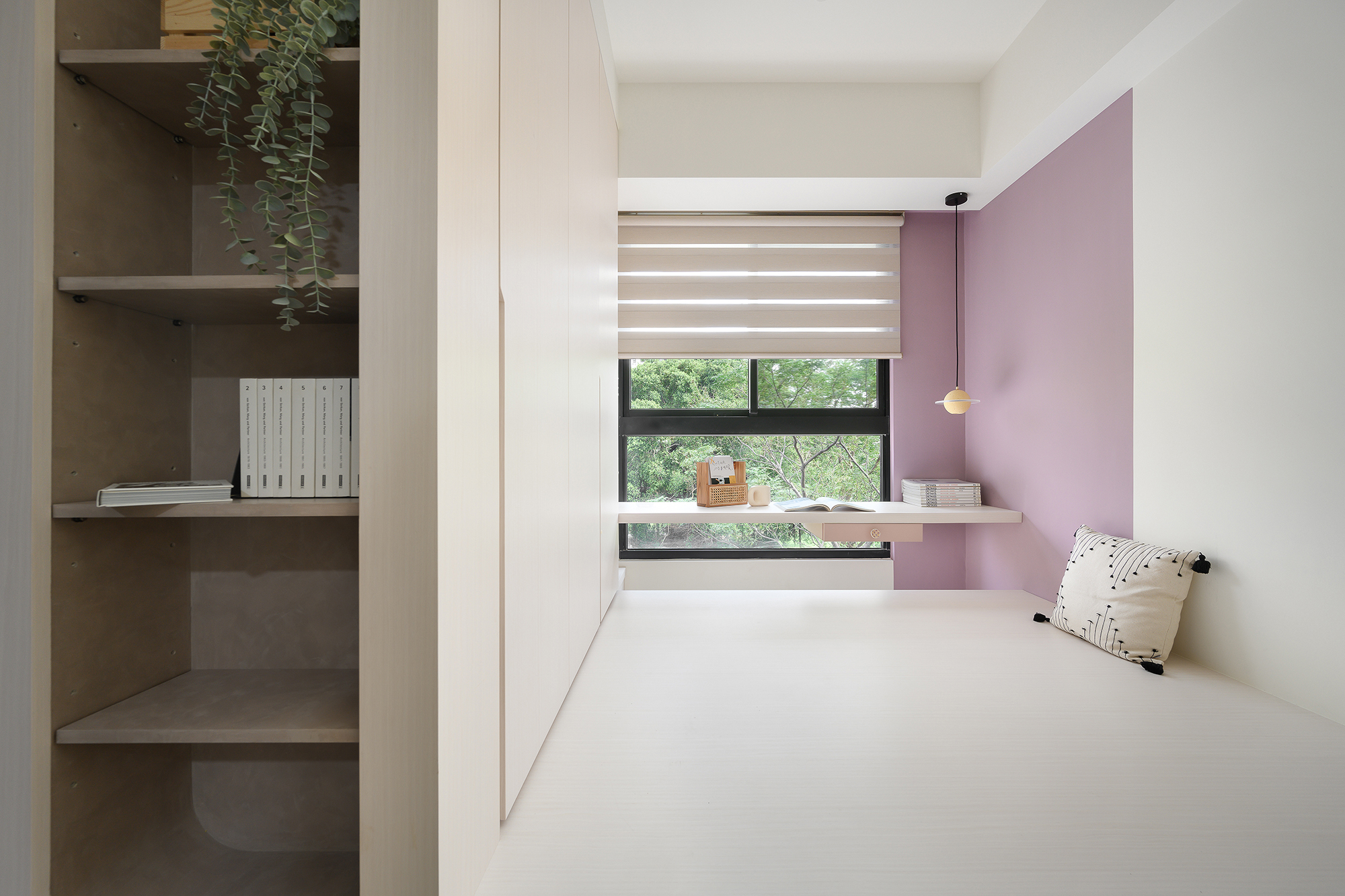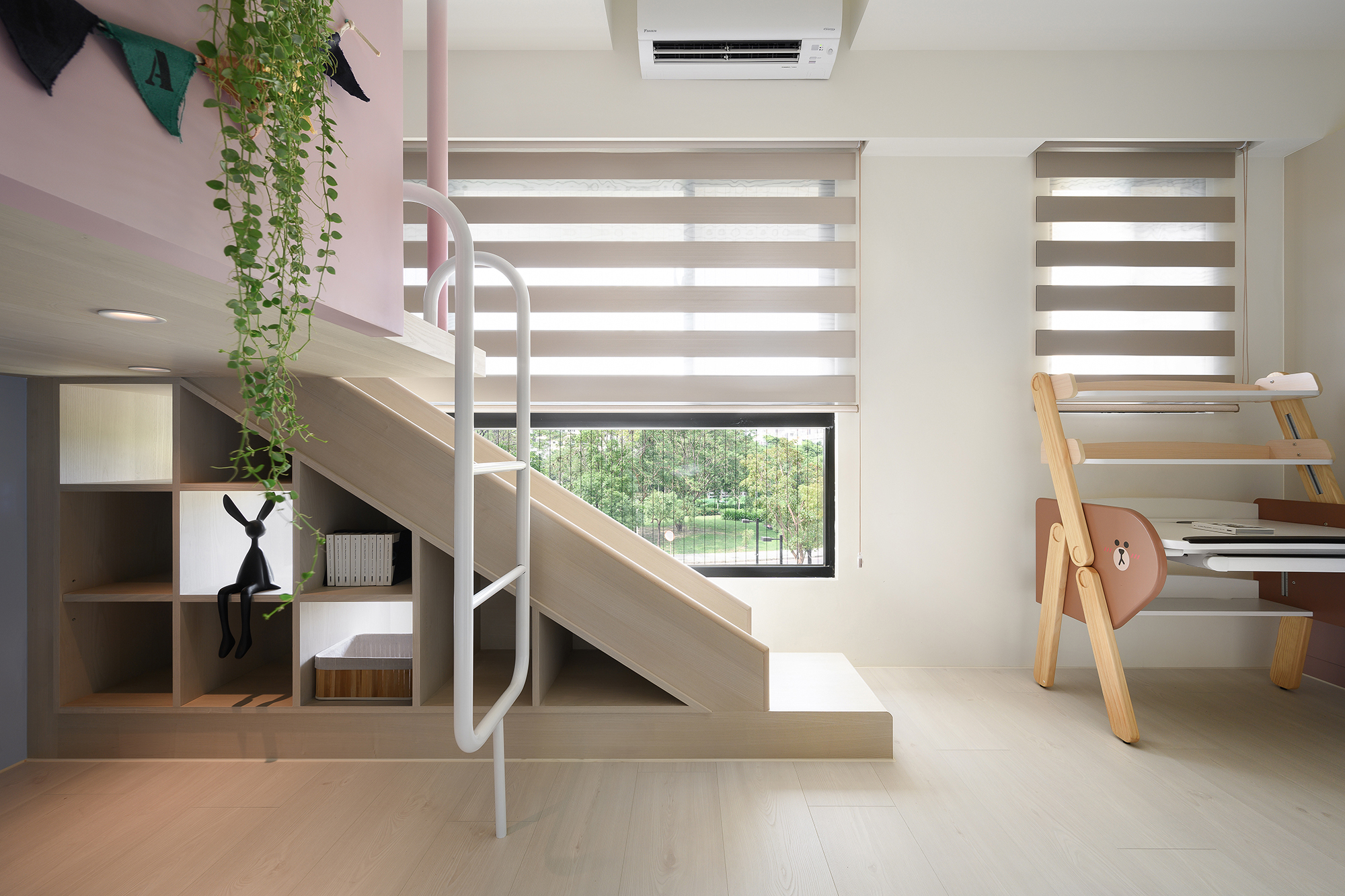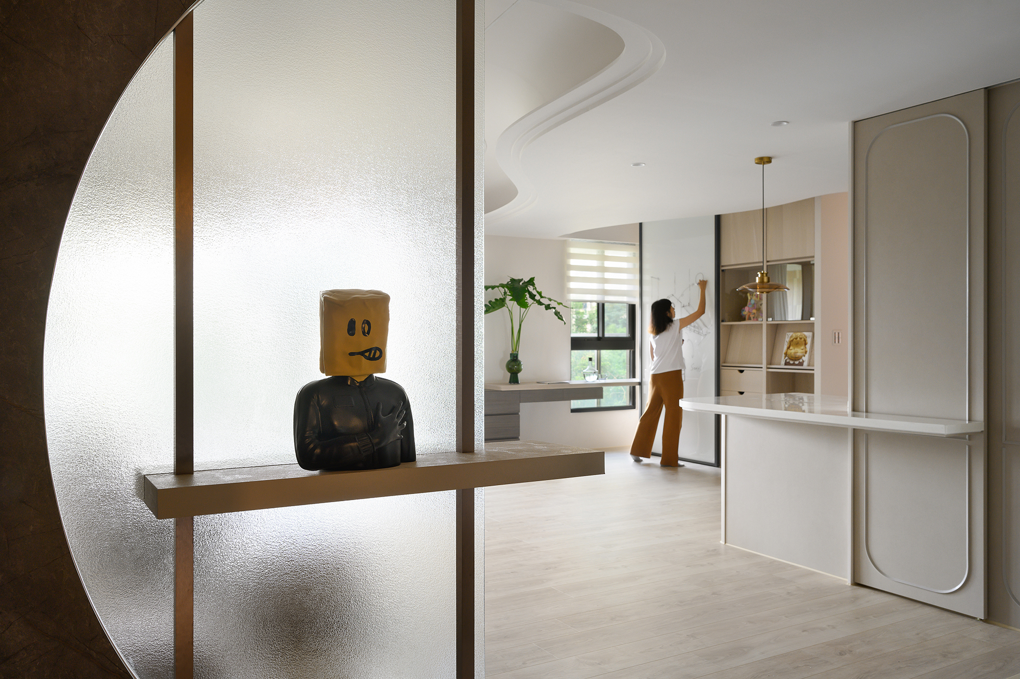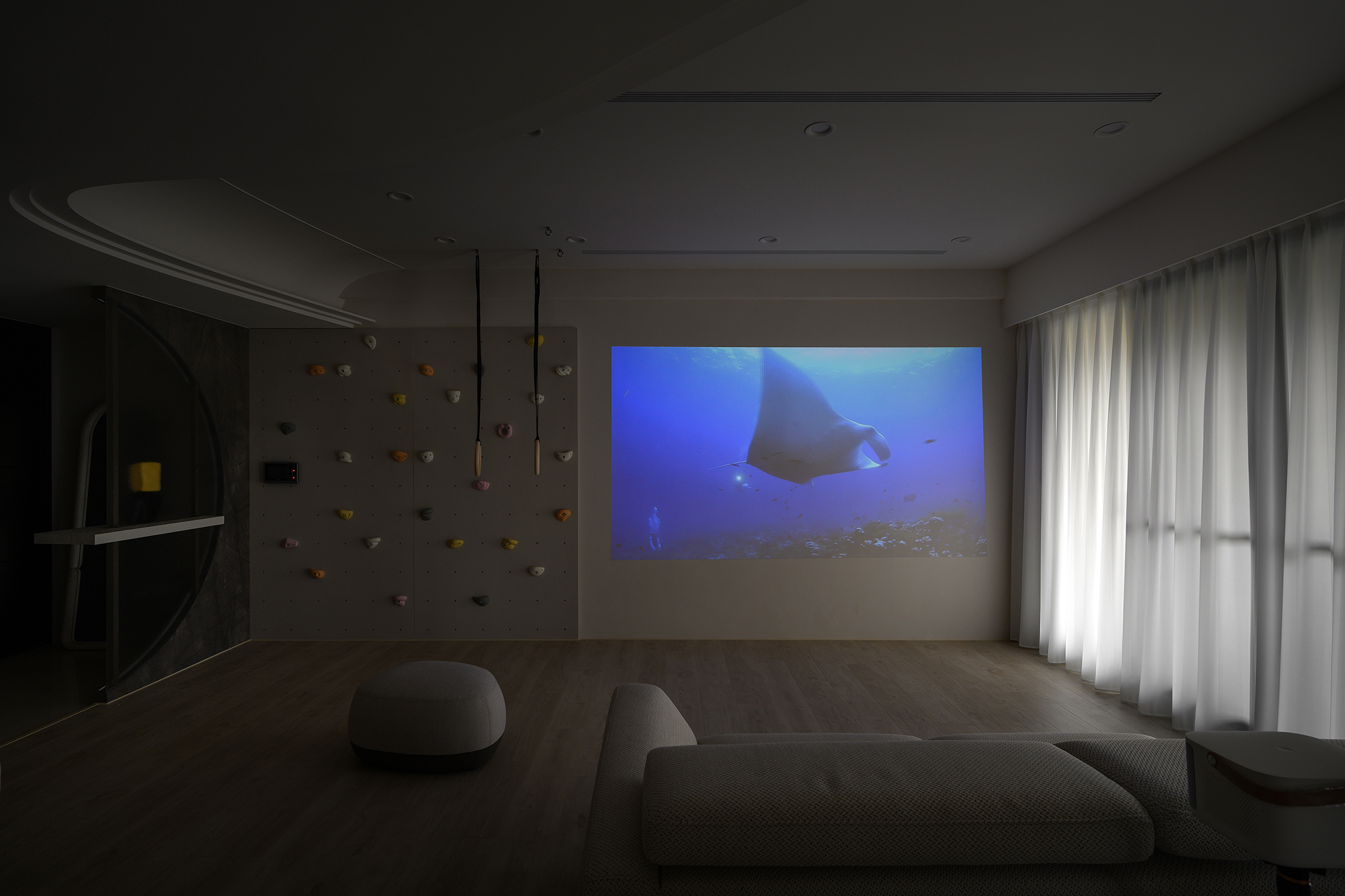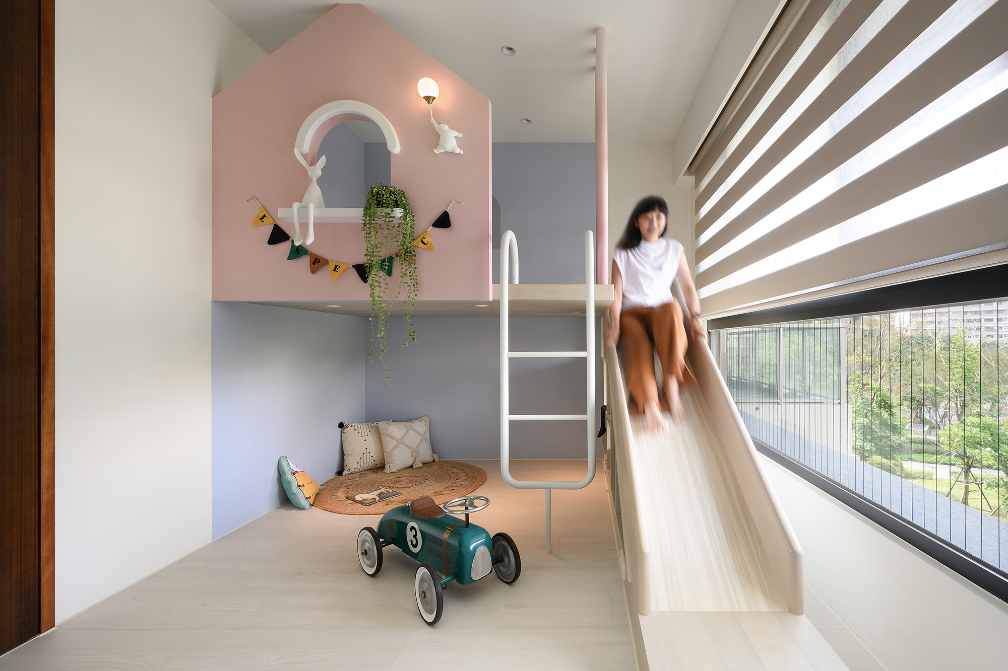This thoughtfully designed interior project showcases a harmonious layout featuring three bedrooms and two inviting living rooms, expertly crafted to accommodate the vibrant daily lives of three generations living together under one roof. At the heart of this design are soft, misty sand tones, beautifully complemented by crisp white and light gray hues. This palette not only creates a warm and inviting atmosphere but also reflects the intimate and cozy lifestyle cherished by the family. Furthermore, the design team has skillfully incorporated strategically placed window arrangements, which serve to enhance natural light and promote a refreshing flow of air throughout the space. As a result, each room is infused with a lively and invigorating ambiance that uplifts the spirit. Moreover, clean lines and gracefully curved elements are seamlessly interwoven into the design, establishing a minimalist yet warmly inviting living environment. This thoughtful approach allows the residents to fully appreciate the beauty and comfort of shared living, fostering cherished moments and lasting connections every day. The public area has been thoughtfully designed to accommodate a wide range of lifestyle needs, boasting a vibrant rock-climbing wall, an adventurous climbing ladder, and playful monkey bars that collectively create a delightful playground paradise for children. Furthermore, a dedicated white wall fosters creativity, allowing residents to effortlessly transform the space into a movie-watching or relaxation area, depending on their desires. This adaptability not only enhances the functionality of the space but also enriches precious family bonding moments. In addition to these features, the design team has skillfully integrated cabinet doors adorned with whiteboard surfaces, providing children with an interactive canvas to express their creativity. This feature adds an engaging element of fun while also serving practical purposes.