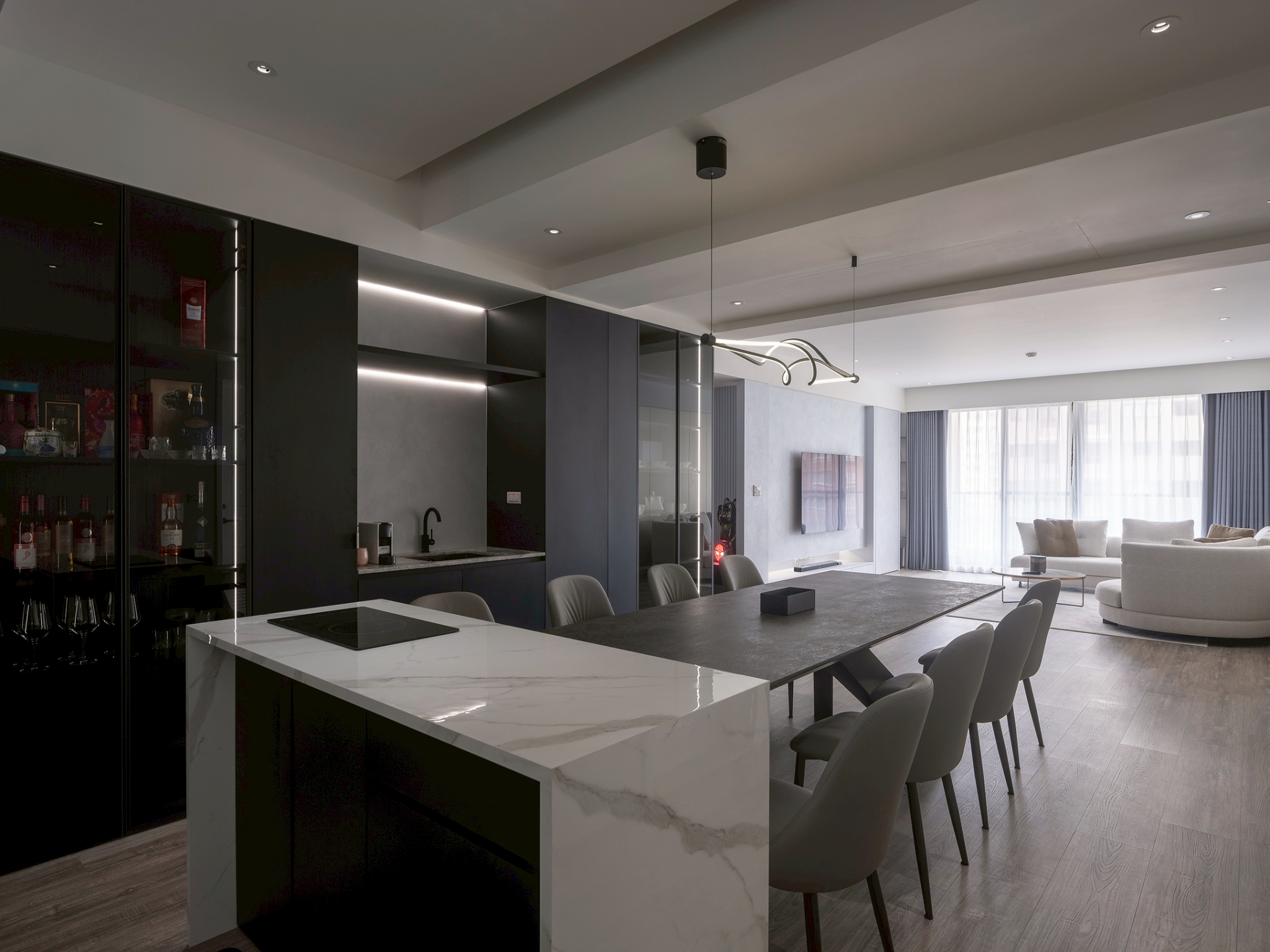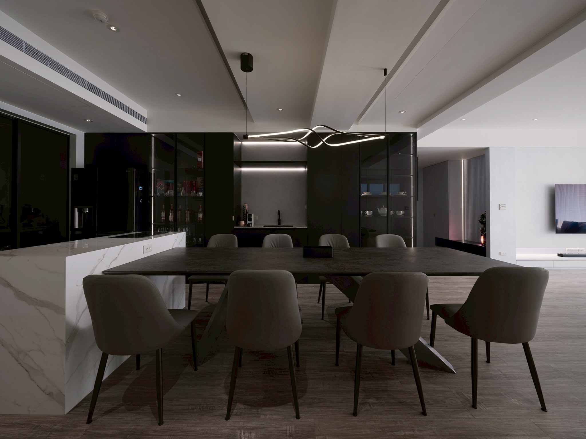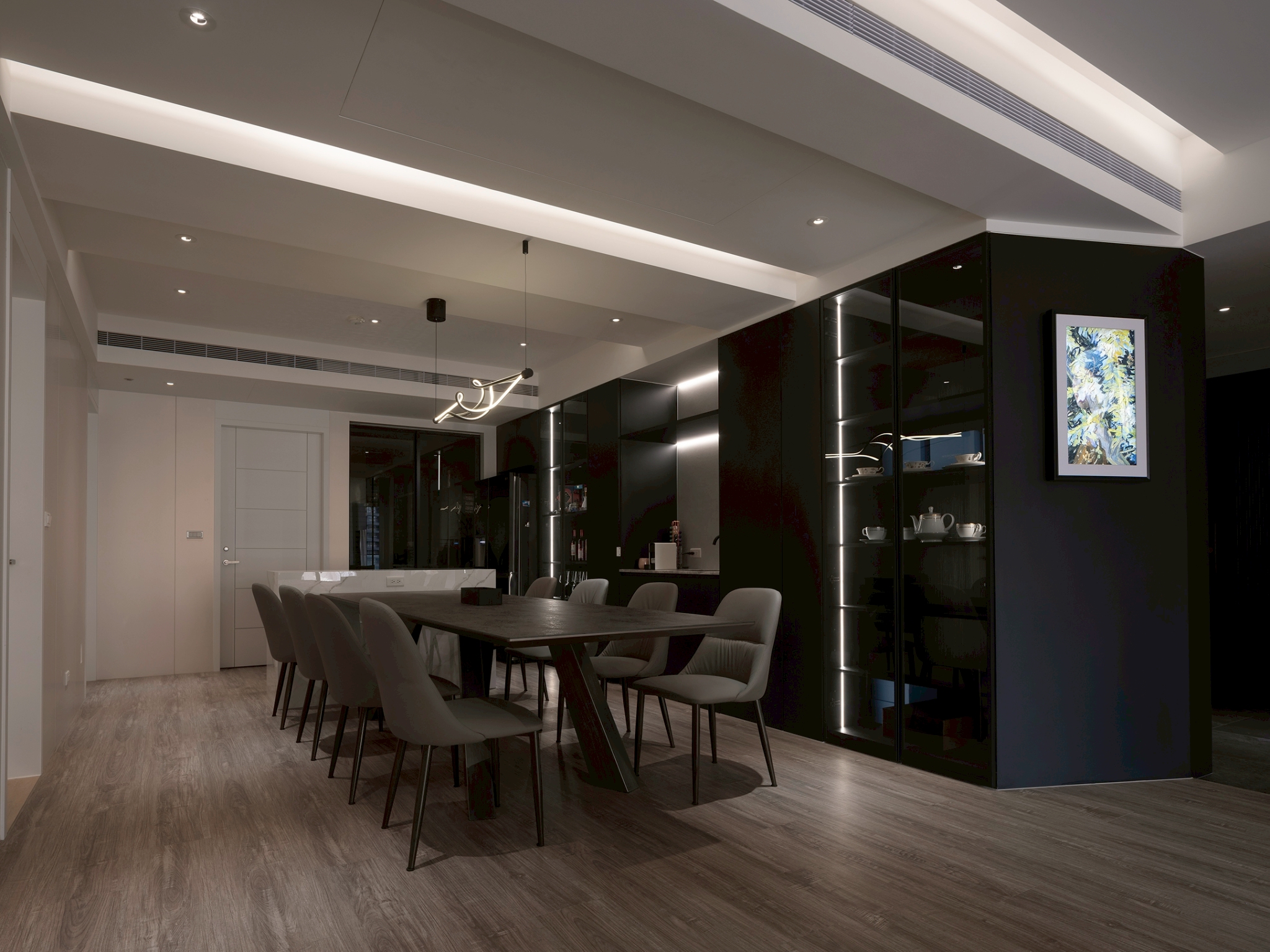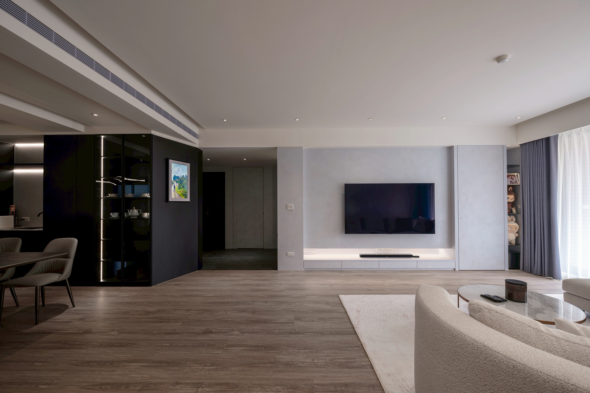 This single-story residential design features a monochromatic color scheme with varying shades, creating a rich spatial hierarchy that results in a calm and comfortable living environment. It is tailored to the preferences and diverse needs of a second-generation homeowner, constructing a living space that aligns with their personality and international background. The overall design adopts a clean and modern aesthetic, eliminating unnecessary ornamentation to emphasize quality and elegance. This approach reflects the understated and refined lifestyle of the young residents. The layout prioritizes smooth traffic flow and visual continuity while balancing privacy and openness. In terms of details, the design focuses on a luxurious yet understated finish, creating a space that harmoniously blends comfort and functionality. This achieves a perfect balance between practicality and aesthetic appeal. The layout design commences at the entrance, where a beautifully sloped shoe cabinet elegantly integrates with the structural columns, establishing a welcoming and private entryway. As one steps into the home, they are greeted by an expansive open-plan living and dining area, thoughtfully combined with a well-appointed study. Here, distinctive ceiling and wall details not only delineate the various spaces but also enhance the overall ambiance, creating an open and airy feel that invites relaxation and conversation. In the study, which is located just behind the TV wall, one discovers a dedicated entertainment zone accentuated by innovative RGB lighting that adapts to various moods and activities. Furthermore, the entrance to the master bedroom has been thoughtfully redesigned to optimize wardrobe space, ensuring ample room for personal belongings. In the dining area, the kitchen features an impressive 300-centimeter-long table connected to a functional island. This arrangement beautifully accommodates both the intimate gathering of friends and family as well as the demands of everyday living.
