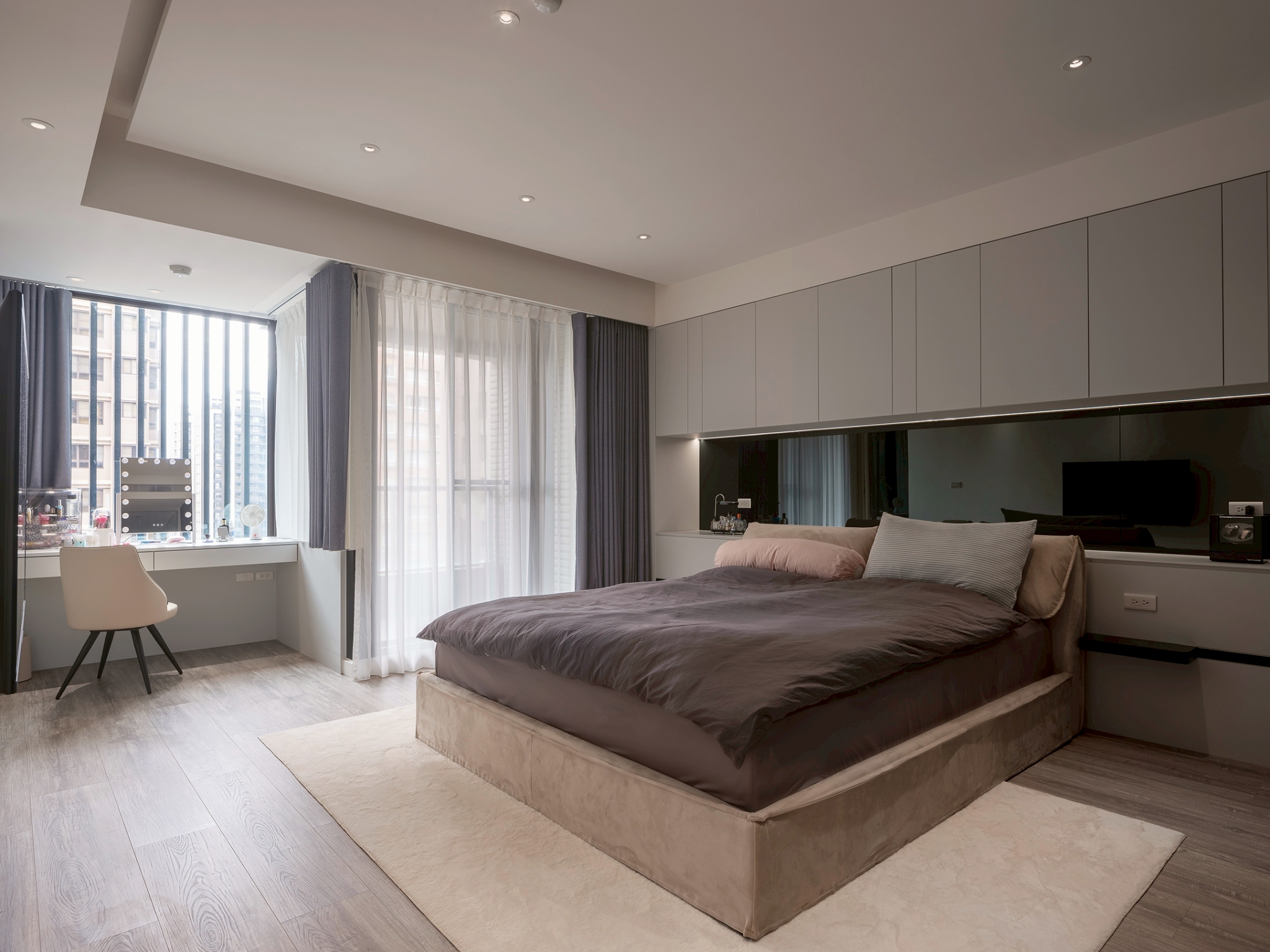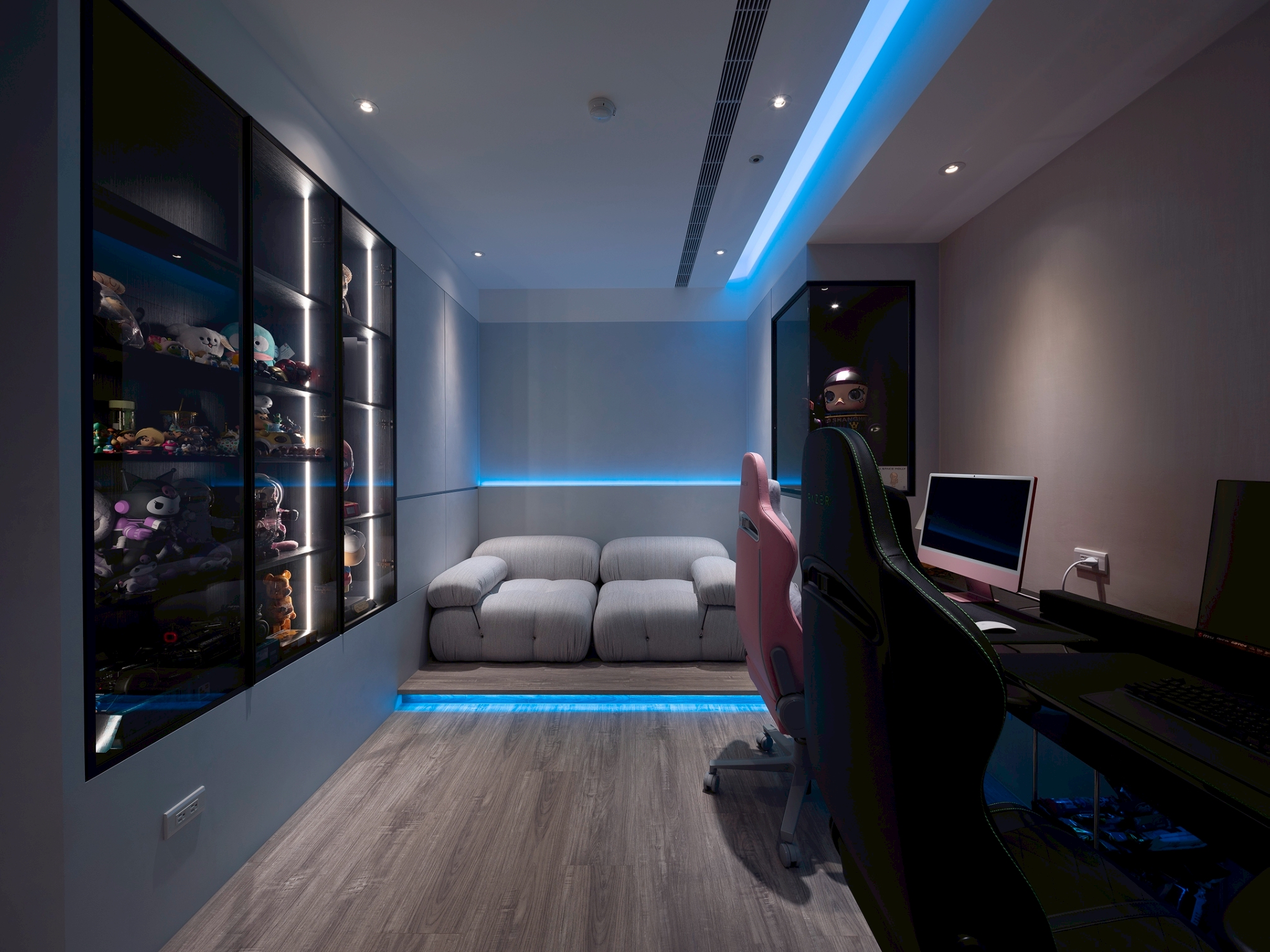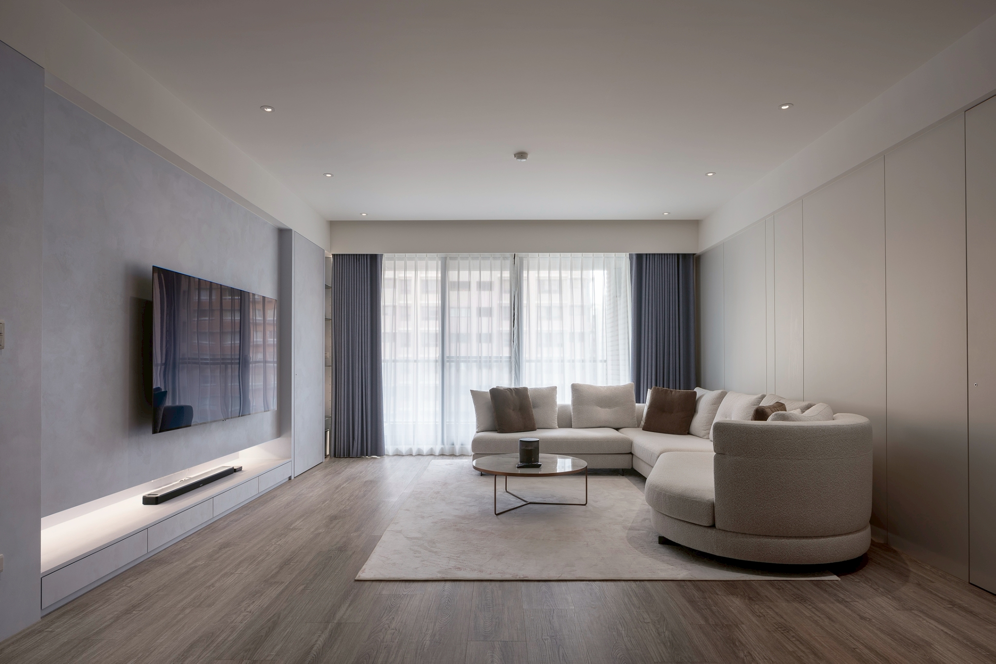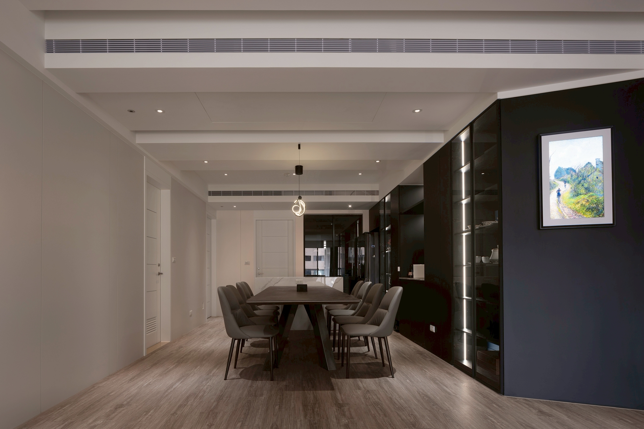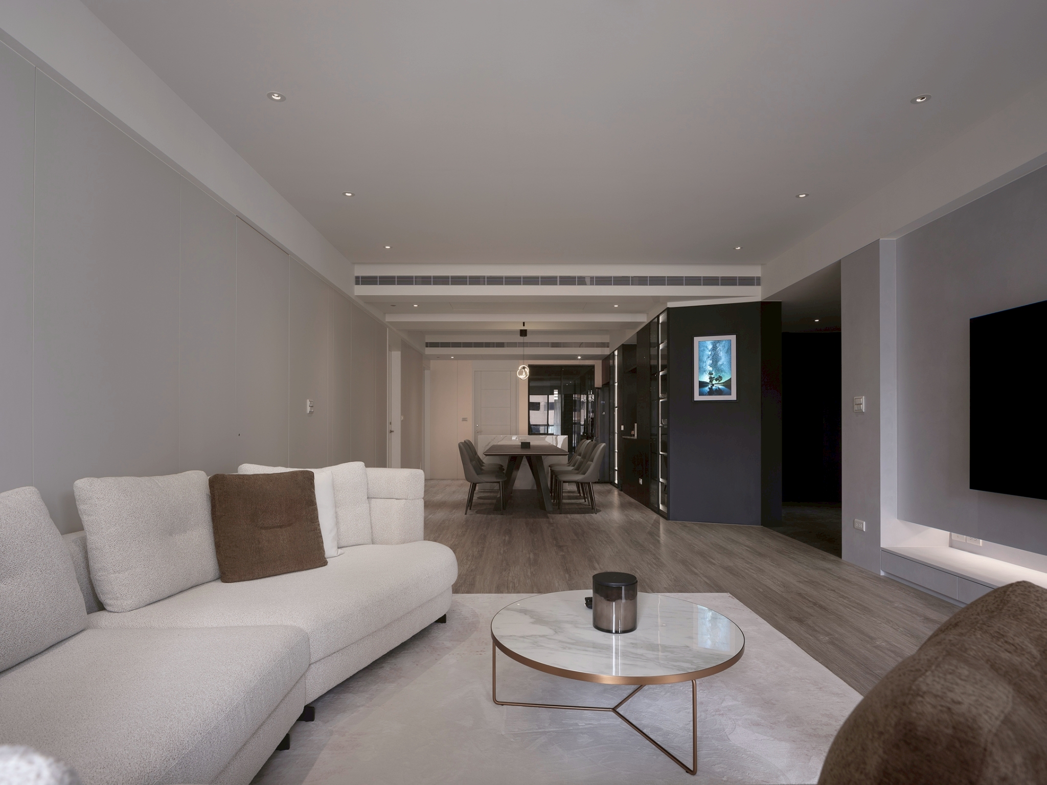 This single-story residential design features a monochromatic color scheme with varying shades, creating a rich spatial hierarchy that results in a calm and comfortable living environment. It is tailored to the preferences and diverse needs of a second-generation homeowner, constructing a living space that aligns with their personality and international background. The overall design adopts a clean and modern aesthetic, eliminating unnecessary ornamentation to emphasize quality and elegance. This approach reflects the understated and refined lifestyle of the young residents. The layout prioritizes smooth traffic flow and visual continuity while balancing privacy and openness. In terms of details, the design focuses on a luxurious yet understated finish, creating a space that harmoniously blends comfort and functionality. This achieves a perfect balance between practicality and aesthetic appeal. The layout design commences at the entrance, where a beautifully sloped shoe cabinet elegantly integrates with the structural columns, establishing a welcoming and private entryway. As one steps into the home, they are greeted by an expansive open-plan living and dining area, thoughtfully combined with a well-appointed study. Here, distinctive ceiling and wall details not only delineate the various spaces but also enhance the overall ambiance, creating an open and airy feel that invites relaxation and conversation. In the study, which is located just behind the TV wall, one discovers a dedicated entertainment zone accentuated by innovative RGB lighting that adapts to various moods and activities. Furthermore, the entrance to the master bedroom has been thoughtfully redesigned to optimize wardrobe space, ensuring ample room for personal belongings. In the dining area, the kitchen features an impressive 300-centimeter-long table connected to a functional island. This arrangement beautifully accommodates both the intimate gathering of friends and family as well as the demands of everyday living.