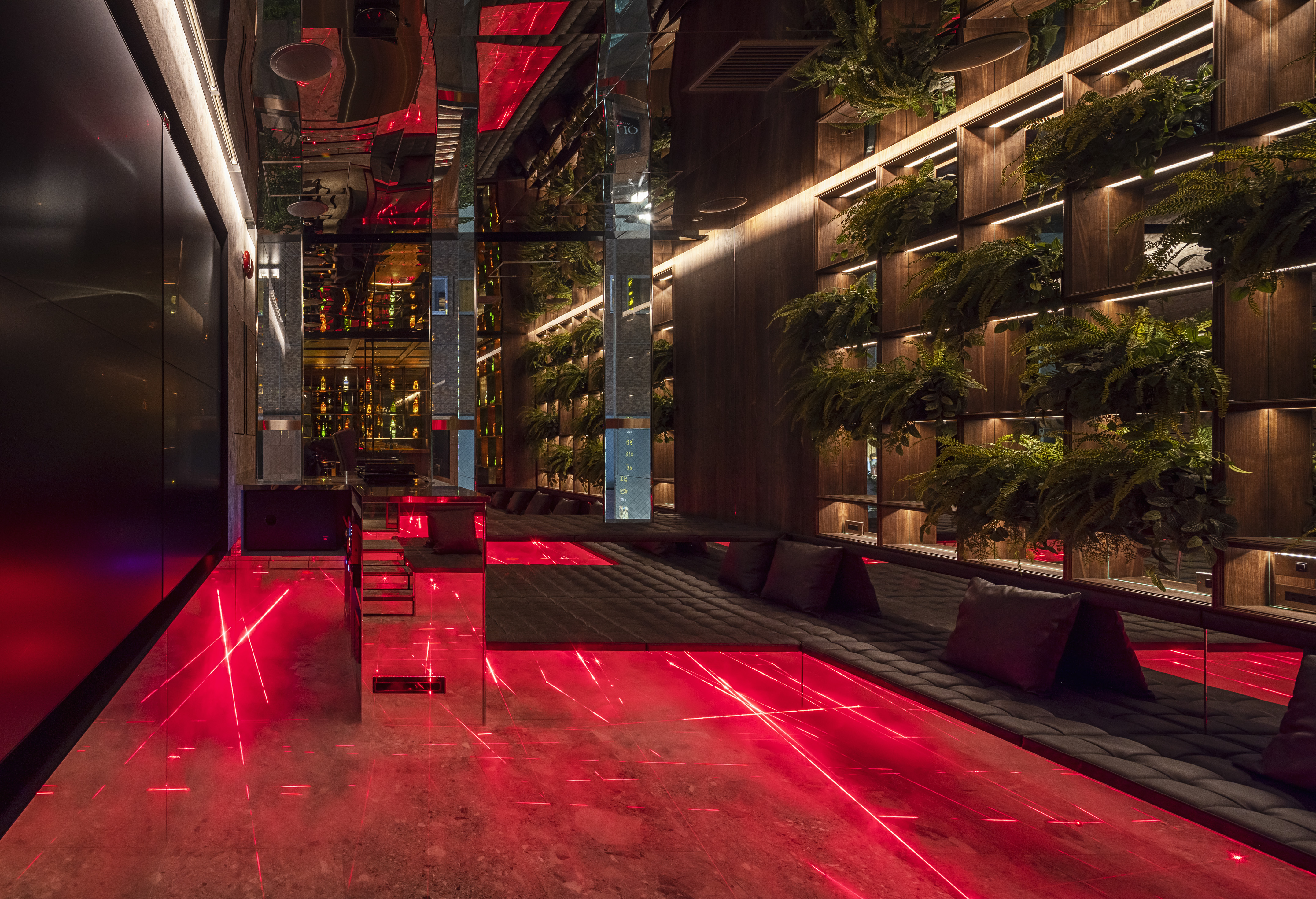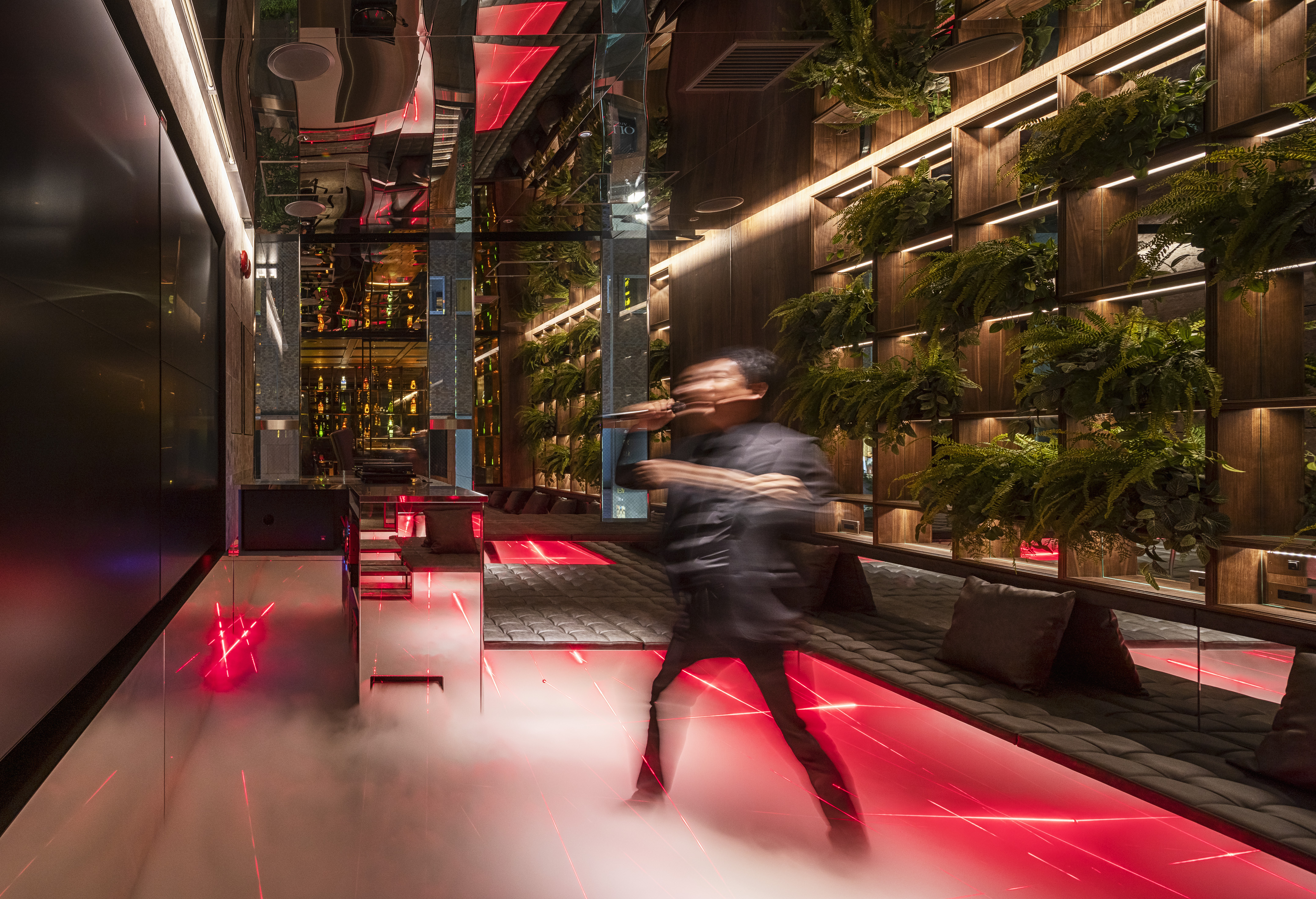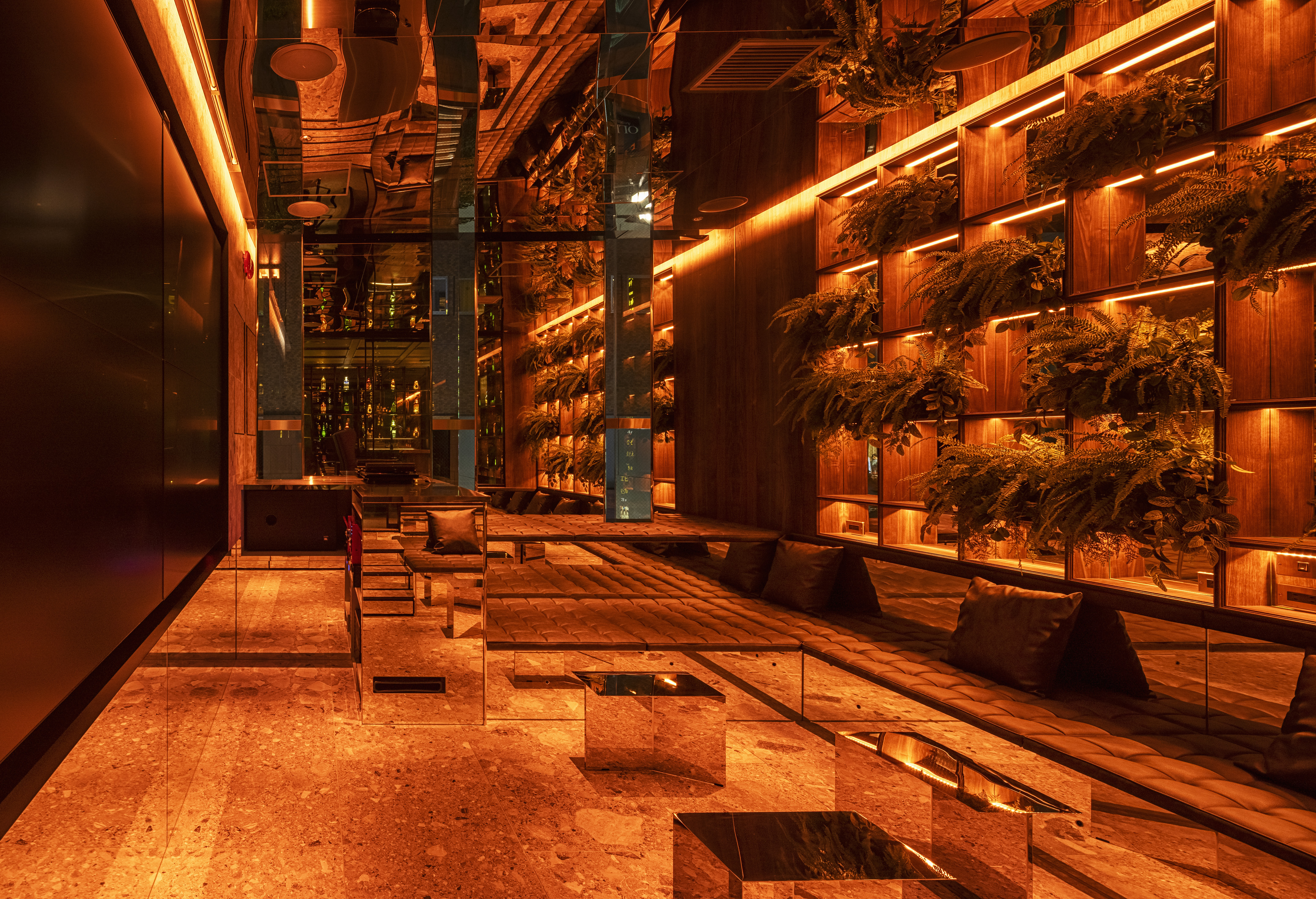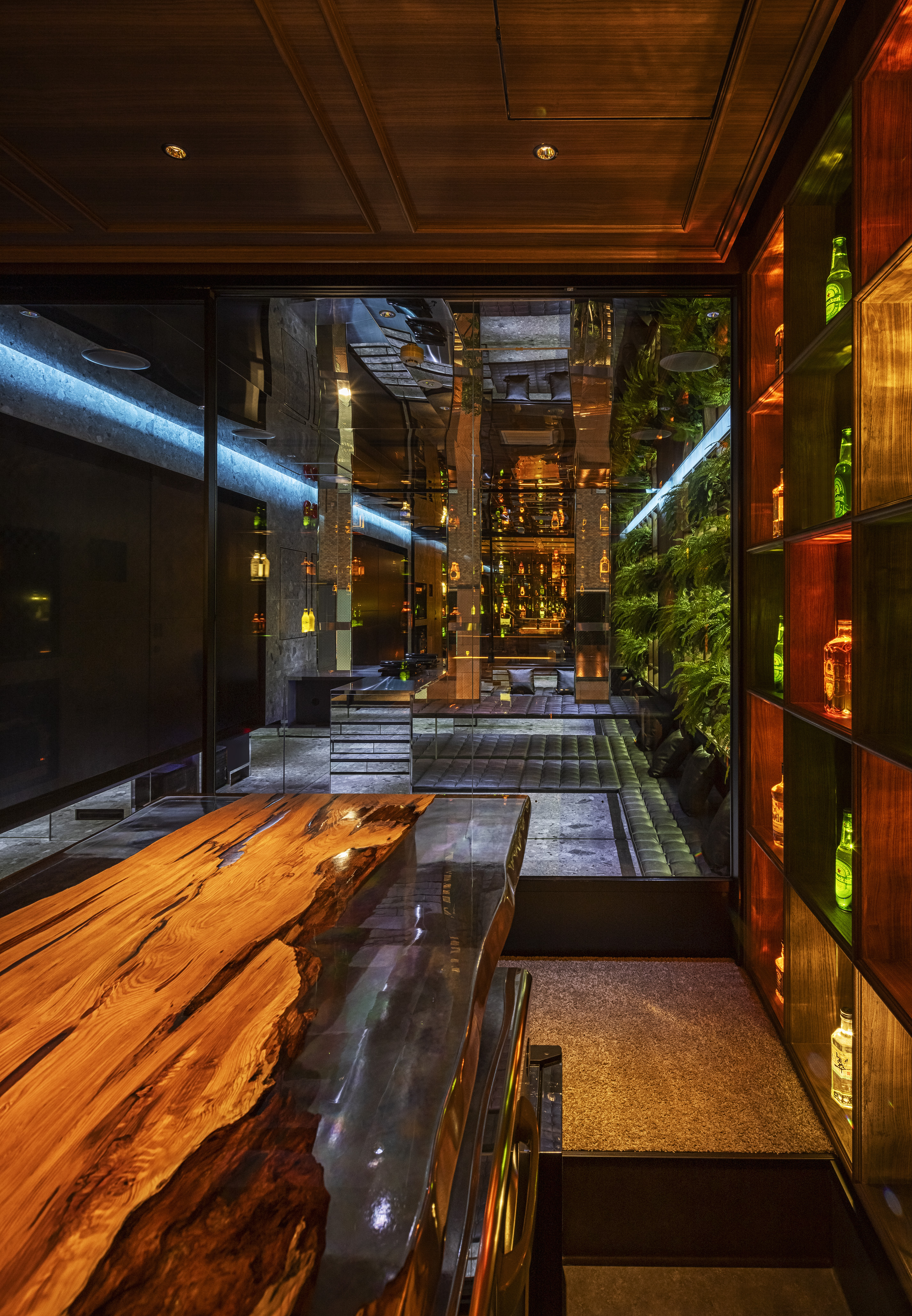 ”a discotheque” The space is located at the end of the passageway that is lined up with various clubs in Ginza Namiki-dori, one of Japan’s most famous bustling downtown areas. The etymology of the word ‘disco’ is French word ‘discotheque’, which in Marseille dialect means ‘a record storehouse’. In this way, we can understand the following word correlation : ‘record – disque’, ‘library – biblioteque’. Therefore, in order to create client’s own ‘playground’, we came up with the idea to design a library space that brings together people and client’s favourite things – objects that are important to him. In reality, at the end of the hallway leading to client’s space there is a wall that can be open and closed only by client’s mobile phone. Once you step inside, you can see the alcohol bottles that become a lighting fixture illuminating the entire space. The counter is made of 1000 years old Yakushima cedar tree, and it is a space where one can enjoy a drink sitting on the comfortable sofas. At the back there is a karaoke room where one can immerse themselves in an extraordinary space emphasised by the light and sound. Smoke rises from beneath the feet and infrared rays are reflected endlessly – this plays a significant role in creating an outstanding karaoke space. Having said that, we hope this place will fulfill the playful spirit of adults.