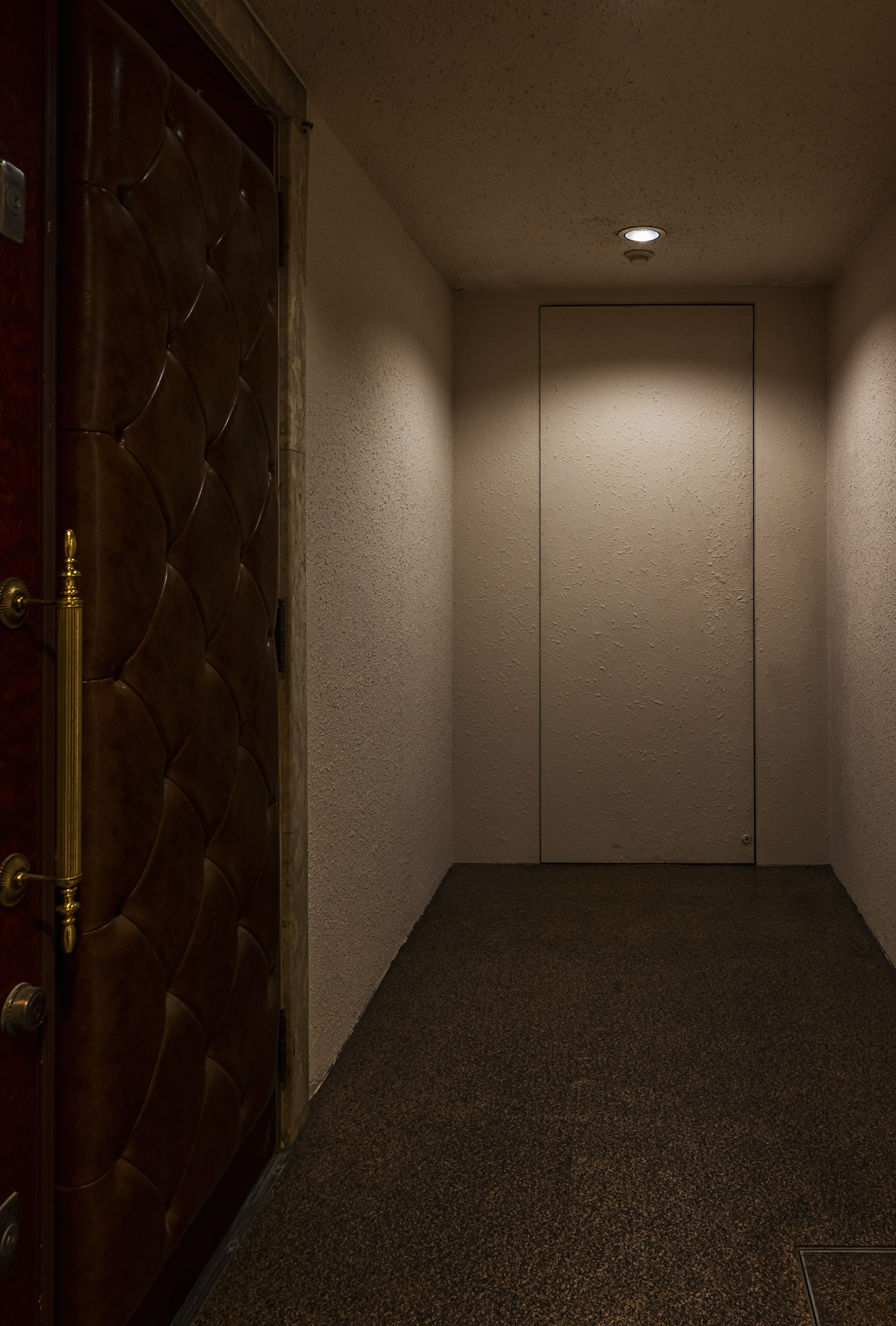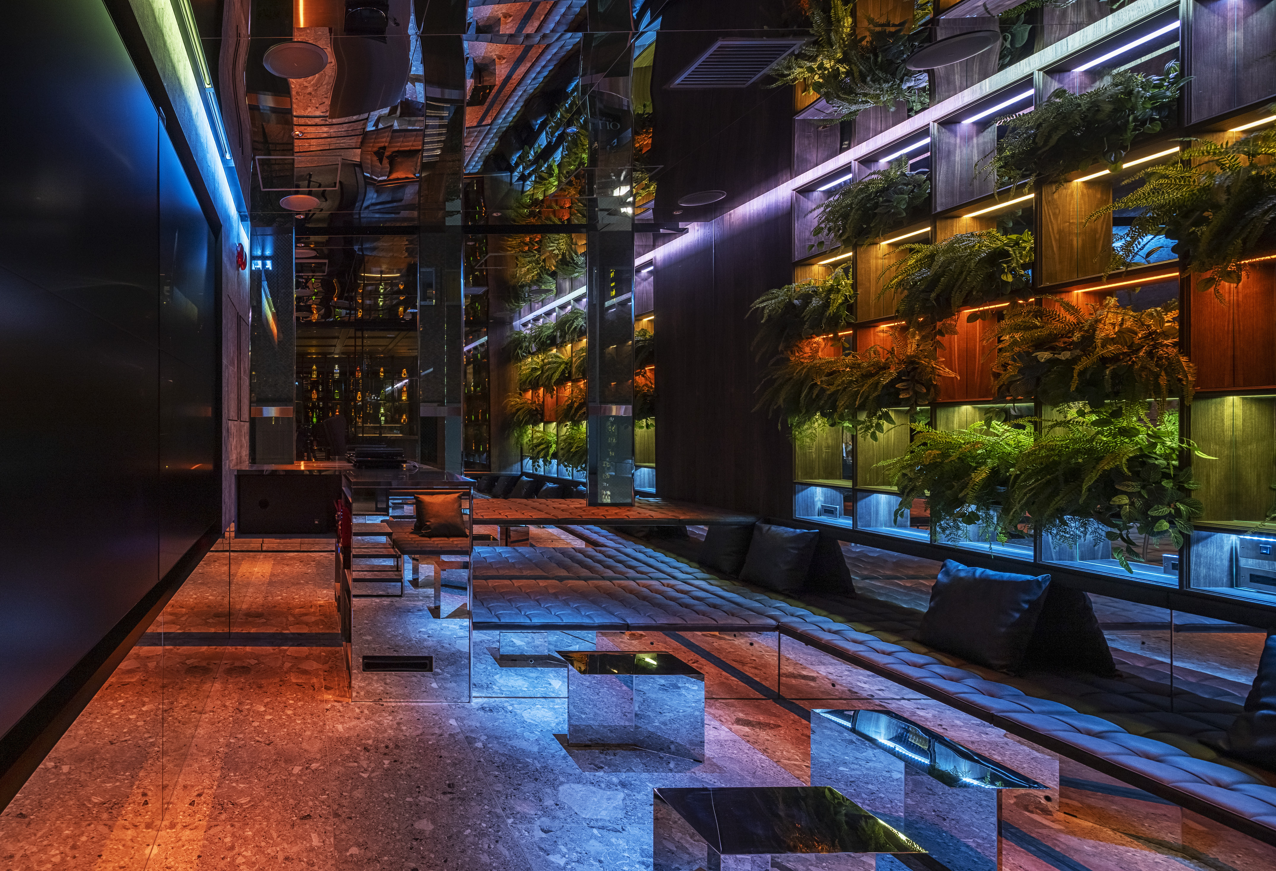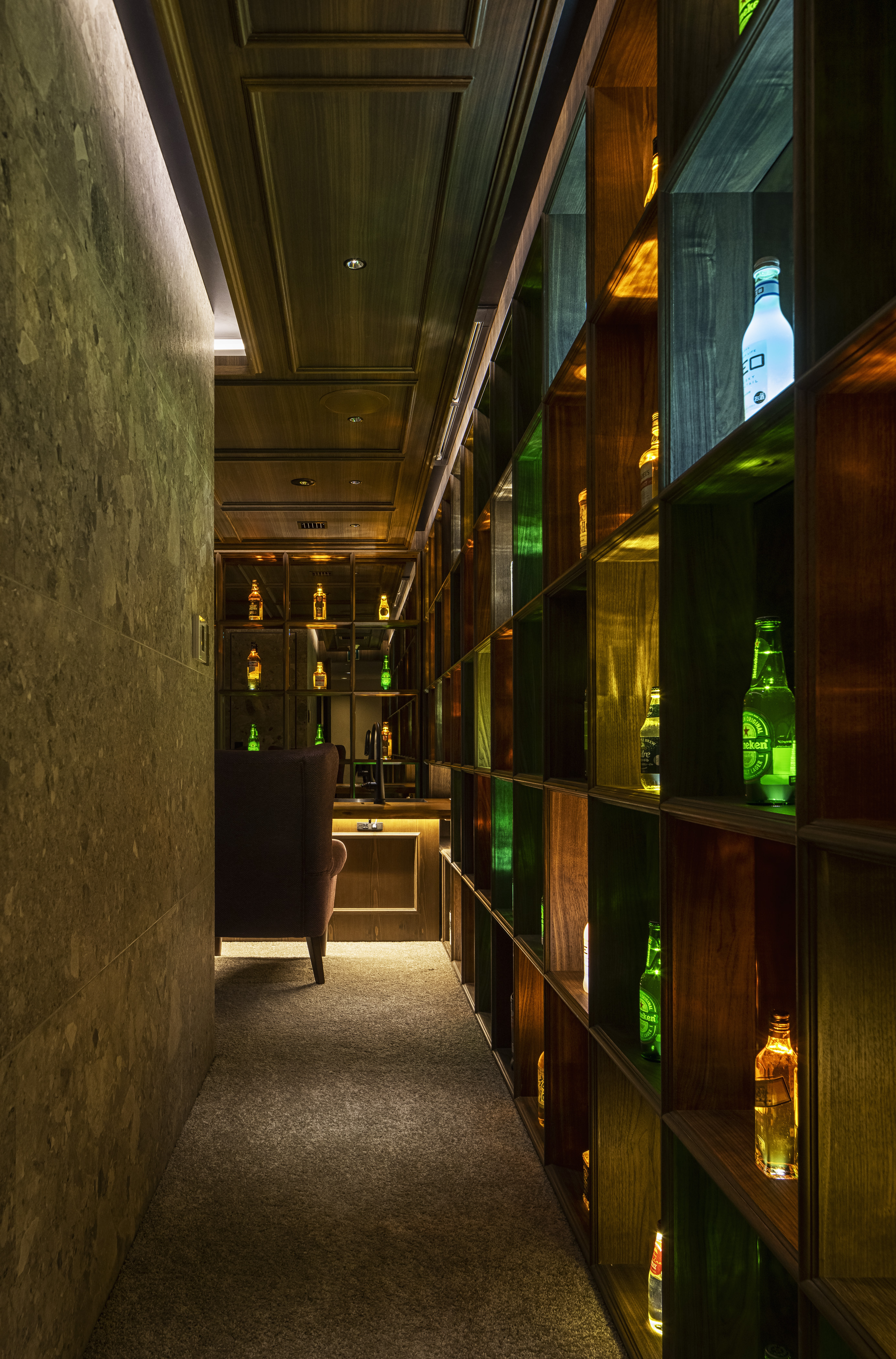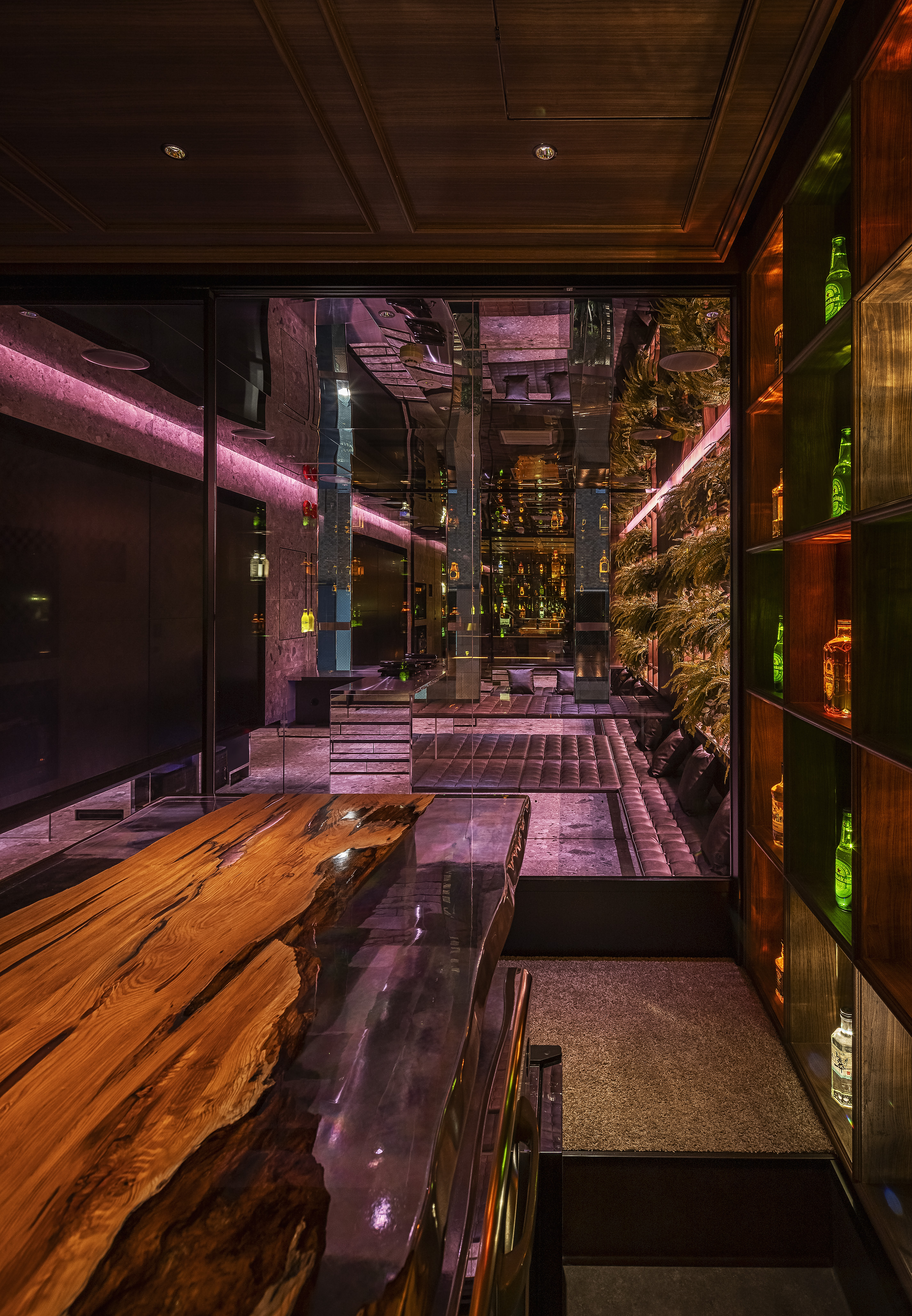 ”a discotheque” The space is located at the end of the passageway that is lined up with various clubs in Ginza Namiki-dori, one of Japan’s most famous bustling downtown areas. The etymology of the word ‘disco’ is French word ‘discotheque’, which in Marseille dialect means ‘a record storehouse’. In this way, we can understand the following word correlation : ‘record – disque’, ‘library – biblioteque’. Therefore, in order to create client’s own ‘playground’, we came up with the idea to design a library space that brings together people and client’s favourite things – objects that are important to him. In reality, at the end of the hallway leading to client’s space there is a wall that can be open and closed only by client’s mobile phone. Once you step inside, you can see the alcohol bottles that become a lighting fixture illuminating the entire space. The counter is made of 1000 years old Yakushima cedar tree, and it is a space where one can enjoy a drink sitting on the comfortable sofas. At the back there is a karaoke room where one can immerse themselves in an extraordinary space emphasised by the light and sound. Smoke rises from beneath the feet and infrared rays are reflected endlessly – this plays a significant role in creating an outstanding karaoke space. Having said that, we hope this place will fulfill the playful spirit of adults.