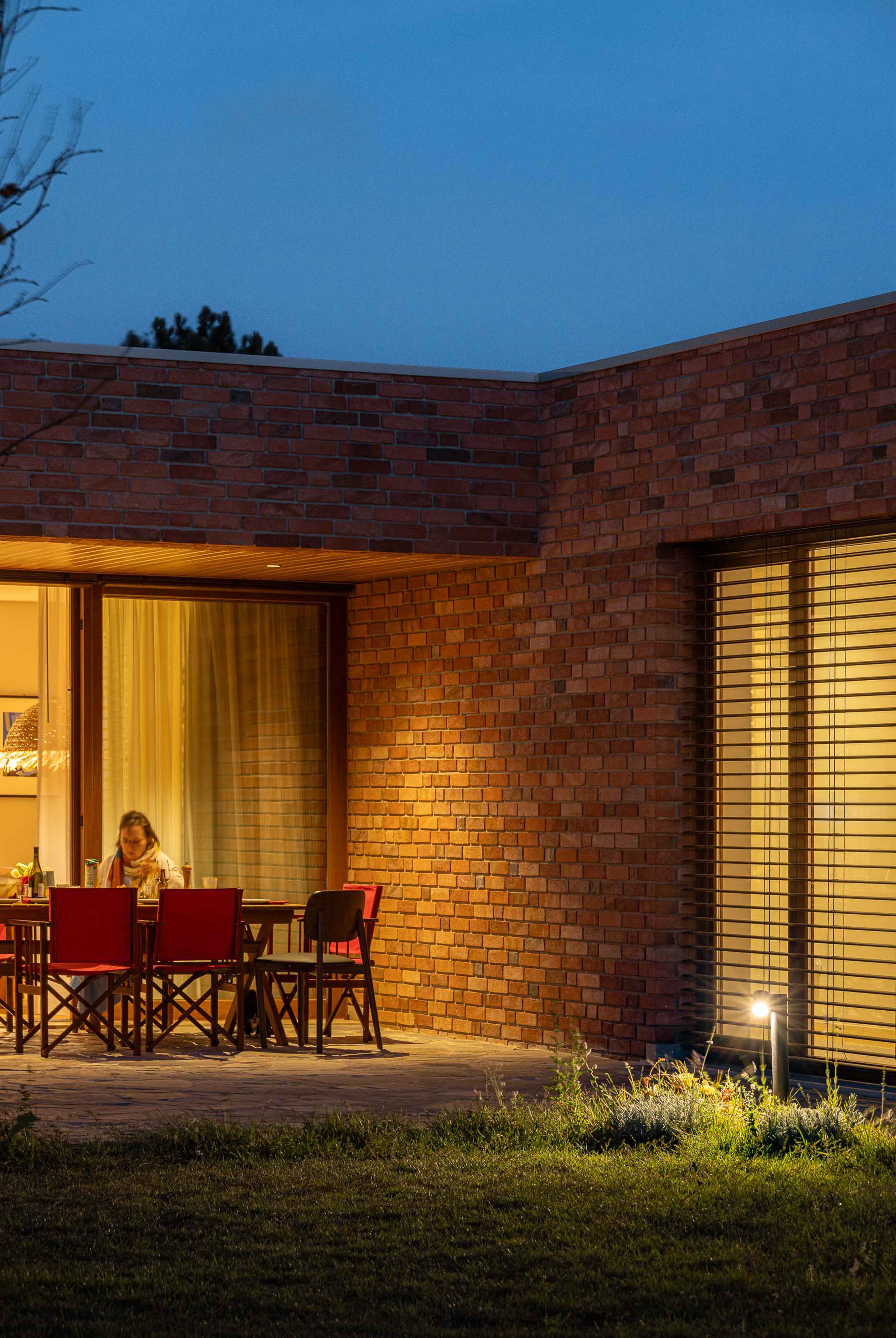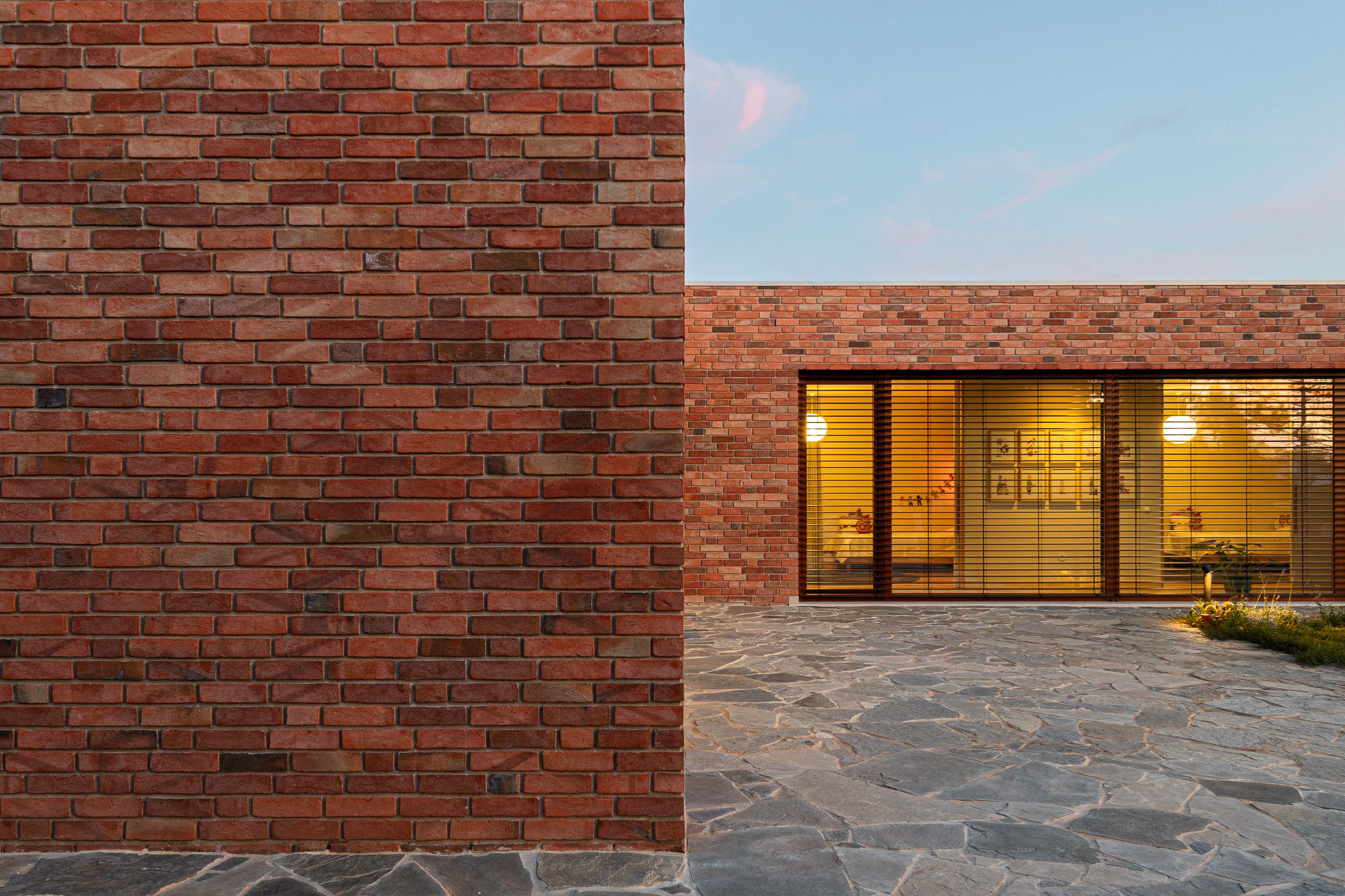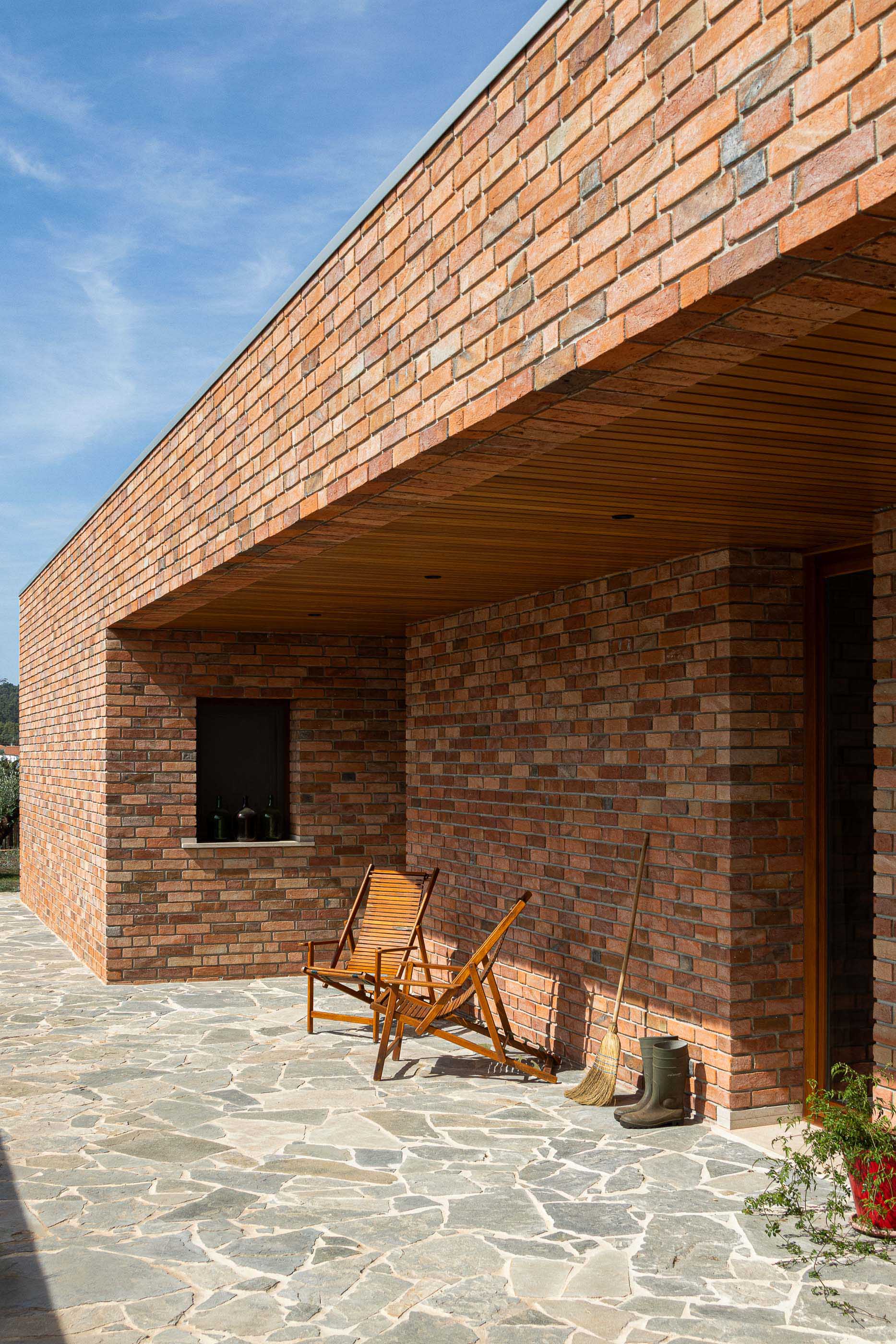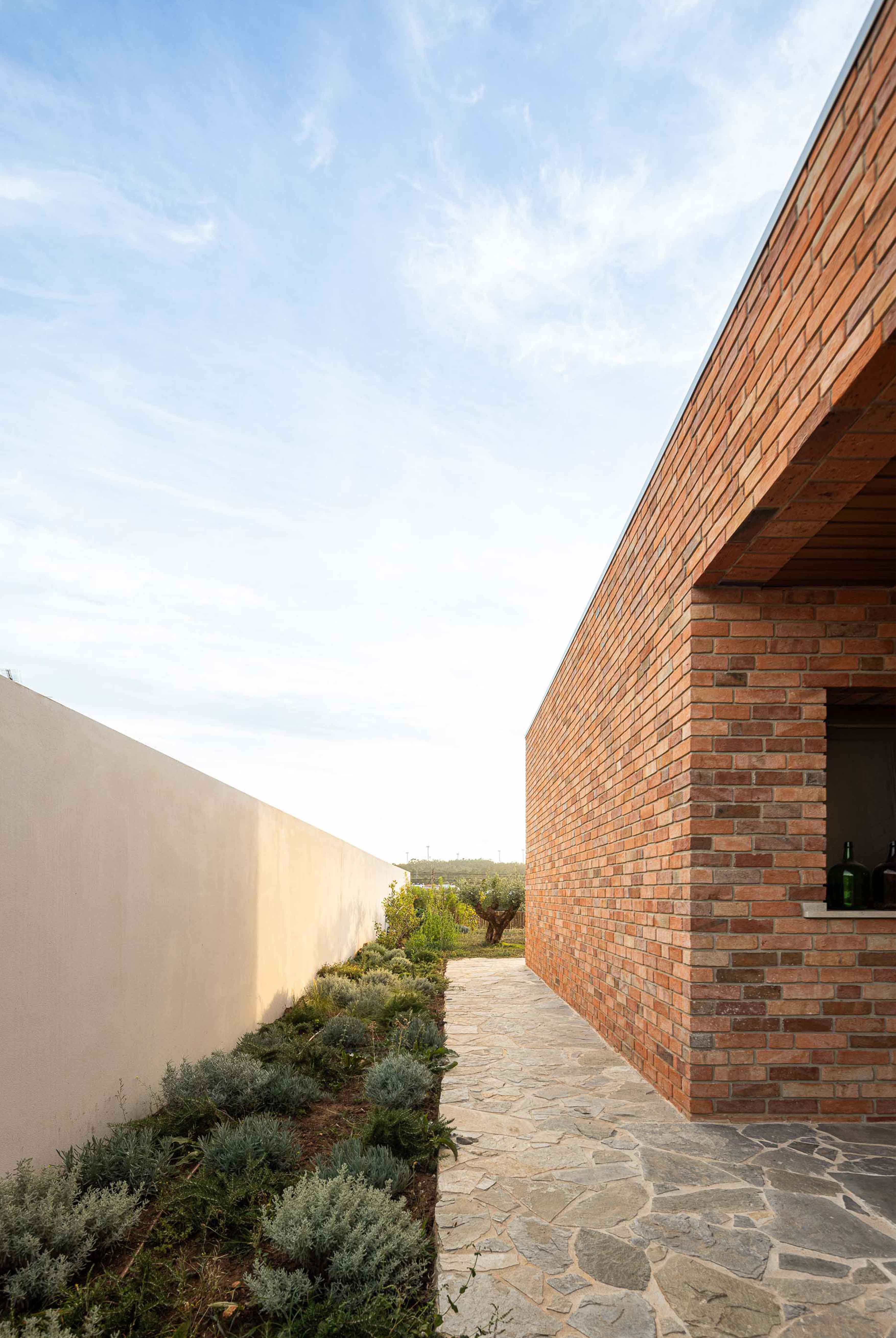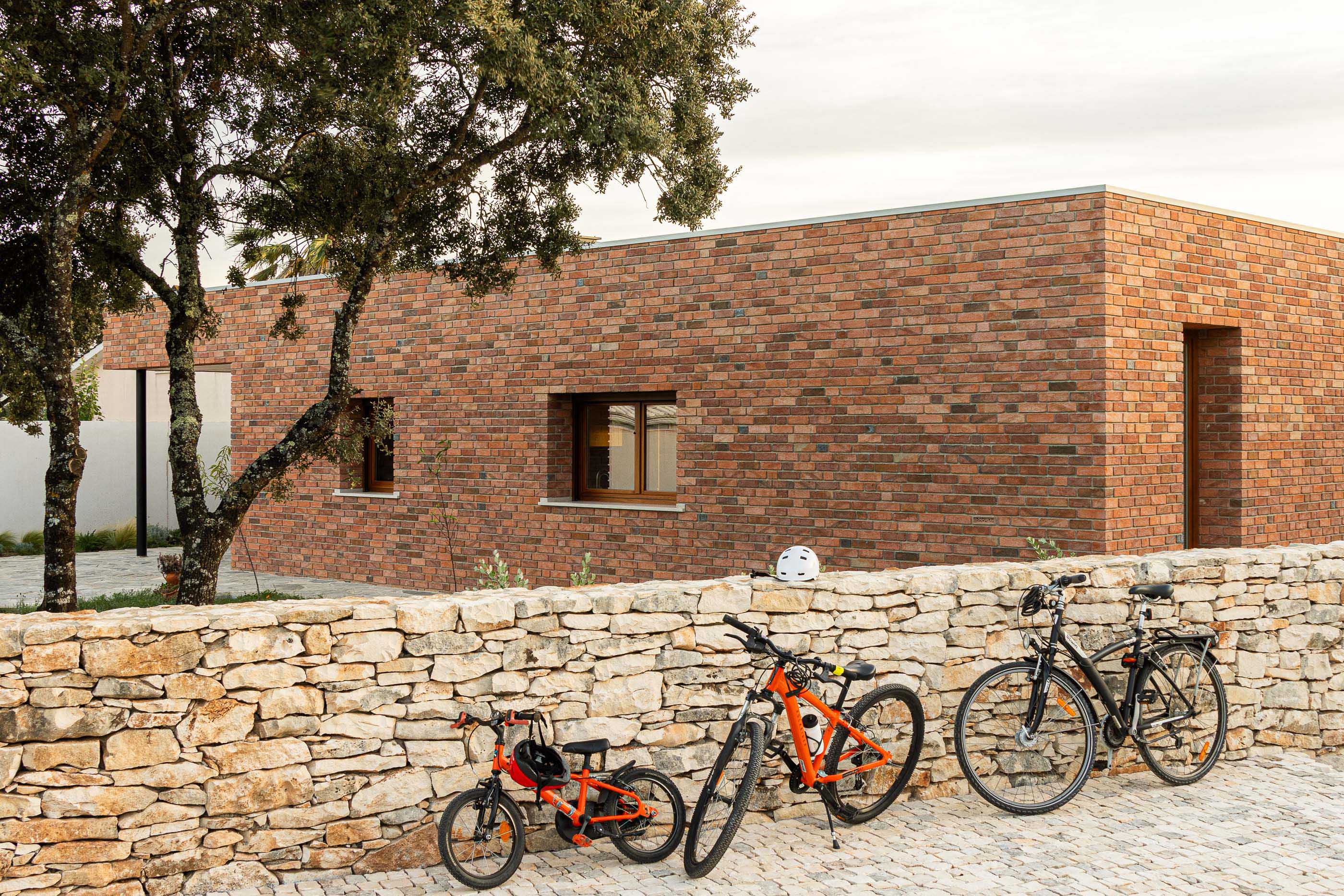 Located close to the city of Fátima, this single-family house appears as an intervention that respects and enhances the surrounding natural landscape, as well as the characteristics of the land on which it is located. The project considers the premises established by the owners, with emphasis on the enhancement of natural light, the guarantee of privacy, spatial flexibility and the primacy of the use of natural materials, such as handcrafted solid brick with the greatest protagonism, combined with the natural wood of the window frames and ceilings and with the hand-arranged stone of the fence walls and the floors, giving the work a tactile character, applied using artisanal and local techniques. The house is essentially composed of a simple volume, in the shape of an “L”, being located on the land in order to safeguard a harmonious integration with the existing afforestation, providing a balance between comfort, privacy and respect for the environment, being positioned at the highest level of the land and close to the public access road, to the east, ensuring greater privacy on the route approaching the main entrance, denoting this idea of greater closure, in contrast to the west-facing fronts, which open generously onto the garden area, to create a notion of continuity between internal and external spaces and for natural light to spread, in a controlled manner, providing a bright and welcoming environment. The internal distribution developed in two distinct wings, demarcated by the entrance atrium: the first corresponds to the common and social spaces, as the living room, dining room and kitchen in open space, laundry, office and covered outdoor areas; while the other wing contains private spaces, as bedrooms and sanitary facilities. There is also a basement area, with access from the outside, for storage and technical areas.