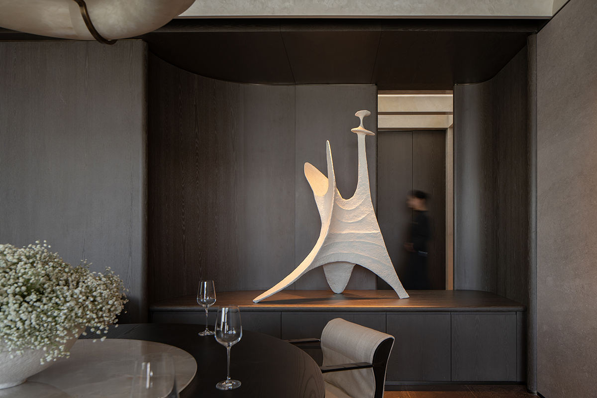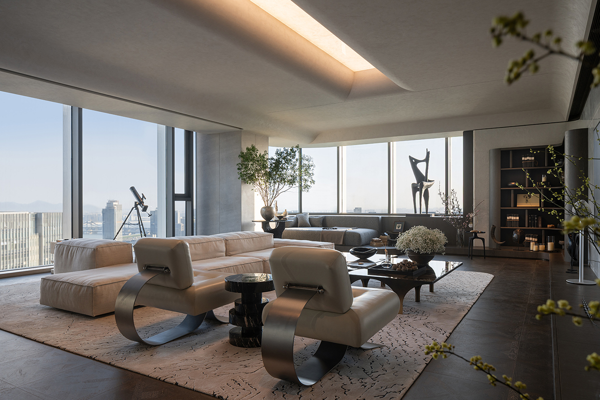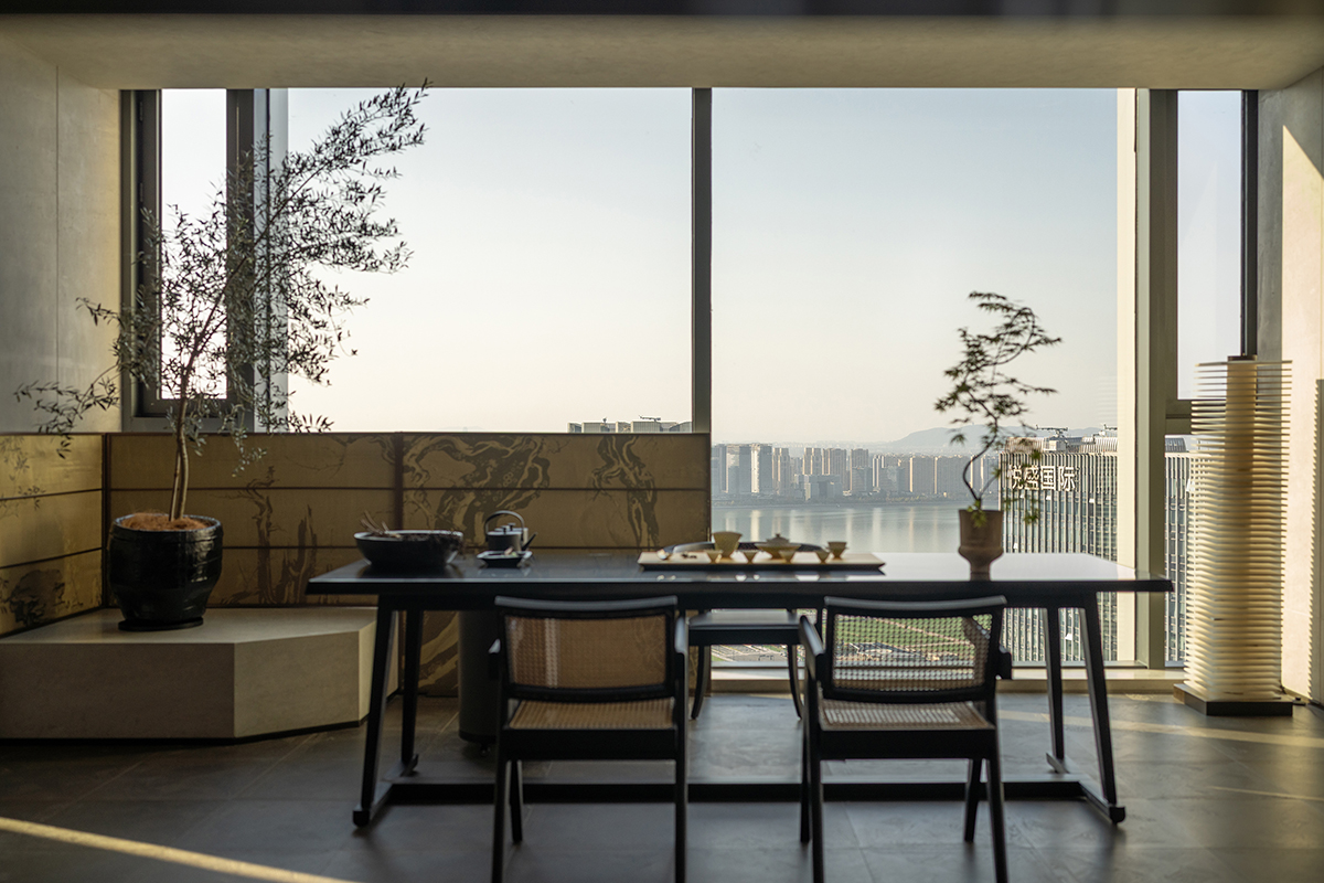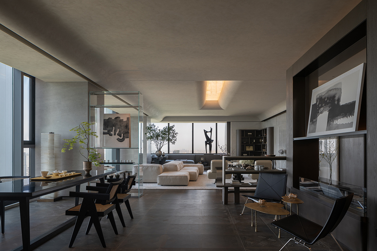 Perched atop the urban skyline, the 730㎡ residence at ESSENCE, Hangzhou, crafted by Nature Times Art Design under the theme "Returning to the Isle," embodies the philosophy of tranquil living in each inch of the space. An ideal home seamlessly merging culture and art with luxury, it offers a spiritual sanctuary within the bustling metropolis. Inspired by the concept of “Returning to the Isle,” this residence evokes the imagery of a solitary boat gracefully navigating the surging tides of the Qiantang River. Integrating the Eastern philosophy of tranquil living into the space, it imagines an ideal home where culture, art, and a luxurious lifestyle converge. Through fluid storytelling and artistic material expressions, life here transforms into a contemplative dialogue between self and space-time, offering an unrestrained spiritual retreat in this fast-paced, efficiency-driven world. This project aims to craft a tranquil sanctuary, where the soul finds repose and the heart takes root in the rhythm of the city. Upon entering, a calm wash of gray wood tone unfolds throughout the home, where the gentle motion of opening and closing doors lies a rhythm of order and understated luxury. A 21-meter glass curtain wall stretches like an unfolding scroll, framing the Qiantang River’s view from sunrise to moonset as the living room’s ever-changing backdrop. Here, Eastern and Western cultures converge in harmony, weaving an unseen narrative through space. On the south side of the corridor lies a private haven for both body and spirit. Spanning nearly 100㎡, it features a thoughtfully curated circulation loop, from an elegant wardrobe to a jade-accented bathing sanctuary that soothes both body and mind. The project evokes a ritual return to the essence of the Eastern spirit, creating more than just a superior physical space, but a poetic retreat for the soul.