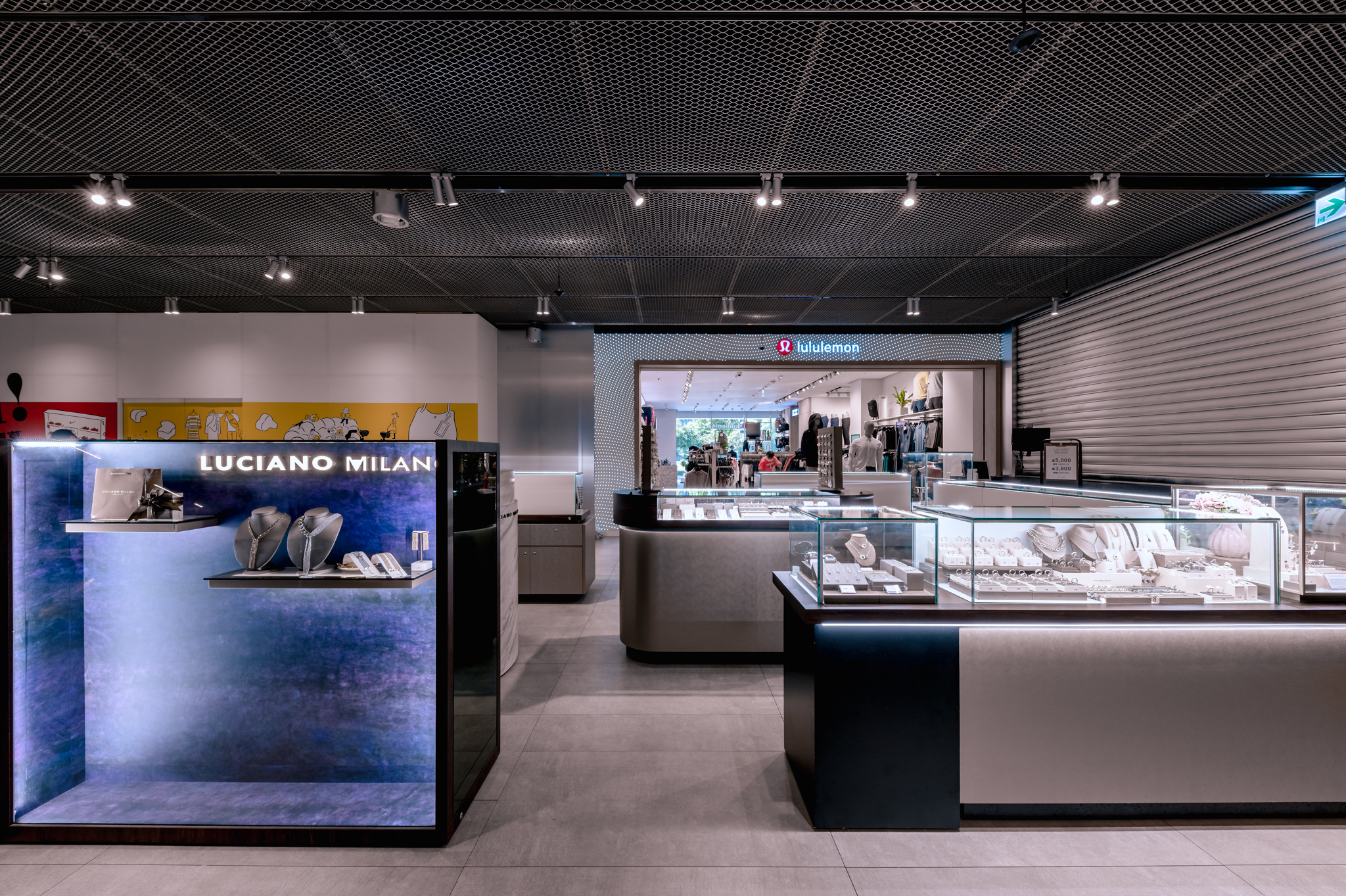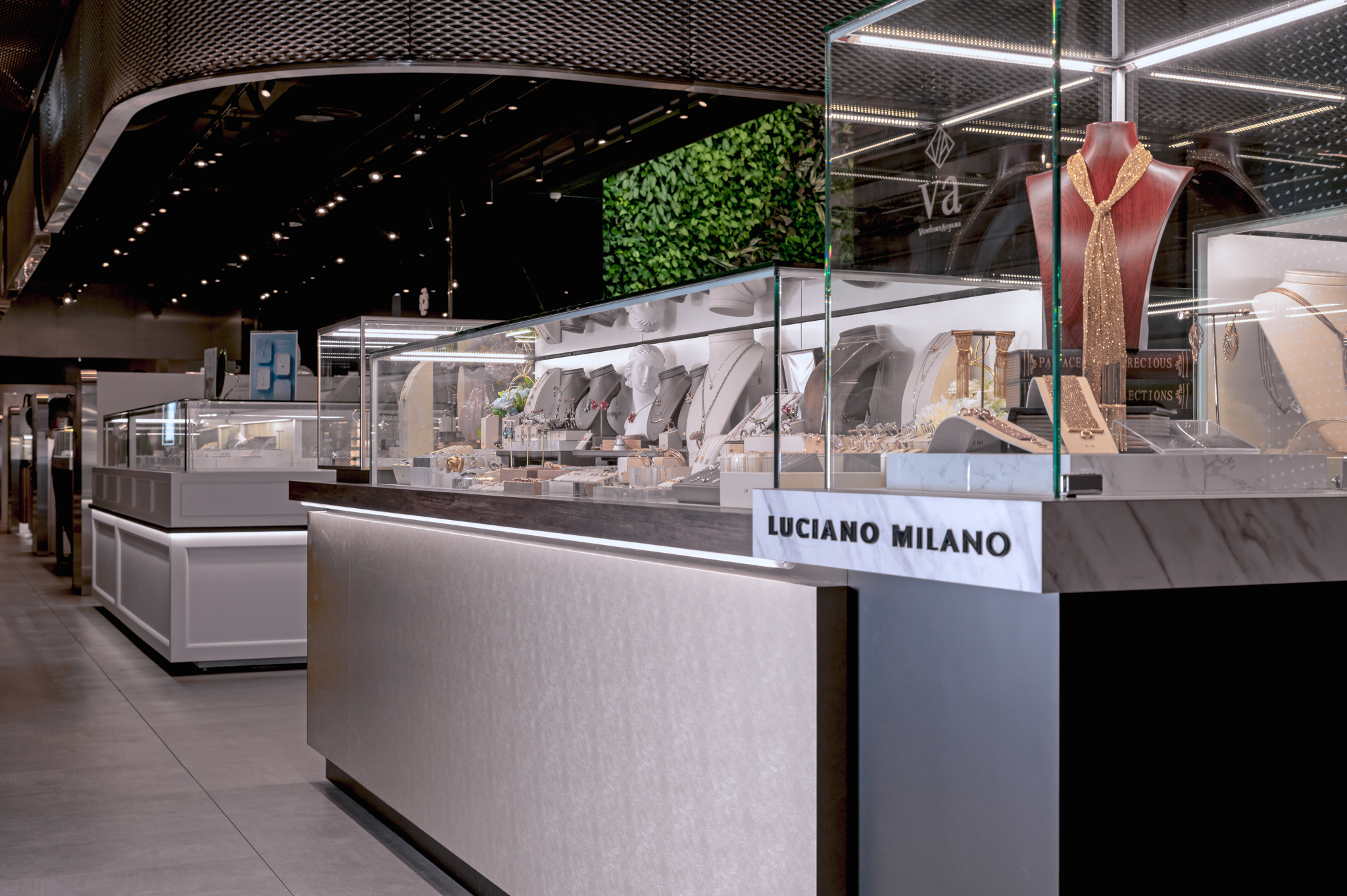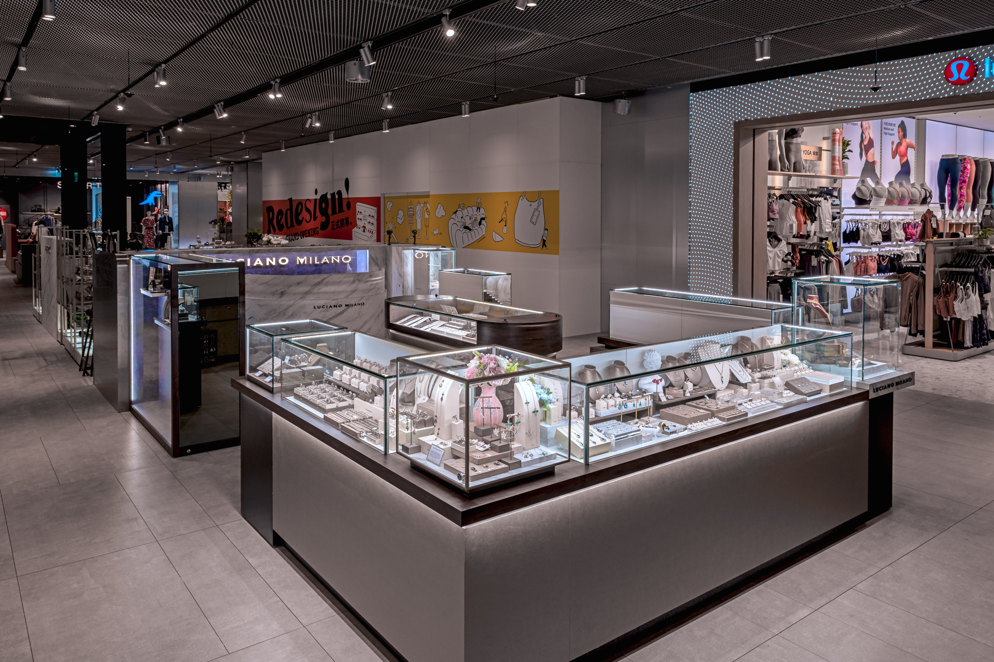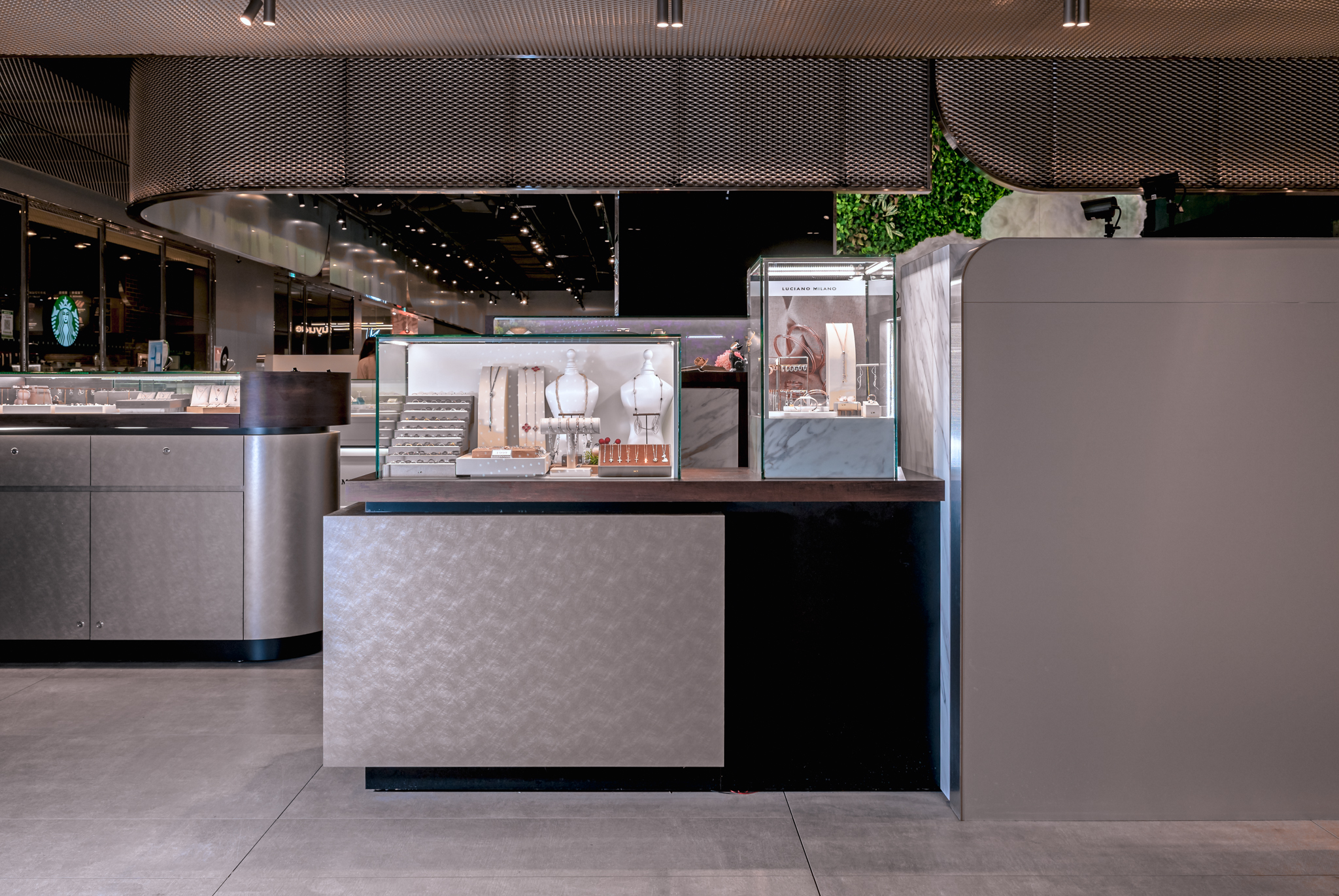 This project presents a thoughtfully crafted design concept for a jewelry brand counter, expertly tailored to showcase a diverse range of products. Given that each piece of jewelry necessitates a unique display method, we have designed custom glass display boxes in various heights. These boxes not only enhance visibility but also draw attention to the exquisite quality of each item. Furthermore, the design incorporates functional elements such as drawer-style and door-style opening mechanisms, specifically tailored to meet sales requirements. This thoughtful addition ensures that staff can swiftly retrieve and store items, thereby significantly improving service efficiency during busy hours. In addition to its functionality, the overall design harmoniously blends metal accents with a retro neoclassical style, which elegantly reflects the brand's sophisticated and refined Italian artistic heritage. Ultimately, this creates a luminous art space where jewelry and design resonate in beautiful unison, inviting customers to engage deeply with the collection. The cabinet showcases a stunning blend of elegant wood grain and lustrous champagne-colored metal panels, resulting in a sophisticated and refined aesthetic. This design does not merely focus on aesthetics; it strategically incorporates perimeter displays through thoughtfully arranged glass cabinets, effectively maximizing sales space within a compact layout. Moreover, the overall layout adopts a closed circulation design. At its heart lies a bullet-shaped central island cabinet, which serves not only as an eye-catching earring display stand but also as a guiding feature, inviting customers to explore the interior. The rounded shape of this island cabinet captivates attention while simultaneously alleviating any sense of constriction, thus enhancing comfort and flow during visits. In addition, lighting has been meticulously selected to cater to the unique ways in which gemstones and silver jewelry interact with light.