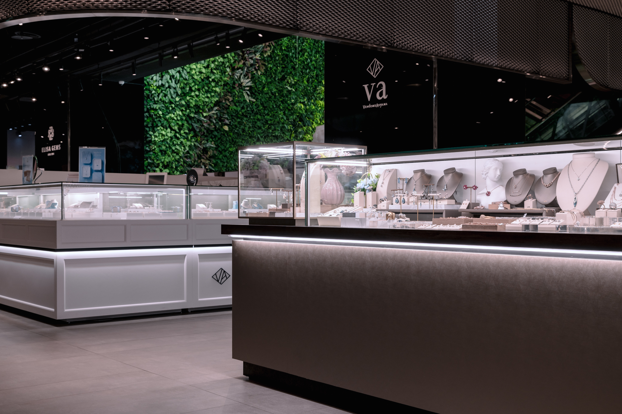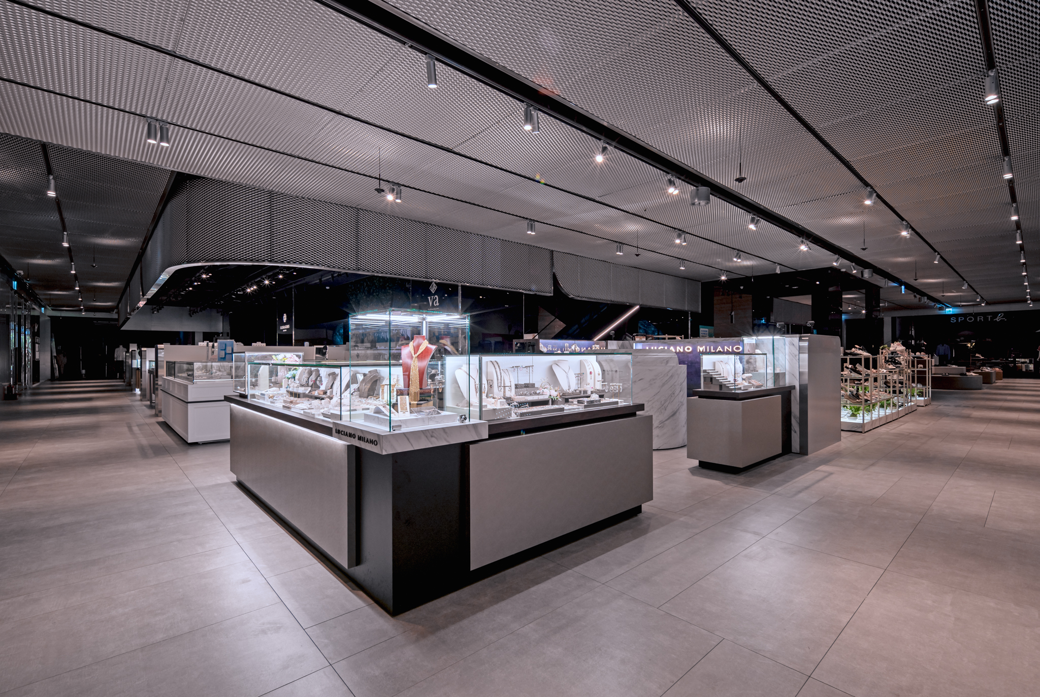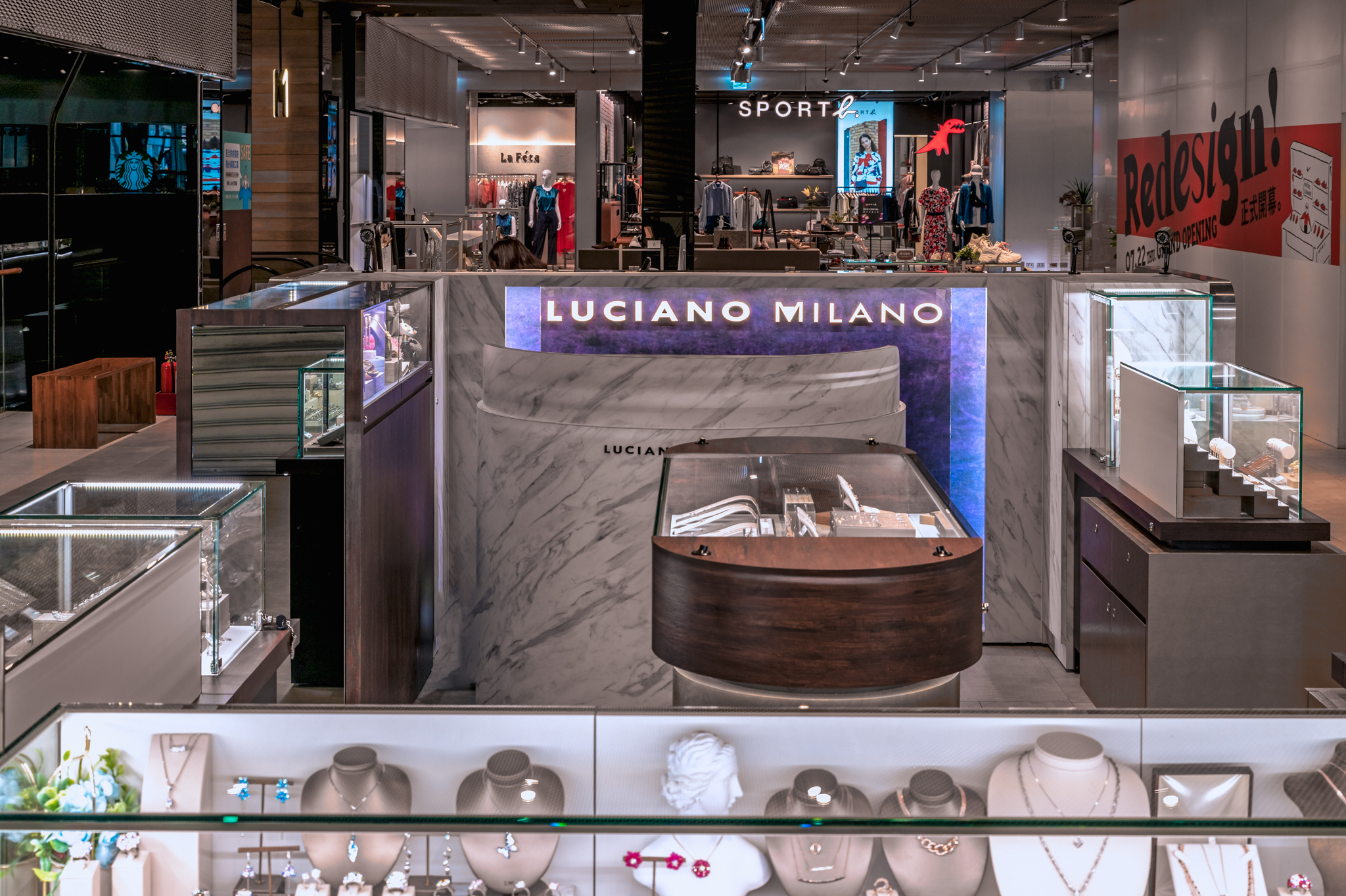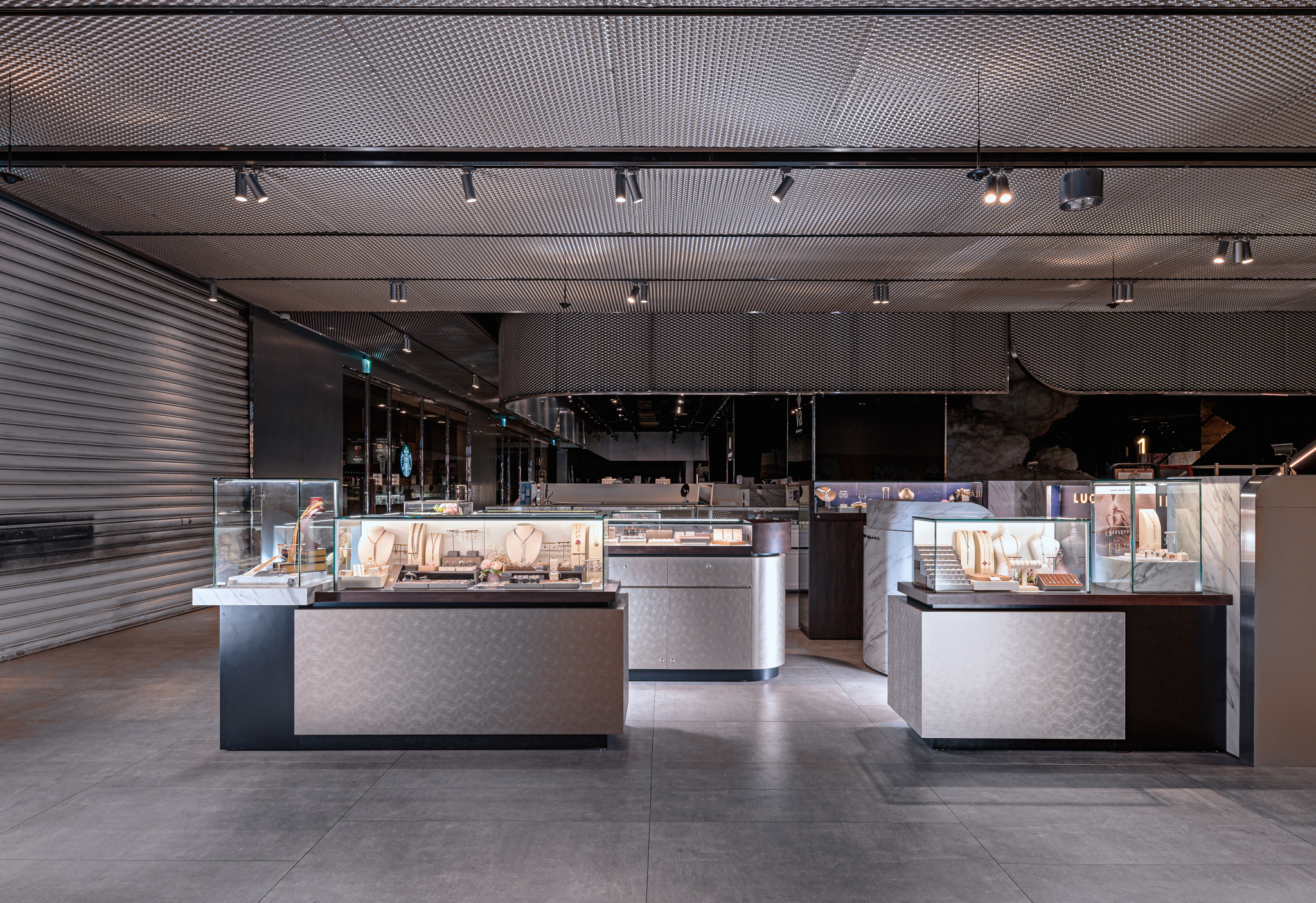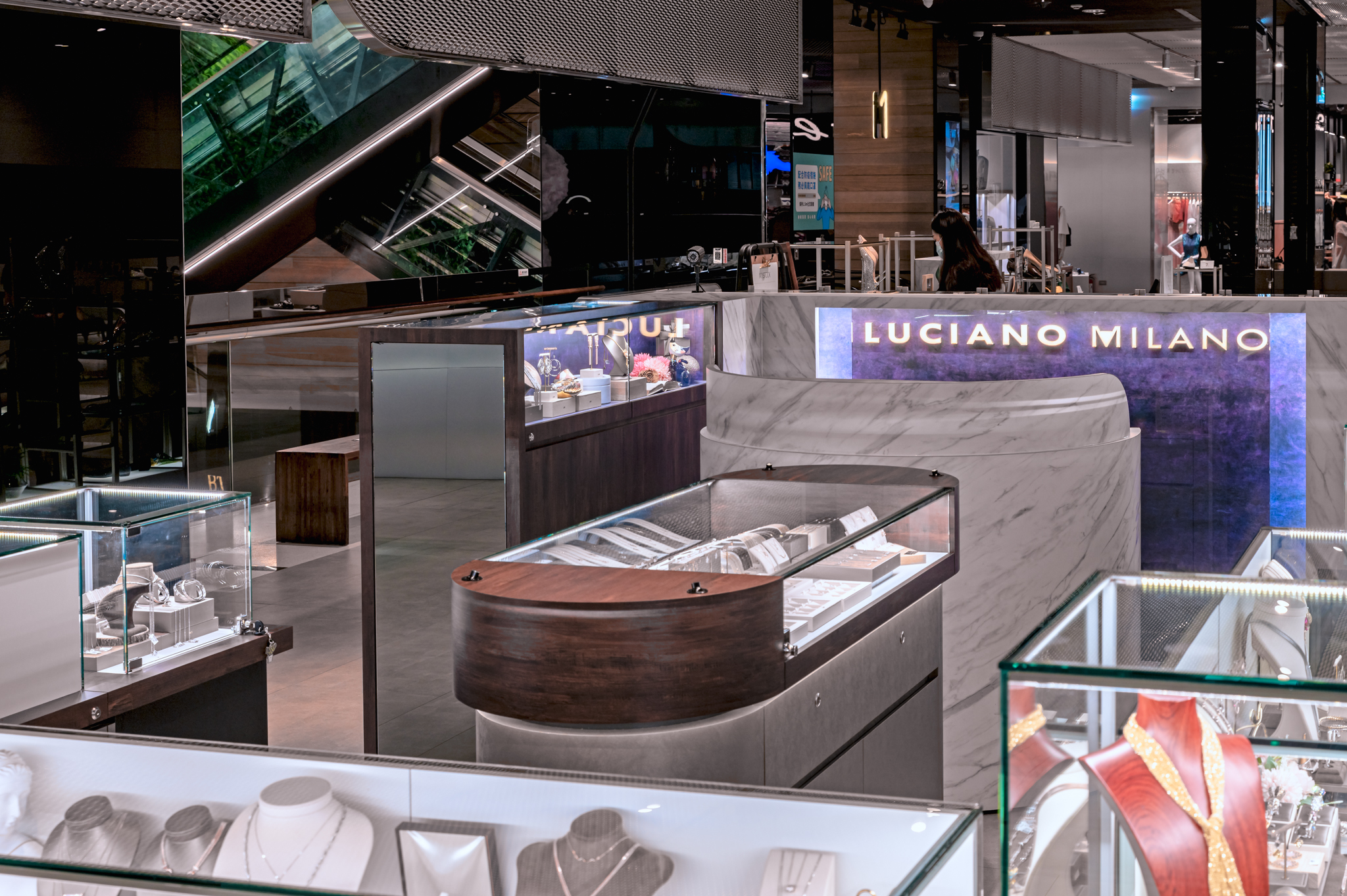 This project presents a thoughtfully crafted design concept for a jewelry brand counter, expertly tailored to showcase a diverse range of products. Given that each piece of jewelry necessitates a unique display method, we have designed custom glass display boxes in various heights. These boxes not only enhance visibility but also draw attention to the exquisite quality of each item. Furthermore, the design incorporates functional elements such as drawer-style and door-style opening mechanisms, specifically tailored to meet sales requirements. This thoughtful addition ensures that staff can swiftly retrieve and store items, thereby significantly improving service efficiency during busy hours. In addition to its functionality, the overall design harmoniously blends metal accents with a retro neoclassical style, which elegantly reflects the brand's sophisticated and refined Italian artistic heritage. Ultimately, this creates a luminous art space where jewelry and design resonate in beautiful unison, inviting customers to engage deeply with the collection. The cabinet showcases a stunning blend of elegant wood grain and lustrous champagne-colored metal panels, resulting in a sophisticated and refined aesthetic. This design does not merely focus on aesthetics; it strategically incorporates perimeter displays through thoughtfully arranged glass cabinets, effectively maximizing sales space within a compact layout. Moreover, the overall layout adopts a closed circulation design. At its heart lies a bullet-shaped central island cabinet, which serves not only as an eye-catching earring display stand but also as a guiding feature, inviting customers to explore the interior. The rounded shape of this island cabinet captivates attention while simultaneously alleviating any sense of constriction, thus enhancing comfort and flow during visits. In addition, lighting has been meticulously selected to cater to the unique ways in which gemstones and silver jewelry interact with light.