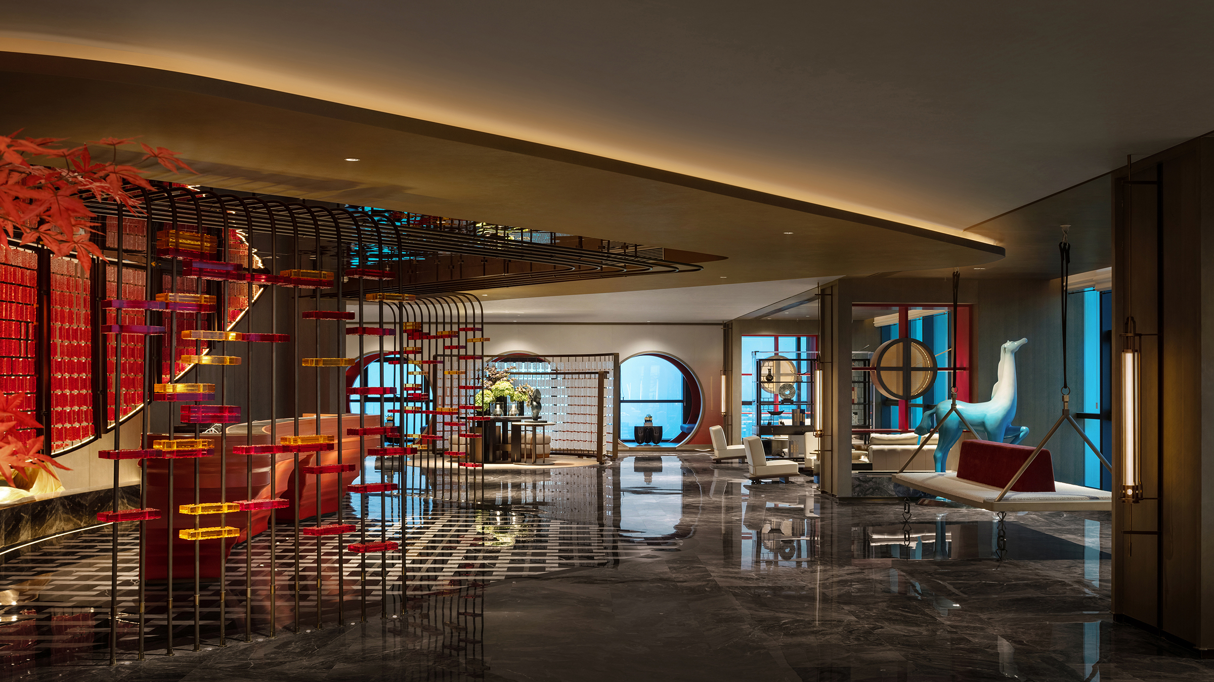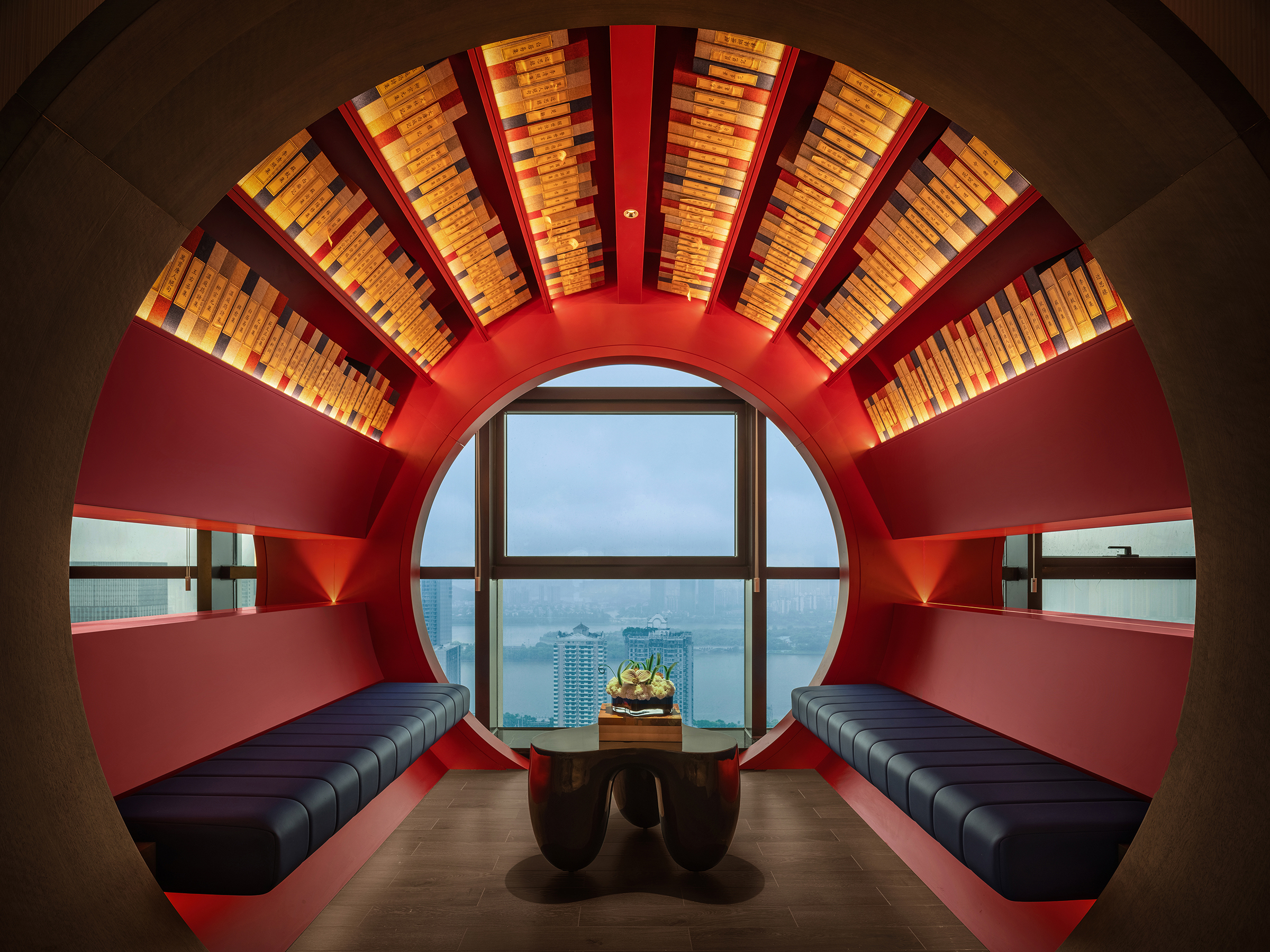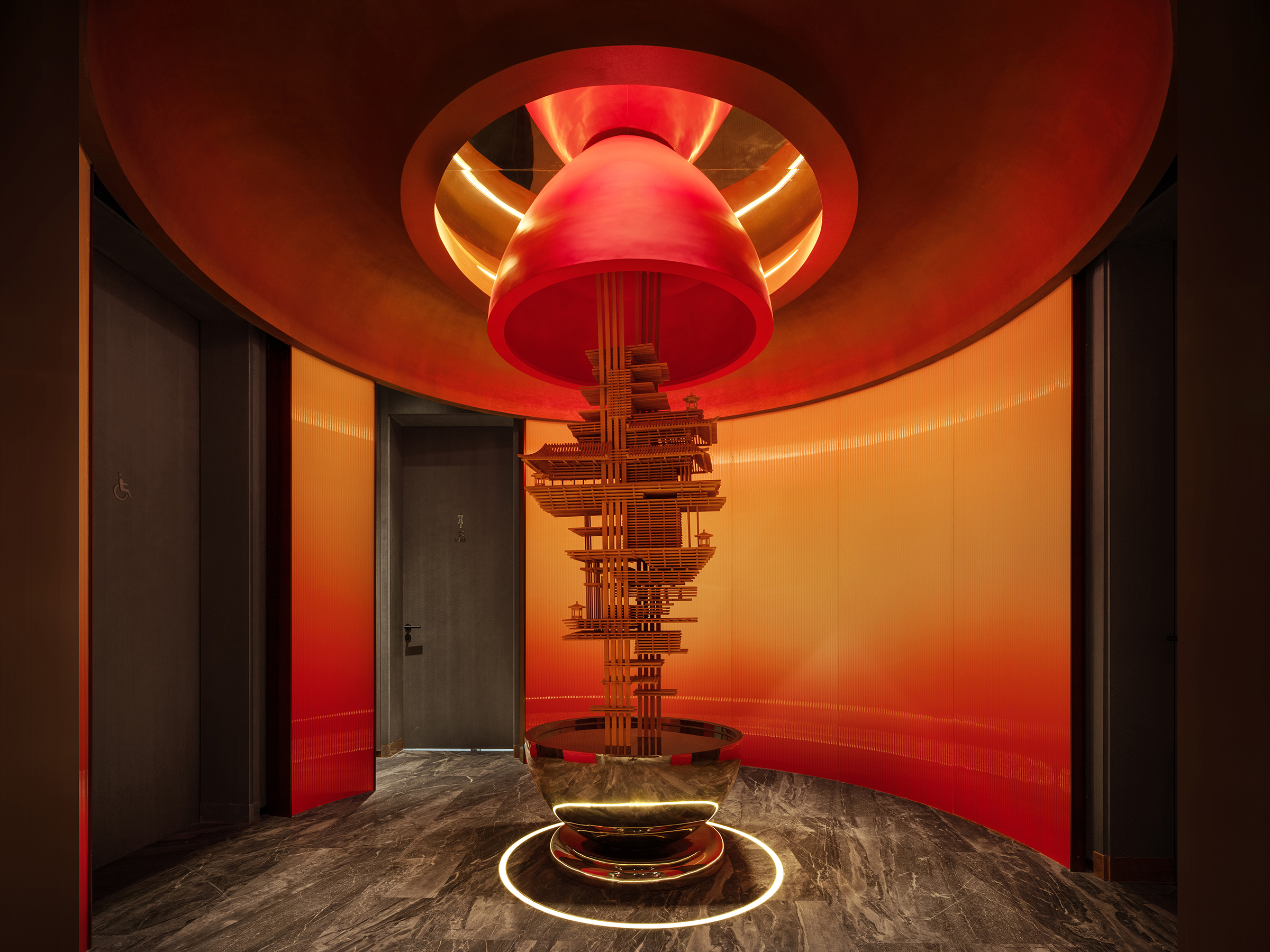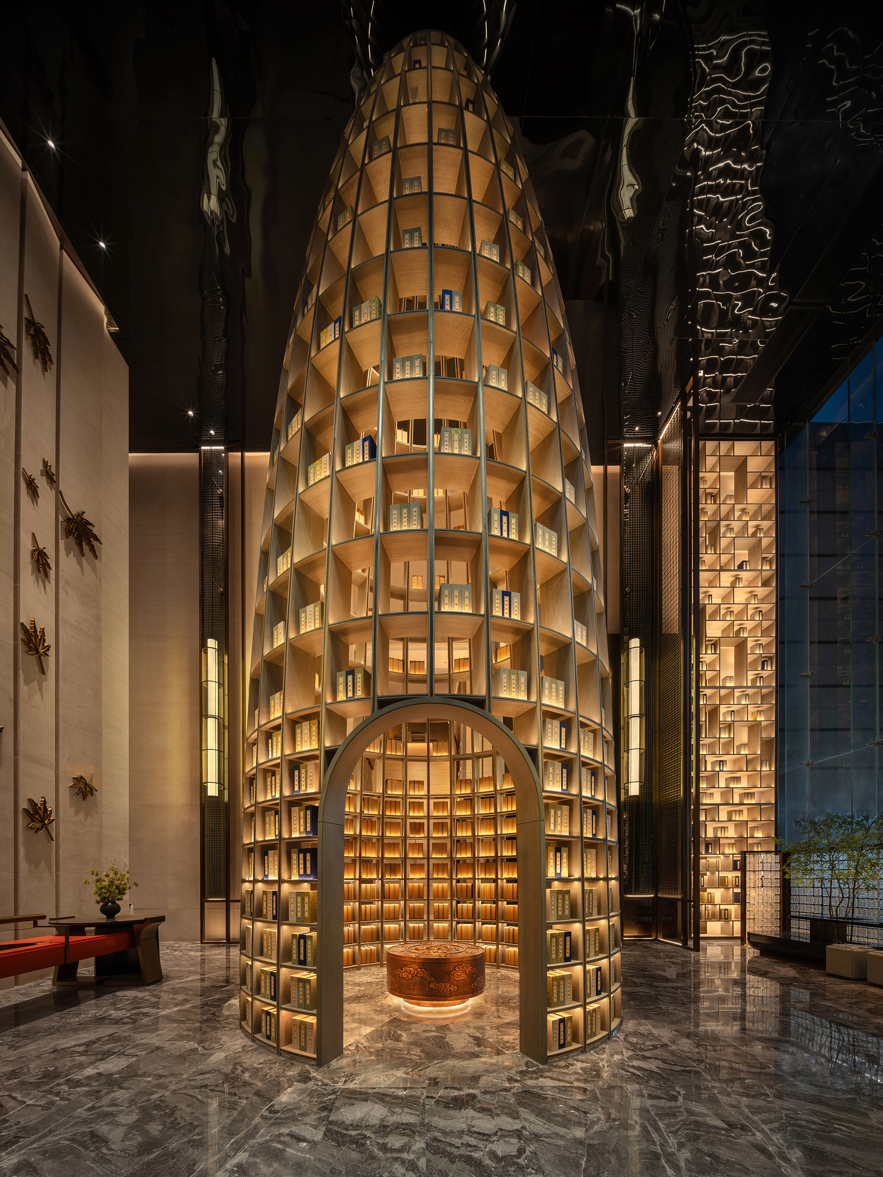 The hotel’s design draws deep inspiration from the cultural heritage of Changsha, particularly the legacy of Yuelu Academy, one of China’s oldest academic institutions. Traditional architectural symbols, such as towers and pavilions, are abstracted and reimagined using contemporary materials and modern spatial language, creating a meaningful dialogue between the past and present. The first-floor lobby features a striking book tower—a modern homage to the academy’s spirit of knowledge. Golden maple leaves and a symbolic reference to the Six Dynasties Pine subtly infuse the space with regional identity. As guests move through the space, cultural elements unfold gradually: illuminated corridors lined with bookshelf-inspired designs, art installations referencing Aiwan Pavilion, and historical motifs like ancient hair crowns reinforce the city’s legacy. On the 36th floor, the sky lobby blends modernity and natural elements. Transparent partitions, minimalist furniture, and panoramic views create a serene atmosphere. Elements like an acrylic wall depicting the rising sun, horse sculptures symbolizing vitality, and a bar set within a circular moon gate all serve to merge cultural symbolism with modern hospitality. The dining area incorporates vibrant local imagery such as red chili art, boat-shaped installations, and lighting fixtures referencing scrolls and calligraphy brushes. Guest rooms continue the narrative, with gold-threaded book imagery on headboards echoing the Chinese idiom “books contain golden houses,” offering a quiet cultural retreat within the bustling city. The innovation lies in the transformation of traditional symbols into experiential moments, rather than direct imitation. This approach avoids superficial decoration while fostering a rich, immersive environment for global travelers. The design team carefully balanced cultural depth with modern comfort, ensuring that the space remains intuitive and engaging for international audiences. Material durability, minimalistic aesthetics, and the refined use of cultural references together contribute to a sustainable, timeless design.