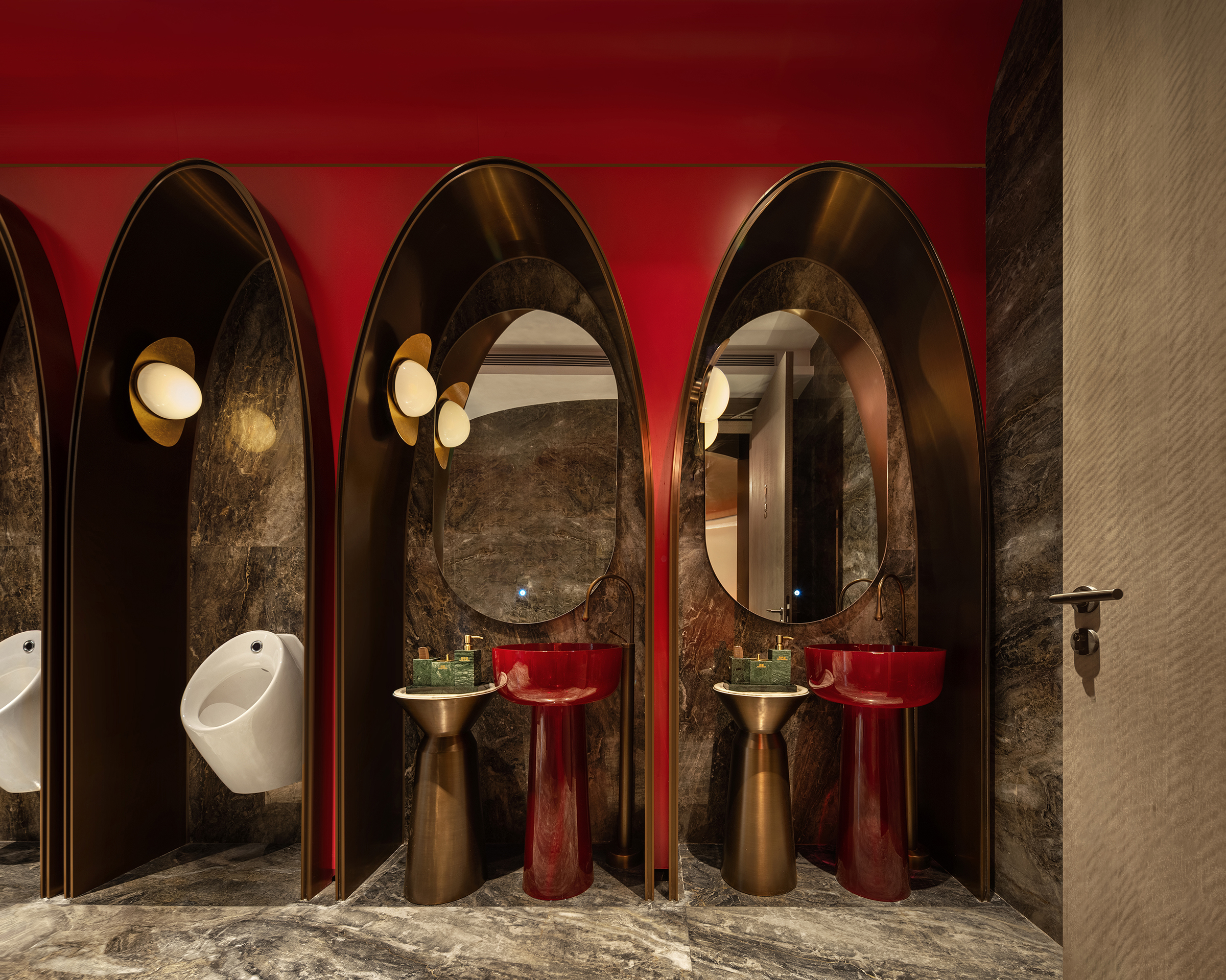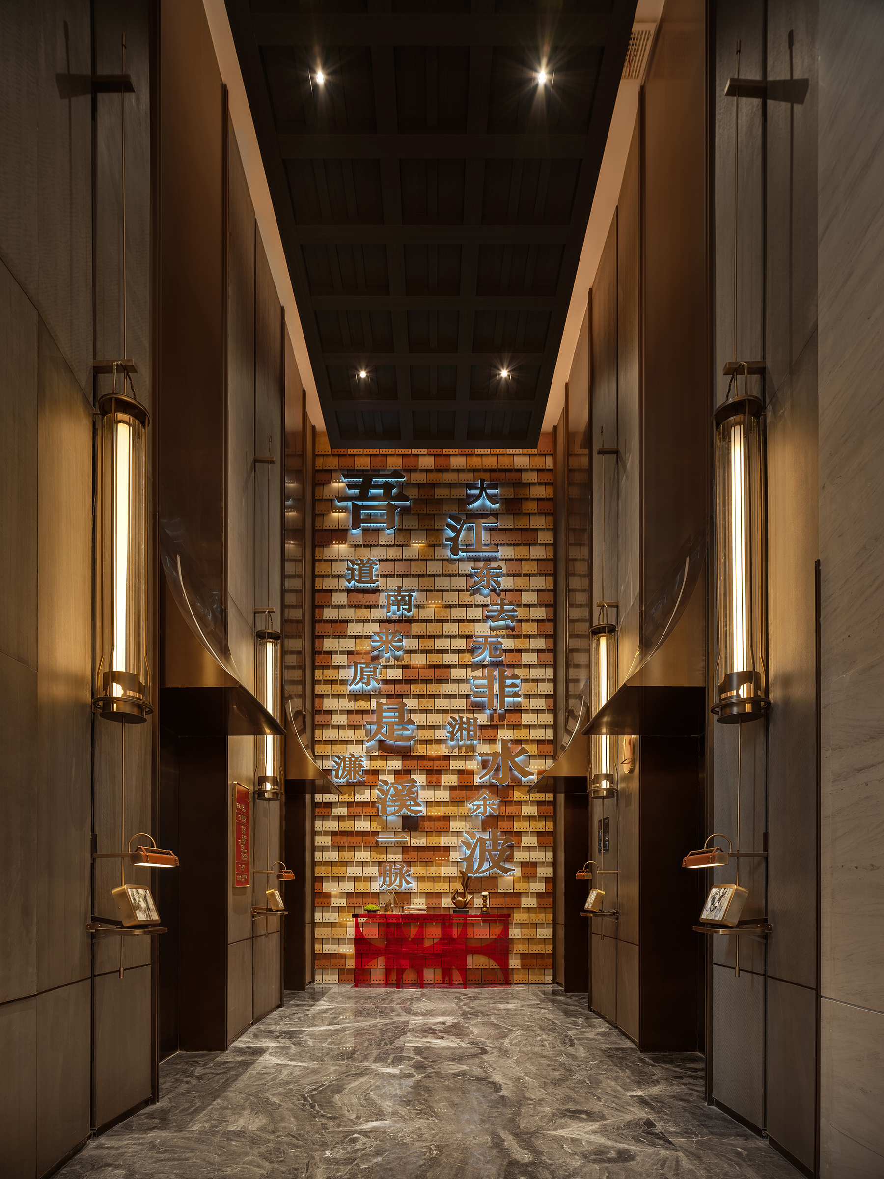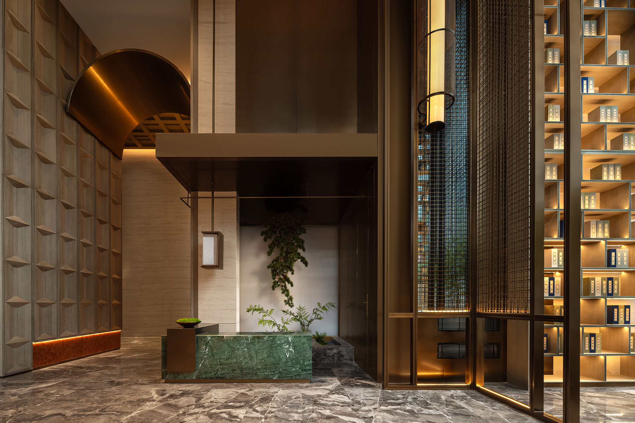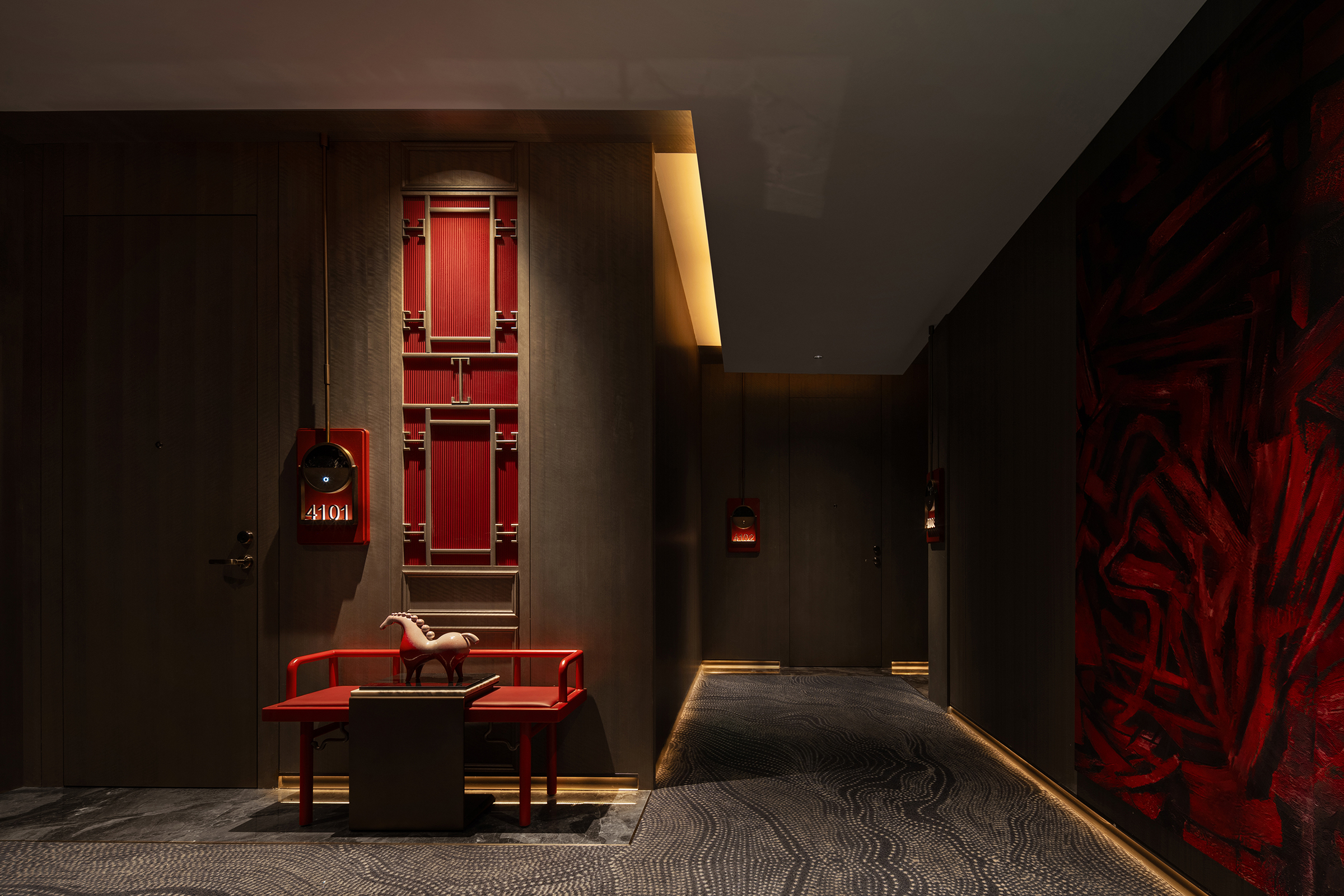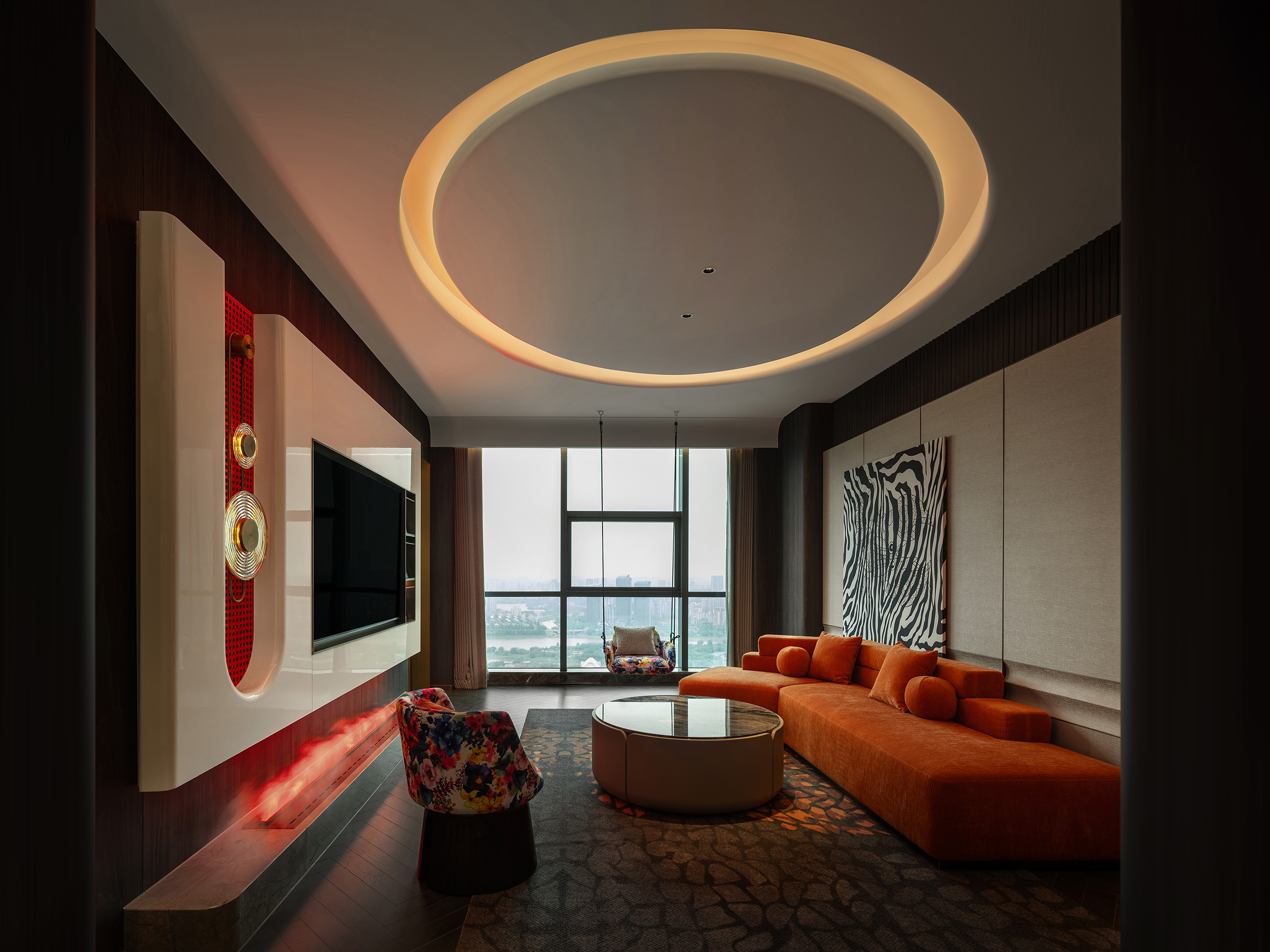 The hotel’s design draws deep inspiration from the cultural heritage of Changsha, particularly the legacy of Yuelu Academy, one of China’s oldest academic institutions. Traditional architectural symbols, such as towers and pavilions, are abstracted and reimagined using contemporary materials and modern spatial language, creating a meaningful dialogue between the past and present. The first-floor lobby features a striking book tower—a modern homage to the academy’s spirit of knowledge. Golden maple leaves and a symbolic reference to the Six Dynasties Pine subtly infuse the space with regional identity. As guests move through the space, cultural elements unfold gradually: illuminated corridors lined with bookshelf-inspired designs, art installations referencing Aiwan Pavilion, and historical motifs like ancient hair crowns reinforce the city’s legacy. On the 36th floor, the sky lobby blends modernity and natural elements. Transparent partitions, minimalist furniture, and panoramic views create a serene atmosphere. Elements like an acrylic wall depicting the rising sun, horse sculptures symbolizing vitality, and a bar set within a circular moon gate all serve to merge cultural symbolism with modern hospitality. The dining area incorporates vibrant local imagery such as red chili art, boat-shaped installations, and lighting fixtures referencing scrolls and calligraphy brushes. Guest rooms continue the narrative, with gold-threaded book imagery on headboards echoing the Chinese idiom “books contain golden houses,” offering a quiet cultural retreat within the bustling city. The innovation lies in the transformation of traditional symbols into experiential moments, rather than direct imitation. This approach avoids superficial decoration while fostering a rich, immersive environment for global travelers. The design team carefully balanced cultural depth with modern comfort, ensuring that the space remains intuitive and engaging for international audiences. Material durability, minimalistic aesthetics, and the refined use of cultural references together contribute to a sustainable, timeless design.