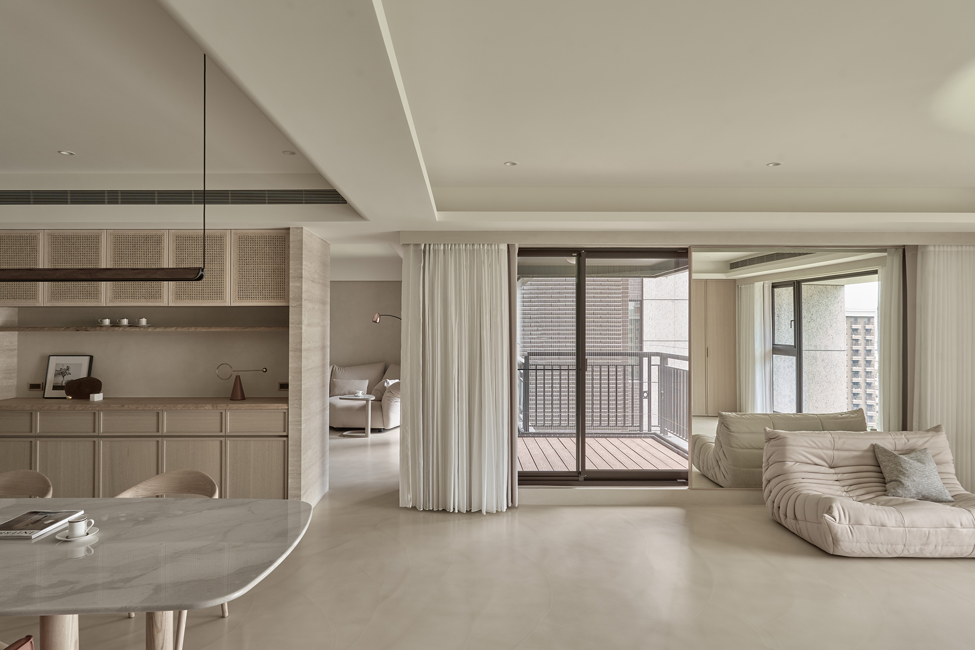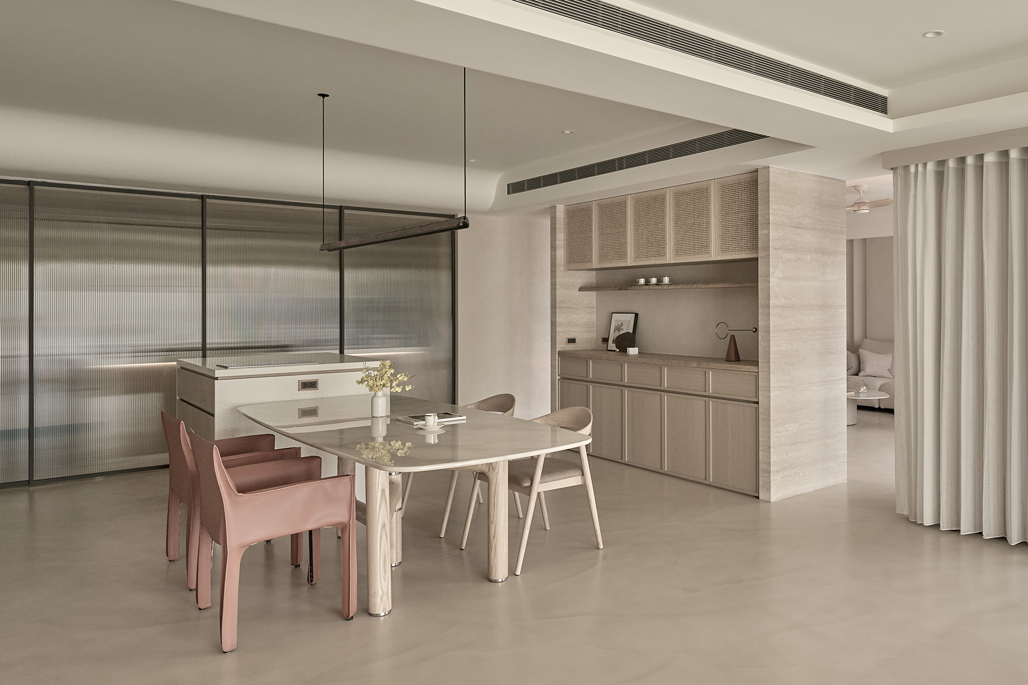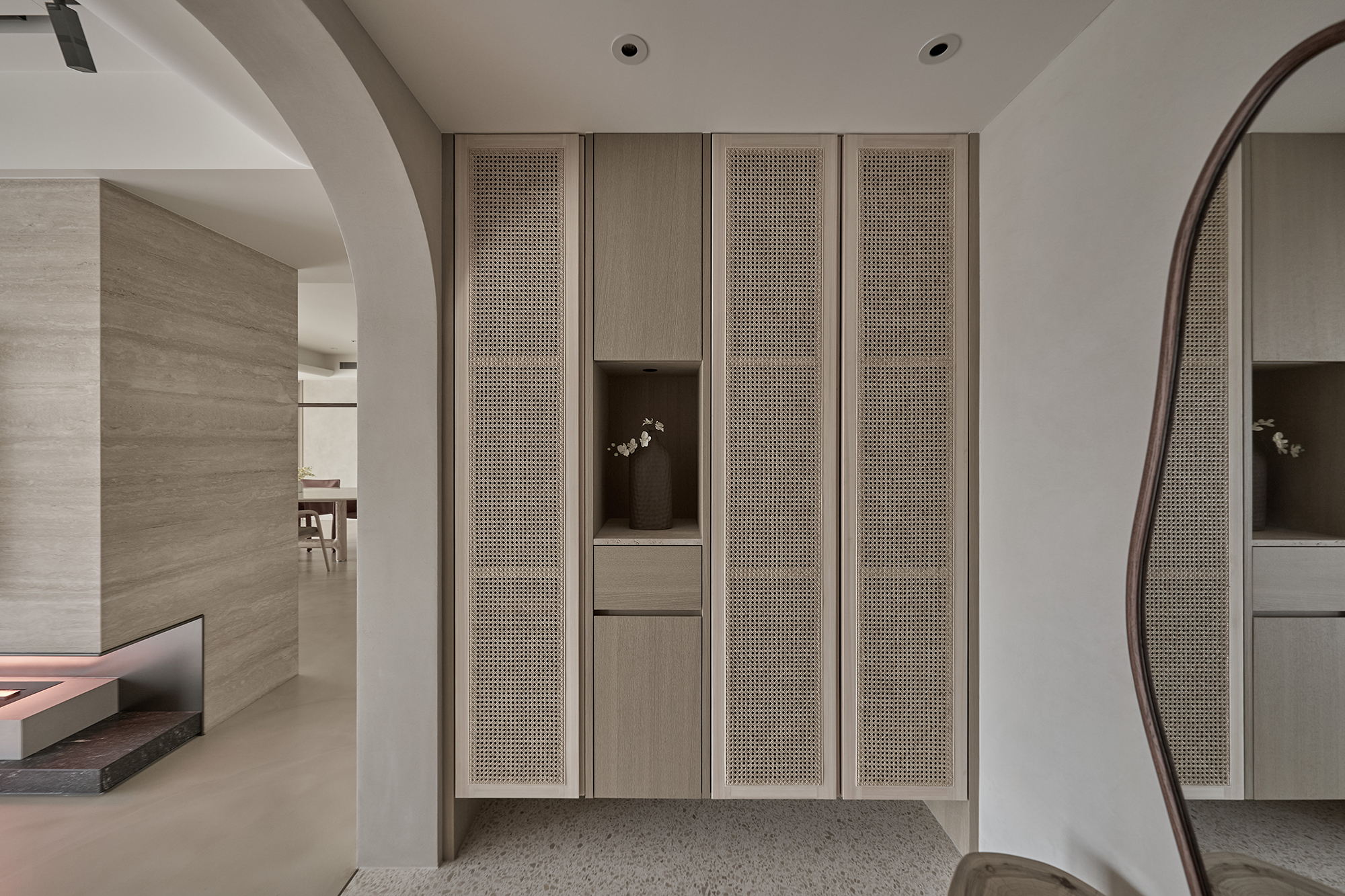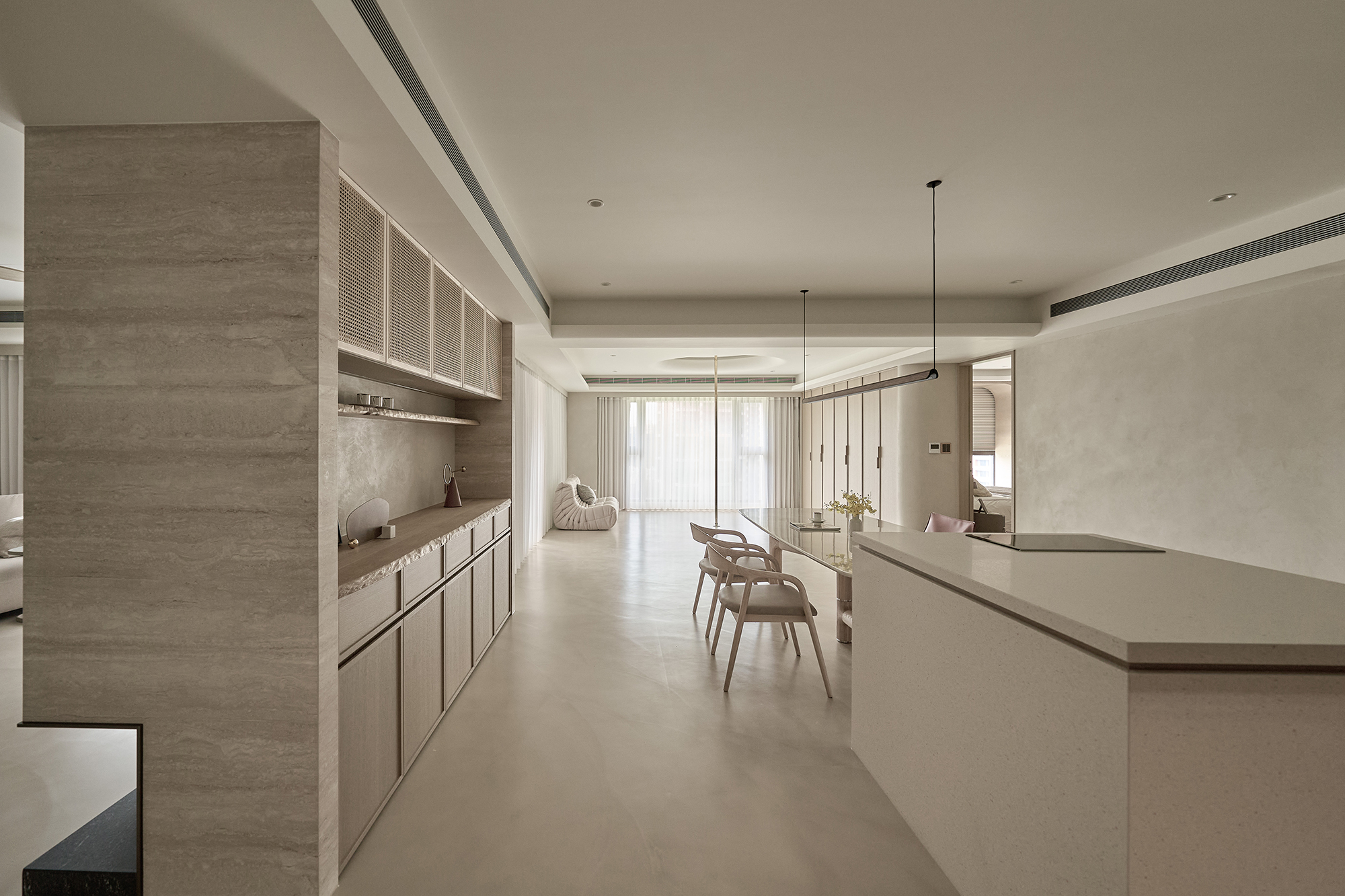 This project entails a thoughtful interior design for a single-story residence, inspired by the minimalist Japanese wabi-sabi aesthetic. The design team skillfully customized a layout specifically for the homeowner, resulting in a seamless integration of the living and dining areas into a spacious open concept. Additionally, a dedicated dance practice area has been thoughtfully incorporated, enhancing the functionality of the space and providing versatility for both everyday living and personal hobbies. In terms of aesthetics, the interior predominantly features a soothing palette of earth tones, which harmoniously blends natural stone, warm wood elements, and delicate rattan weaving. This careful selection of materials not only fosters a sense of elegance but also cultivates an airy ambiance throughout the home. As a result, the living space beautifully reflects the homeowner's appreciation for the simplicity of everyday beauty and embodies the philosophy of returning to the essence of living. Overall, this design is not just a visual delight; it creates a serene sanctuary that nurtures both the mind and spirit. The entrance foyer warmly welcomes guests with its stunning rattan-woven door panels and a beautifully crafted mineral-stone floor. As you step into the public area, you are greeted by living and dining rooms that exude elegance, adorned with sophisticated earth-tone paint. This delightful atmosphere is enhanced by the richness of natural wood accents, exquisite stone tabletops, and sleek metal structures. Additionally, an electronic fireplace creates a cozy ambiance, while expansive floor-to-ceiling windows flood the space with natural light, ensuring a bright and well-ventilated environment that invites relaxation.