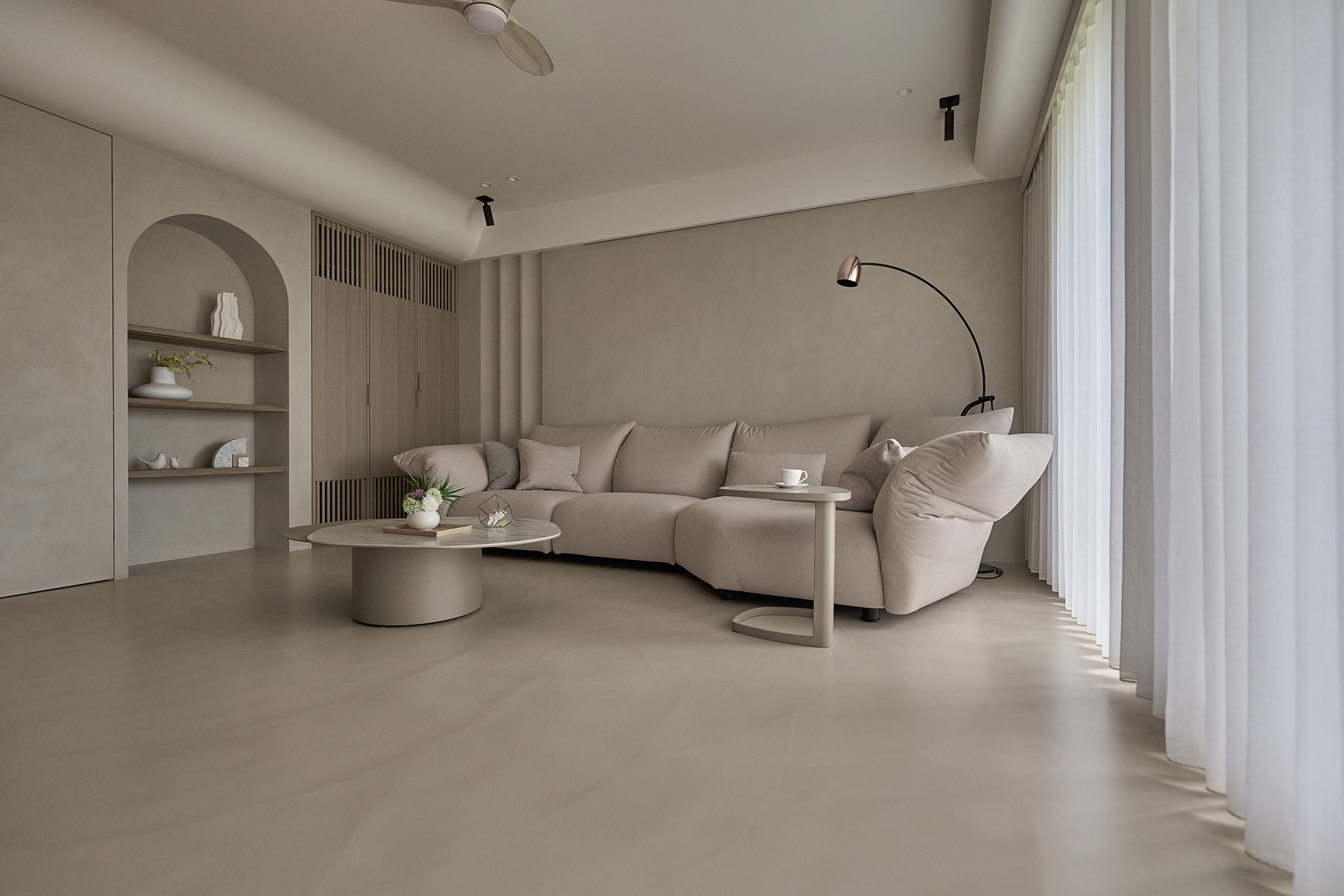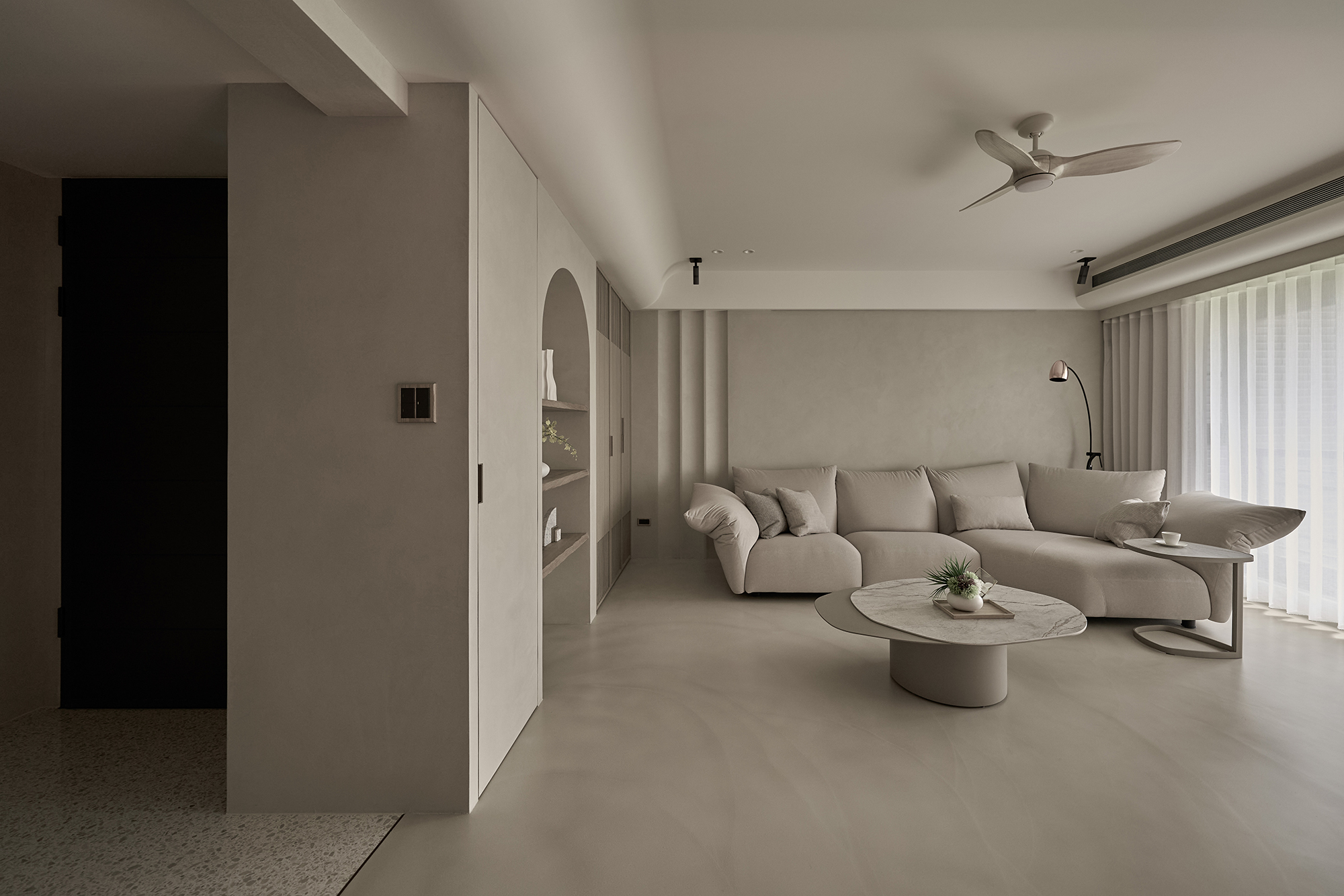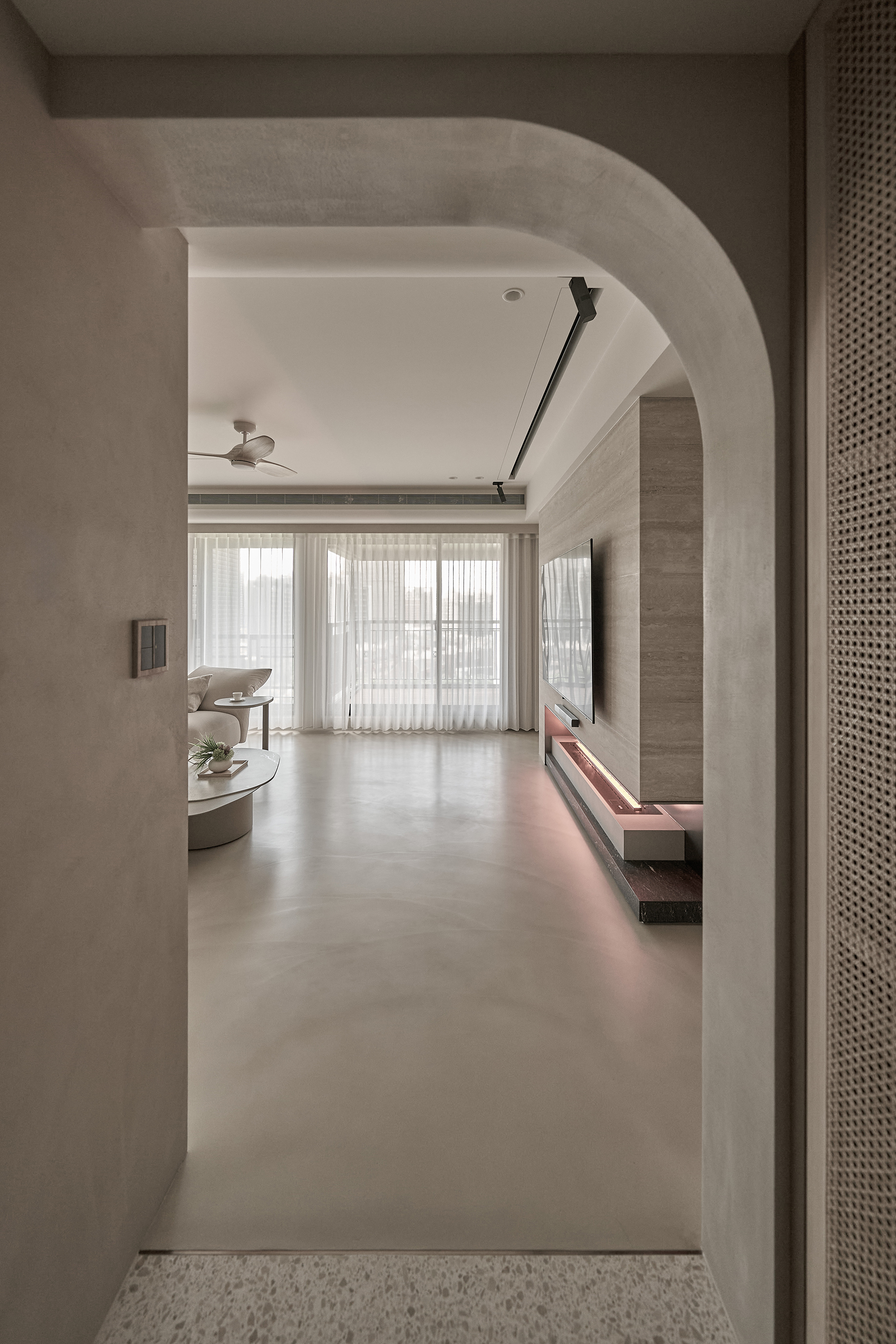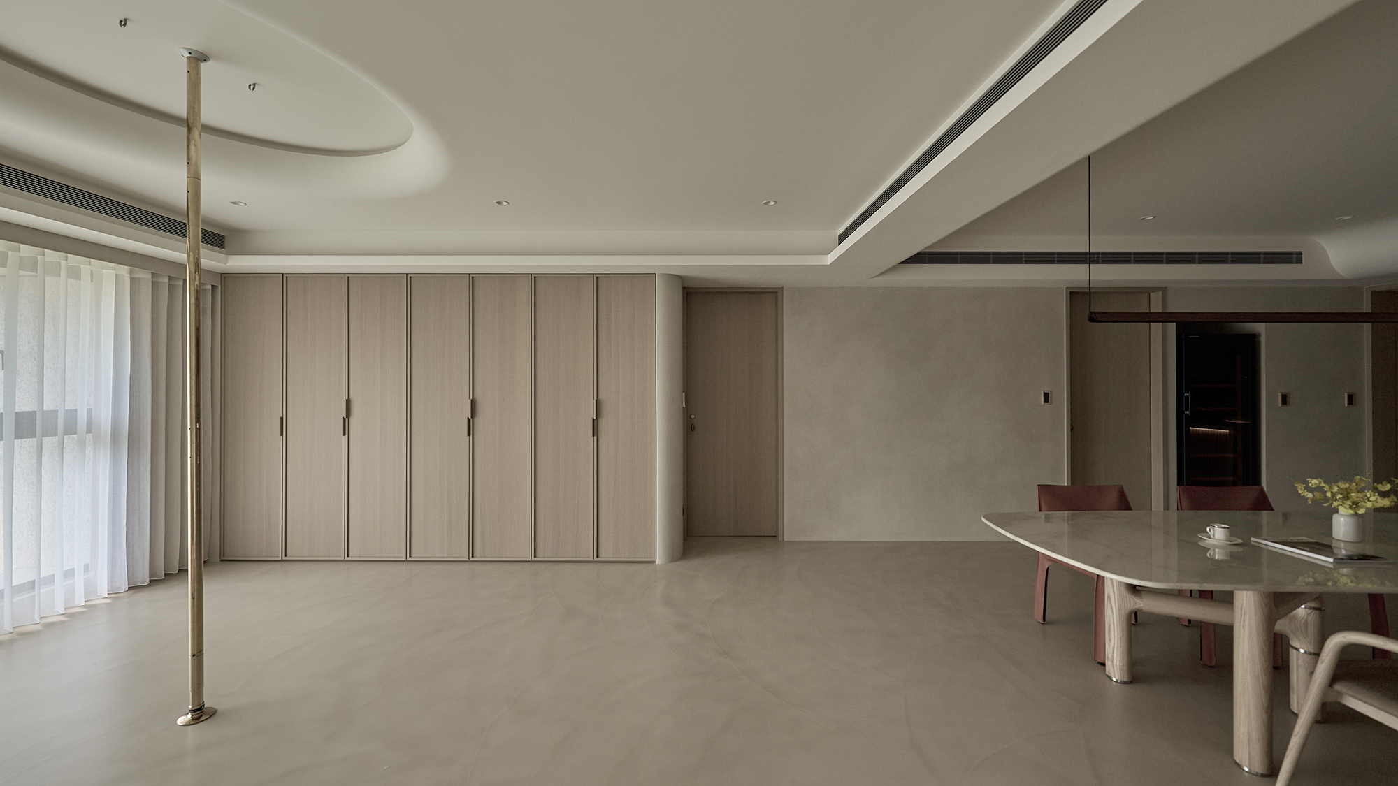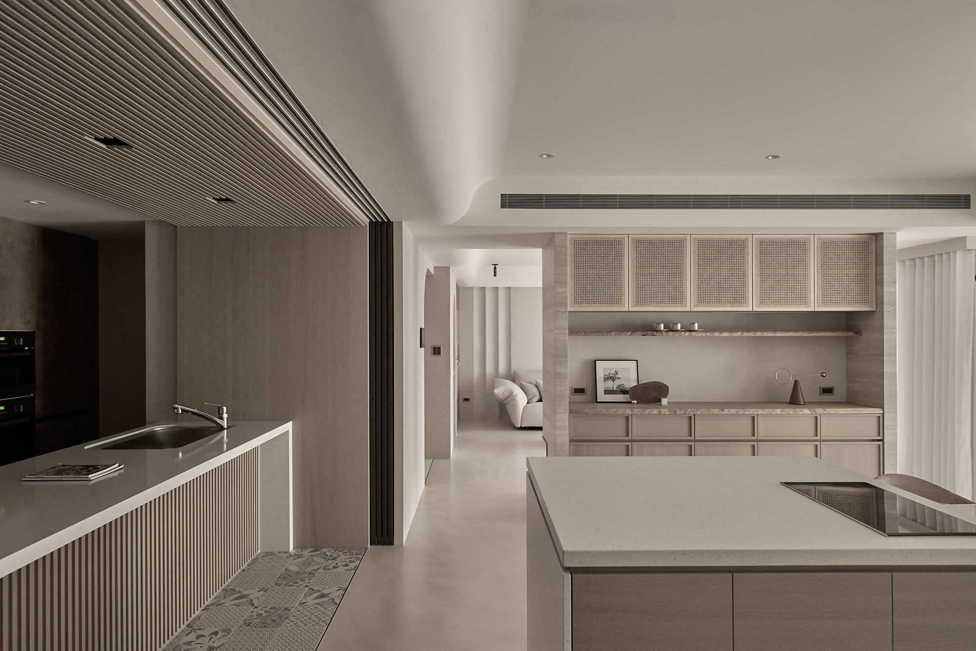 This project entails a thoughtful interior design for a single-story residence, inspired by the minimalist Japanese wabi-sabi aesthetic. The design team skillfully customized a layout specifically for the homeowner, resulting in a seamless integration of the living and dining areas into a spacious open concept. Additionally, a dedicated dance practice area has been thoughtfully incorporated, enhancing the functionality of the space and providing versatility for both everyday living and personal hobbies. In terms of aesthetics, the interior predominantly features a soothing palette of earth tones, which harmoniously blends natural stone, warm wood elements, and delicate rattan weaving. This careful selection of materials not only fosters a sense of elegance but also cultivates an airy ambiance throughout the home. As a result, the living space beautifully reflects the homeowner's appreciation for the simplicity of everyday beauty and embodies the philosophy of returning to the essence of living. Overall, this design is not just a visual delight; it creates a serene sanctuary that nurtures both the mind and spirit. The entrance foyer warmly welcomes guests with its stunning rattan-woven door panels and a beautifully crafted mineral-stone floor. As you step into the public area, you are greeted by living and dining rooms that exude elegance, adorned with sophisticated earth-tone paint. This delightful atmosphere is enhanced by the richness of natural wood accents, exquisite stone tabletops, and sleek metal structures. Additionally, an electronic fireplace creates a cozy ambiance, while expansive floor-to-ceiling windows flood the space with natural light, ensuring a bright and well-ventilated environment that invites relaxation.