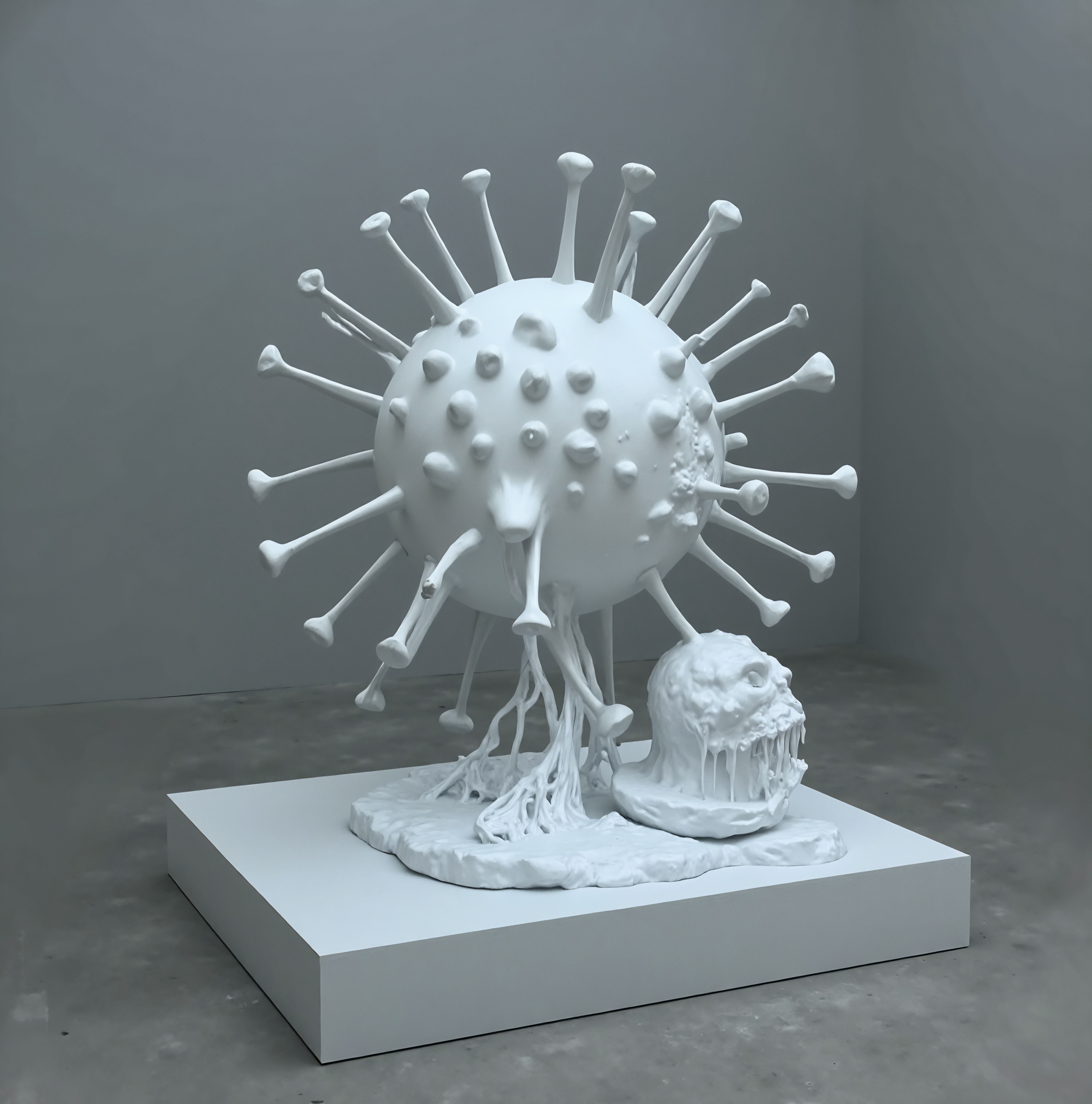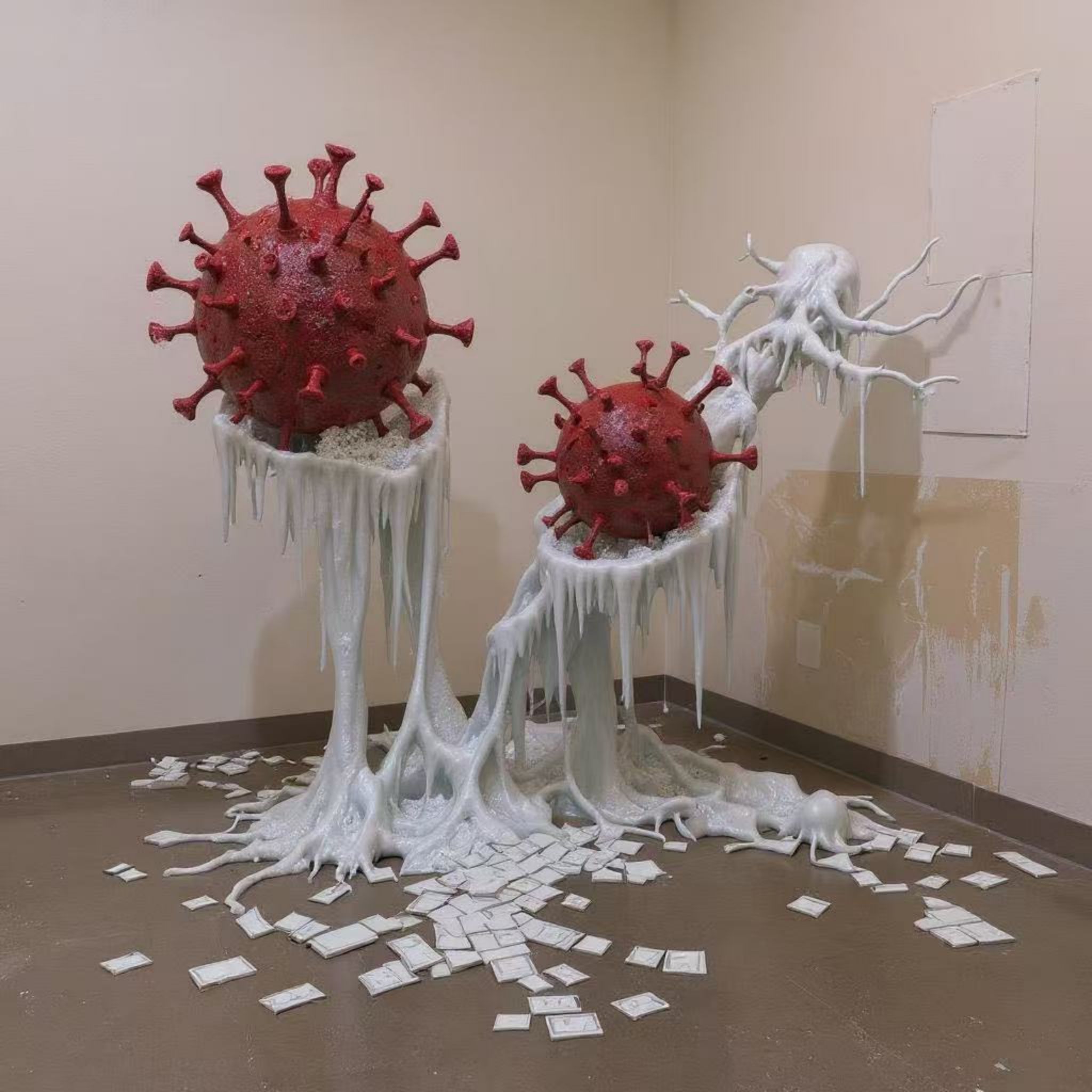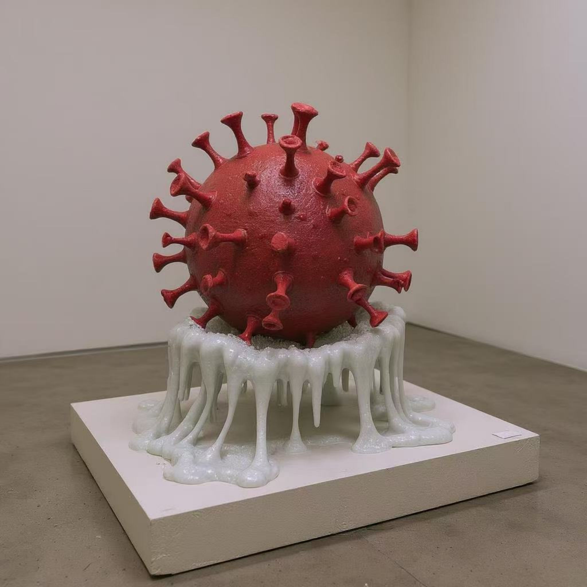 This installation series was developed during the pandemic, inspired by the social realities of that time—the stigmatization of marginalized communities and the pervasive metaphor equating the “other” with a virus. Driven by these observations, the artist explored the virus as a visual and psychological metaphor for collective fear and social exclusion. The work creatively transforms microscopic viral forms into immersive sculptural installations. By employing materials such as plastic, red paint, wires, and layered pulp, the design creates a symbolic state of “spread” that triggers both physical and emotional responses from viewers. Central themes—including labeling, control, collective emotion, and the politics of visual language—are amplified through the tension between materials, intuitively conveying instability and the emotional atmosphere of spread or contamination. The aesthetic design evokes a tension between discomfort and precision, using materials that resist conventional beauty to reflect the unease associated with contagion. The dominant red palette symbolizes heat, alarm, and bodily intensity, juxtaposed against neutral grays and natural paper tones. The sculptures sprawl across the space like a spreading infection, compelling viewers to navigate through them—an experience that mimics the bodily relationship one has with an infected environment. Here, forms evoke viruses while wires stretch like neural or infrastructural networks, blending biological and social symbolism into an expressive, cohesive visual language. Critiquing societal narratives that dehumanize groups through viral analogies, this series draws viewers into an immersive environment that evokes introspection. More than an artistic statement, it stands as a powerful intervention in contemporary discourse—through its conceptual depth and distinctive visual expression—provoking wider and deeper reflection social issues.