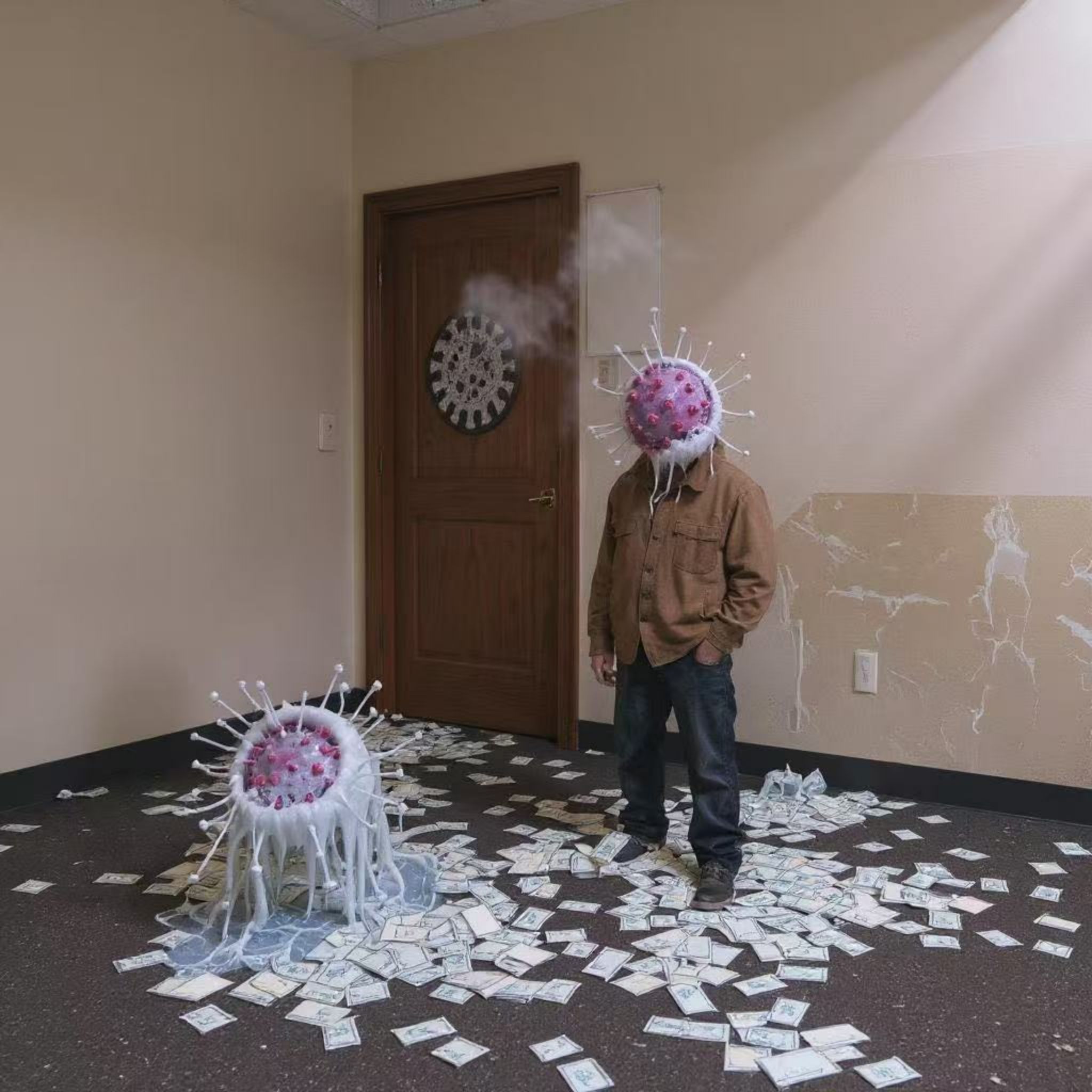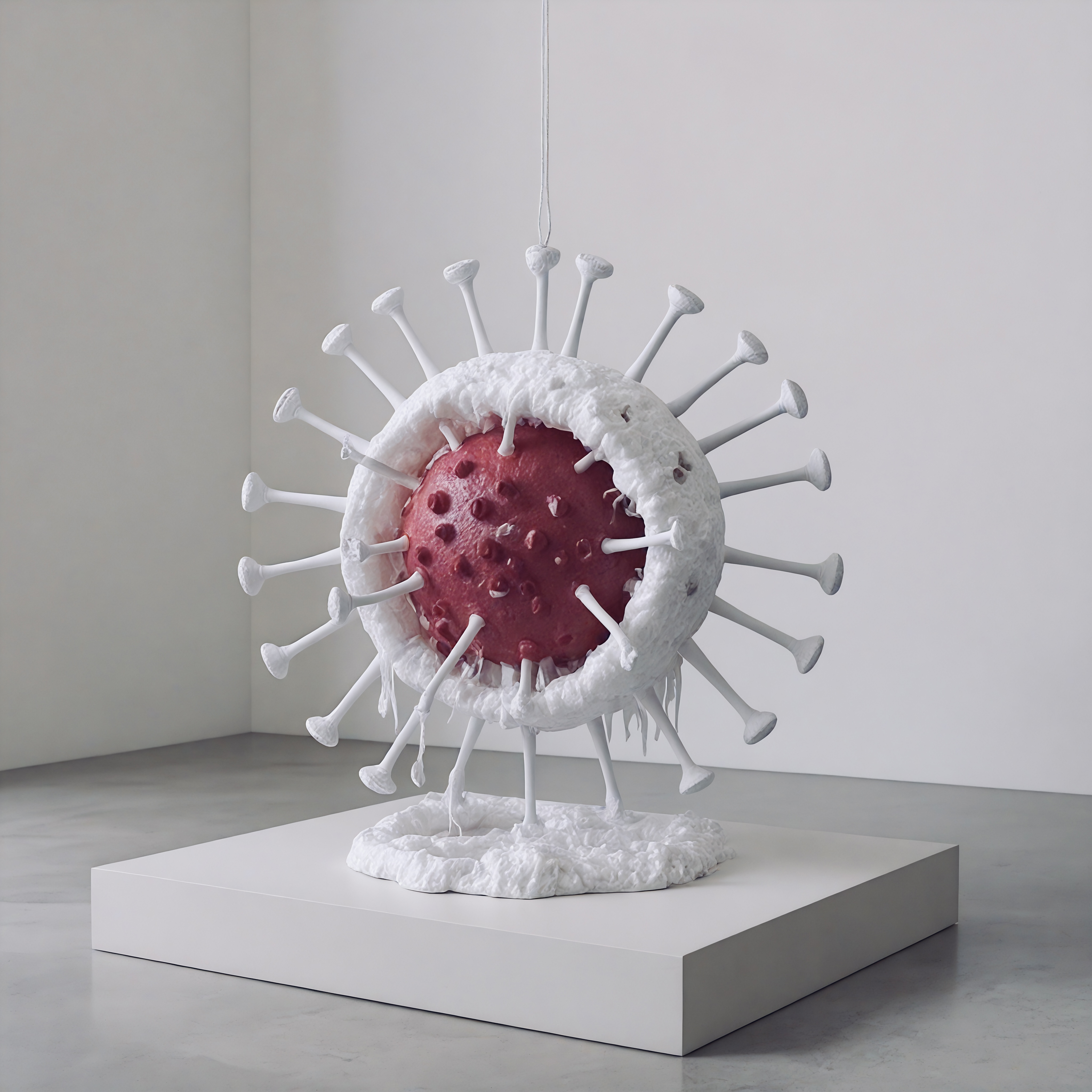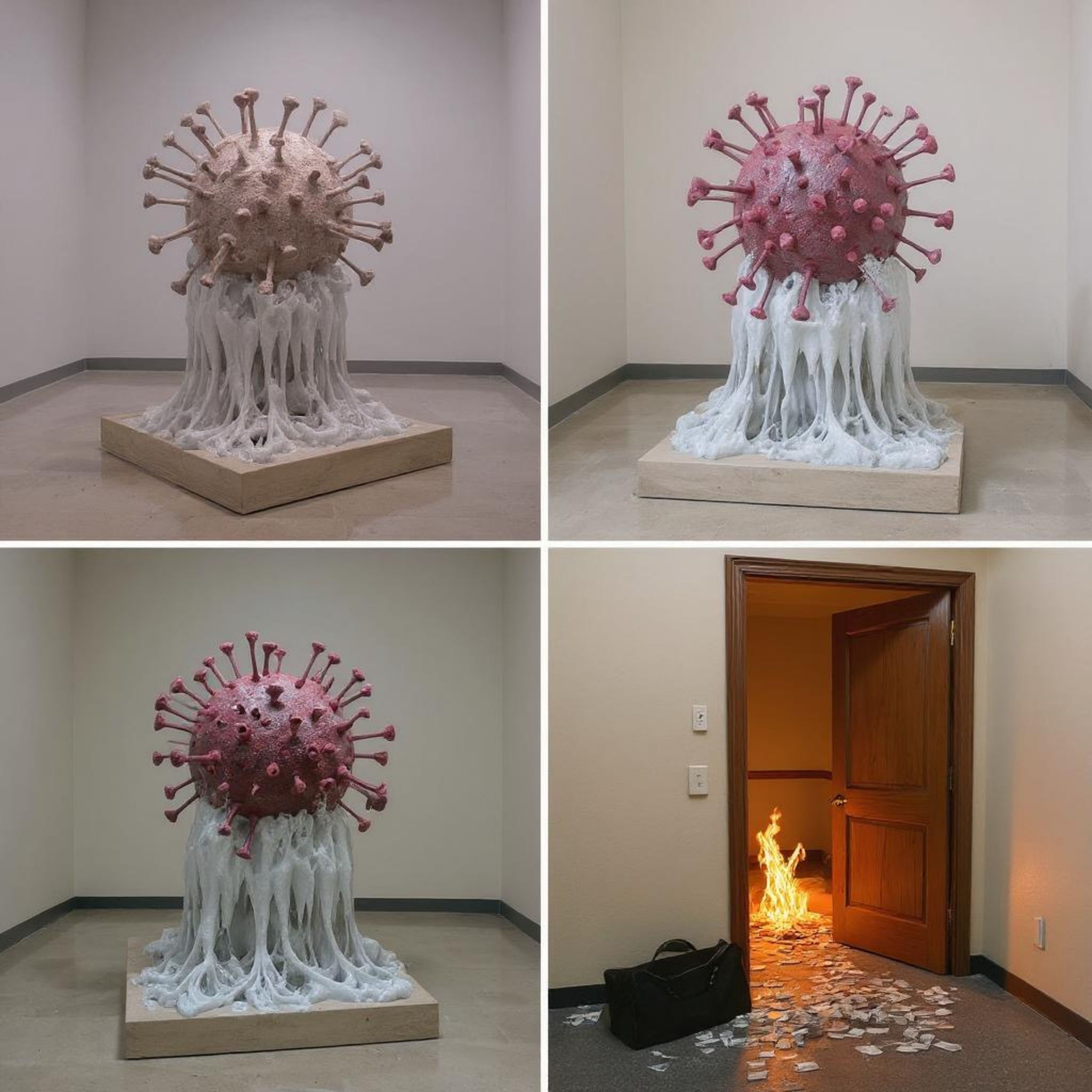 This installation series was developed during the pandemic, inspired by the social realities of that time—the stigmatization of marginalized communities and the pervasive metaphor equating the “other” with a virus. Driven by these observations, the artist explored the virus as a visual and psychological metaphor for collective fear and social exclusion. The work creatively transforms microscopic viral forms into immersive sculptural installations. By employing materials such as plastic, red paint, wires, and layered pulp, the design creates a symbolic state of “spread” that triggers both physical and emotional responses from viewers. Central themes—including labeling, control, collective emotion, and the politics of visual language—are amplified through the tension between materials, intuitively conveying instability and the emotional atmosphere of spread or contamination. The aesthetic design evokes a tension between discomfort and precision, using materials that resist conventional beauty to reflect the unease associated with contagion. The dominant red palette symbolizes heat, alarm, and bodily intensity, juxtaposed against neutral grays and natural paper tones. The sculptures sprawl across the space like a spreading infection, compelling viewers to navigate through them—an experience that mimics the bodily relationship one has with an infected environment. Here, forms evoke viruses while wires stretch like neural or infrastructural networks, blending biological and social symbolism into an expressive, cohesive visual language. Critiquing societal narratives that dehumanize groups through viral analogies, this series draws viewers into an immersive environment that evokes introspection. More than an artistic statement, it stands as a powerful intervention in contemporary discourse—through its conceptual depth and distinctive visual expression—provoking wider and deeper reflection social issues.