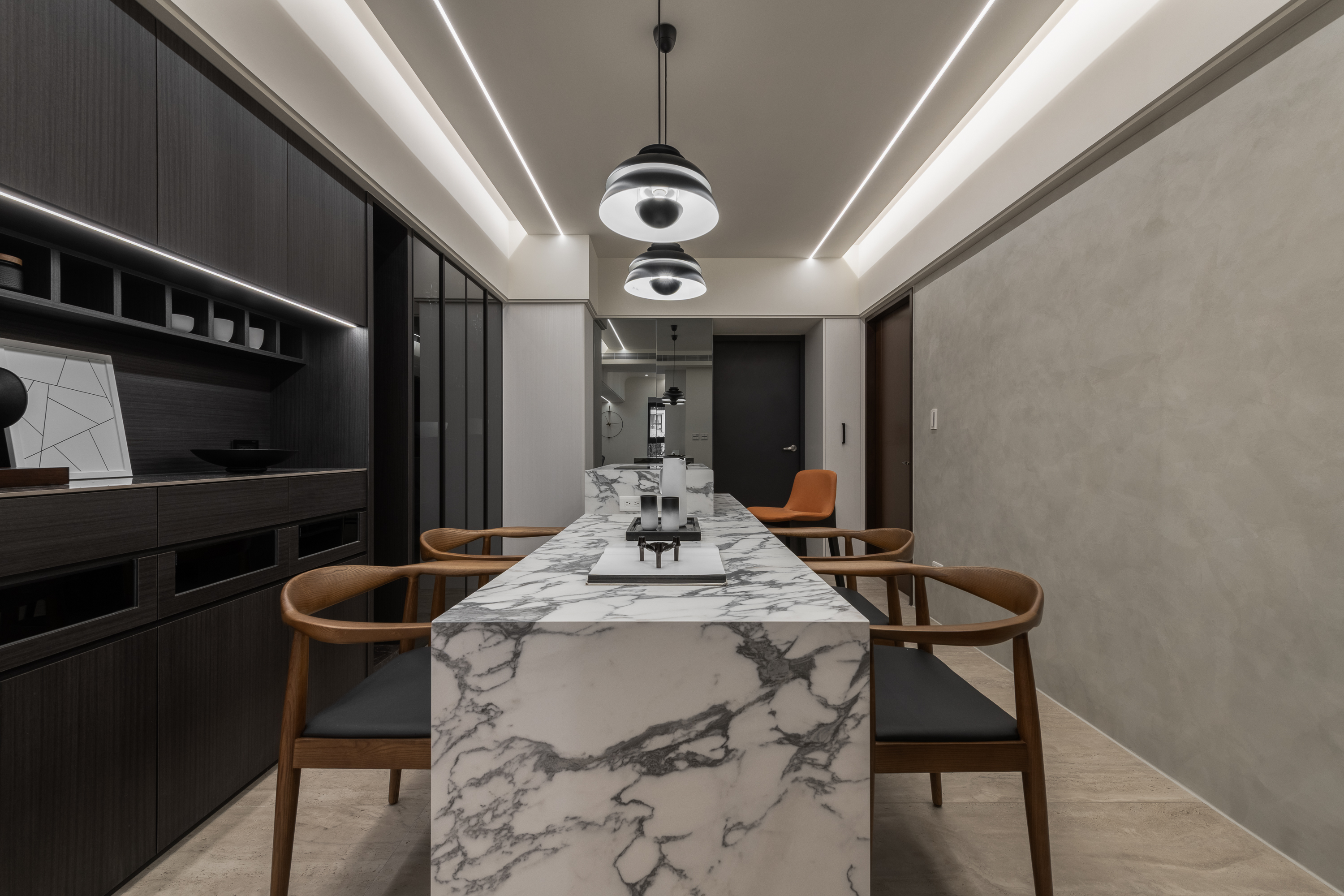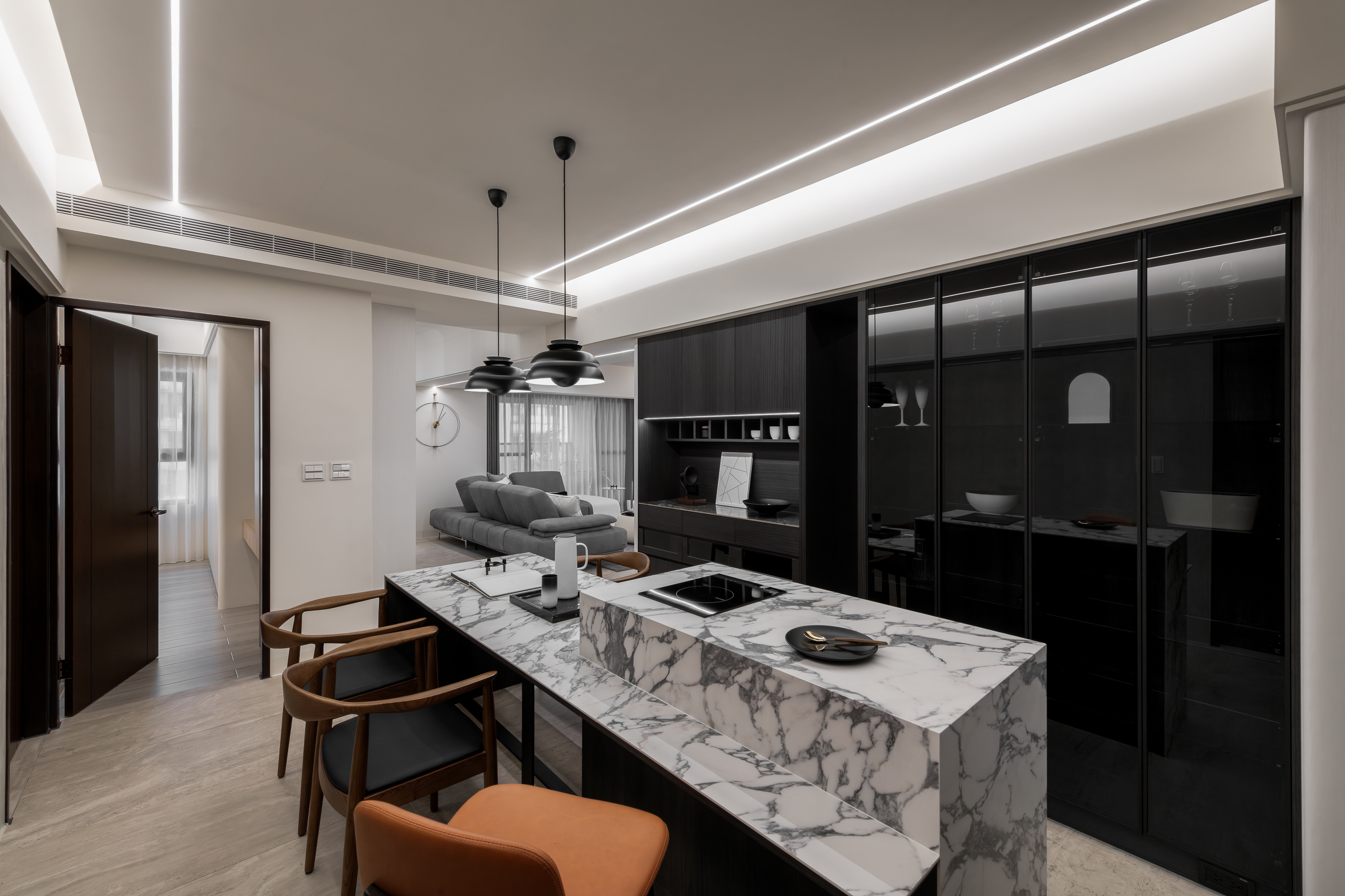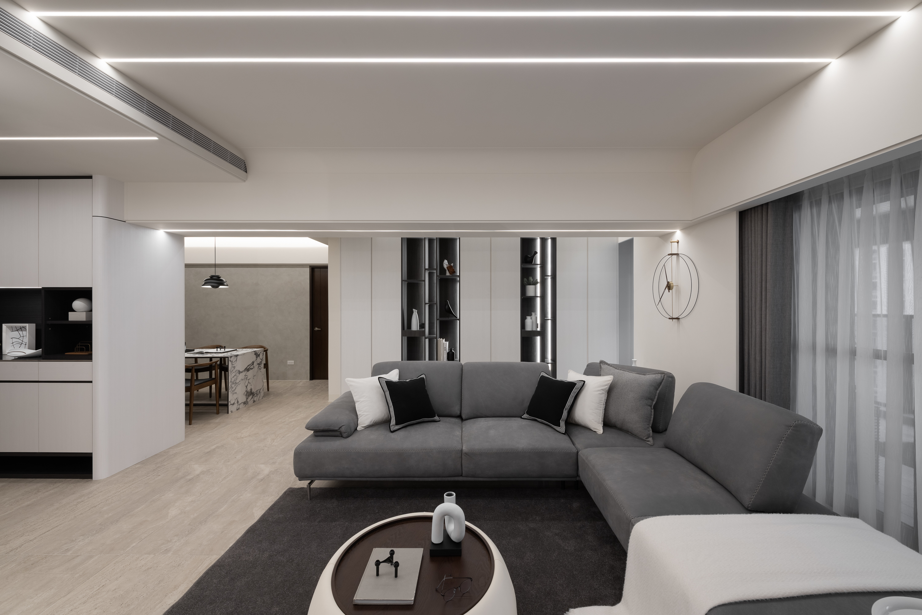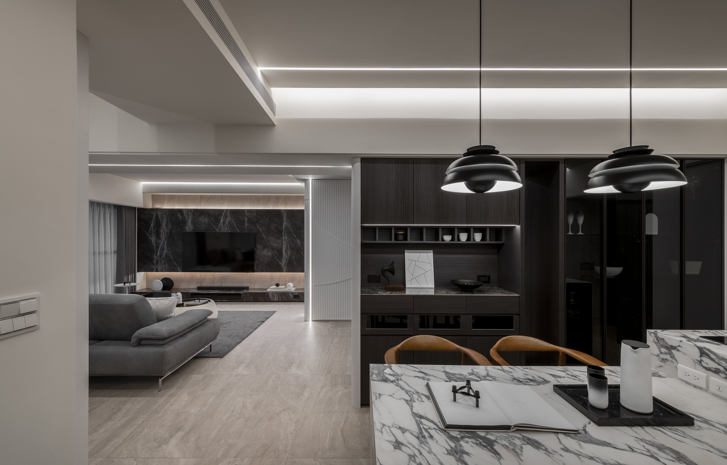 The design of this residential space beautifully embraces a modern minimalist aesthetic, artfully weaving a subtle narrative of what home truly means. Each architectural line and material is thoughtfully layered, not only enhancing the overall visual appeal but also evoking a profound sense of stability and elegance. Furthermore, the open-plan layout seamlessly integrates a variety of materials, skillfully utilizing a palette of neutral tones—gray, white, and beige—to create a harmonious and sophisticated visual depth. This intentional choice of colors and textures invites light and warmth, ultimately transforming the space into an inviting sanctuary. The entryway serves as a graceful introduction to the home, where lattice cabinets elegantly filter light while providing a stylish solution for storing daily essentials. These cabinets not only enhance functionality but also elevate the aesthetic design, reflecting a sense of purity and sophistication. As one steps into the living room, a striking interplay of linear ceiling lights draws the eye upward, extending the visual horizon and creating an inviting atmosphere. Meanwhile, soft, ambient lighting at the base of the dark marble feature wall infuses the space with warmth, inviting relaxation. Throughout the room, the seamless intertwining of lines, curves, and shelves orchestrates a rhythmic harmony, subtly highlighting the neutral tones that define the area. This design achieves a balance that is both simple and inviting, making it a truly captivating space to call home. The living room and dining area harmoniously complement each other, reminiscent of two stars nestled in the night sky—distinct yet intricately connected. Through a thoughtfully arranged selection of cabinets, the space maintains a fluid and unobstructed flow, inviting effortless movement throughout.