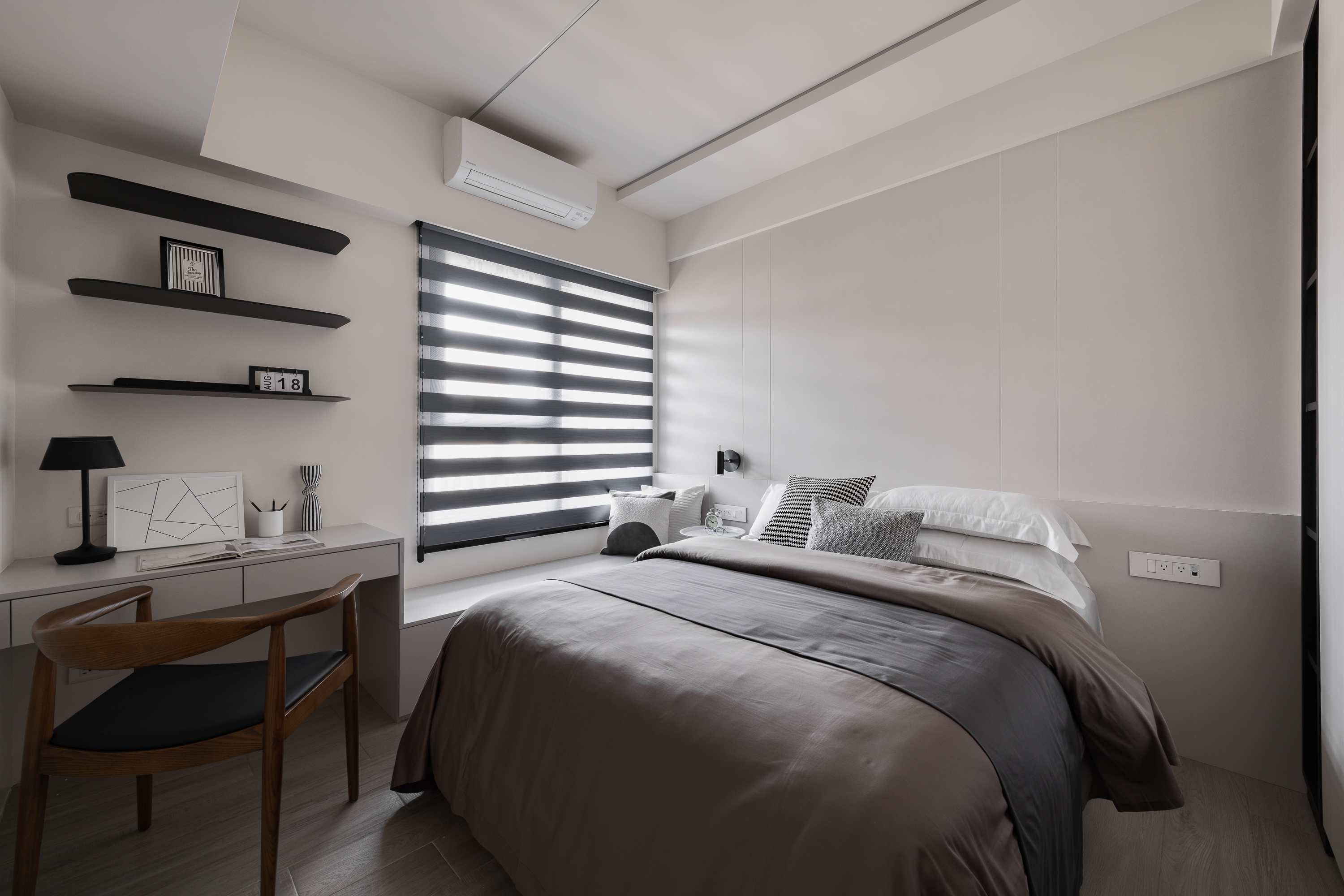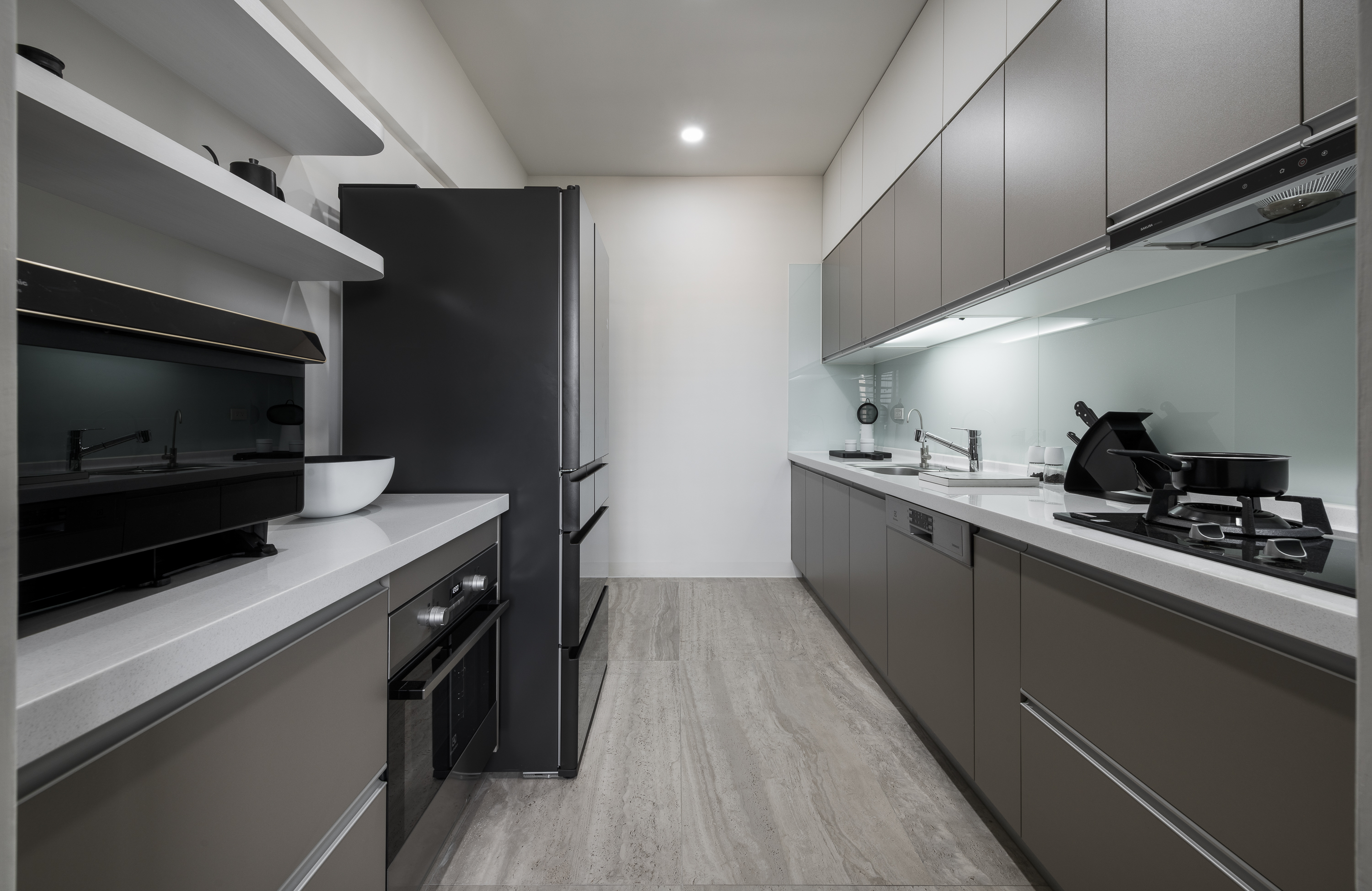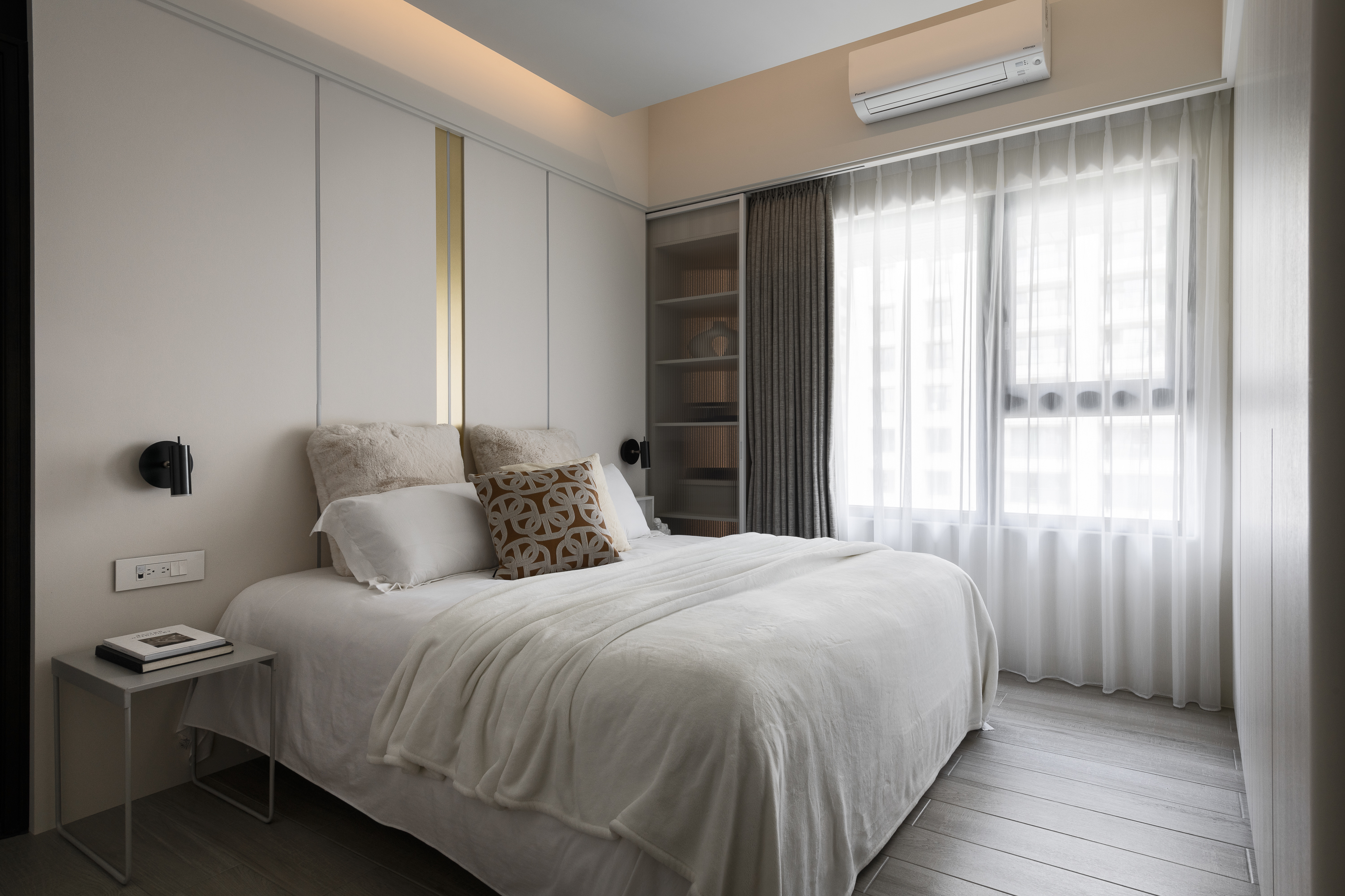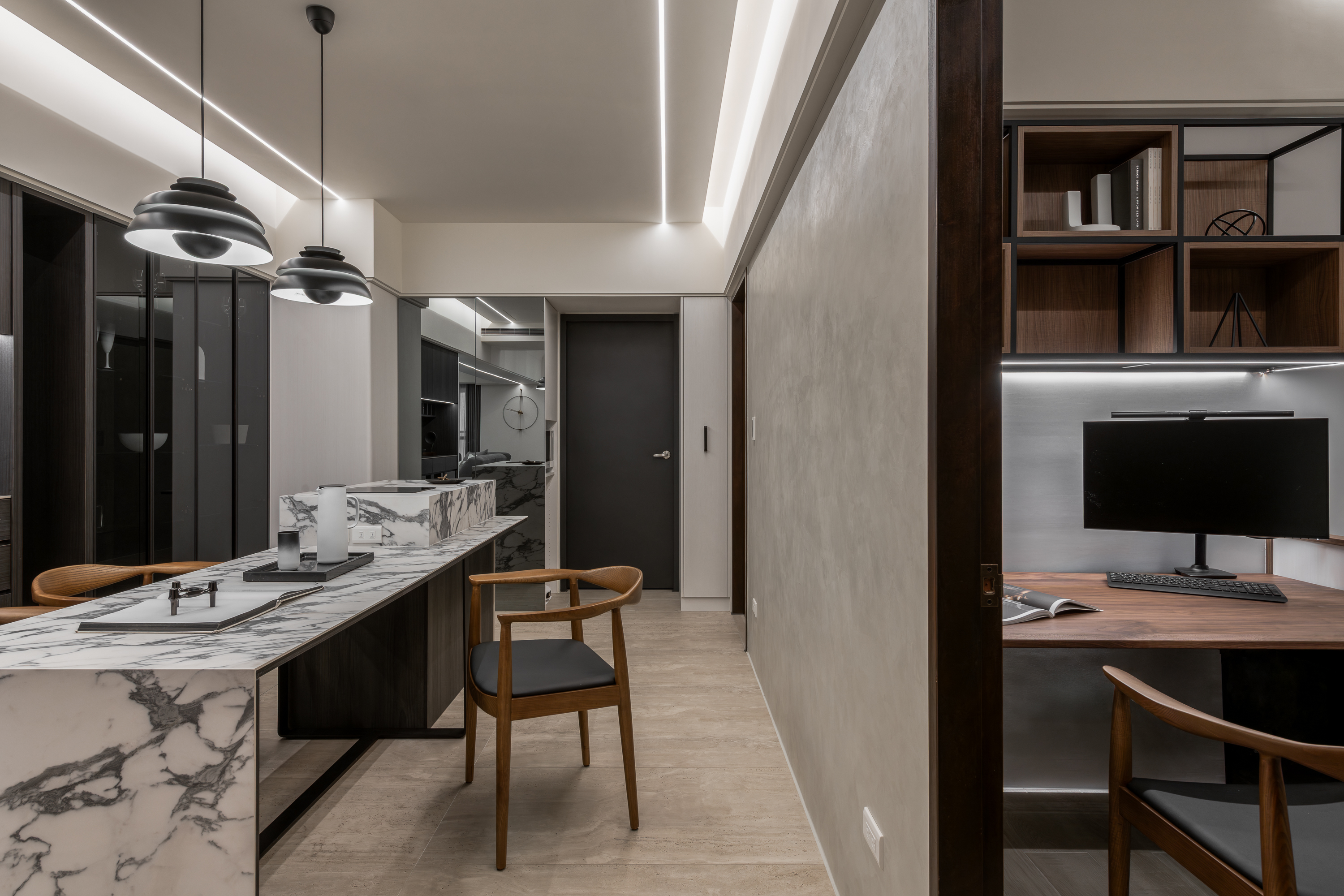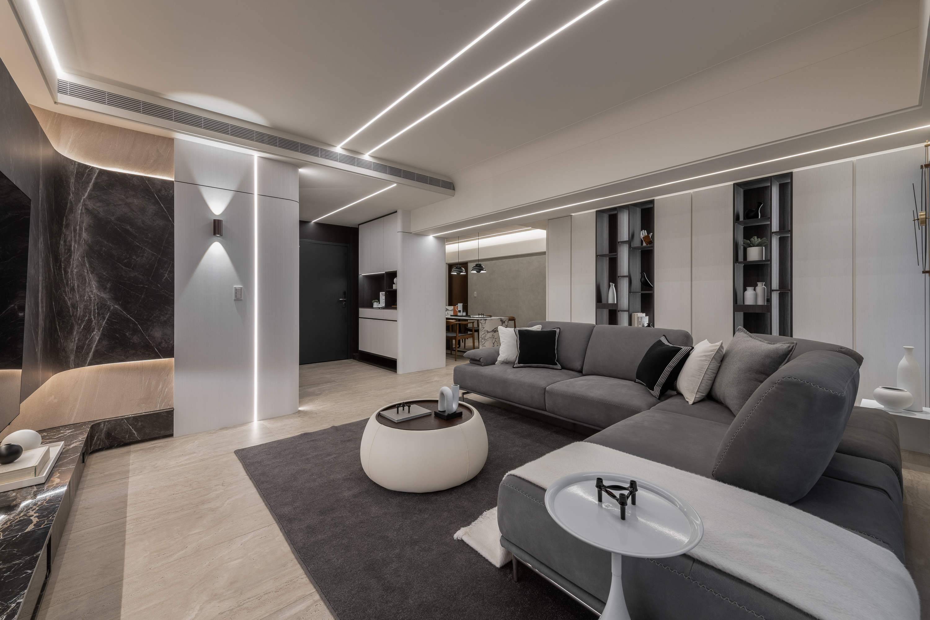 The design of this residential space beautifully embraces a modern minimalist aesthetic, artfully weaving a subtle narrative of what home truly means. Each architectural line and material is thoughtfully layered, not only enhancing the overall visual appeal but also evoking a profound sense of stability and elegance. Furthermore, the open-plan layout seamlessly integrates a variety of materials, skillfully utilizing a palette of neutral tones—gray, white, and beige—to create a harmonious and sophisticated visual depth. This intentional choice of colors and textures invites light and warmth, ultimately transforming the space into an inviting sanctuary. The entryway serves as a graceful introduction to the home, where lattice cabinets elegantly filter light while providing a stylish solution for storing daily essentials. These cabinets not only enhance functionality but also elevate the aesthetic design, reflecting a sense of purity and sophistication. As one steps into the living room, a striking interplay of linear ceiling lights draws the eye upward, extending the visual horizon and creating an inviting atmosphere. Meanwhile, soft, ambient lighting at the base of the dark marble feature wall infuses the space with warmth, inviting relaxation. Throughout the room, the seamless intertwining of lines, curves, and shelves orchestrates a rhythmic harmony, subtly highlighting the neutral tones that define the area. This design achieves a balance that is both simple and inviting, making it a truly captivating space to call home. The living room and dining area harmoniously complement each other, reminiscent of two stars nestled in the night sky—distinct yet intricately connected. Through a thoughtfully arranged selection of cabinets, the space maintains a fluid and unobstructed flow, inviting effortless movement throughout.