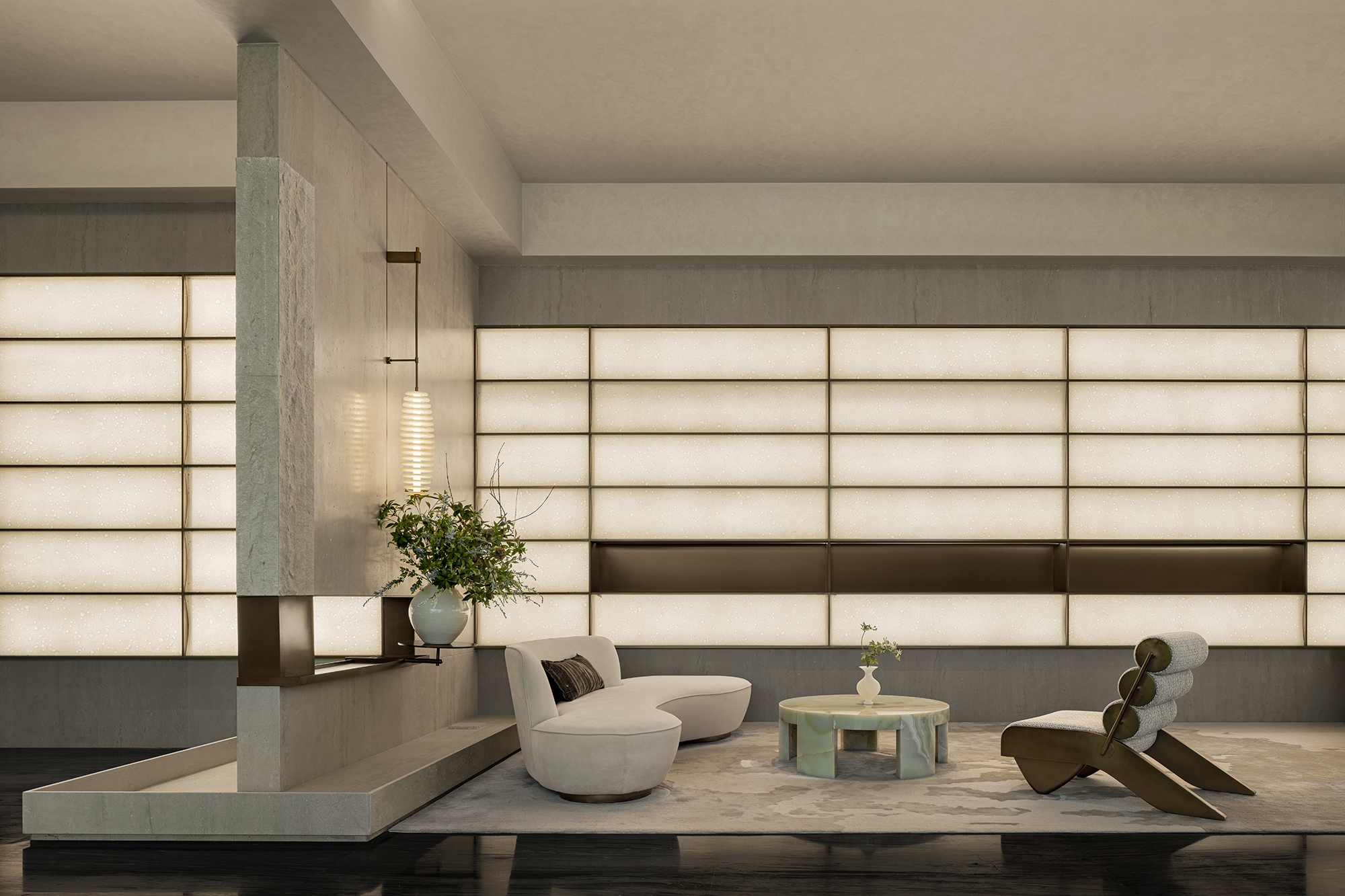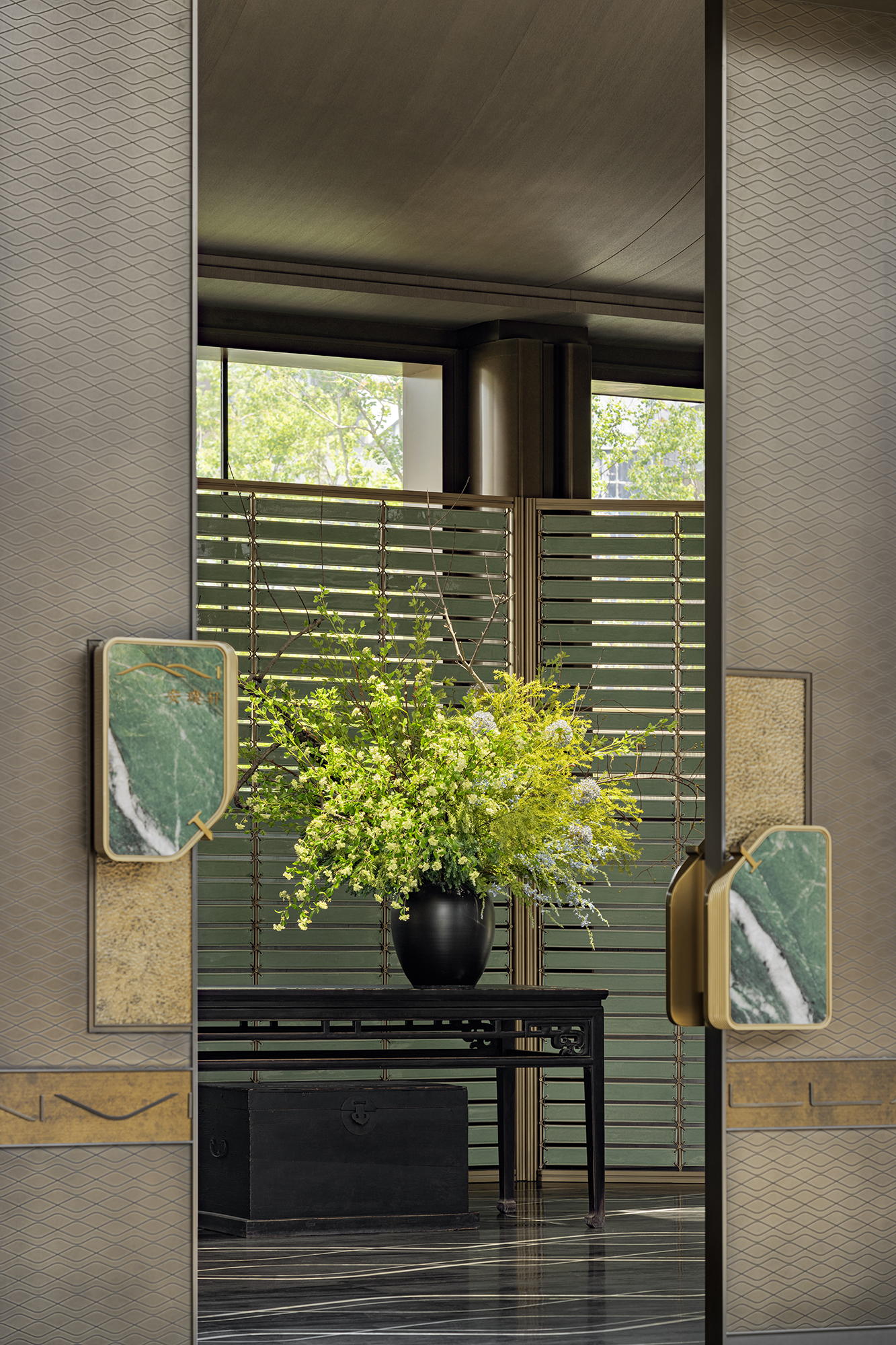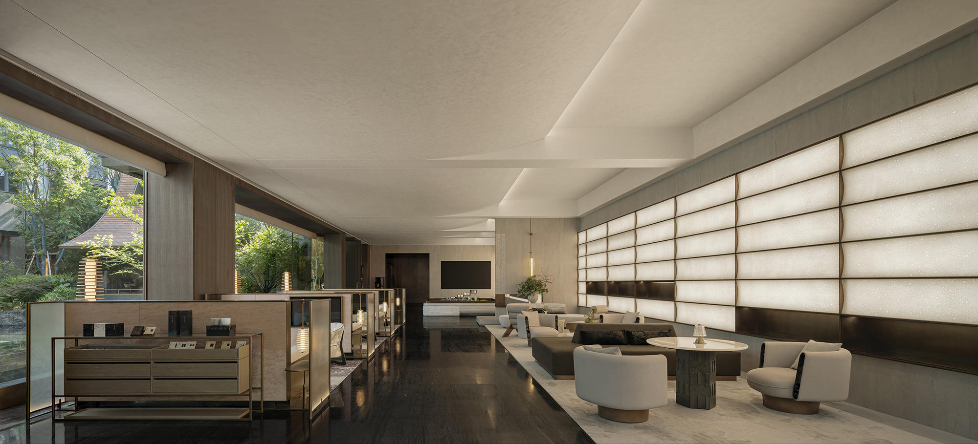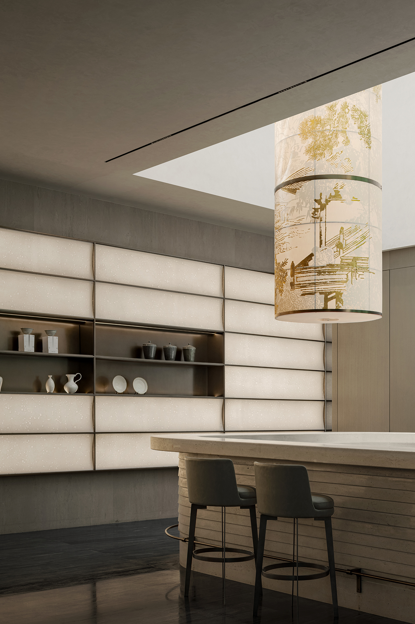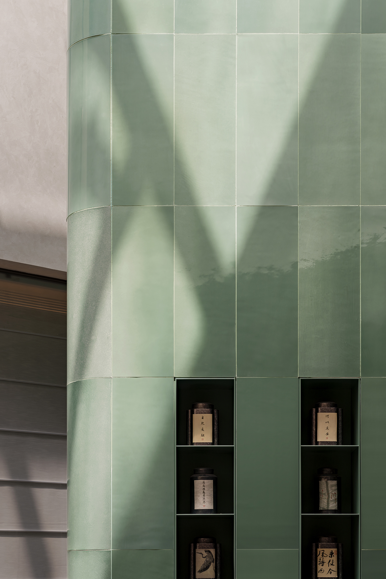 The project portrays a philosophical vision of “Inner peace awakens a sense of all things,” reimagining Jiangnan’s refined elegance in a contemporary context. The tea pavilion, steeped in Eastern essence, releases the vertical permeability of the landscape. Within it, five realms of traditional refined living—books, music, flowers, wine, and tea—are interwoven into a flowing scene of elegant gatherings, where objects, ambiance, and spirit are poetically elevated into philosophical resonance. When materials transcend their physicality, space becomes a spiritual medium that nurtures the soul. Textures drawn from local vernacular are reinterpreted through a contemporary lens. The translucent texture of luminous paper walls recalls traditional window lattices; tea tables in white and green jade quietly converse in warmth and elegance; silk weaves are reimagined as glass inlaid with metal threads. Handcrafted celadon tiles in shades of green envelop the backdrop wall at the bar area, evoking a breathing jade forest that seems to whisper with mountain breezes. A grand silk lantern descends like a scroll from the clouds, its form and pattern etched upon mulberry silk, which echoes ancient Qushui Liushang gatherings, where literati composed verses along winding streams as wine cups drifted past. AN LOUNGE is not a static vessel—it is the flowing poetry of Jiangnan. From Ru celadon to silk gauze, from Zhuangzi’s philosophical wisdom to the refined literati spirit in the Wei and Jin dynasties, the project translates Shaoxing’s cultural genes into a tangible, modern way of life. True tranquility lies not in retreating from the world, but in the shared breath between humans and nature—within the smallest, most intimate spaces.