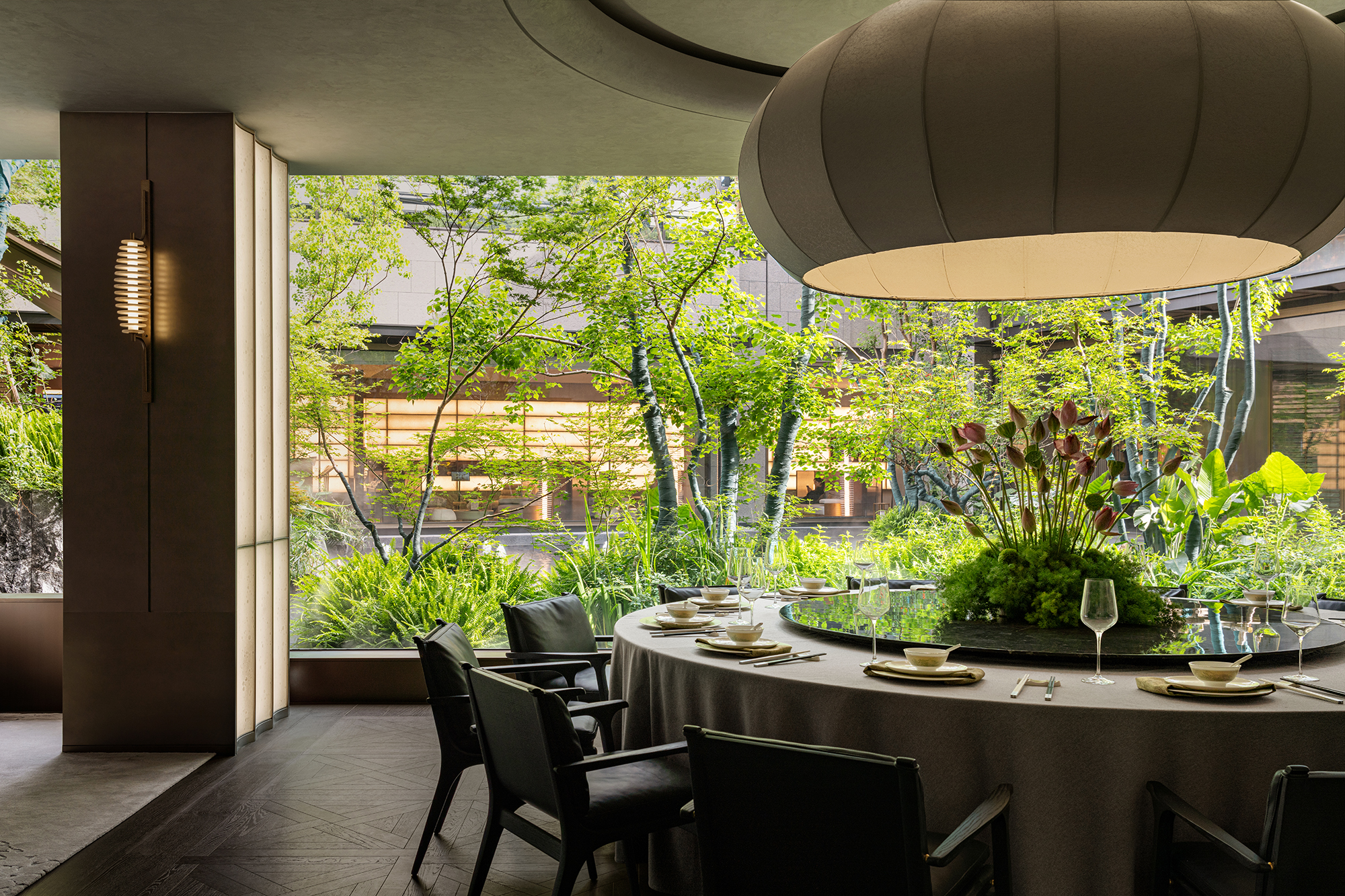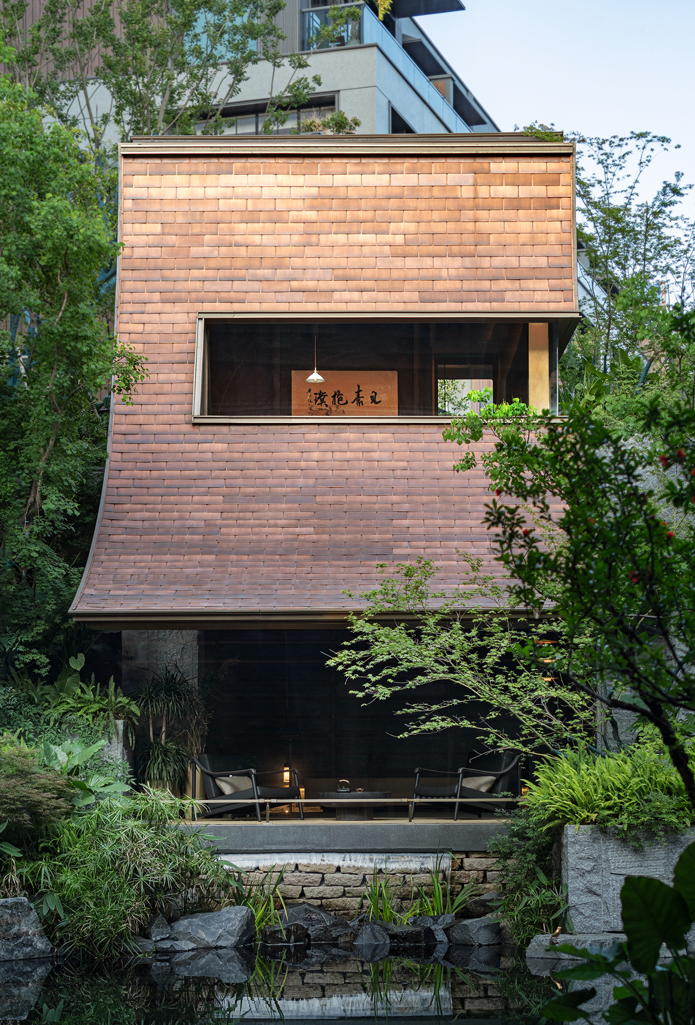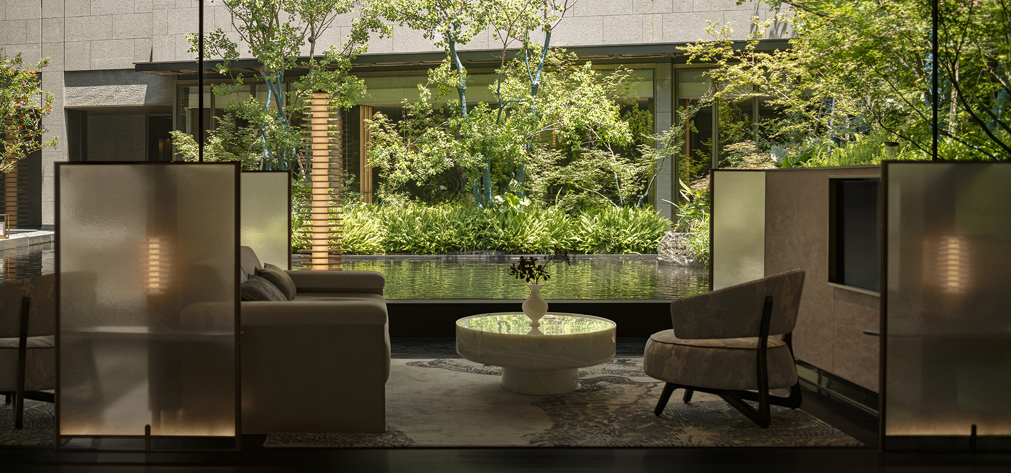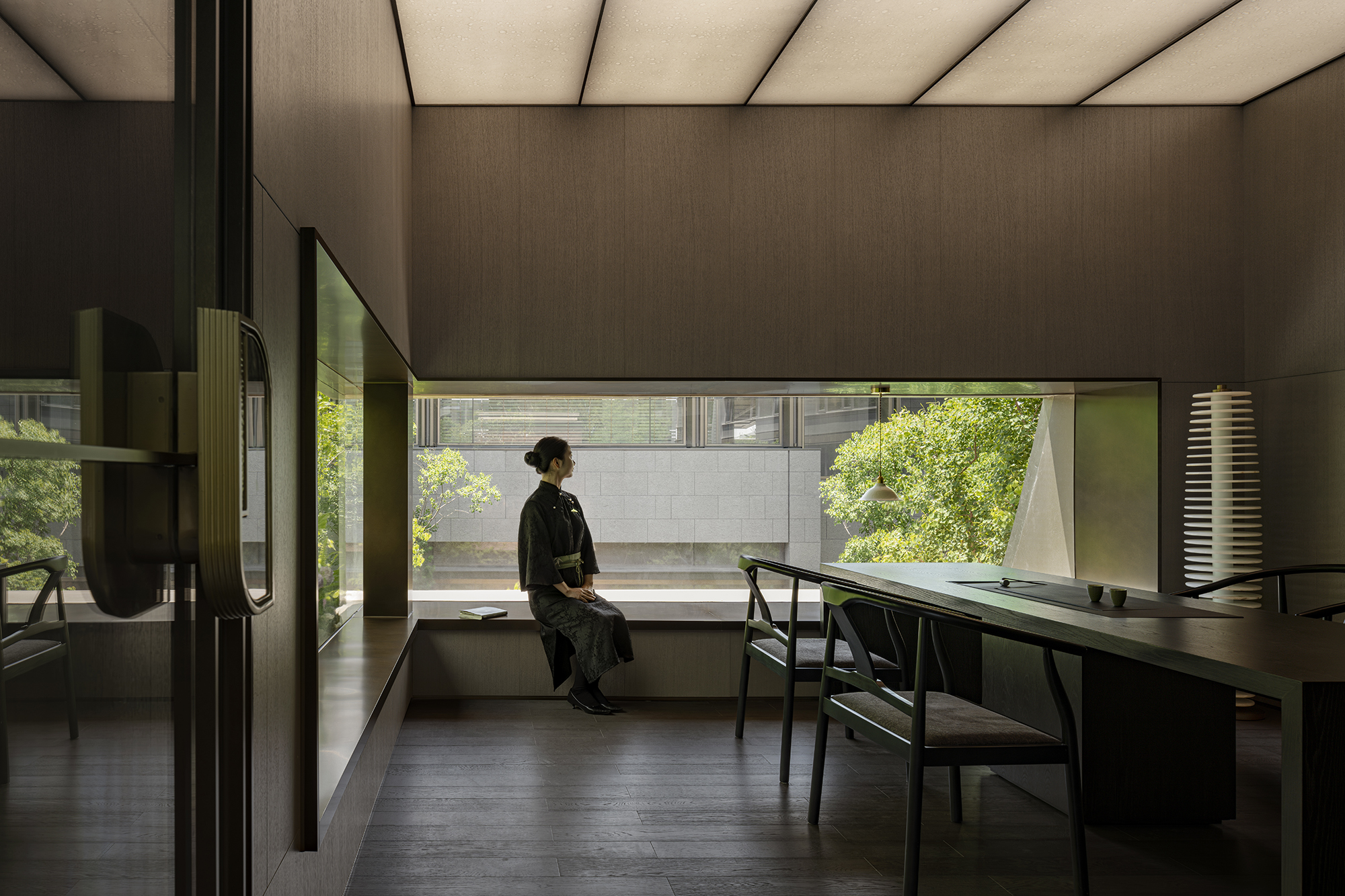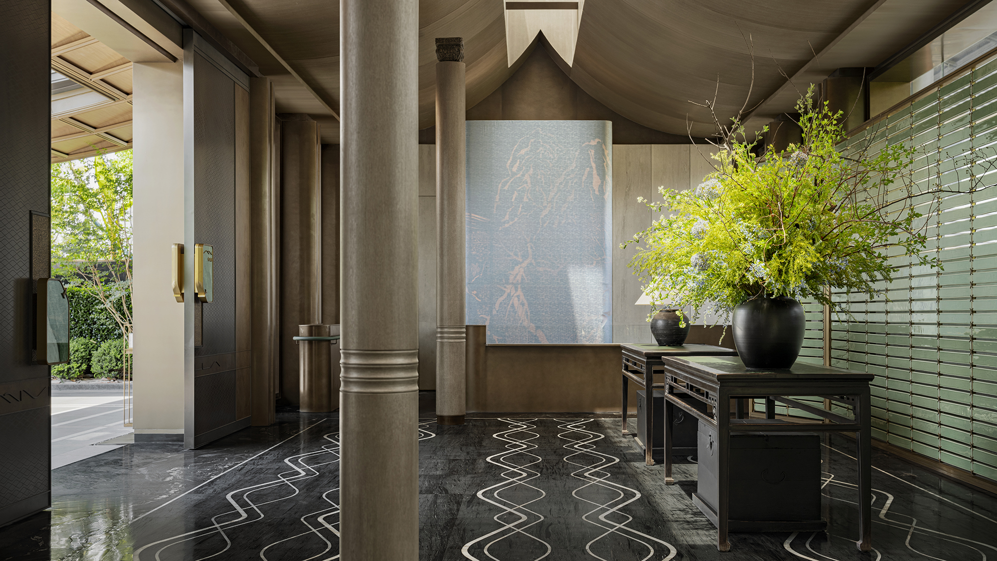 The project portrays a philosophical vision of “Inner peace awakens a sense of all things,” reimagining Jiangnan’s refined elegance in a contemporary context. The tea pavilion, steeped in Eastern essence, releases the vertical permeability of the landscape. Within it, five realms of traditional refined living—books, music, flowers, wine, and tea—are interwoven into a flowing scene of elegant gatherings, where objects, ambiance, and spirit are poetically elevated into philosophical resonance. When materials transcend their physicality, space becomes a spiritual medium that nurtures the soul. Textures drawn from local vernacular are reinterpreted through a contemporary lens. The translucent texture of luminous paper walls recalls traditional window lattices; tea tables in white and green jade quietly converse in warmth and elegance; silk weaves are reimagined as glass inlaid with metal threads. Handcrafted celadon tiles in shades of green envelop the backdrop wall at the bar area, evoking a breathing jade forest that seems to whisper with mountain breezes. A grand silk lantern descends like a scroll from the clouds, its form and pattern etched upon mulberry silk, which echoes ancient Qushui Liushang gatherings, where literati composed verses along winding streams as wine cups drifted past. AN LOUNGE is not a static vessel—it is the flowing poetry of Jiangnan. From Ru celadon to silk gauze, from Zhuangzi’s philosophical wisdom to the refined literati spirit in the Wei and Jin dynasties, the project translates Shaoxing’s cultural genes into a tangible, modern way of life. True tranquility lies not in retreating from the world, but in the shared breath between humans and nature—within the smallest, most intimate spaces.