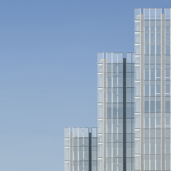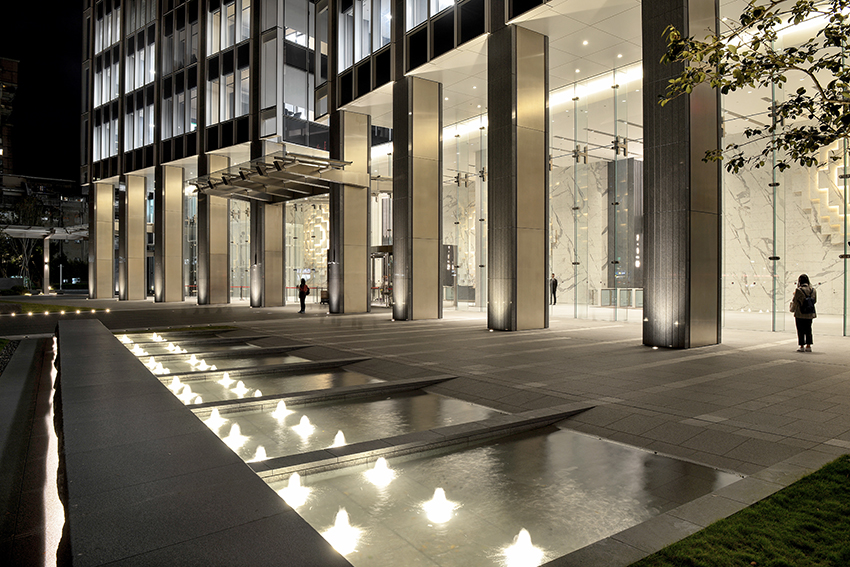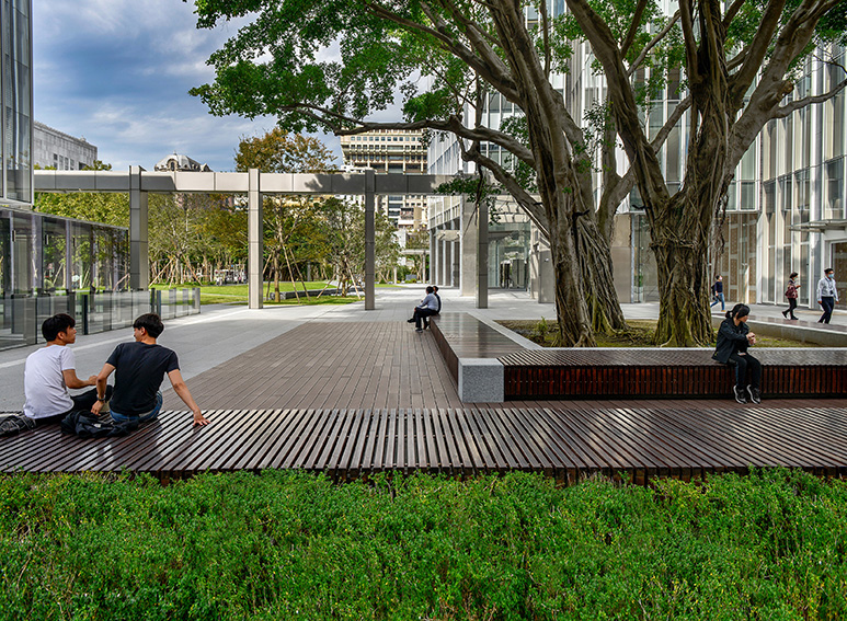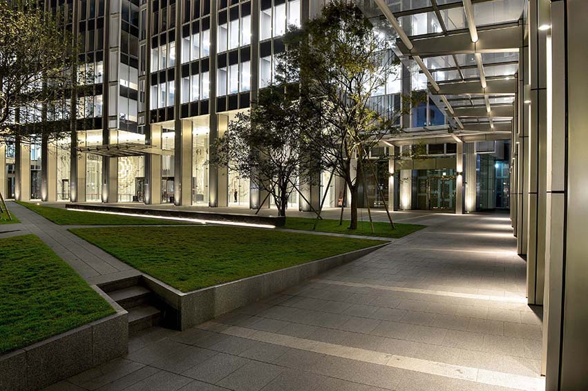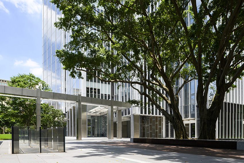 The KGI Financial Headquarters is strategically located along the green urban axis of Dunhua North Road in Taipei, close to the Arena, Municipal Stadium, and Nanjing business district. Stepping back from the boulevard, the design opens much of the ground level into a landscaped plaza for the public, preserving three old banyan trees and integrating planting, pools, benches, and walkways. This welcoming open space connects with surrounding venues to form a continuous green belt, promoting social interaction and adding a pleasant quality to the district's urban business and commercial life. The tower rises 18 stories above ground and extends 5 levels below. Offices occupy levels 2 to 13 and the top 18th floor, while levels 14 to 17 house a five-star hotel with panoramic views of the city. Separate entrances distinguish office and hotel circulation for security and efficiency. The façade combines low-emissivity super-white laminated glass, ceramic-fused glass, aluminum panels, and gray granite, creating a shimmering crystalline effect. Rooftop services are screened with single panes of glass, giving the tower a refined, feathered silhouette against the skyline. This interplay of transparency, materiality, and lightness underscores the project’s strong architectural aesthetics. Sustainable measures played a major role in the building’s design. Retention ponds were dotted around the site to regulate the microclimate, recycle and reuse rainwater, and establish a water-diversion system. The project also included the systematic control of sensor lights and electric double-layer curtain louvers to achieve the desired daily energy savings. Together these decisions have produced a modern office complex that performs well and is highly sustainable.